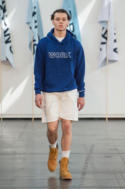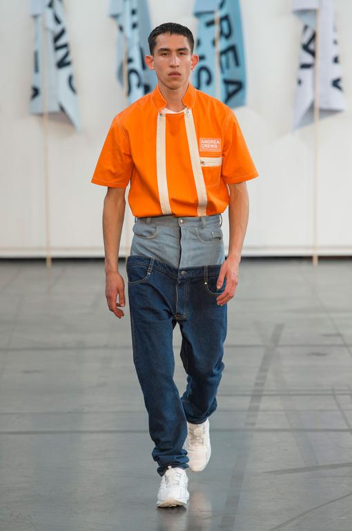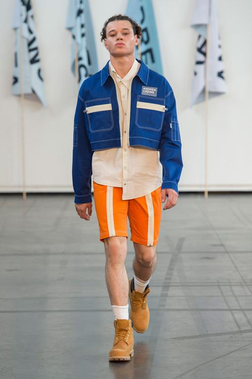 C’est sous le thème du travail que la marque Andrea Crews a dévoilé sa collection homme printemps été 2017, lors de la Fashion Week Homme de Paris, à la Maison des Métallos, endroit lumineux et moderne.