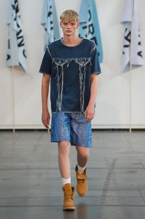 Le denim, toile emblématique utilisée autrefois seulement pour les pièces de jeans et appelées le « bleu de travail », revisité ici de façon moderne et fraîche, pour Andrea Crews c’est devenu un vêtement tendance plus qu’un outil de travail. Pour refléter le thème choisi, les silhouettes arborent tout de même de multiples zips, poches à pressions et ouverture à pressions.