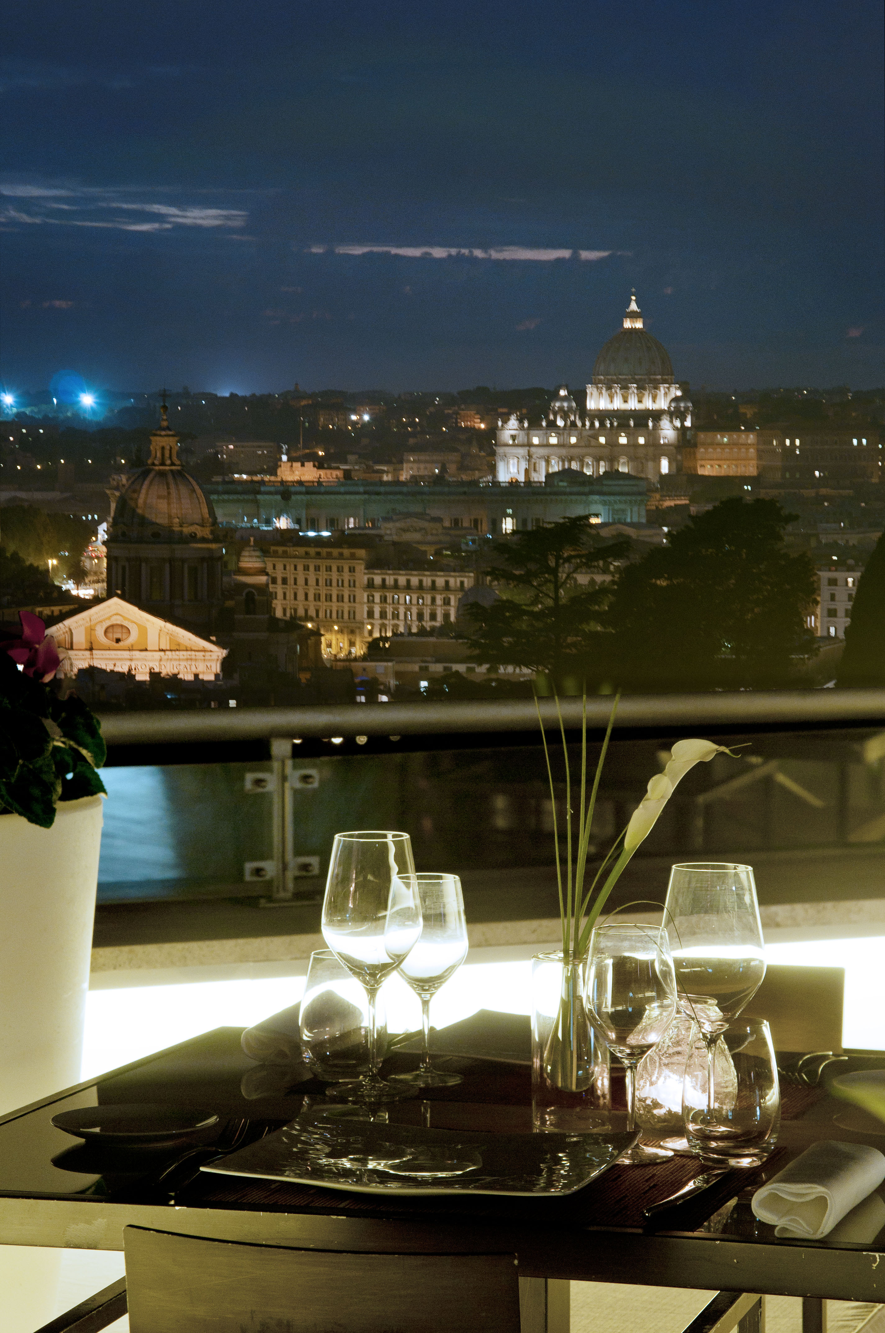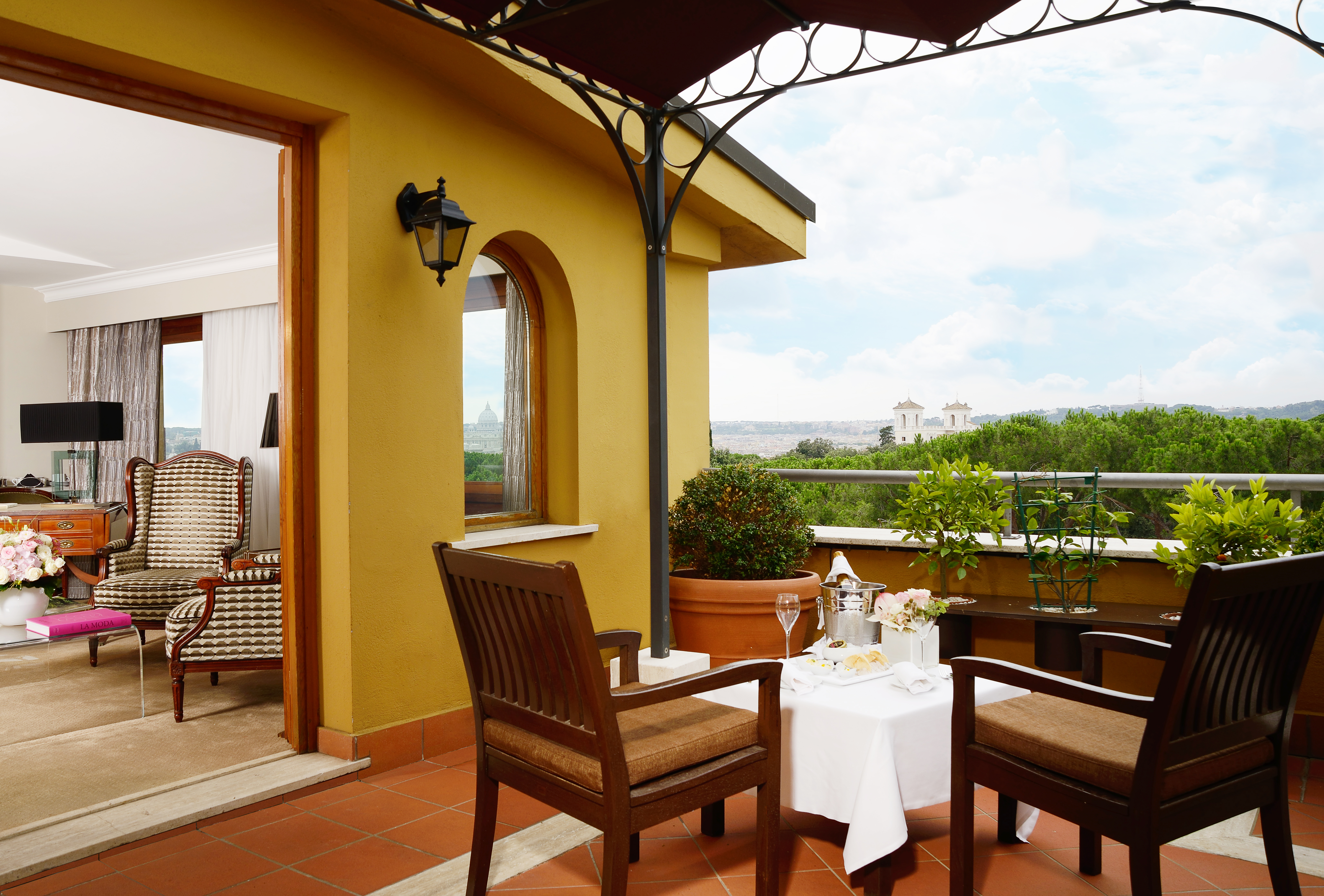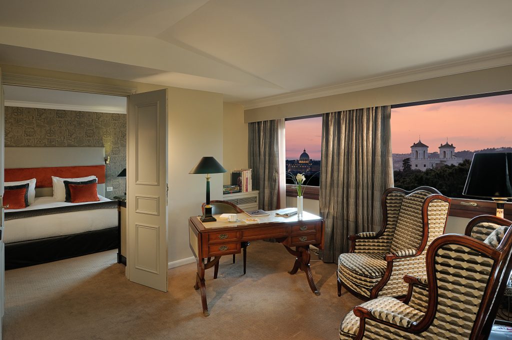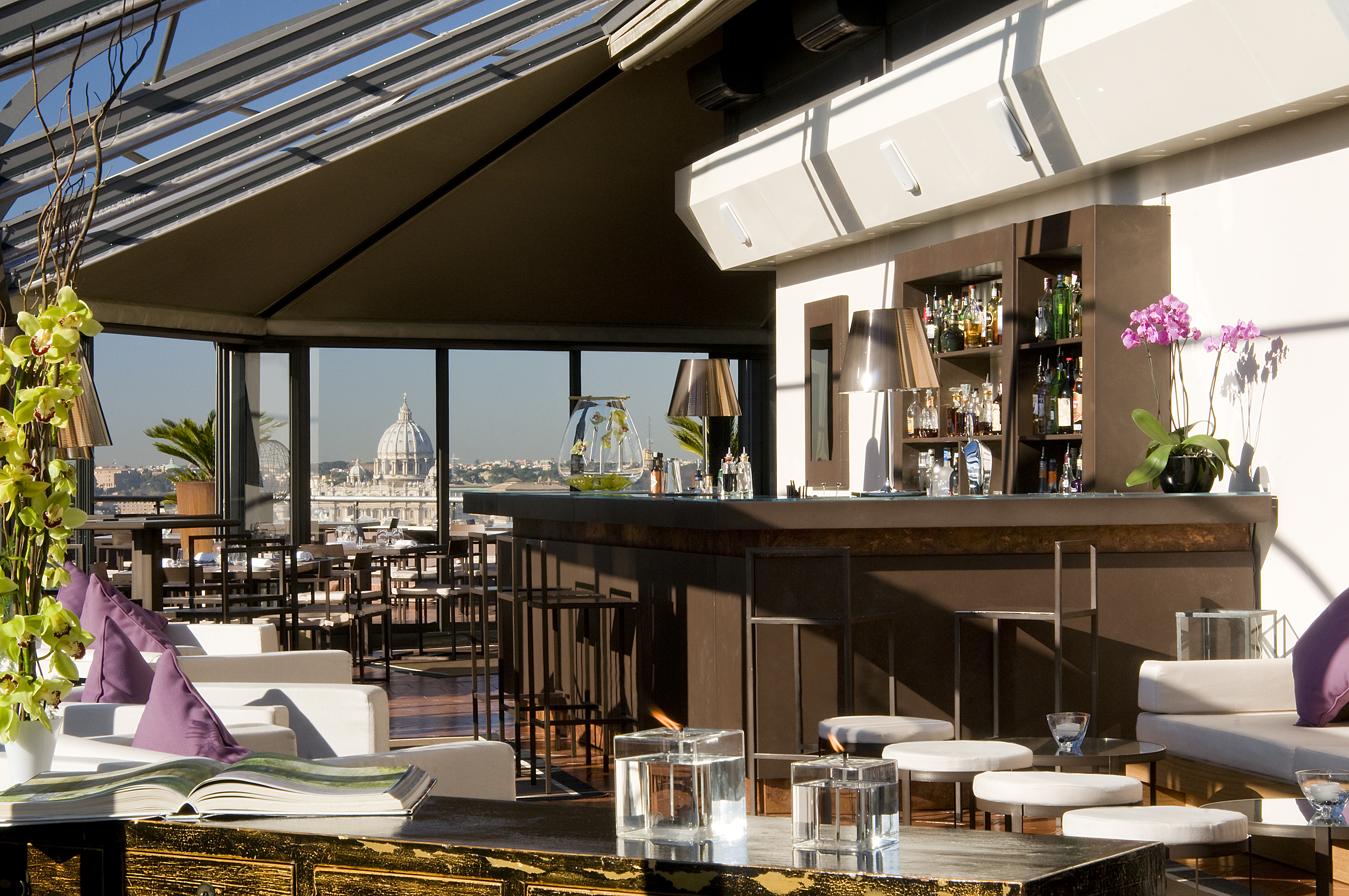 Le point fort : La Terrasse Cuisine & Lounge, donnant sur les jardins de la Villa Borghese, sur le magnifique parc de la Villa Médicis, avec comme toile de fond la Coupole de la Basilique Saint-Pierre, offre une vue unique sur la ‘Ville éternelle’. Un moment magique !