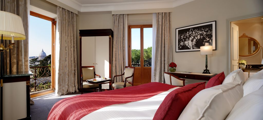 Situé dans un palais de 7 étages datant du dix-neuvième siècle de style « Natural Chic » et, à l’origine, dépendance de la famille Ludovisi-Boncompagni, l’hôtel fut ouvert en 1890 par un riche italien qui l’appelât Hôtel Boston, en hommage à la ville américaine où il fit fortune. Ce lieu fut fréquenté par des artistes, des acteurs ainsi que des producteurs durant les années 30 puis pendant la période de la Dolce Vita, et il accueillit des célébrités telles que Federico Fellini, lequel avait l’habitude de séjourner dans l’une des suites du septième étage, Ava Gardner et Walter Chiari qui choisirent ce lieu pour vivre leurs amours loin des paparazzis, Maria Mercader et Vittorio De Sica qui, selon la légende, y conçurent leur fils, Christian De Sica.