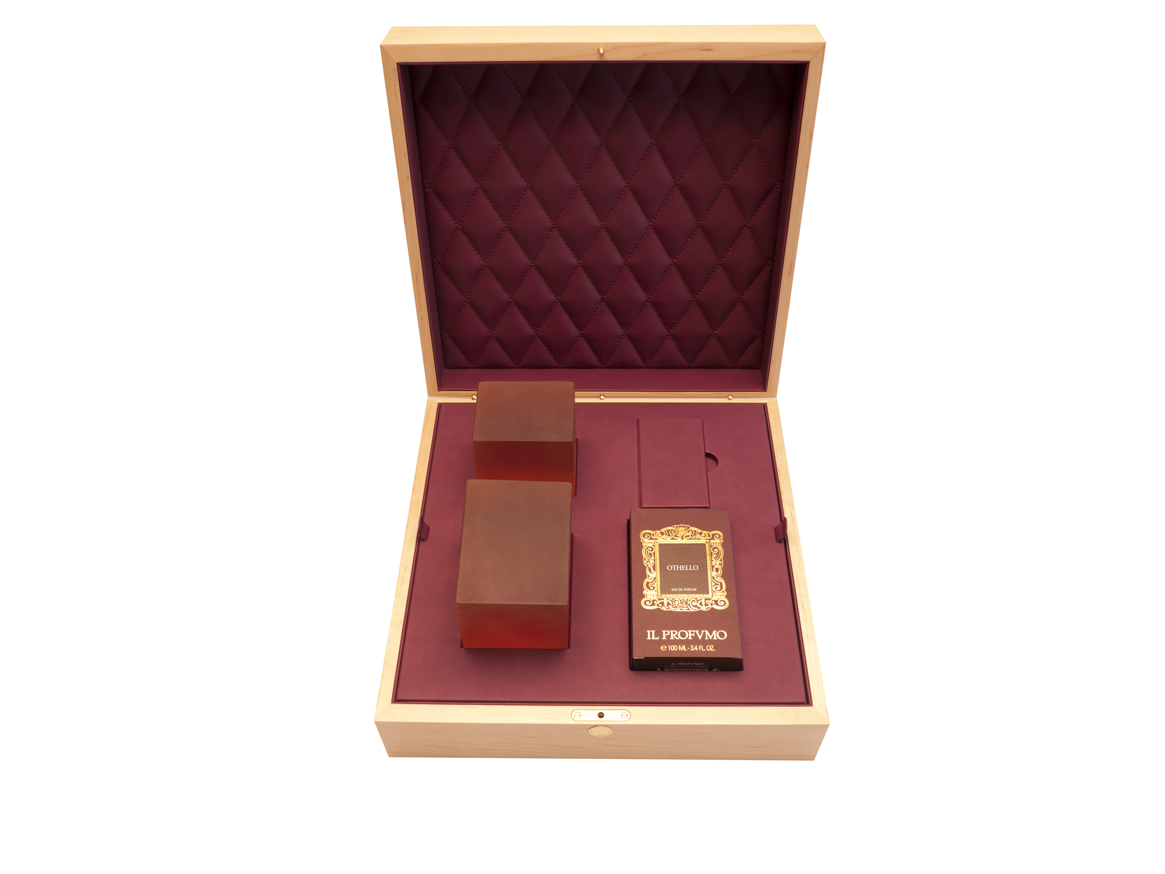Le coffret d’Othello, avec son extérieur en bois d’érable satiné et veiné, affiche des lignes pures et lisses. Une fois ouvert, un contraste poignant s’opère: c’est tout le raffinement italien qui s’exprime dans un cuir bordeaux finement matelassé. Un coffret de grooming pour un gentleman sophistiqué qui vient accueillir une précieuse composition olfactive. Ce plaisir d’esthète limité à 50 exemplaires, se collectionne et se laisse admirer dans sa forme la plus pure. Sur comptoir et sur www.ilprofumo.com dès le 5 Septembre 2016, disponible en 50mL (105€), 100mL (149€) et également en Edition Limitée Murano avec l’eau de parfum (2500€), Othello vous invite à participer à sa tragédie pleine de senteurs.