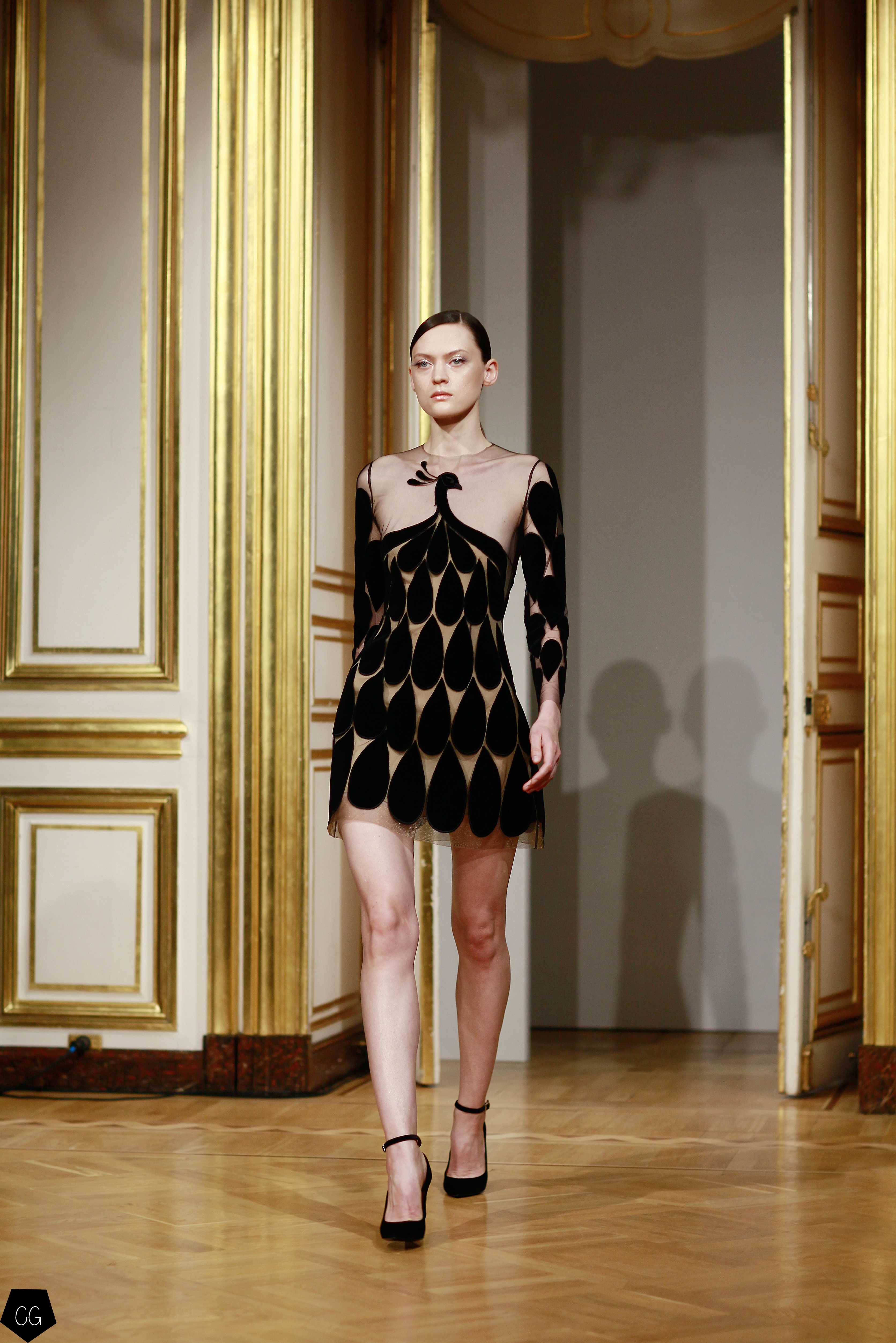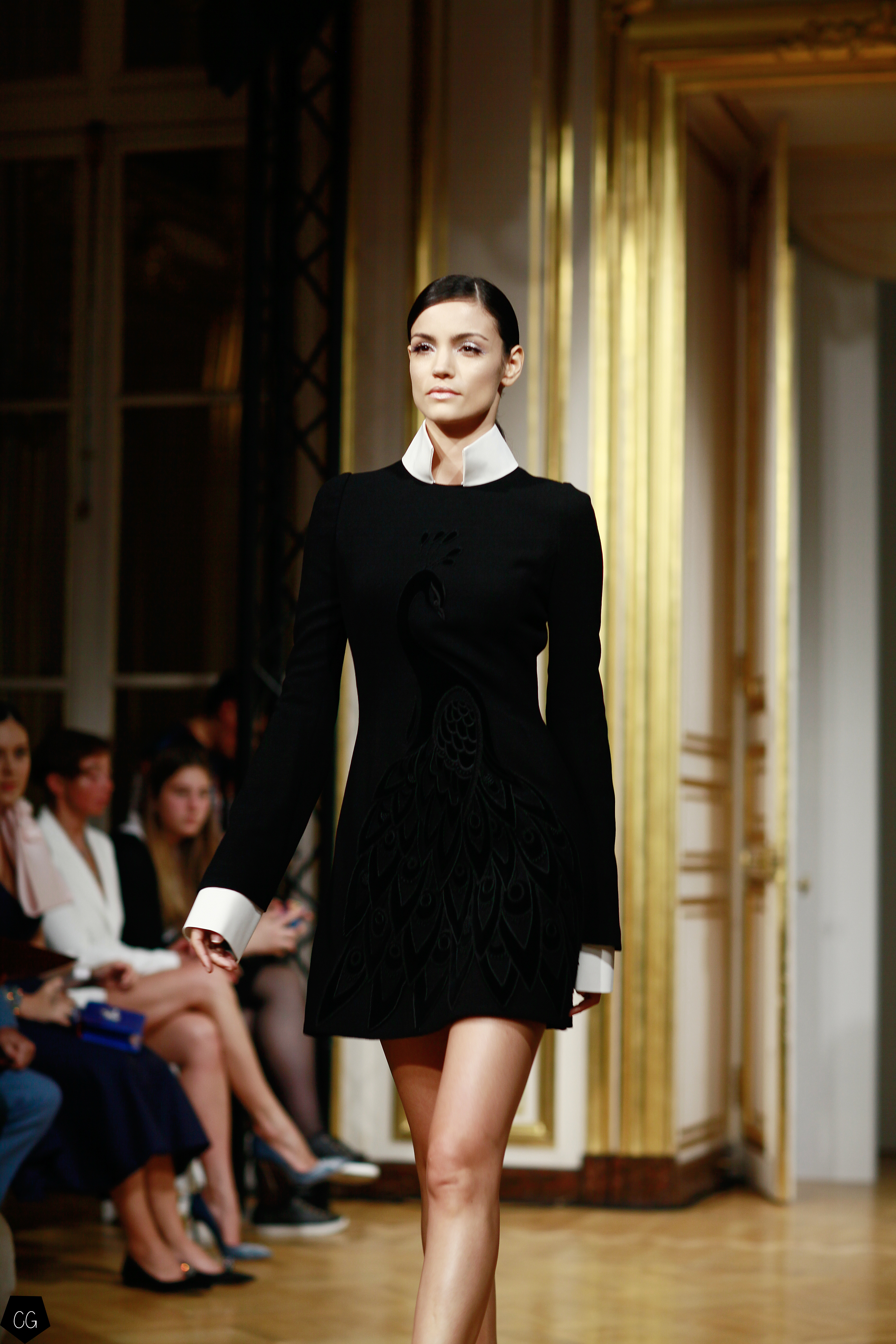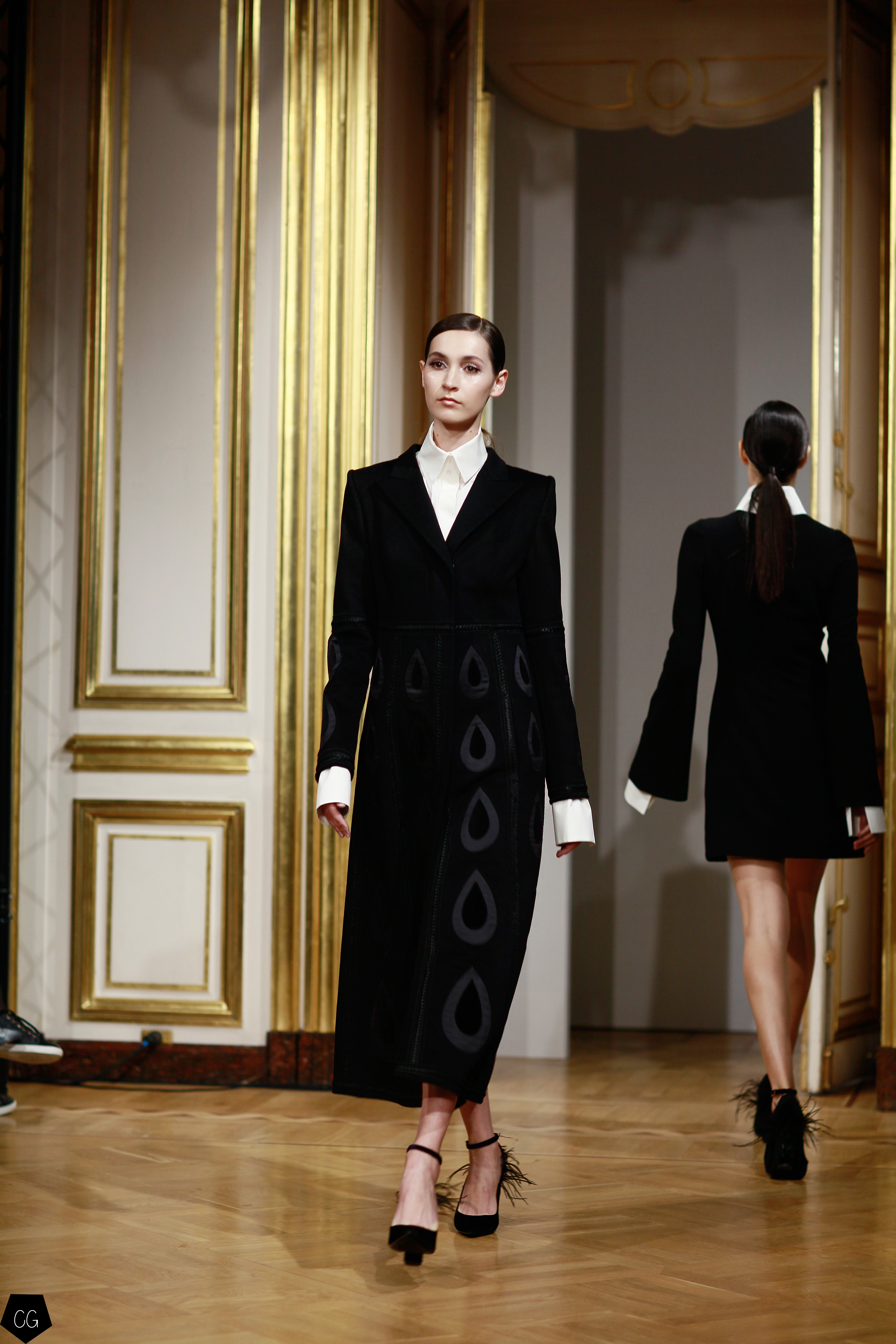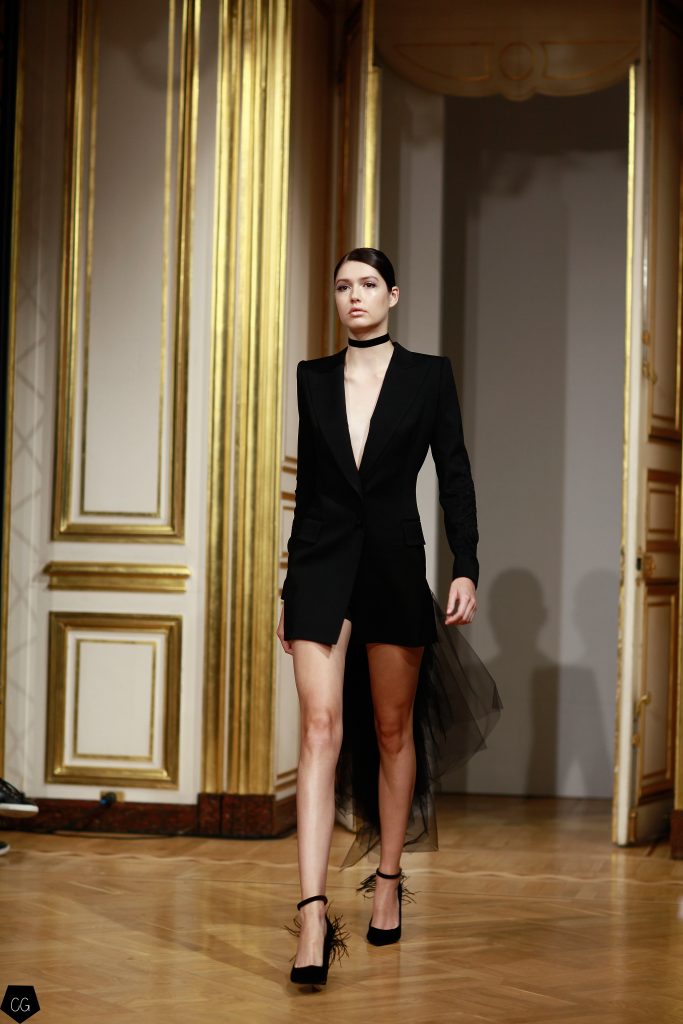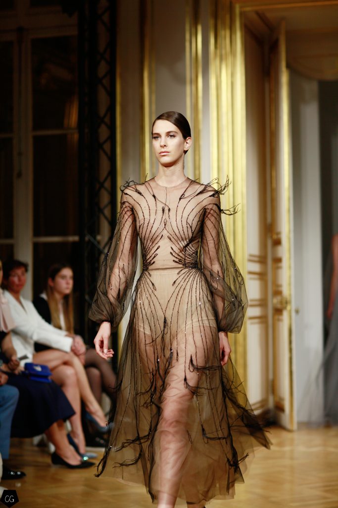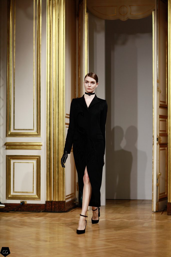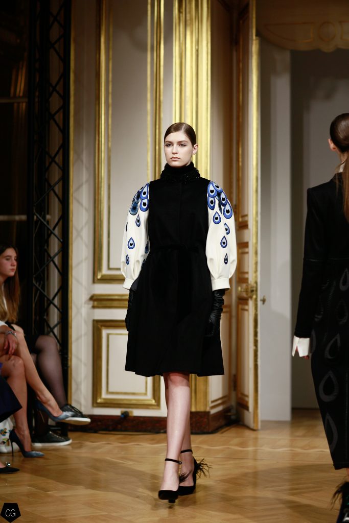 Cette collection est envoûtante, mais aussi fantastique et féerique, le défilé nous emmène dans un univers mystérieux, chargé d’émotions, les premiers modèles d’un noir intense, jouent avec les transparences et les parties dénudées. Les motifs de plumes noires semblent être à même la peau. Une série de longs manteaux noirs en velours, en peau et en fourrure aux volumes amples, recouverts de broderies brillantes comme des oiseaux de nuit.