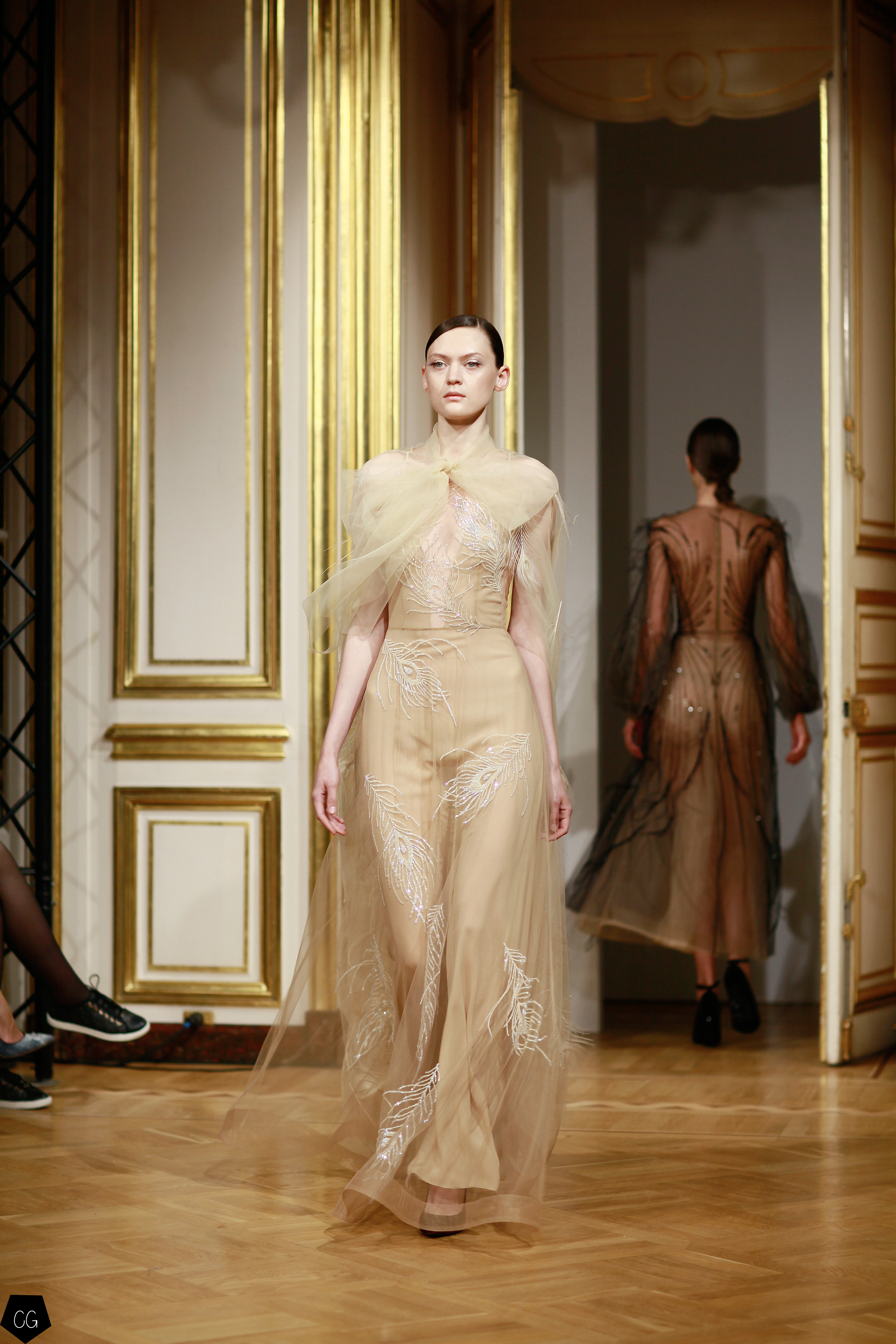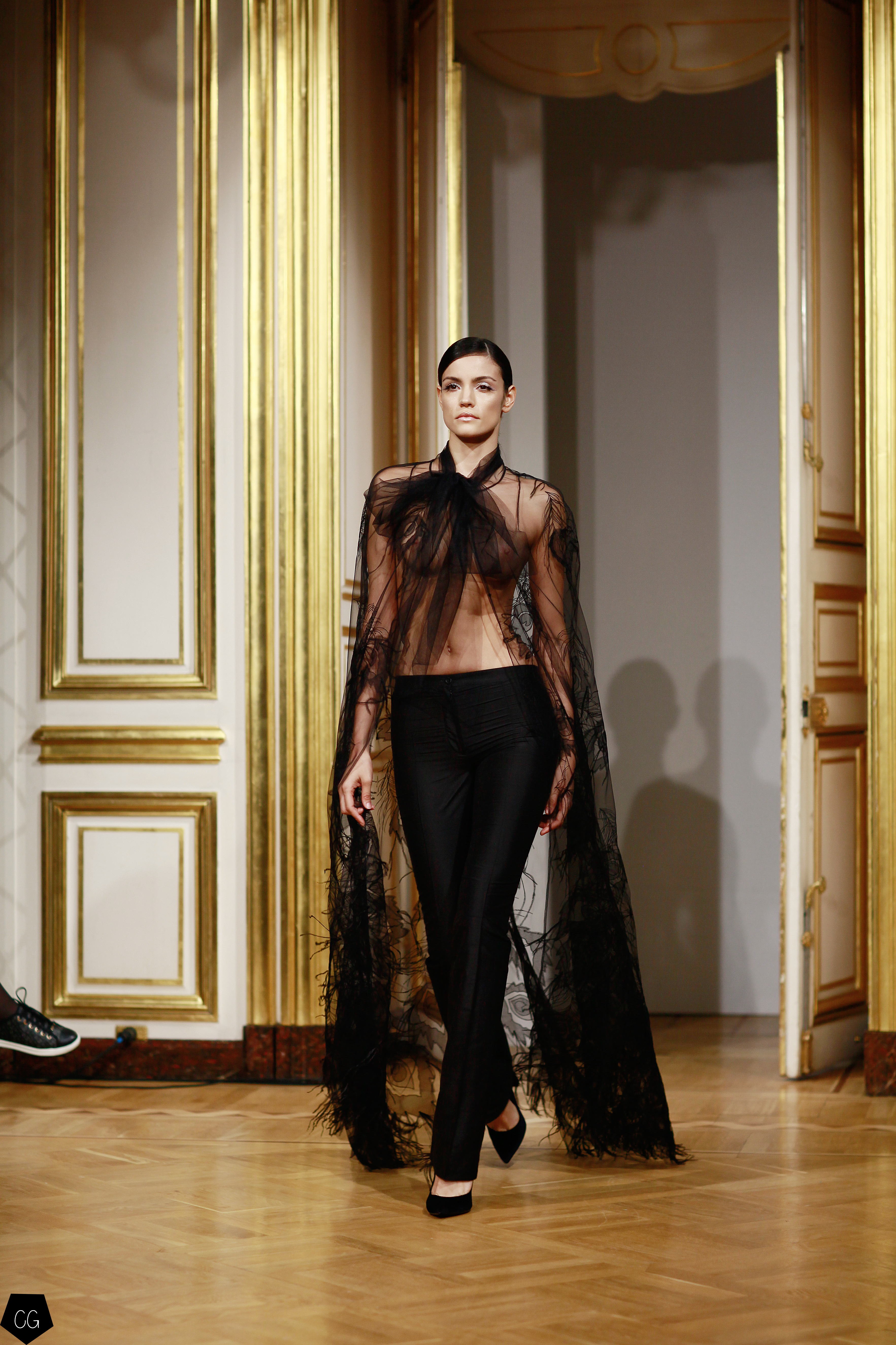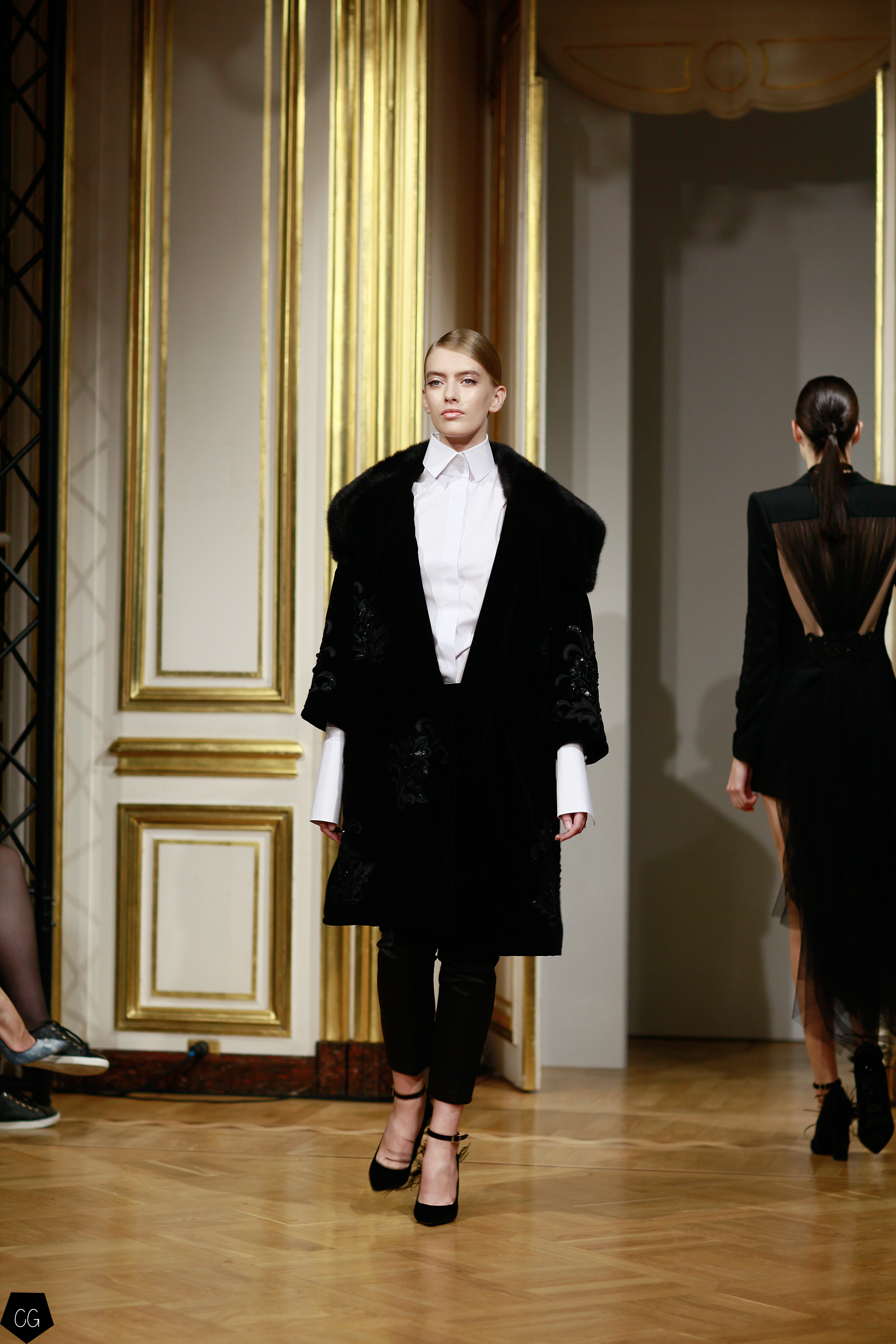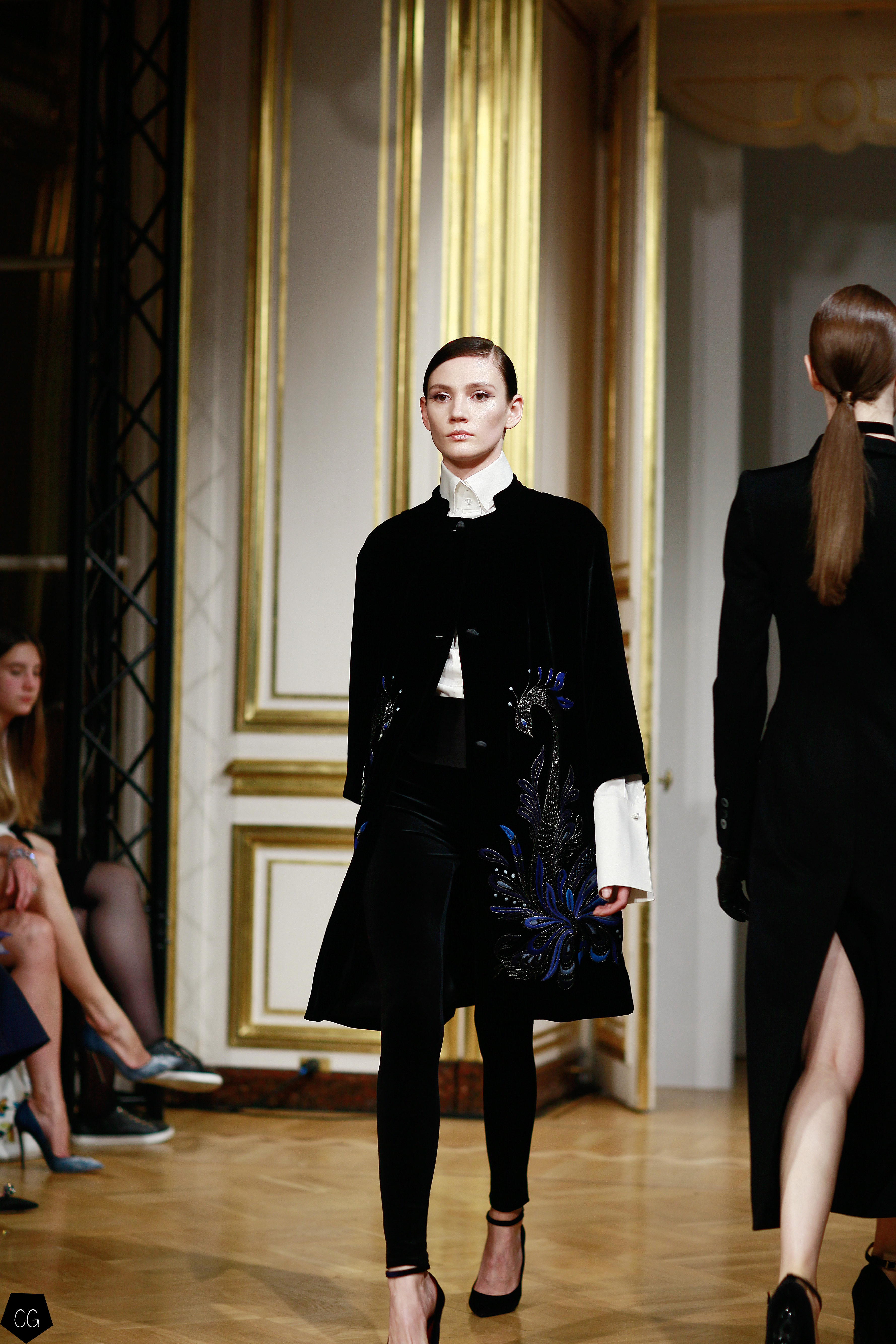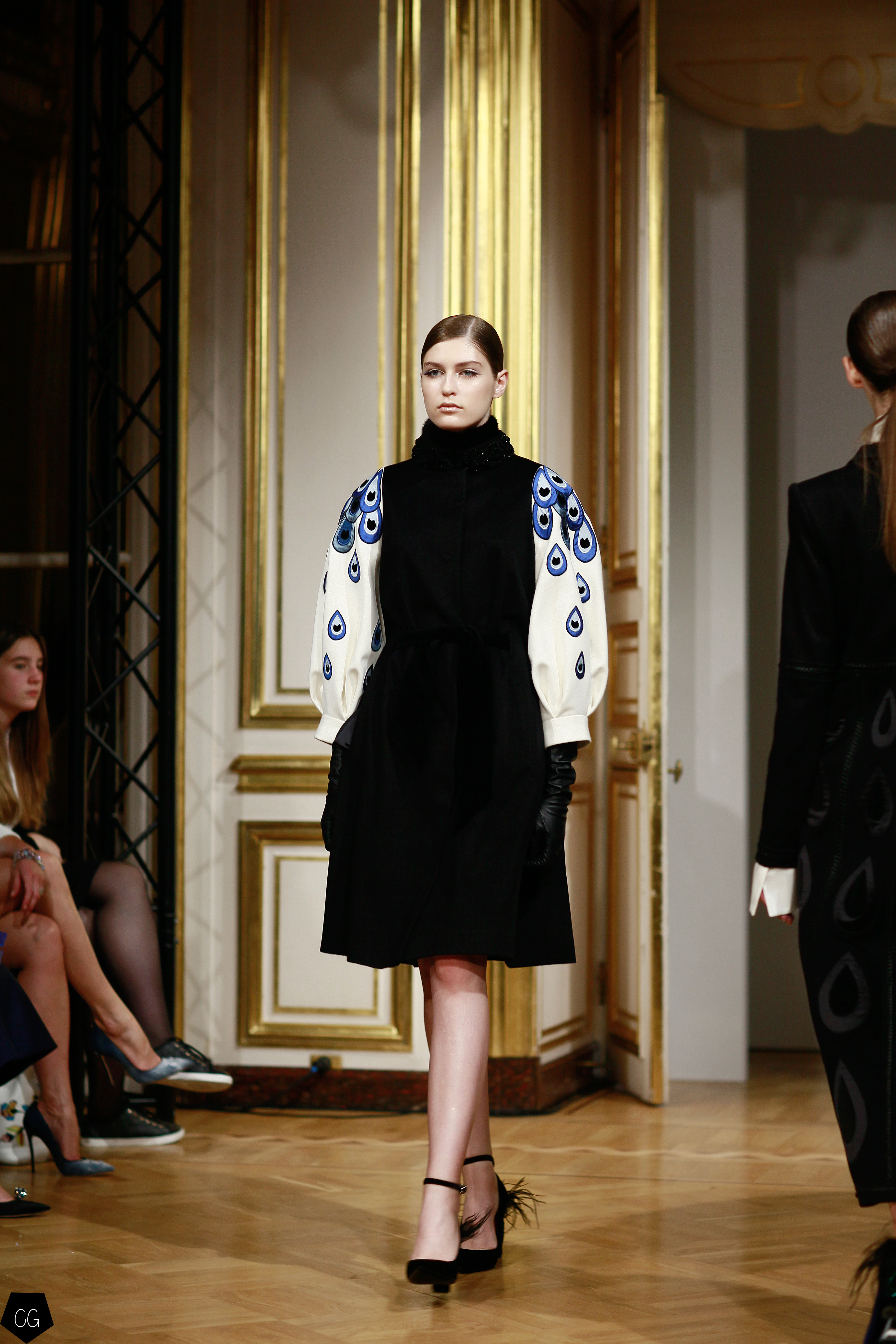 Cette collection est envoûtante, mais aussi fantastique et féerique, le défilé nous emmène dans un univers mystérieux, chargé d’émotions, les premiers modèles d’un noir intense, jouent avec les transparences et les parties dénudées. Les motifs de plumes noires semblent être à même la peau. Une série de longs manteaux noirs en velours, en peau et en fourrure aux volumes amples, recouverts de broderies brillantes comme des oiseaux de nuit.