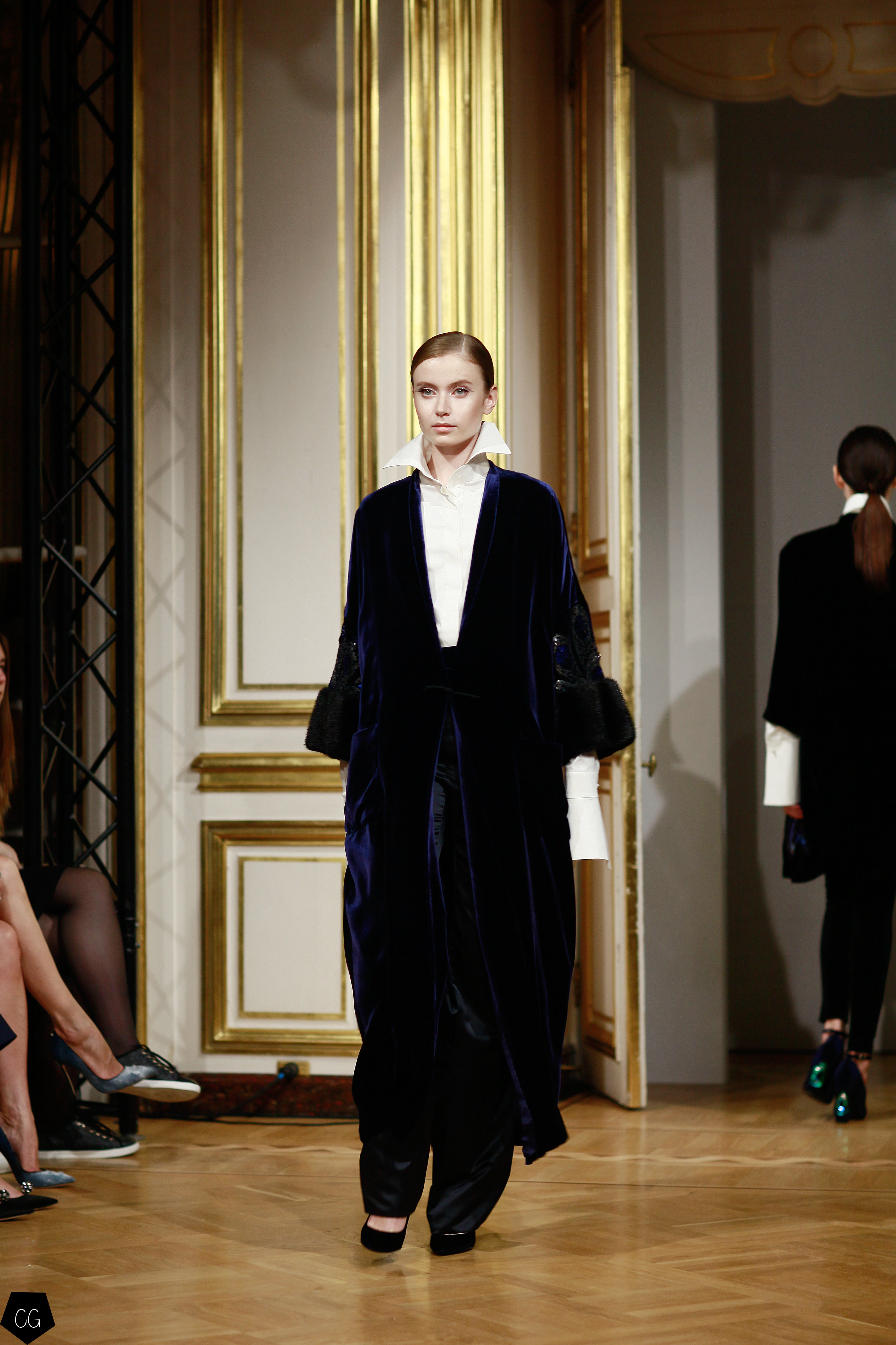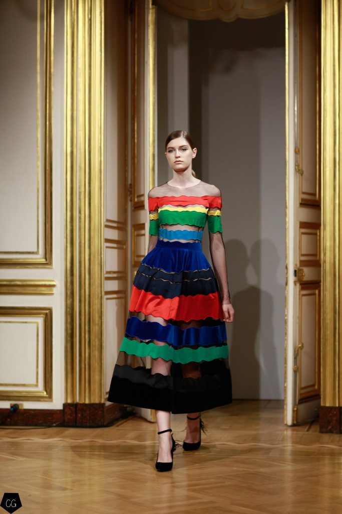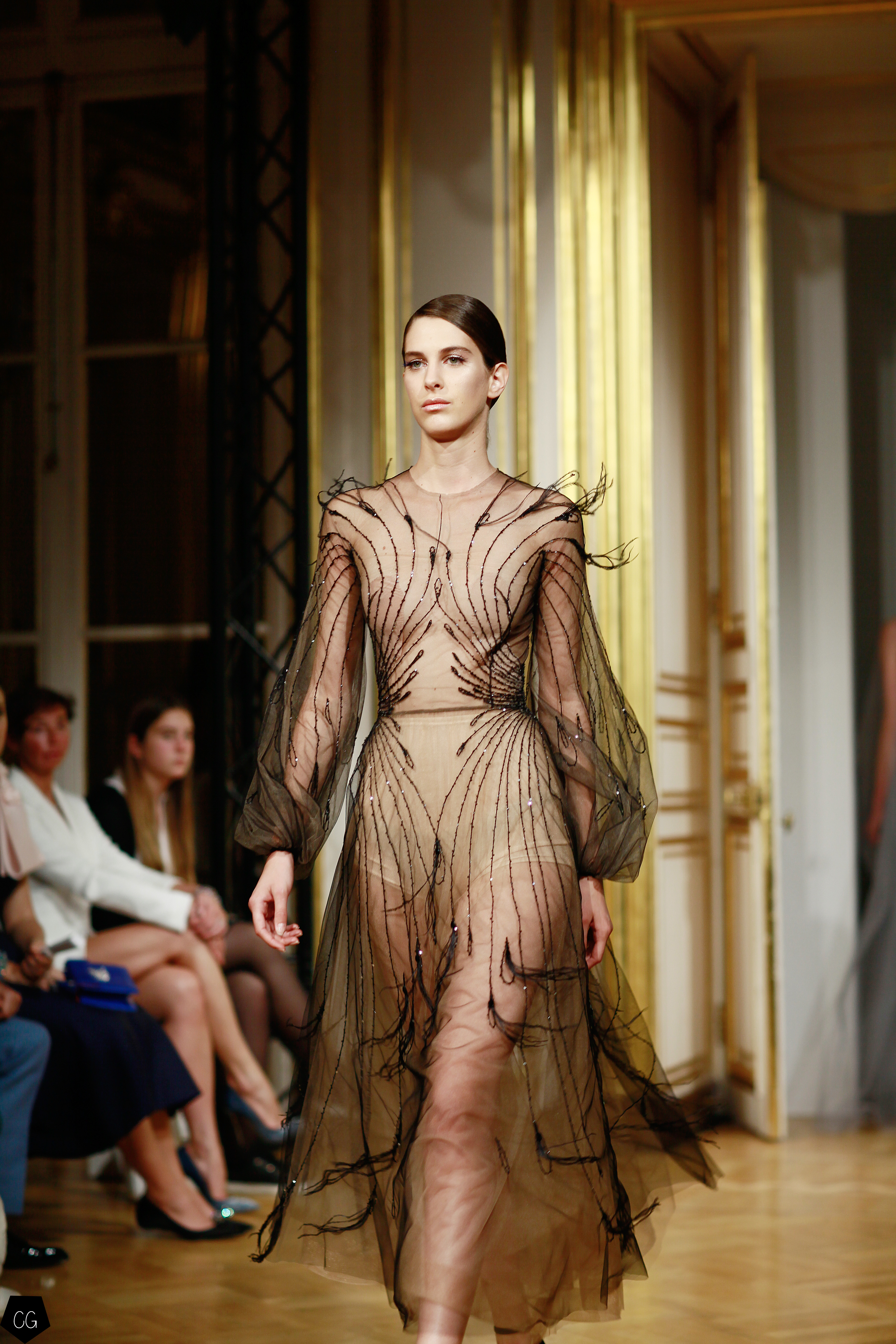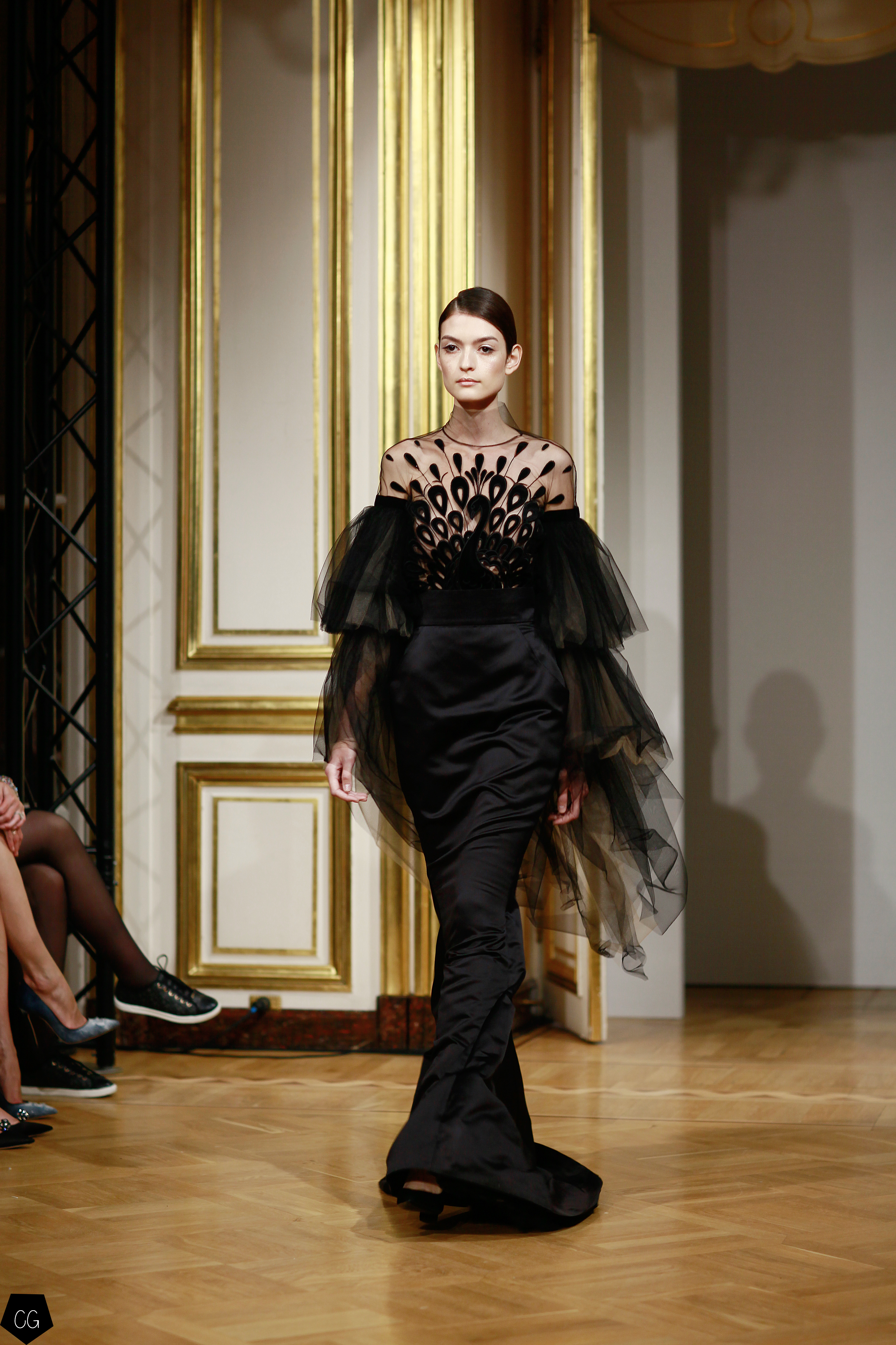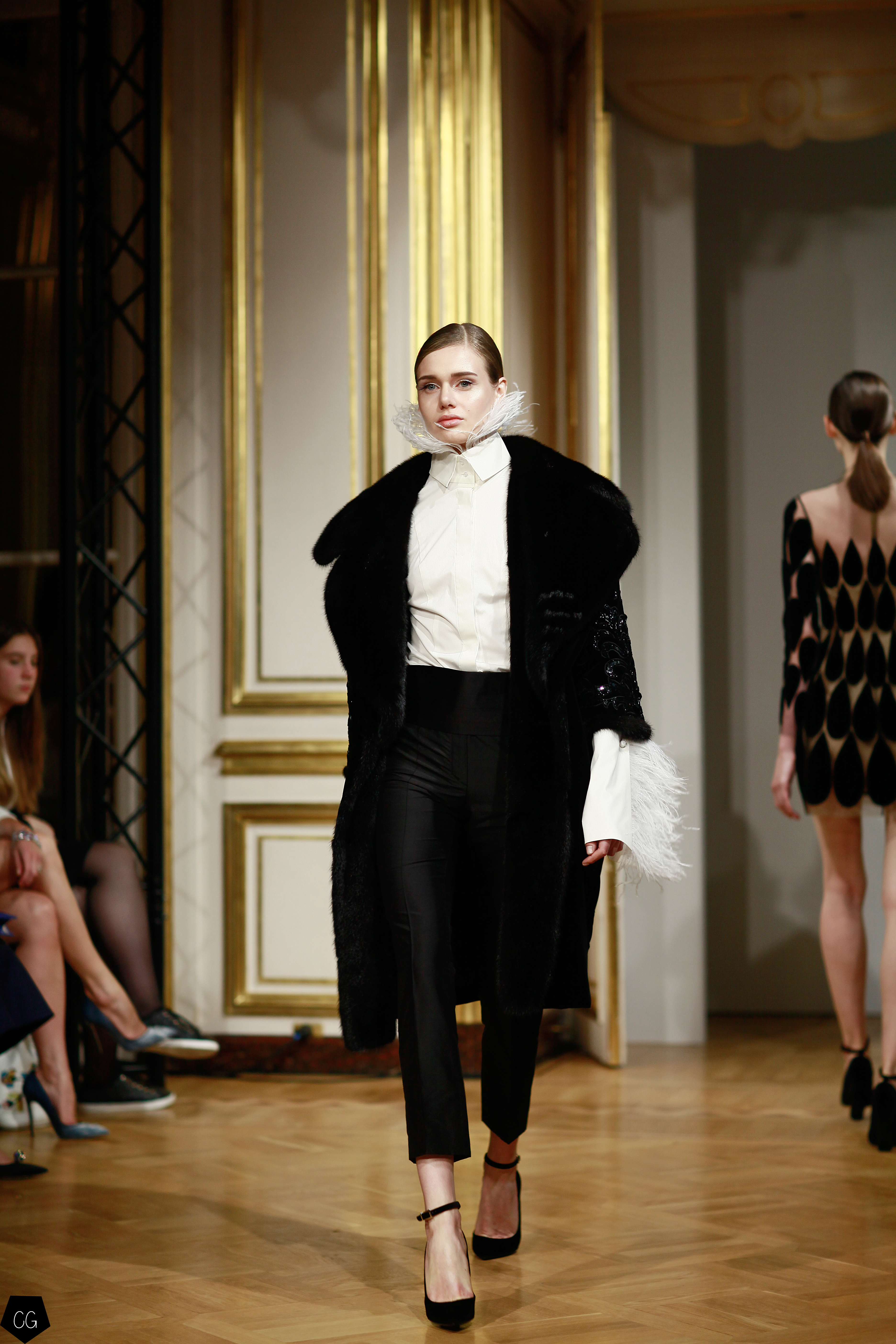 Cette collection est envoûtante, mais aussi fantastique et féerique, le défilé nous emmène dans un univers mystérieux, chargé d’émotions, les premiers modèles d’un noir intense, jouent avec les transparences et les parties dénudées. Les motifs de plumes noires semblent être à même la peau. Une série de longs manteaux noirs en velours, en peau et en fourrure aux volumes amples, recouverts de broderies brillantes comme des oiseaux de nuit.