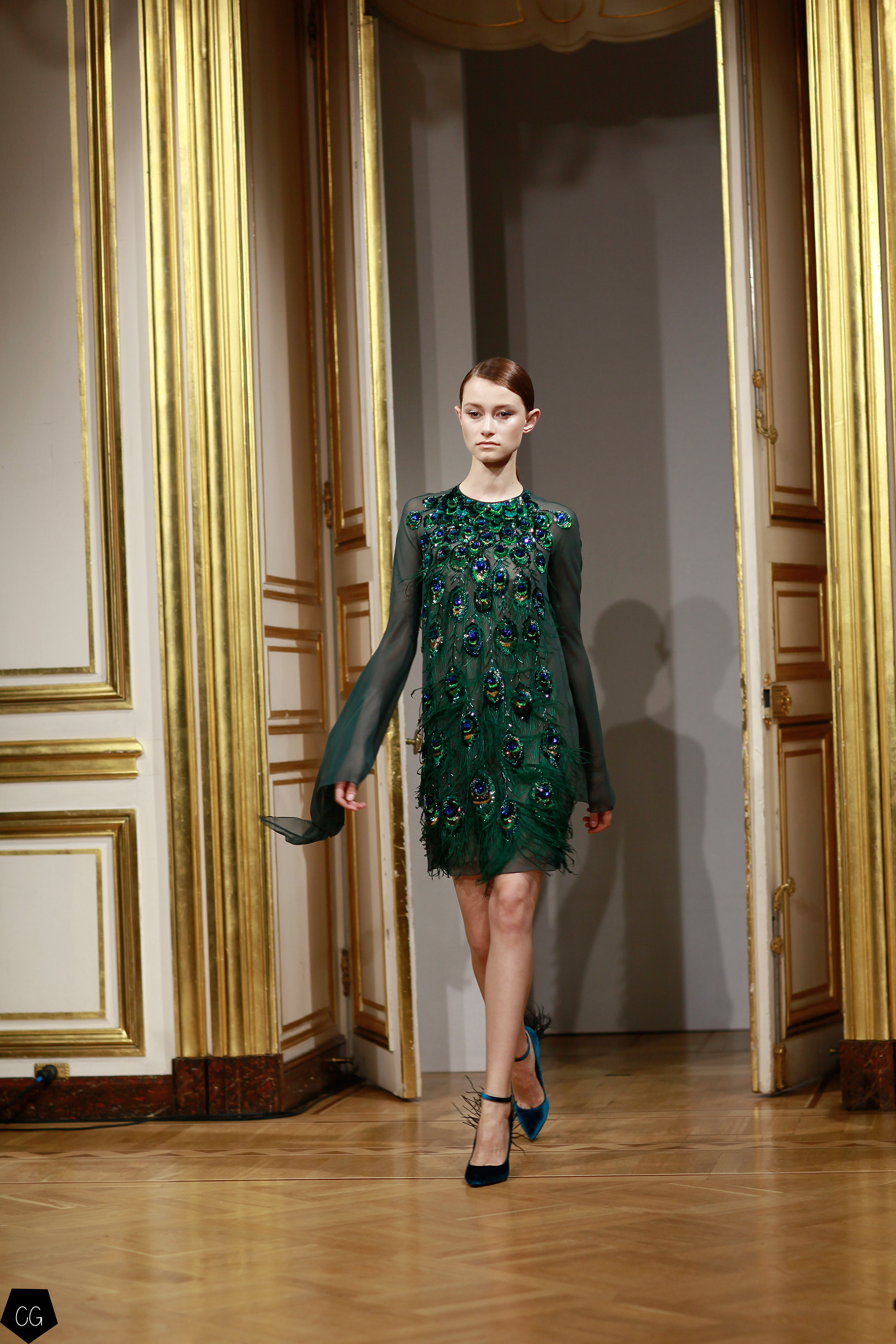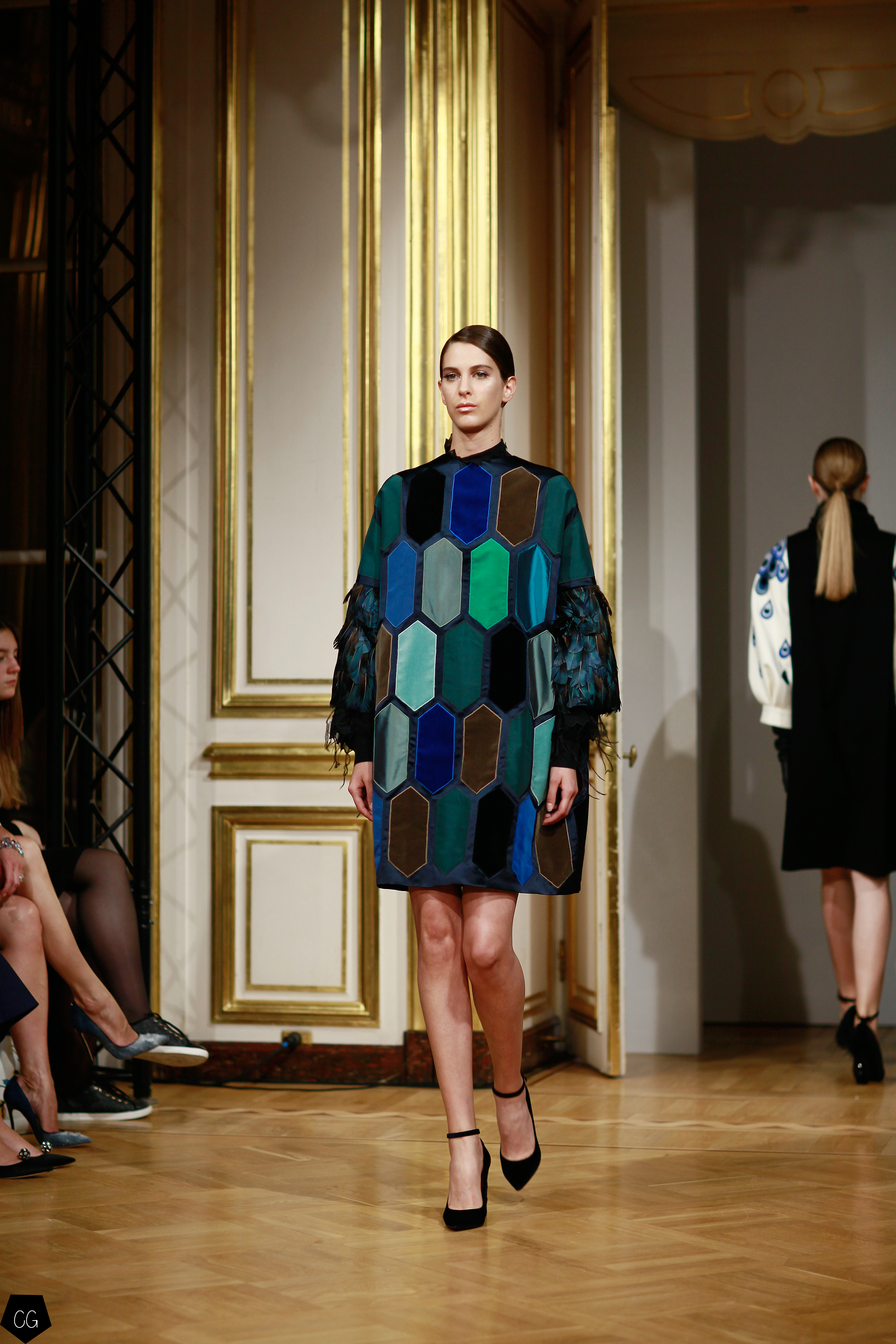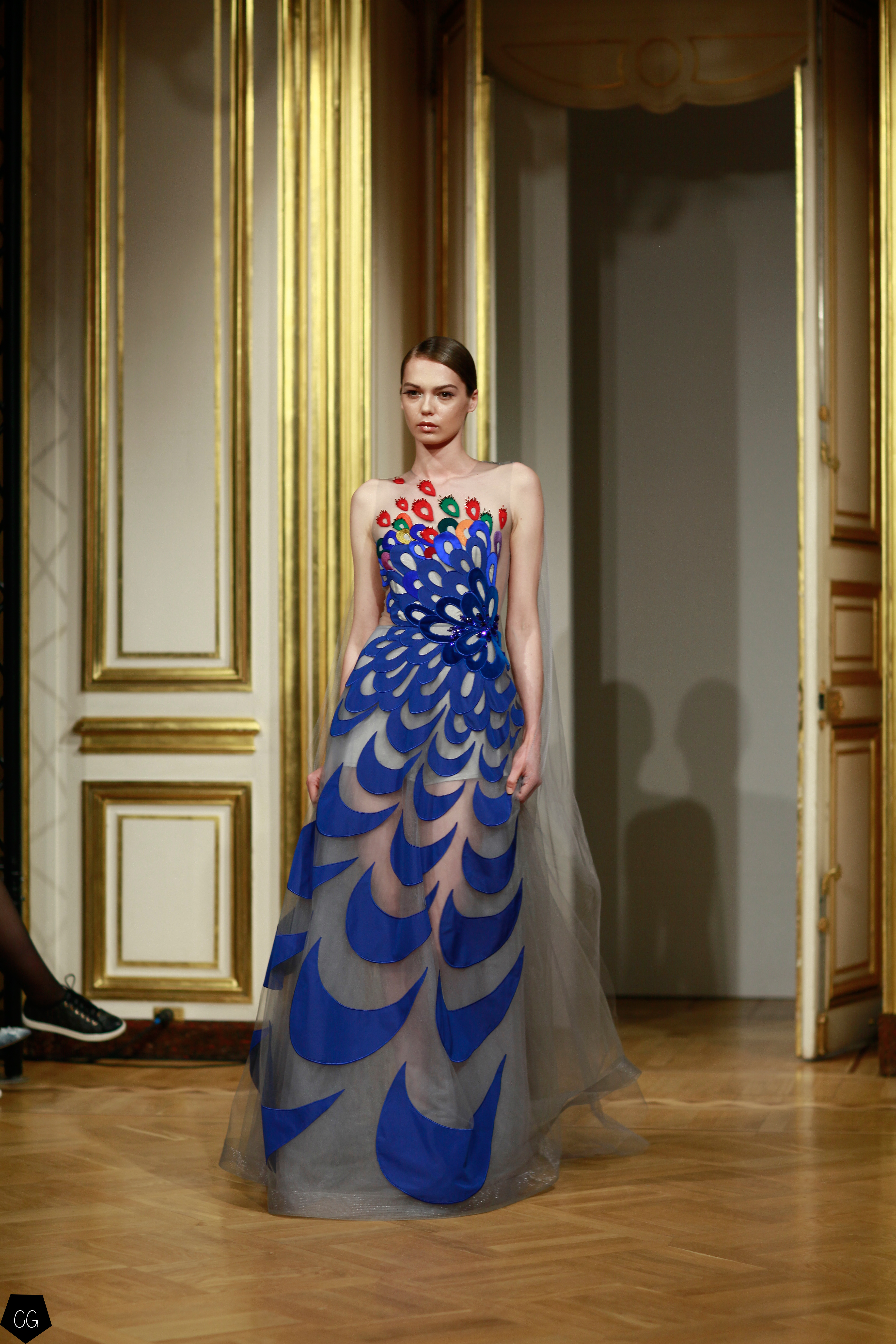 Puis les couleurs commencent à apparaître avec du bleu, du gris et du blanc, petit à petit, les couleurs éclatantes dominent, manteau blanc et robe bleue bordée de motifs noirs et bleus représentant des éléments de la plume du paon. Les couleurs irradient la lumière. Les modèles se parent d’éléments tels que des plumes, des pièces de couleurs bleues et vertes aux reflets intenses.