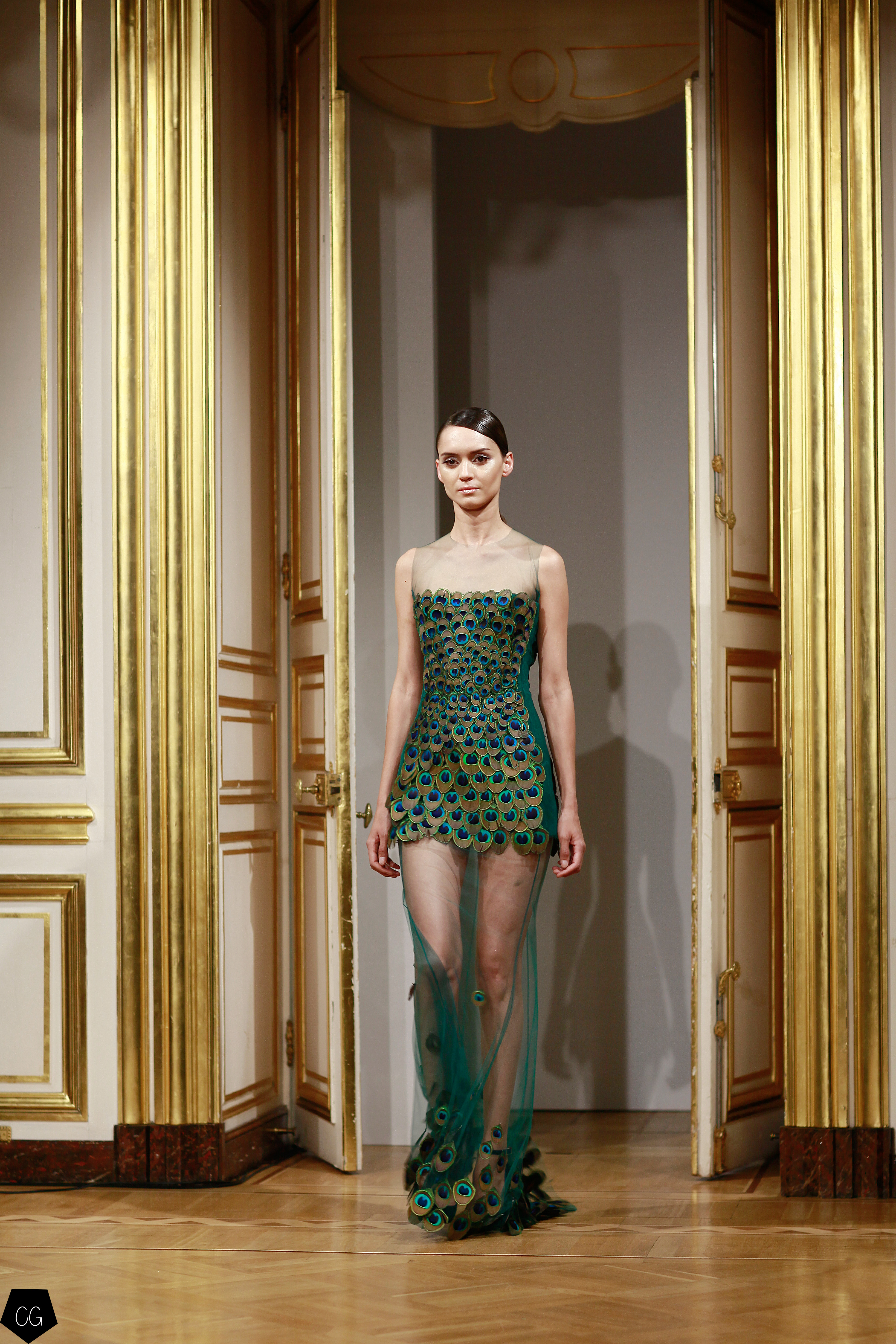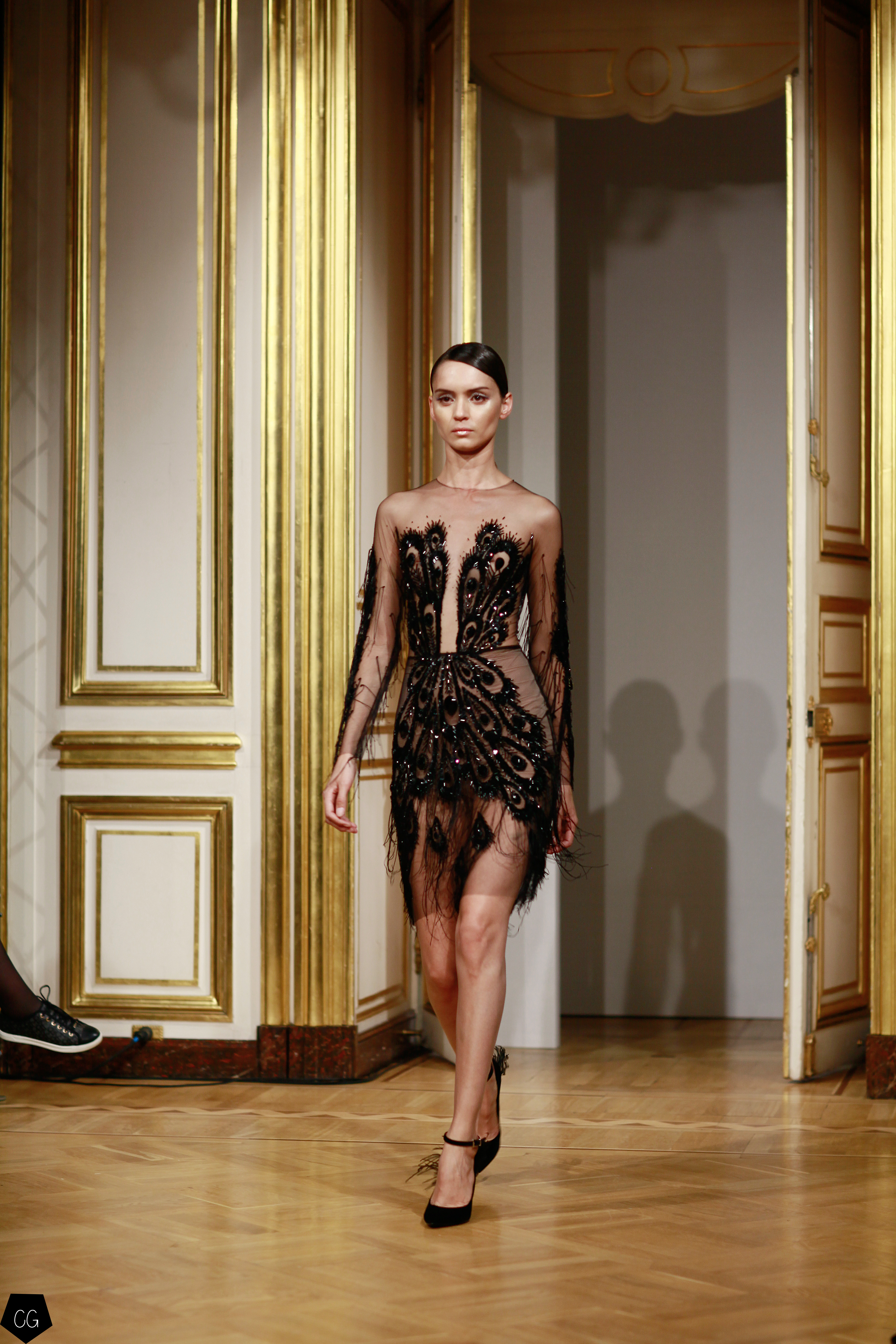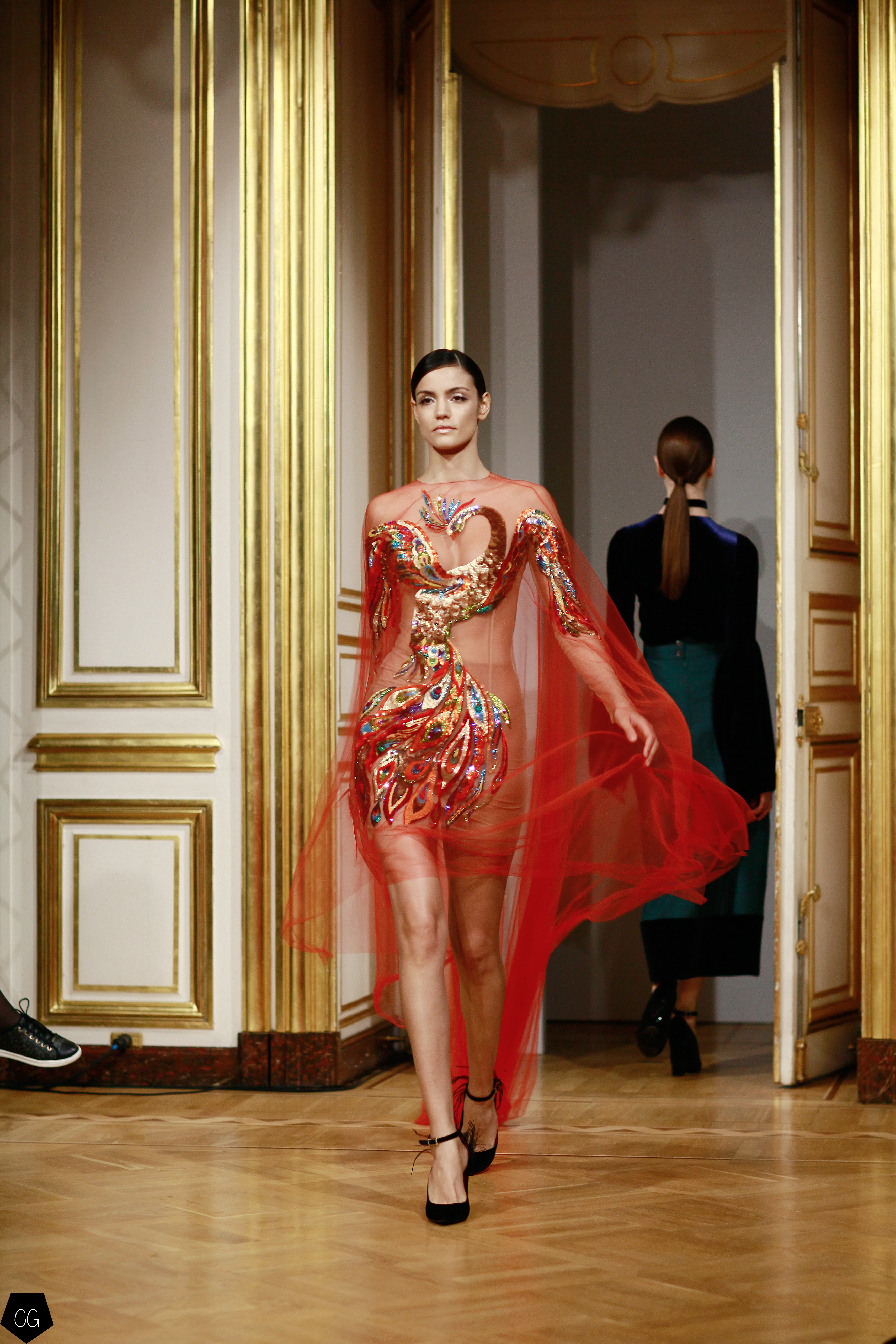 La femme devient cet oiseau majestueux, son corps porte les plumes de paon qui en font une créature ensorcelante, les robes deviennent d’un rouge écarlate, puis de la transparence naît l’oiseau de feu entièrement brodé sur ru voile rouge transparent dont les courbes recouvrent la poitrine, les épaules, le ventre et les  hanches. Une série de modèles se décline dans le noir et blanc transparent, rebrodé de paillettes et de perles.