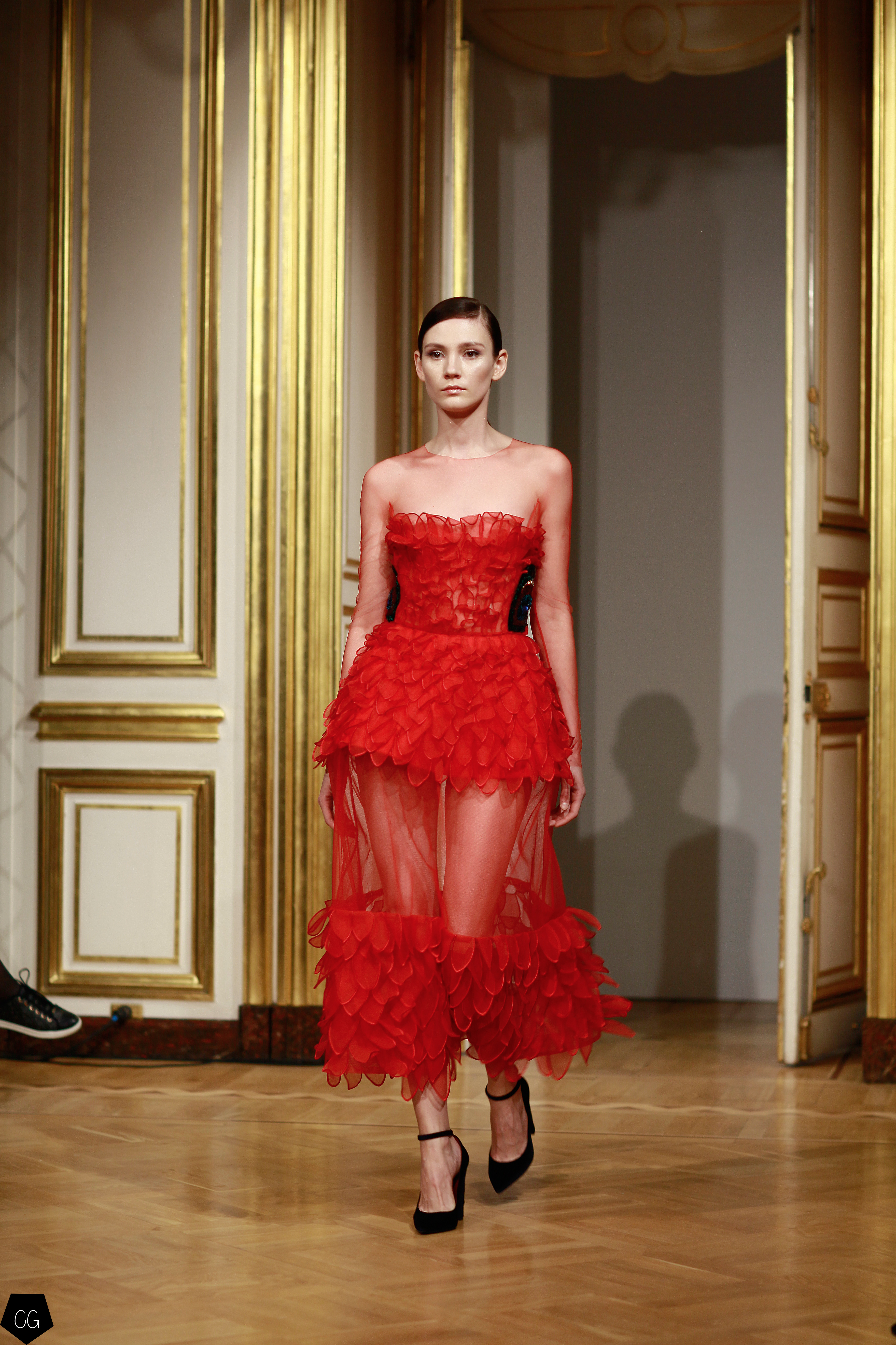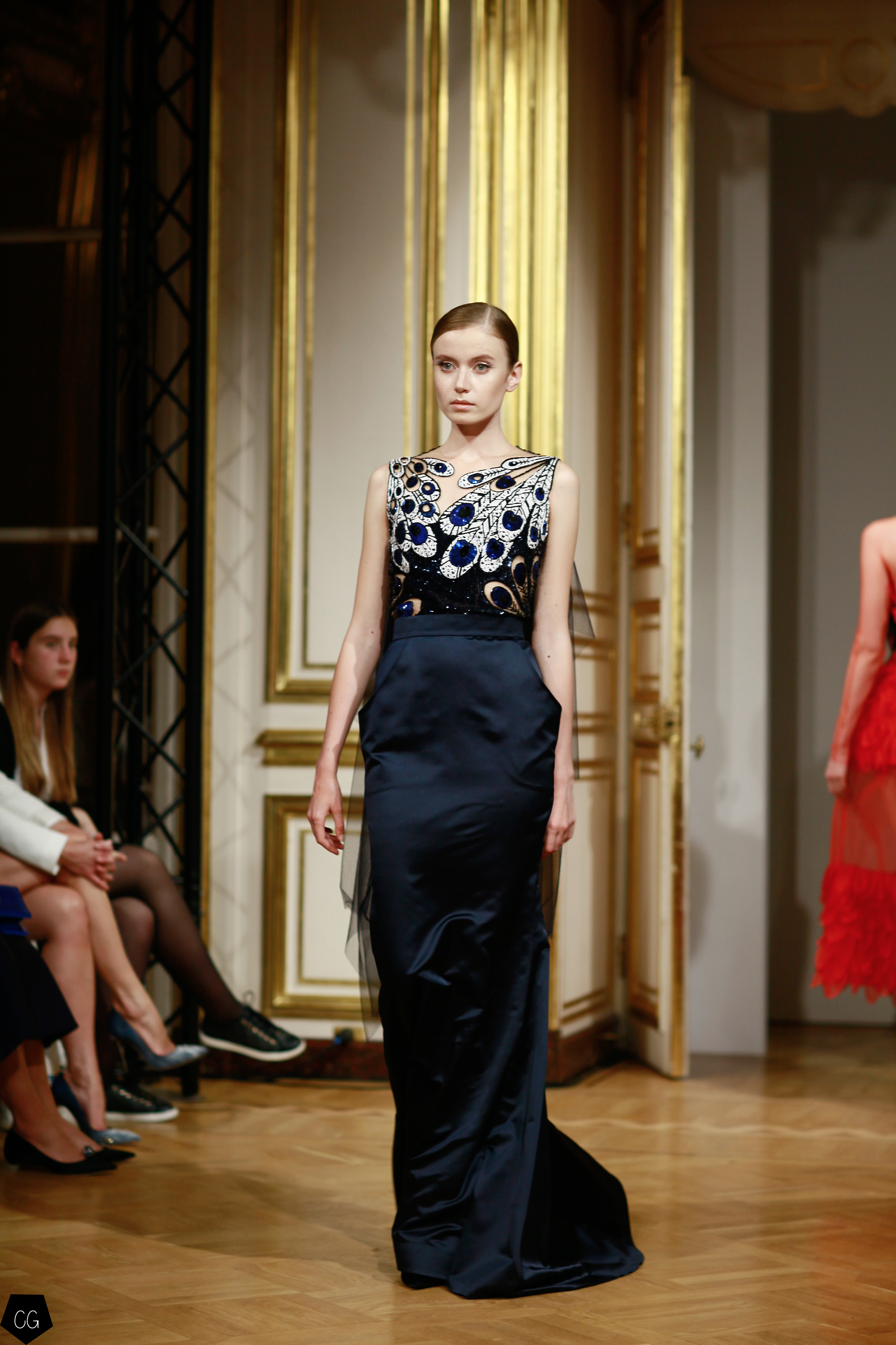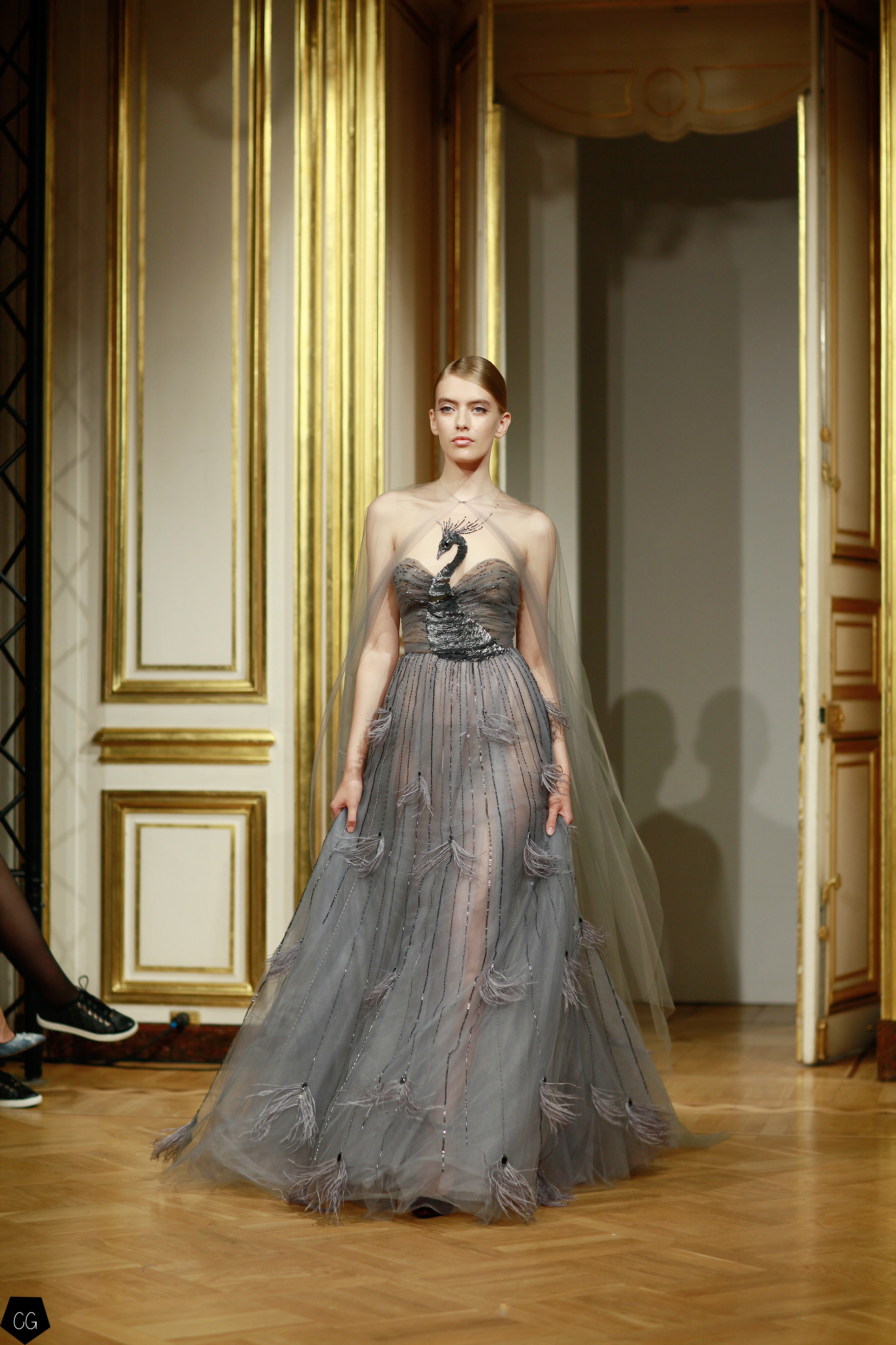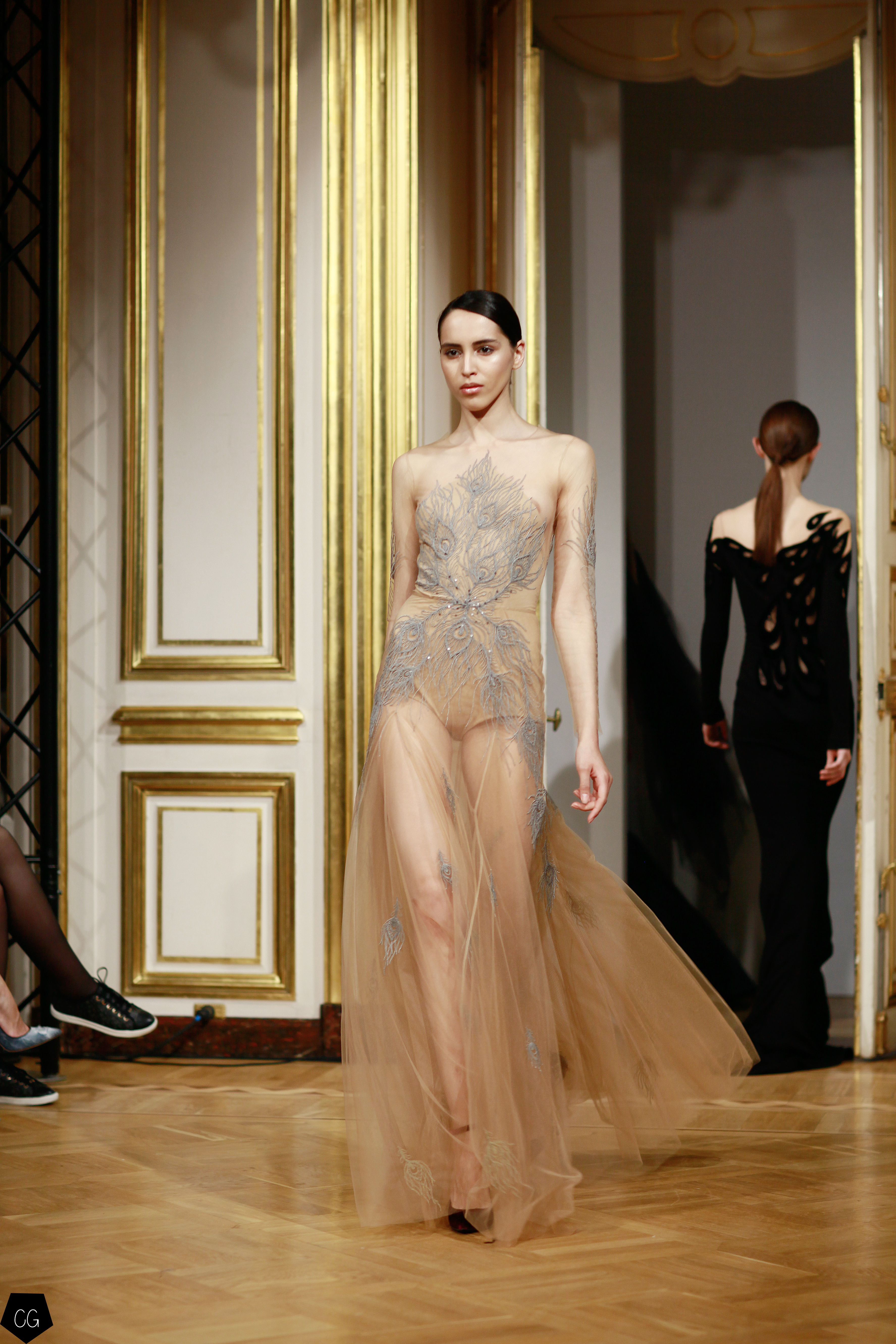 La femme devient cet oiseau majestueux, son corps porte les plumes de paon qui en font une créature ensorcelante, les robes deviennent d’un rouge écarlate, puis de la transparence naît l’oiseau de feu entièrement brodé sur ru voile rouge transparent dont les courbes recouvrent la poitrine, les épaules, le ventre et les  hanches. Une série de modèles se décline dans le noir et blanc transparent, rebrodé de paillettes et de perles.
