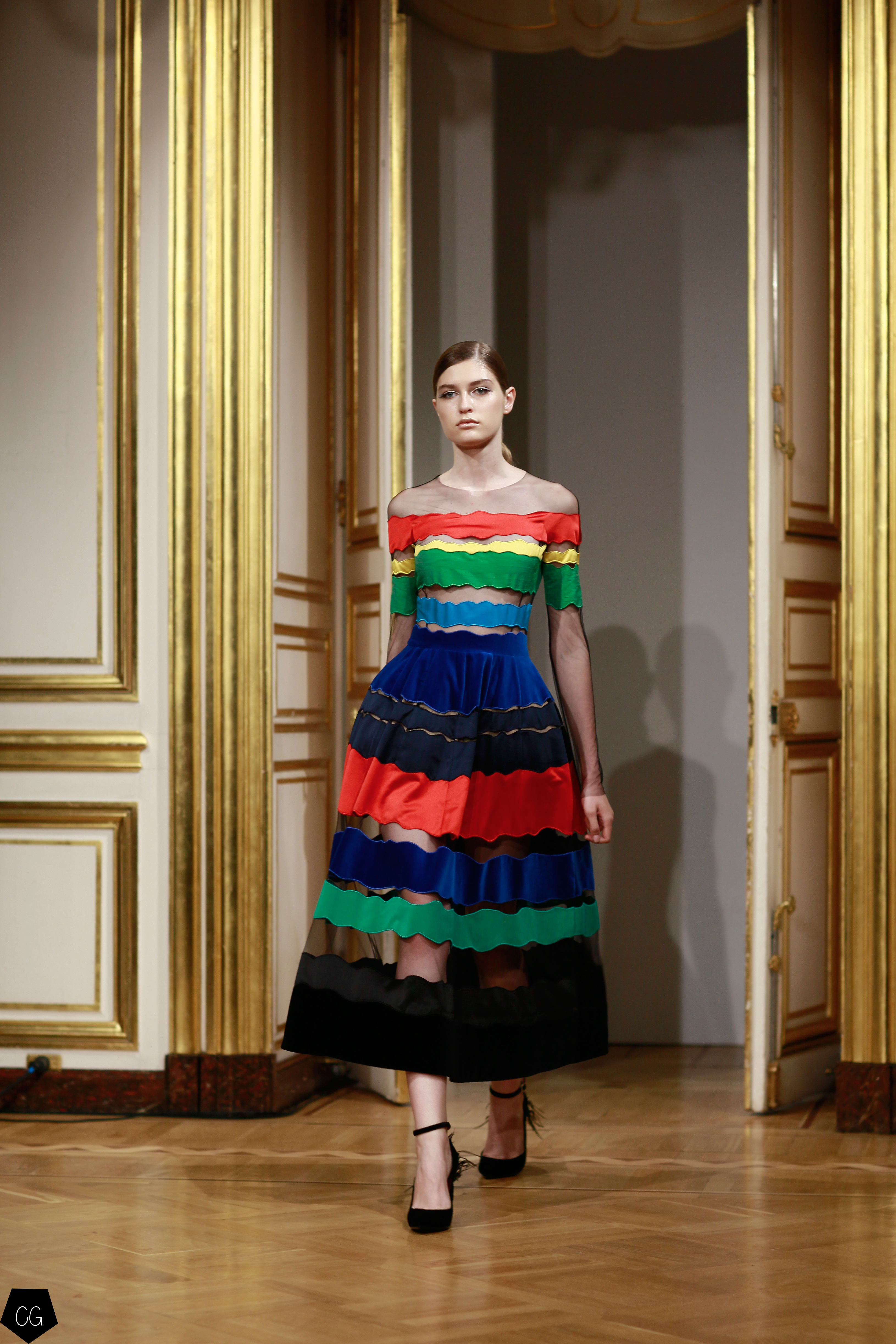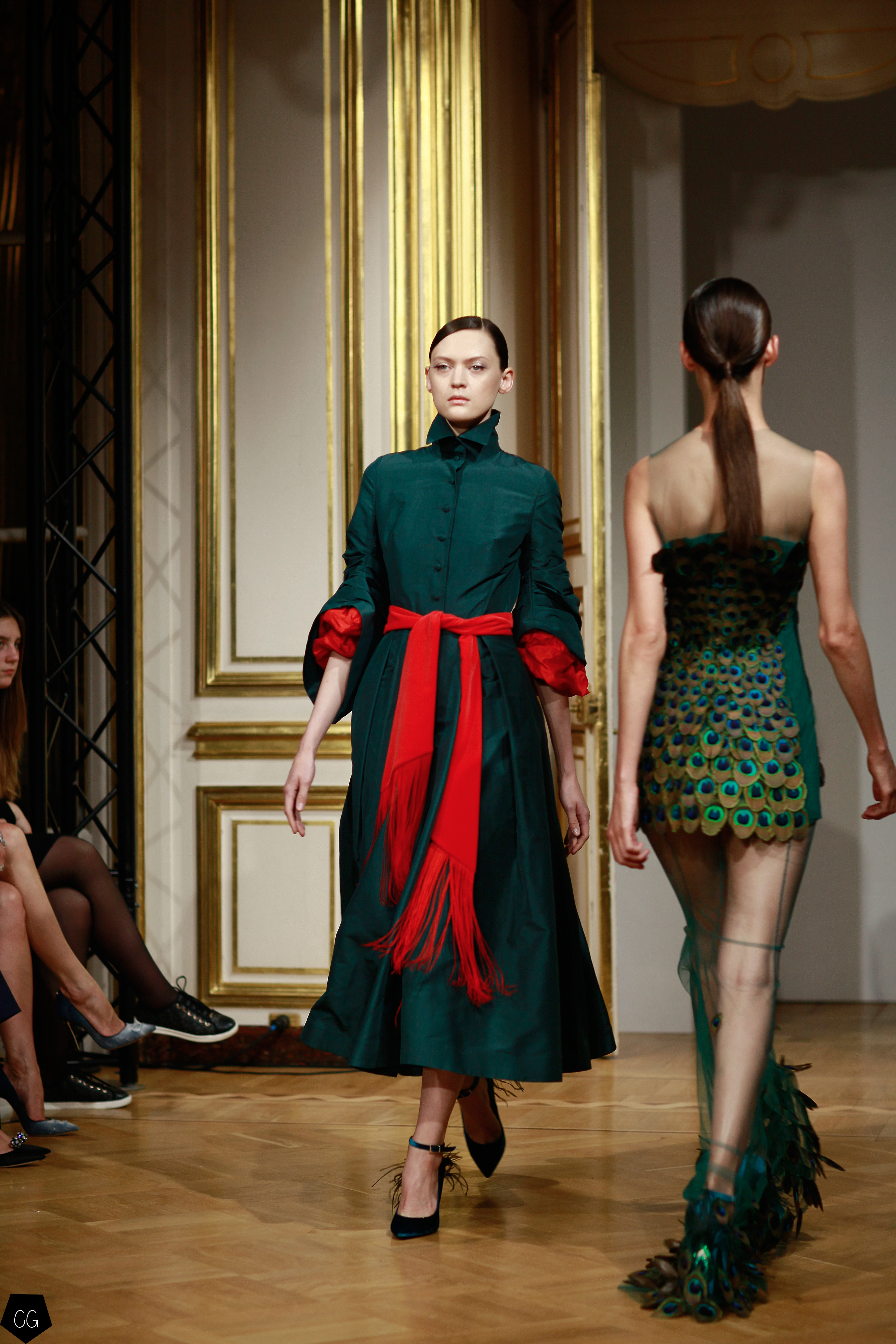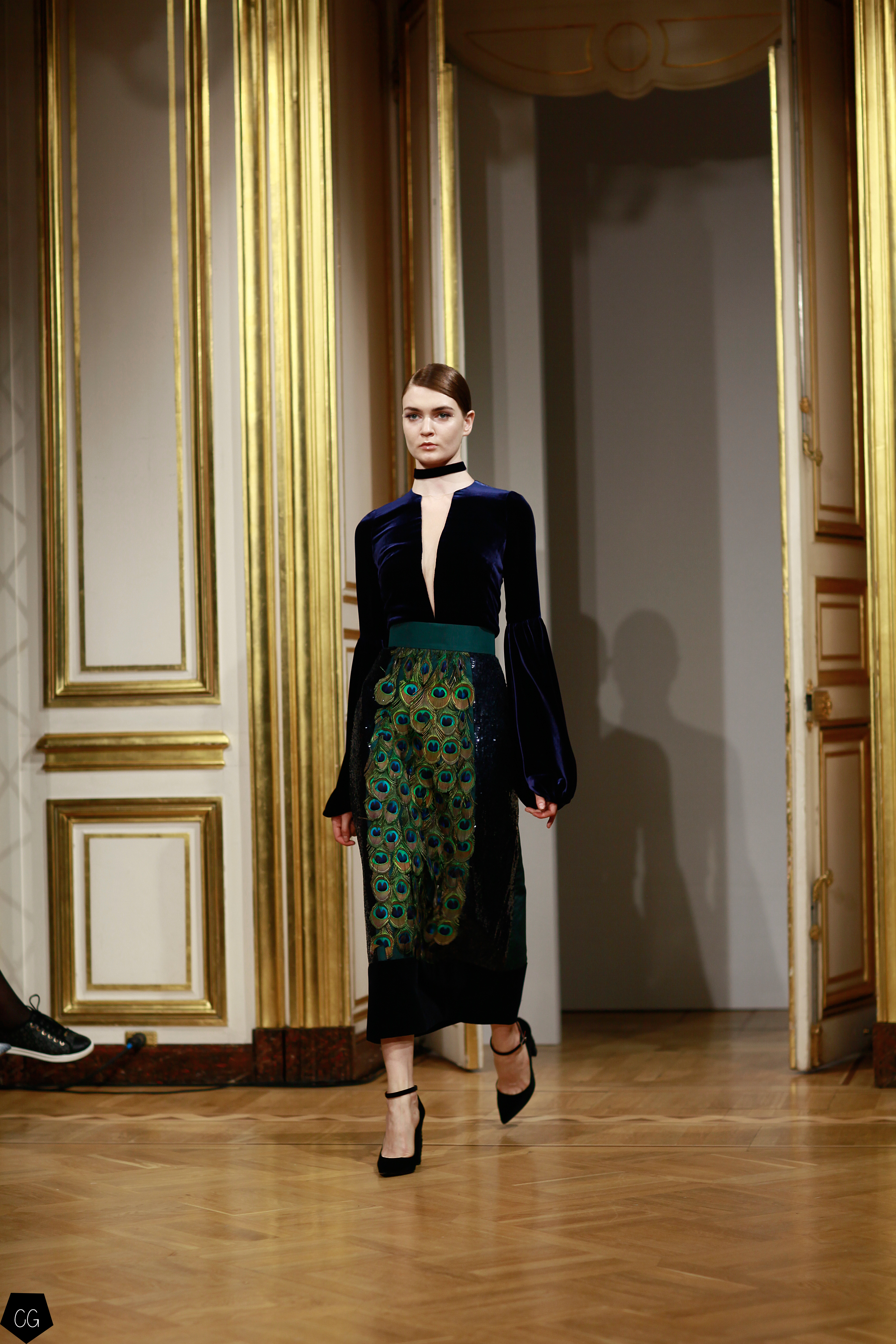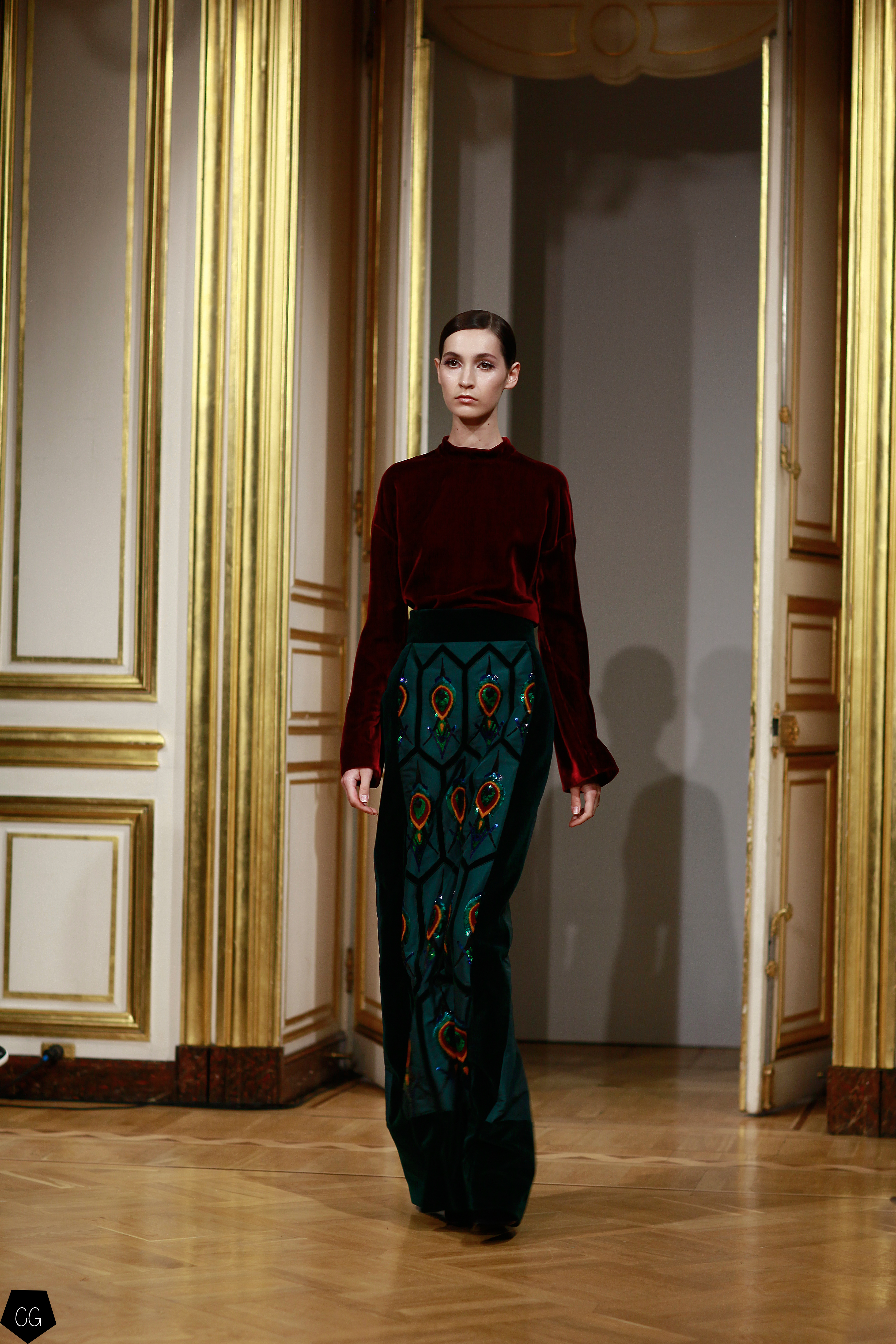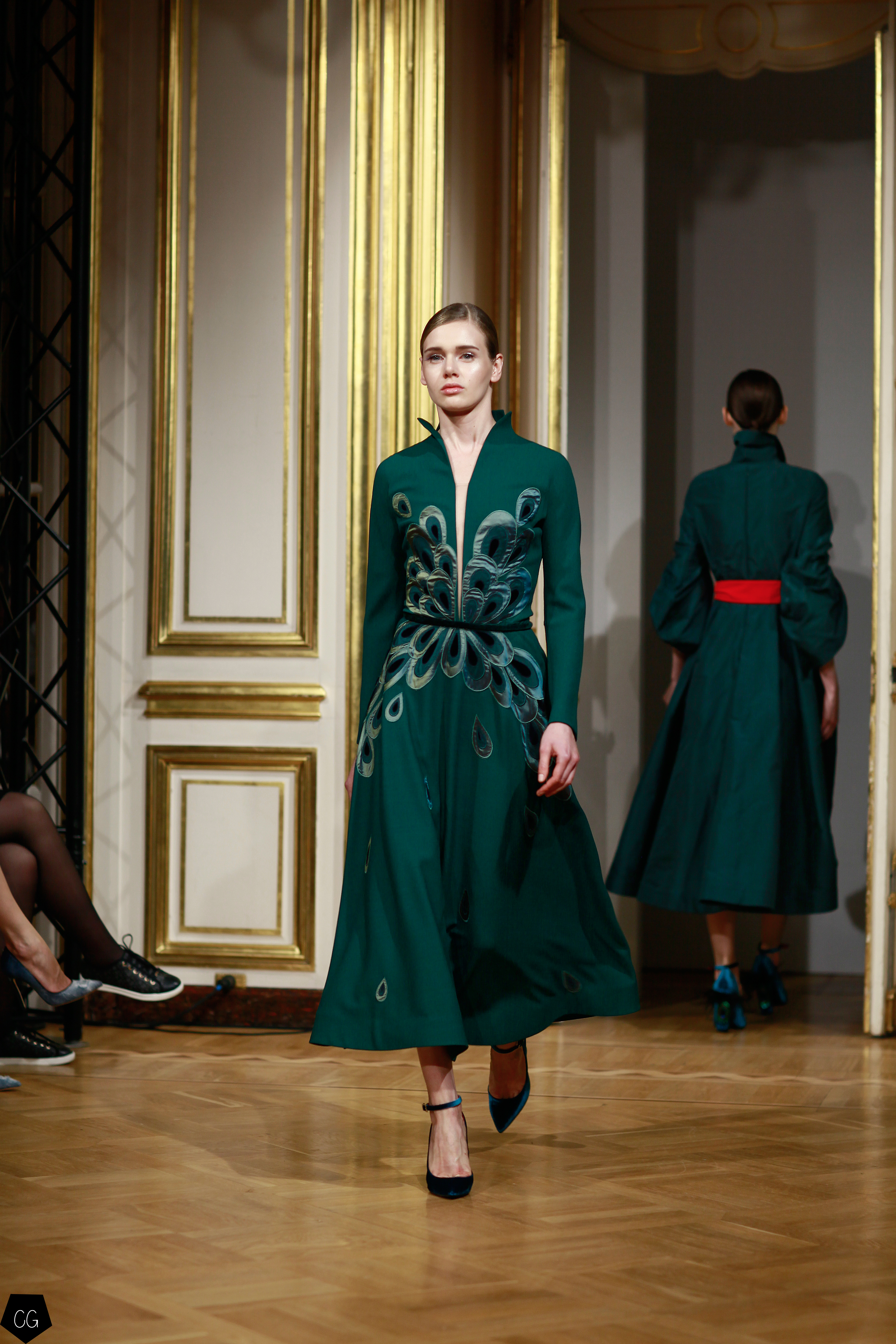 Yanina a choisi le paon, oiseau mythique du conte russe de Ivan Bilibine, « l’oiseau de feu », qui est un être féminin dans le texte russe. La femme qui porte ses modèles se transforme ainsi en cet oiseau majestueux, symbole de magnificence. Dans l’art russe, le paon était souvent représenté avec un buste et une tête de femme, entre l’oiseau de paradis et l’oiseau maléfique et les 39 modèles de ce défilé déclinent toutes les facettes de cette légende par une palette de couleurs allant du noir profond, aux couleurs de feu les plus intenses.