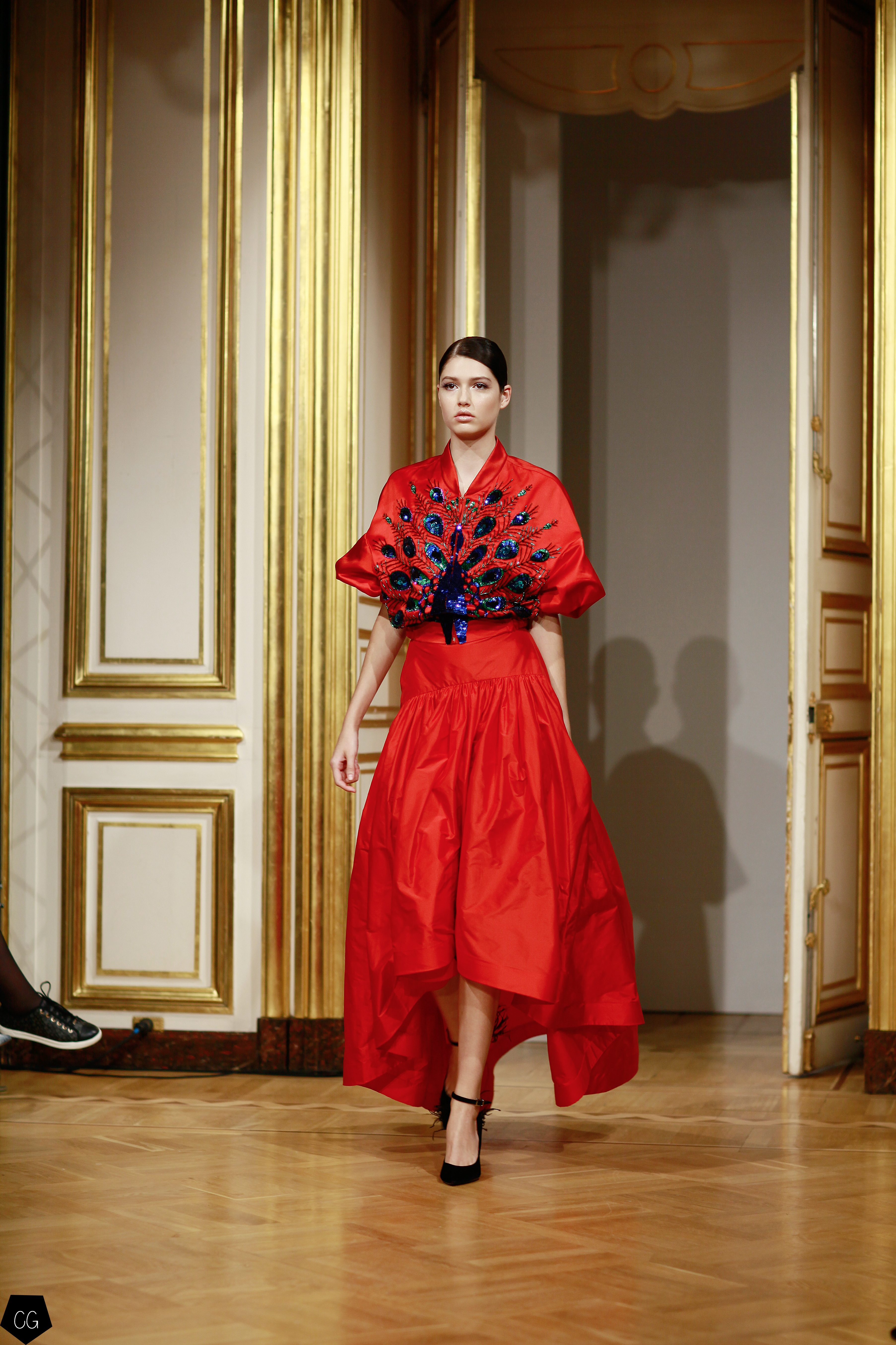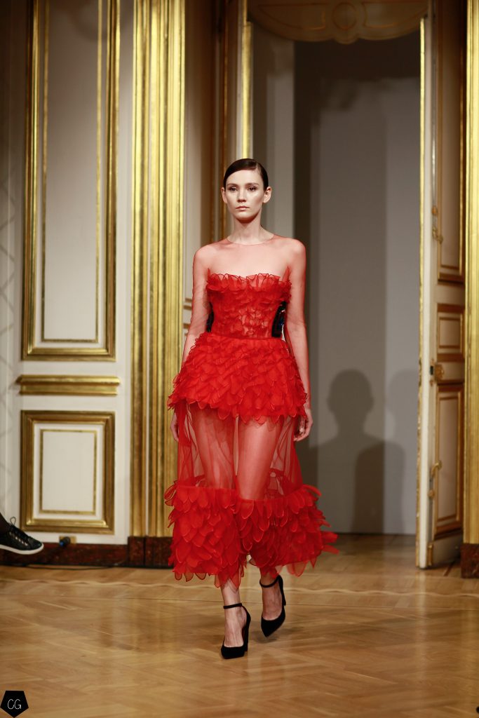La femme devient cet oiseau majestueux, son corps porte les plumes de paon qui en font une créature ensorcelante, les robes deviennent d’un rouge écarlate, puis de la transparence naît l’oiseau de feu entièrement brodé sur ru voile rouge transparent dont les courbes recouvrent la poitrine, les épaules, le ventre et les hanches. Une série de modèles se décline dans le noir et blanc transparent, rebrodé de paillettes et de perles.