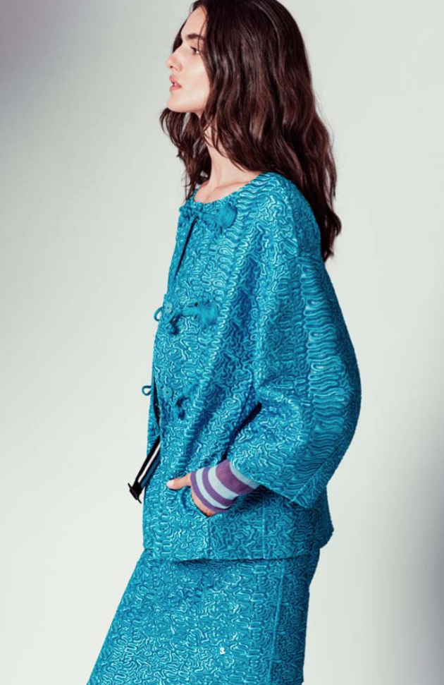 Fourrures d’été fabriquées à la main avec des broderies de soie reproduisent majestueusement l’effet Astrakhan, en rouge, bleu, vert et noir.