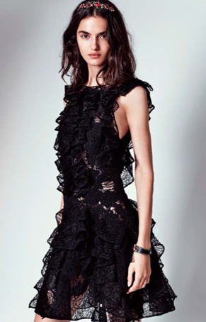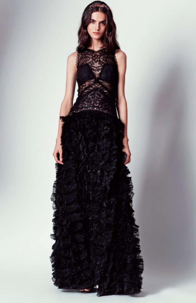 L’élément clé de cette collection est indéniablement la dentelle : un tissu très cher à la Maison, de part sa noblesse et son côté soyeux. Elle créée une combinaison de styles des plus gracieuses, entre romantisme et sensualité, grâce à des cascades de volants sur les robes.