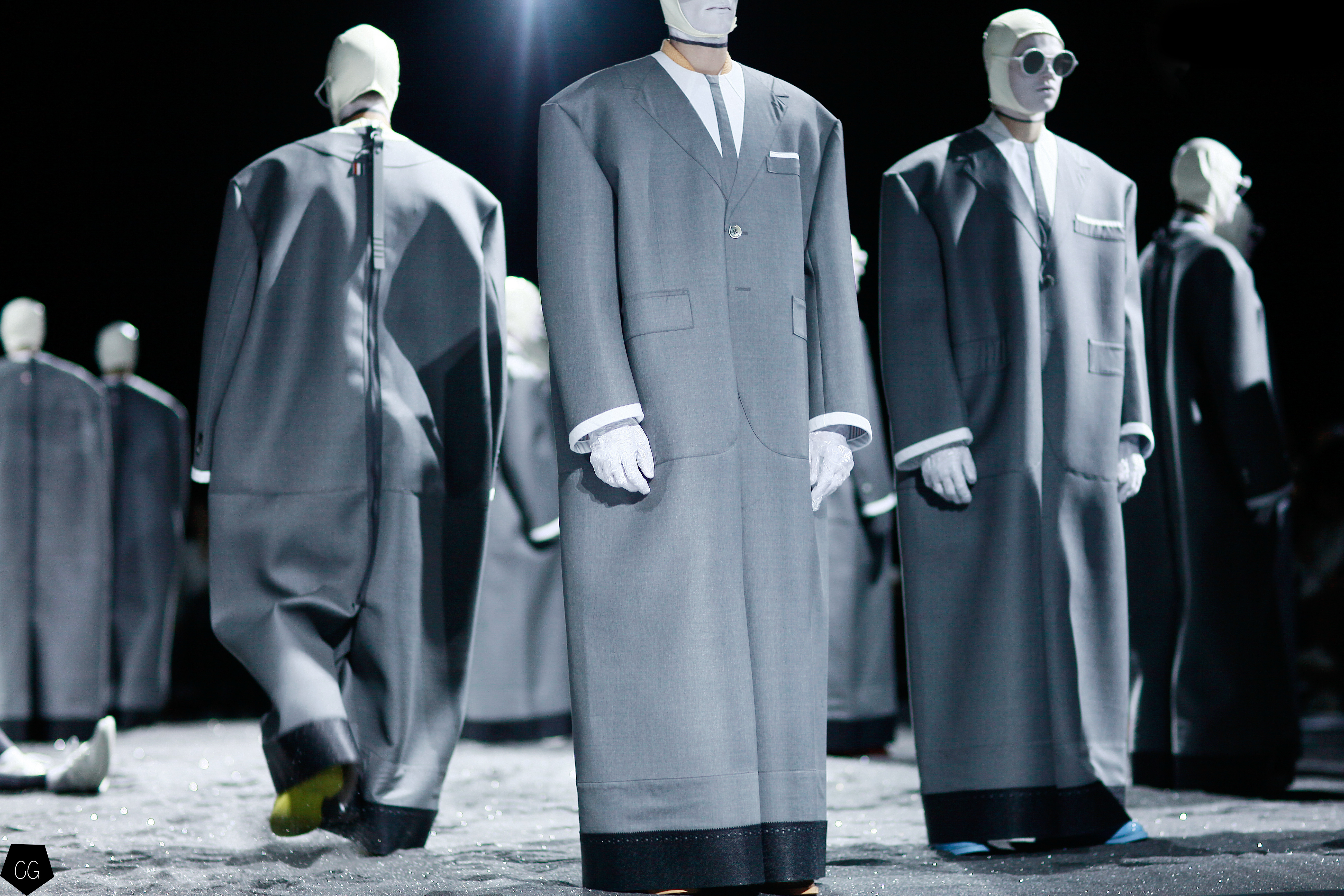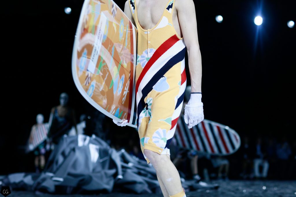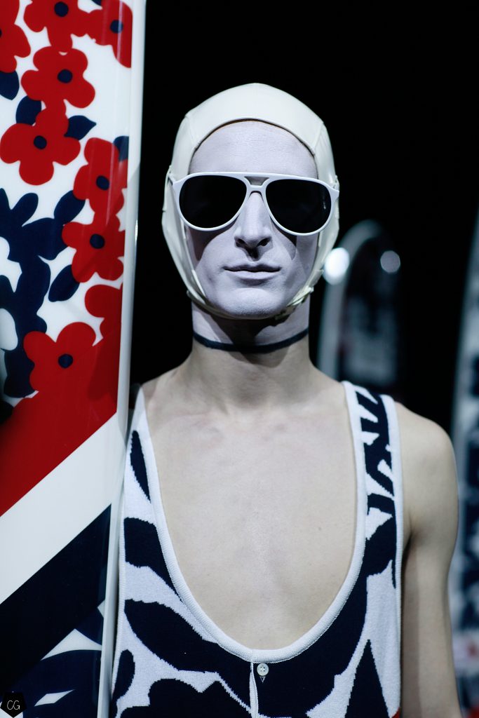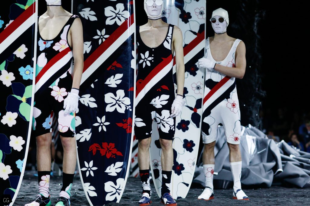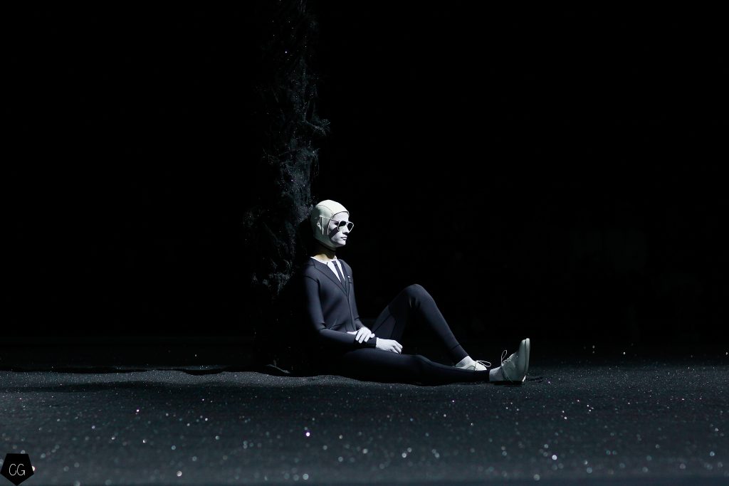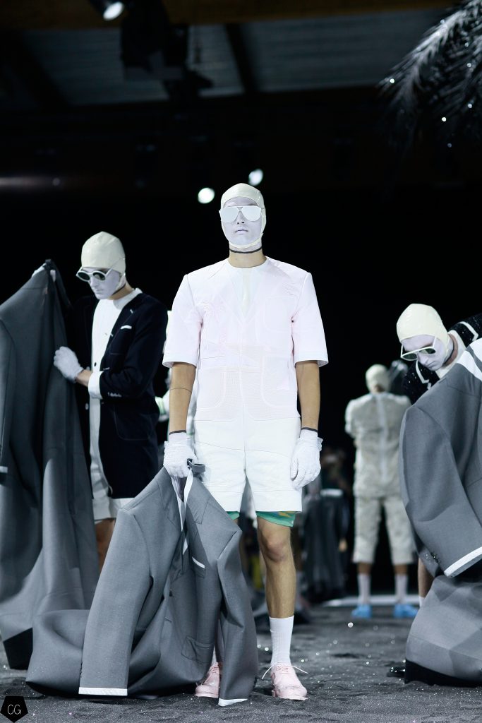 L’imagination sans faille de Thom Browne a rythmé le show ! C’est une incroyable performance artistique que le designer a voulu faire partager pour présenter sa dernière collection pour homme. Tout commence dans une atmosphère sombre et stricte, avec des silhouettes en uniformes à très larges épaules. La sable noir au sol, des requins virevoltent autour de l’île et les cagoules blanches avec les lunettes de soleil nous font penser à un autre monde, une autre planète, un voyage dans l’univers du créateur qui nous épate encore une fois. Un univers aquatique et marin, puisque de nombreuses tenues sont composées de matières se rapprochant des tenues de plongées, dont les détails ponctuent chaque looks.