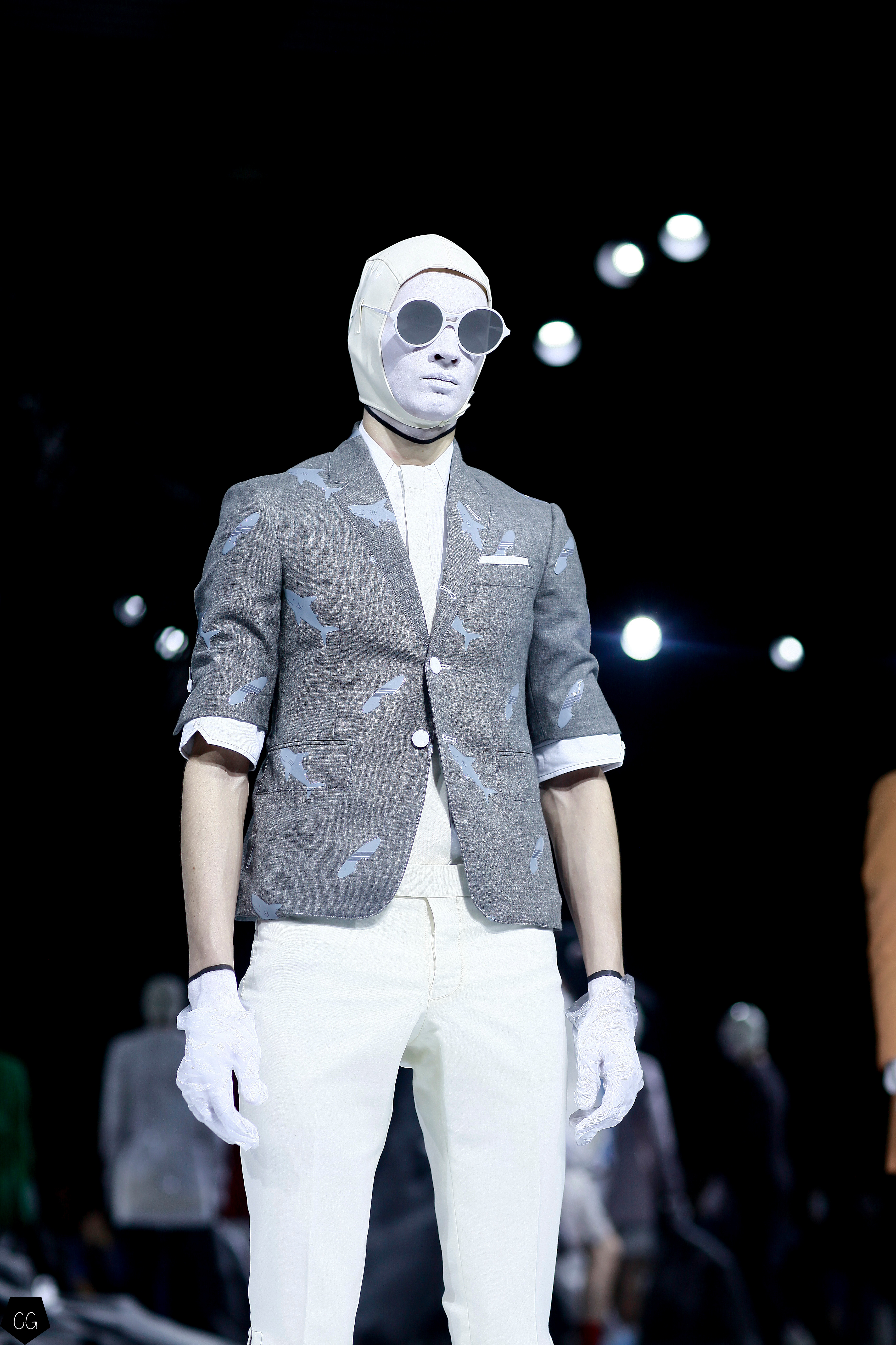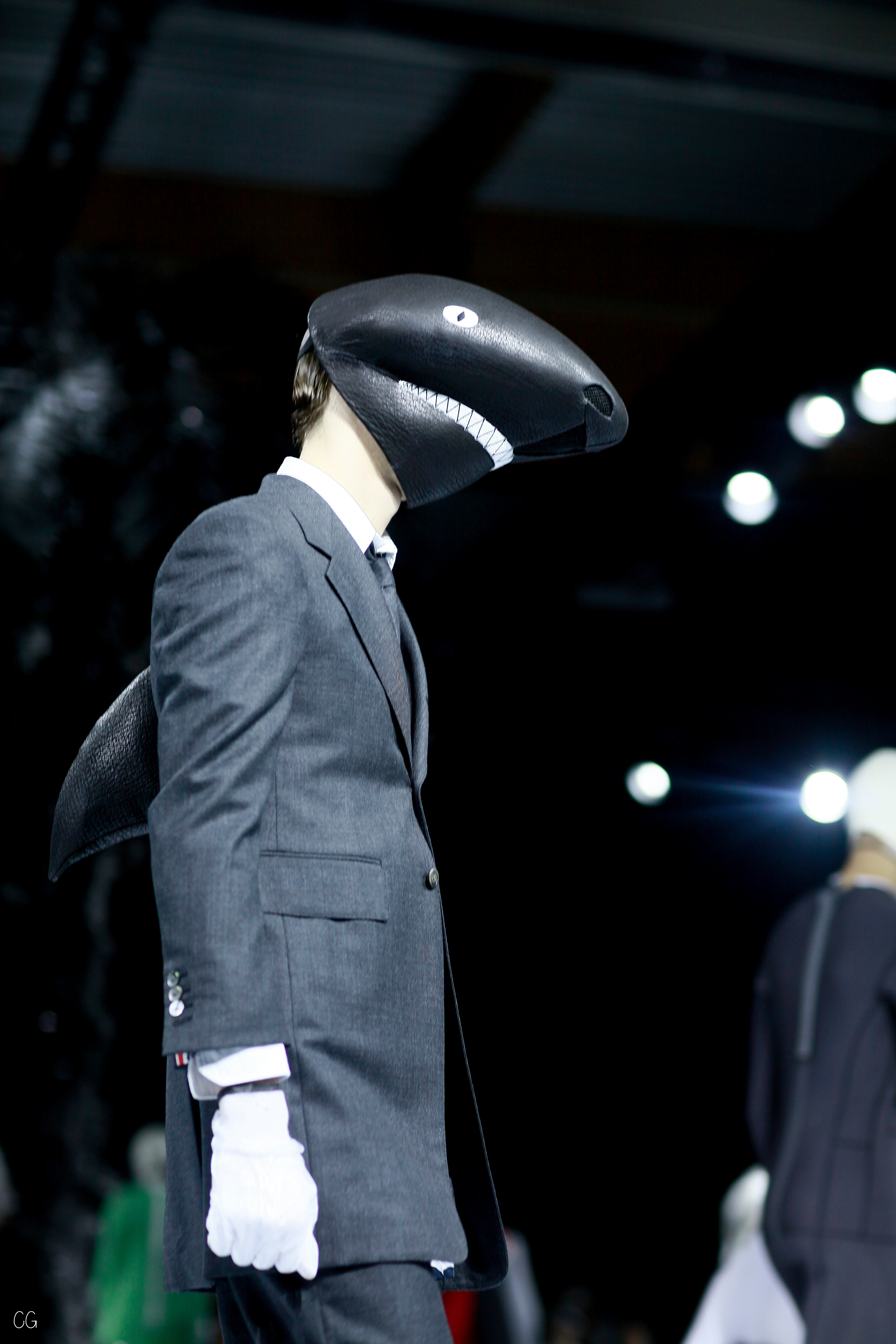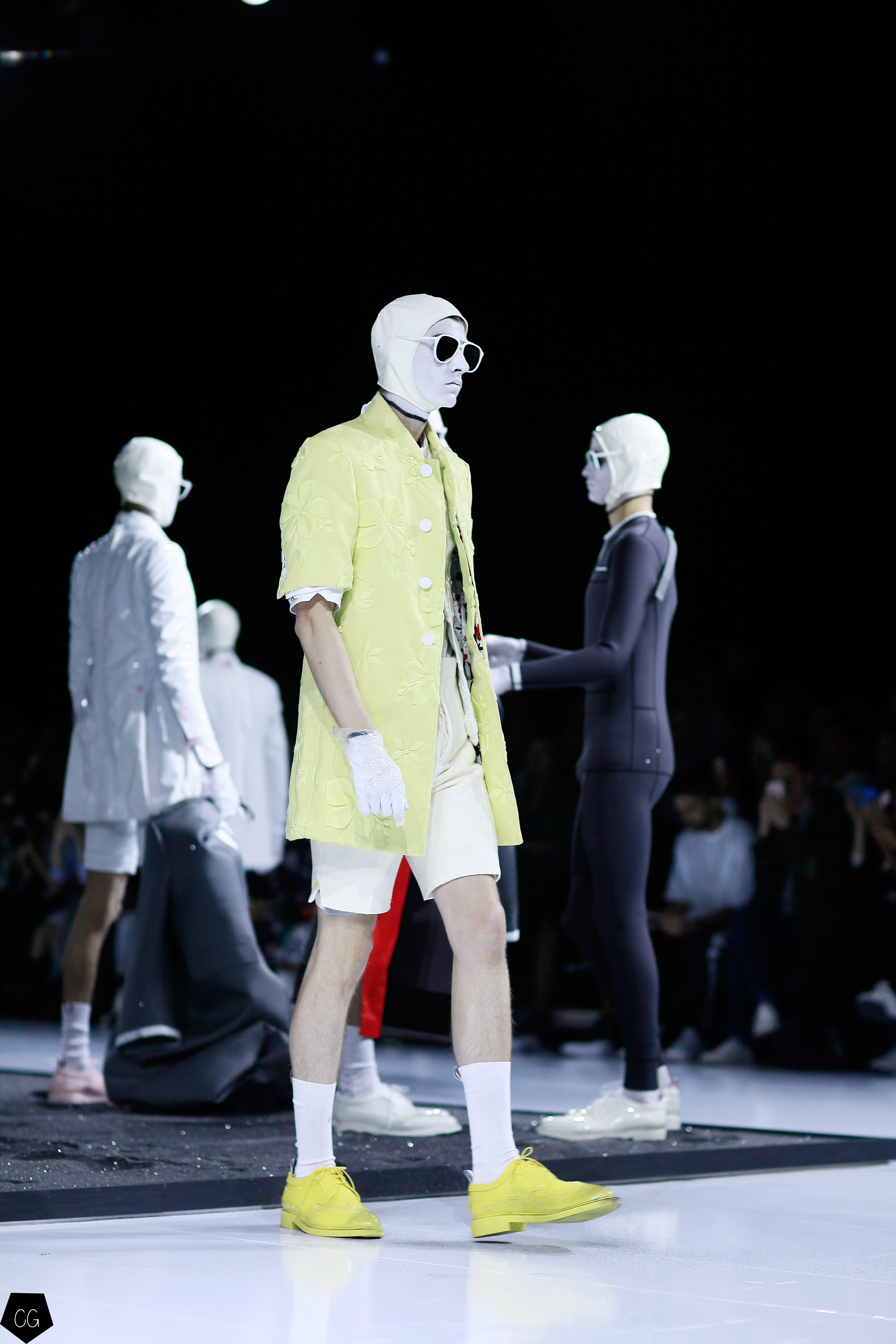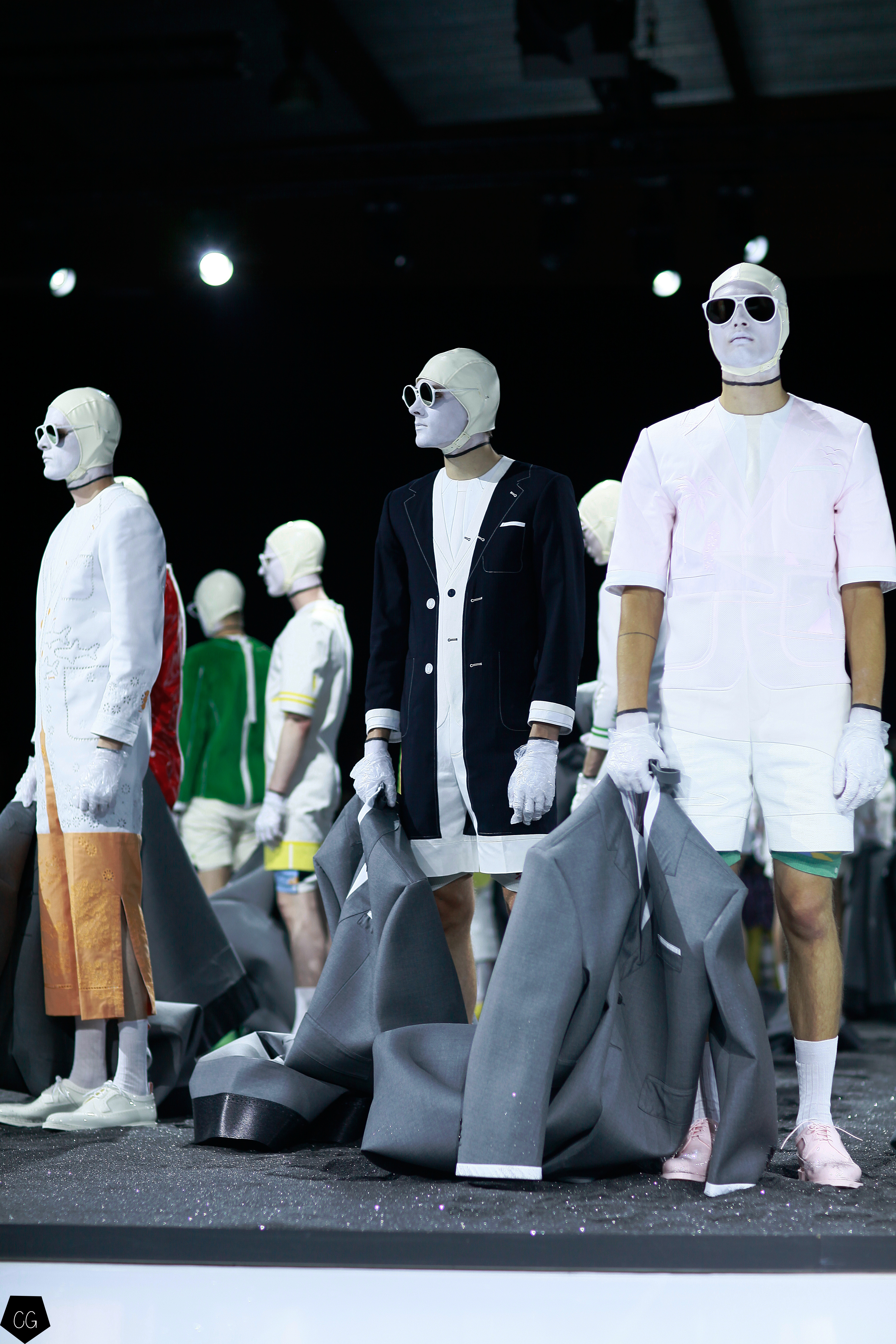 L’imagination sans faille de Thom Browne a rythmé le show ! C’est une incroyable performance artistique que le designer a voulu faire partager pour présenter sa dernière collection pour homme. Tout commence dans une atmosphère sombre et stricte, avec des silhouettes en uniformes à très larges épaules. La sable noir au sol, des requins virevoltent autour de l’île et les cagoules blanches avec les lunettes de soleil nous font penser à un autre monde, une autre planète, un voyage dans l’univers du créateur qui nous épate encore une fois. Un univers aquatique et marin, puisque de nombreuses tenues sont composées de matières se rapprochant des tenues de plongées, dont les détails ponctuent chaque looks.