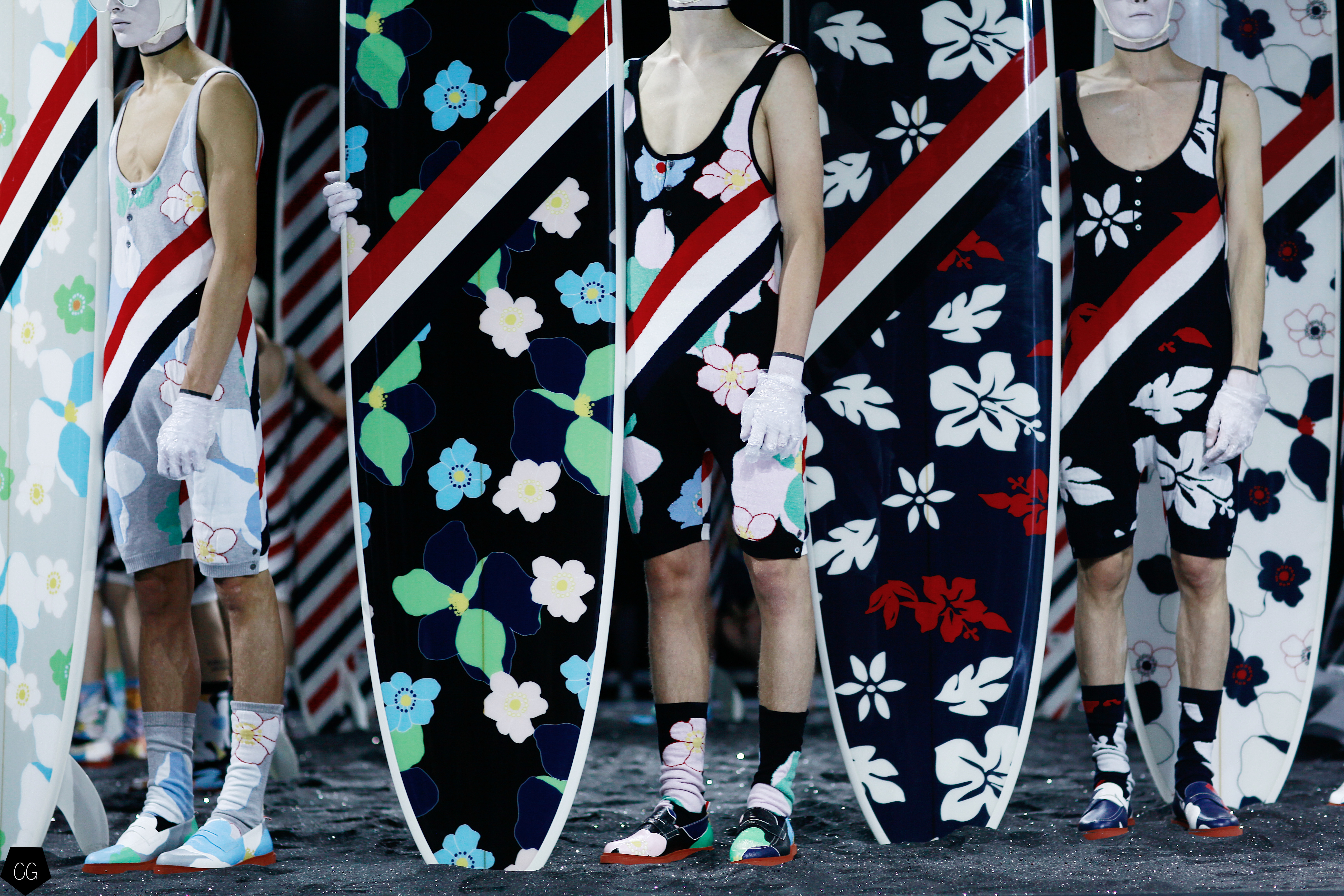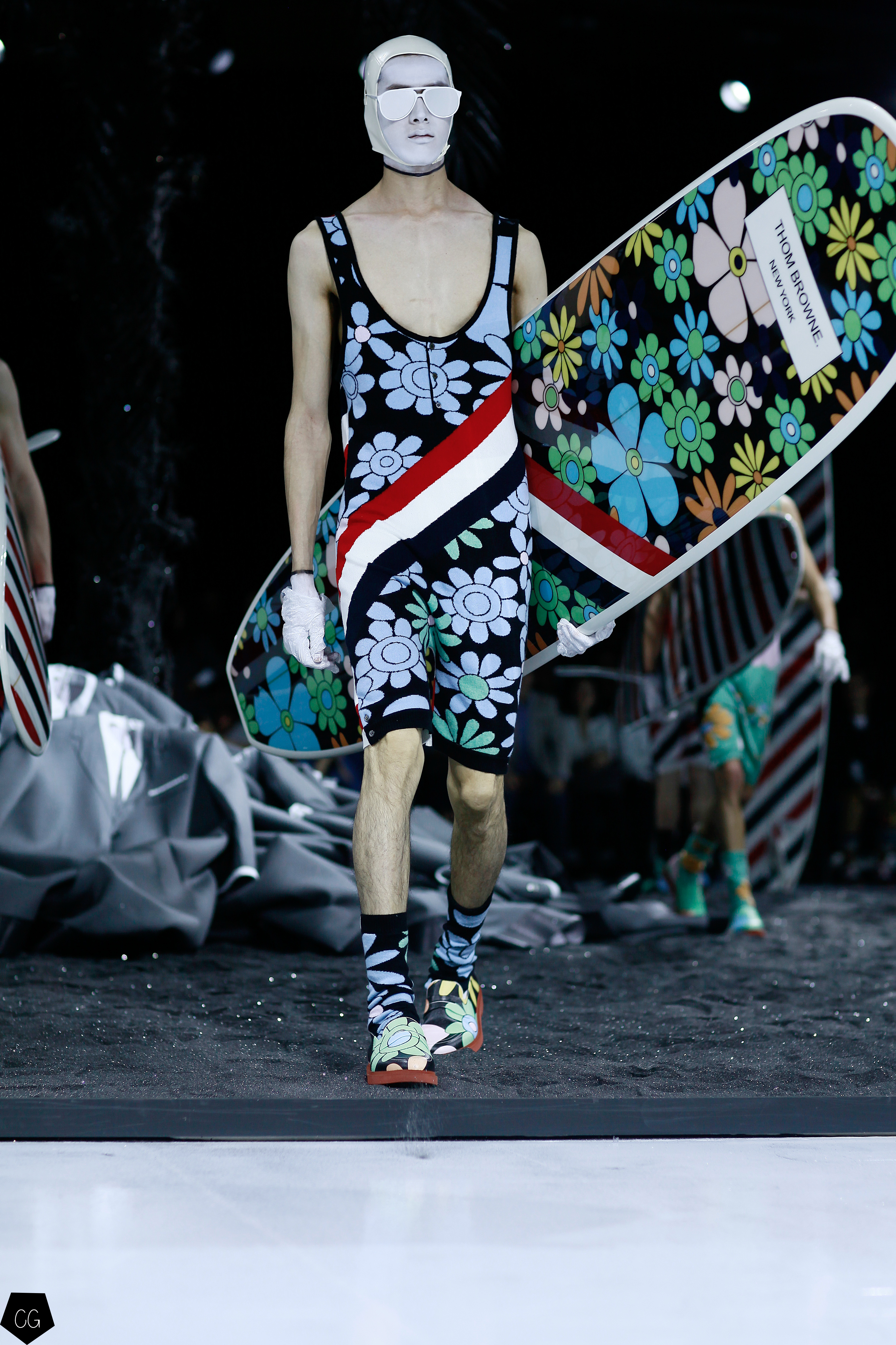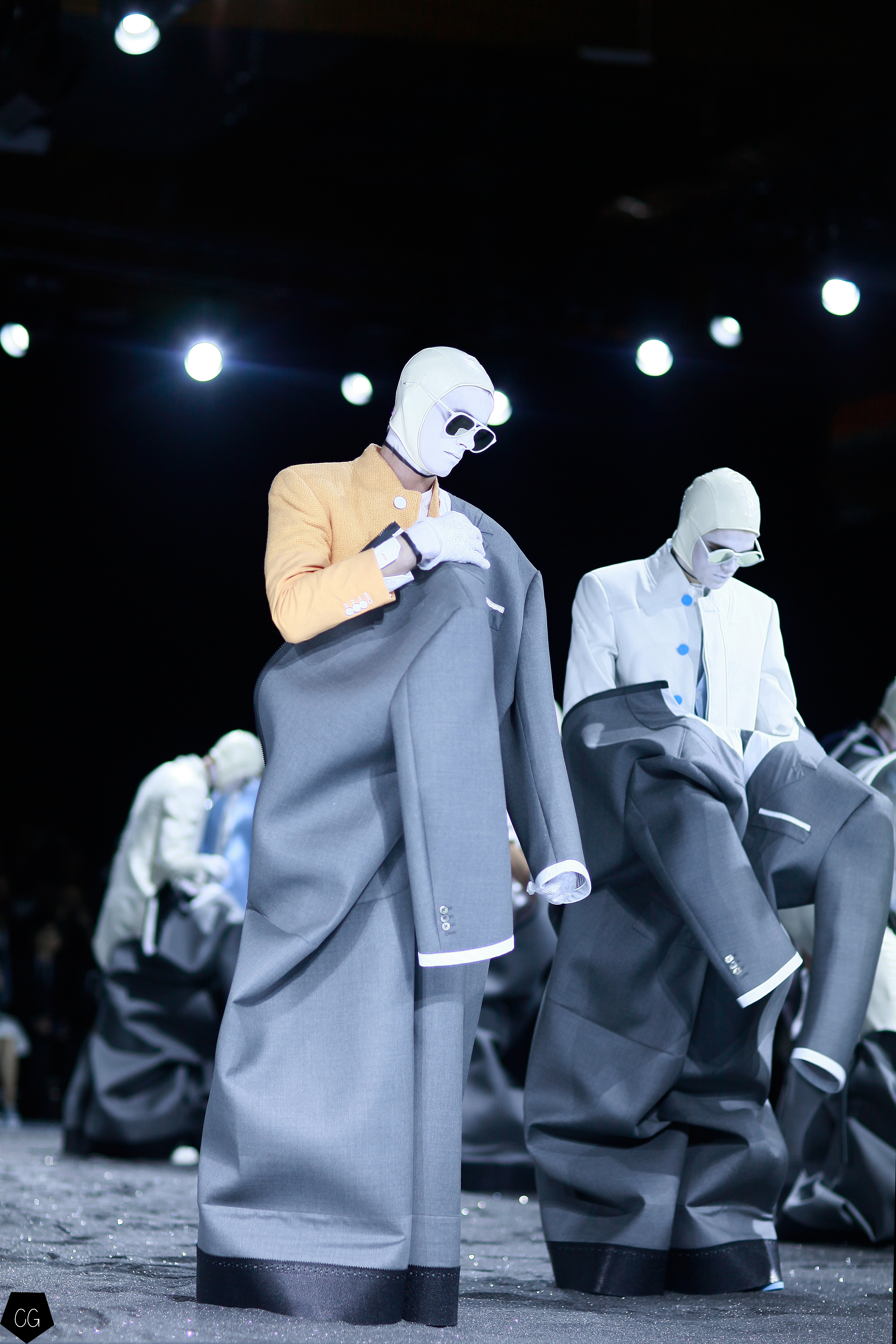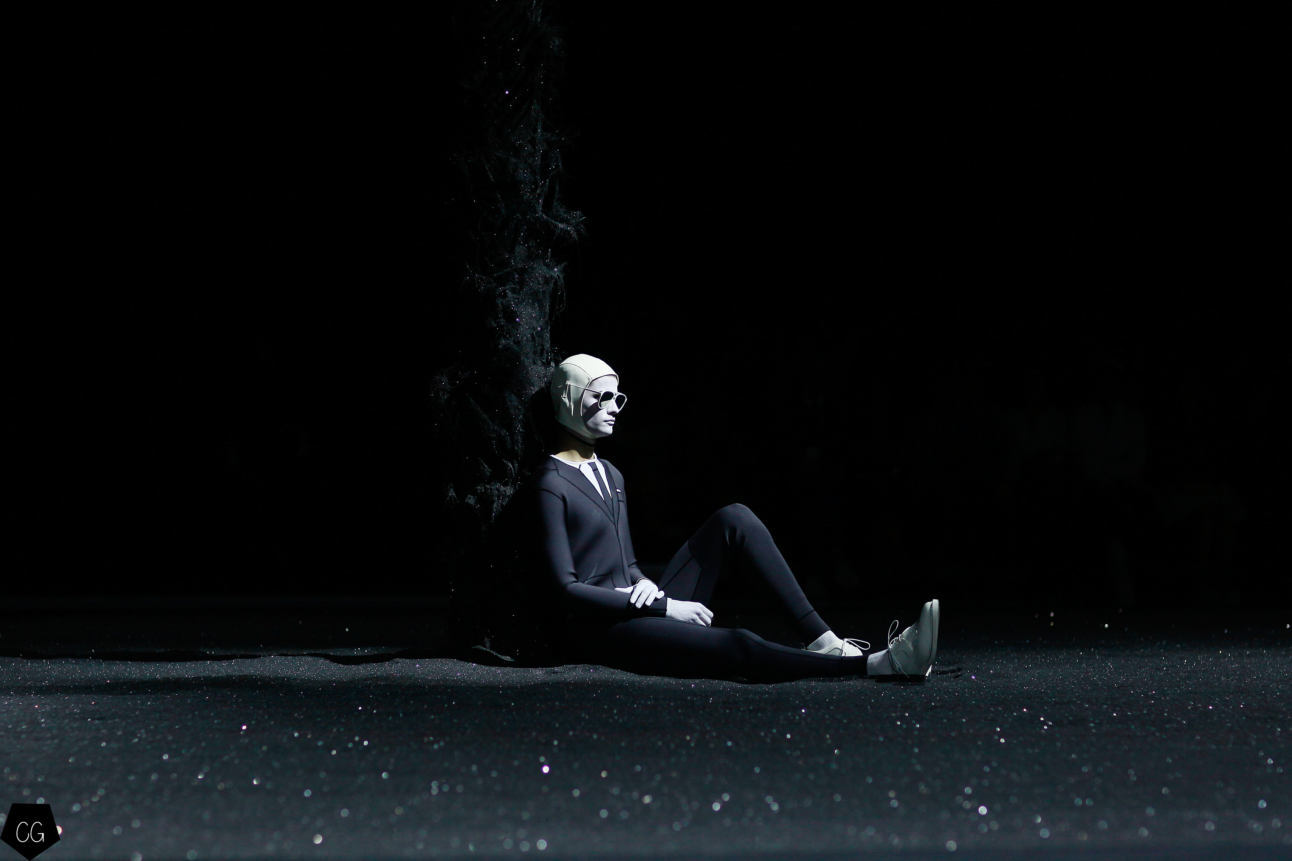 L’imagination sans faille de Thom Browne a rythmé le show ! C’est une incroyable performance artistique que le designer a voulu faire partager pour présenter sa dernière collection pour homme. Tout commence dans une atmosphère sombre et stricte, avec des silhouettes en uniformes à très larges épaules. La sable noir au sol, des requins virevoltent autour de l’île et les cagoules blanches avec les lunettes de soleil nous font penser à un autre monde, une autre planète, un voyage dans l’univers du créateur qui nous épate encore une fois. Un univers aquatique et marin, puisque de nombreuses tenues sont composées de matières se rapprochant des tenues de plongées, dont les détails ponctuent chaque looks.