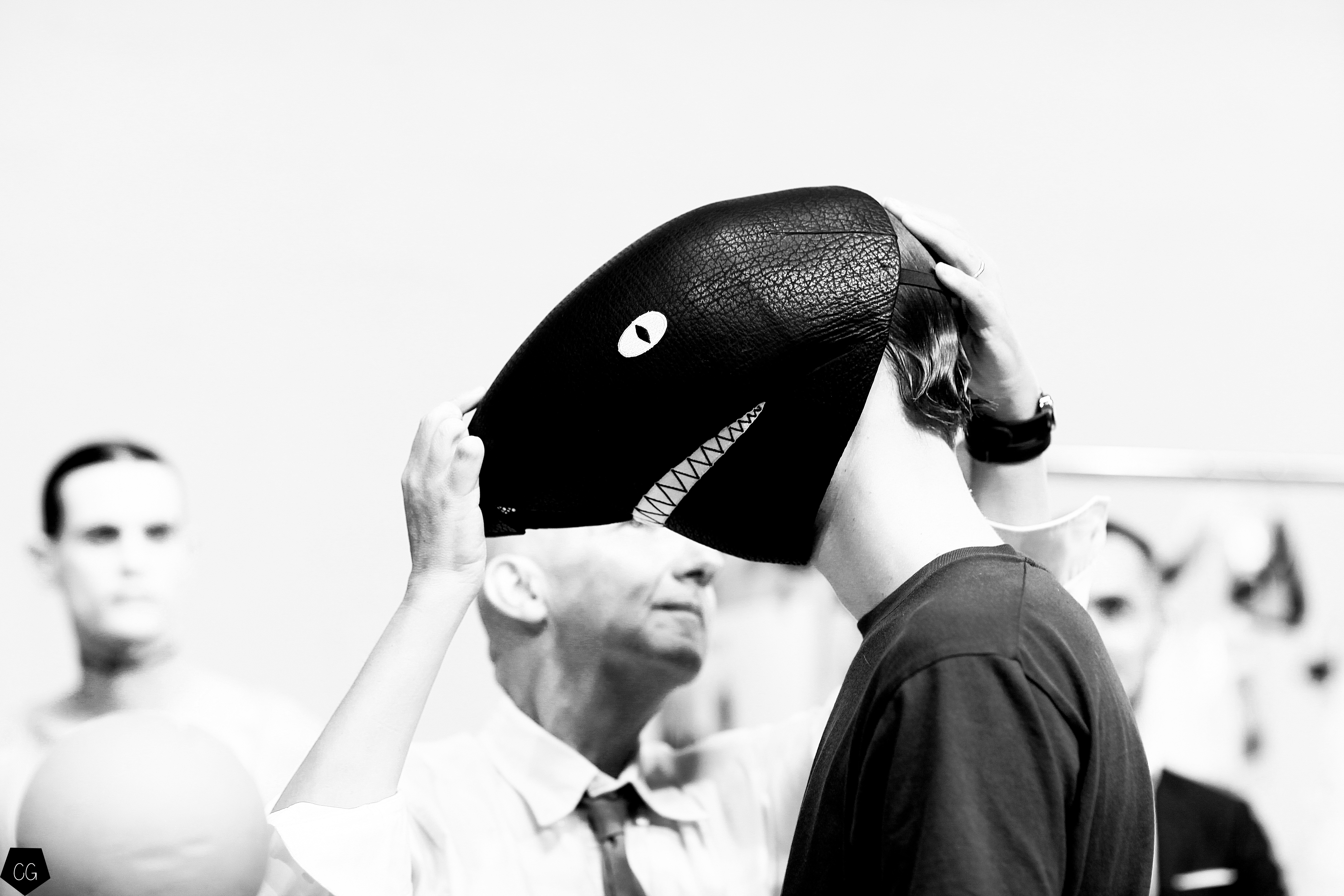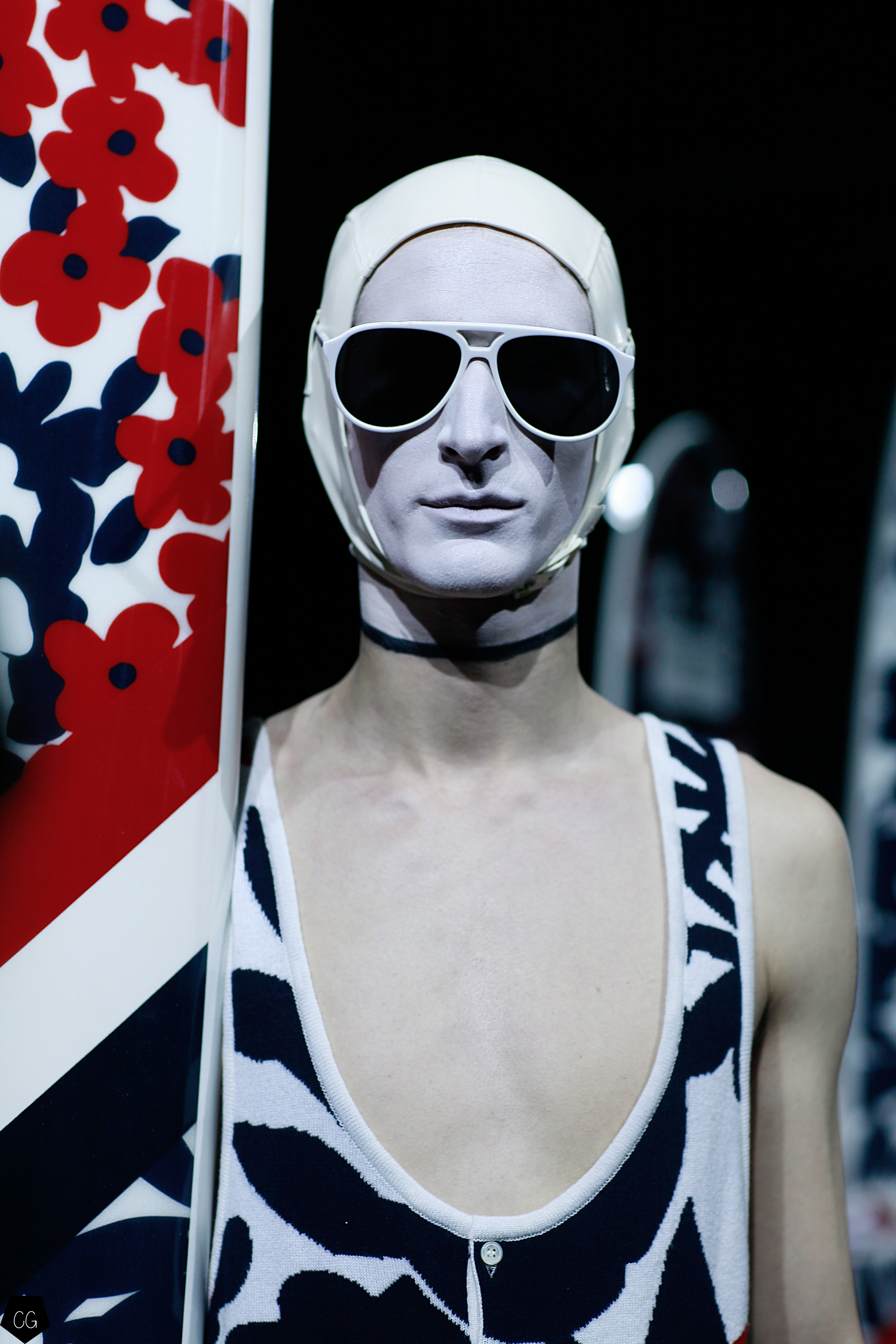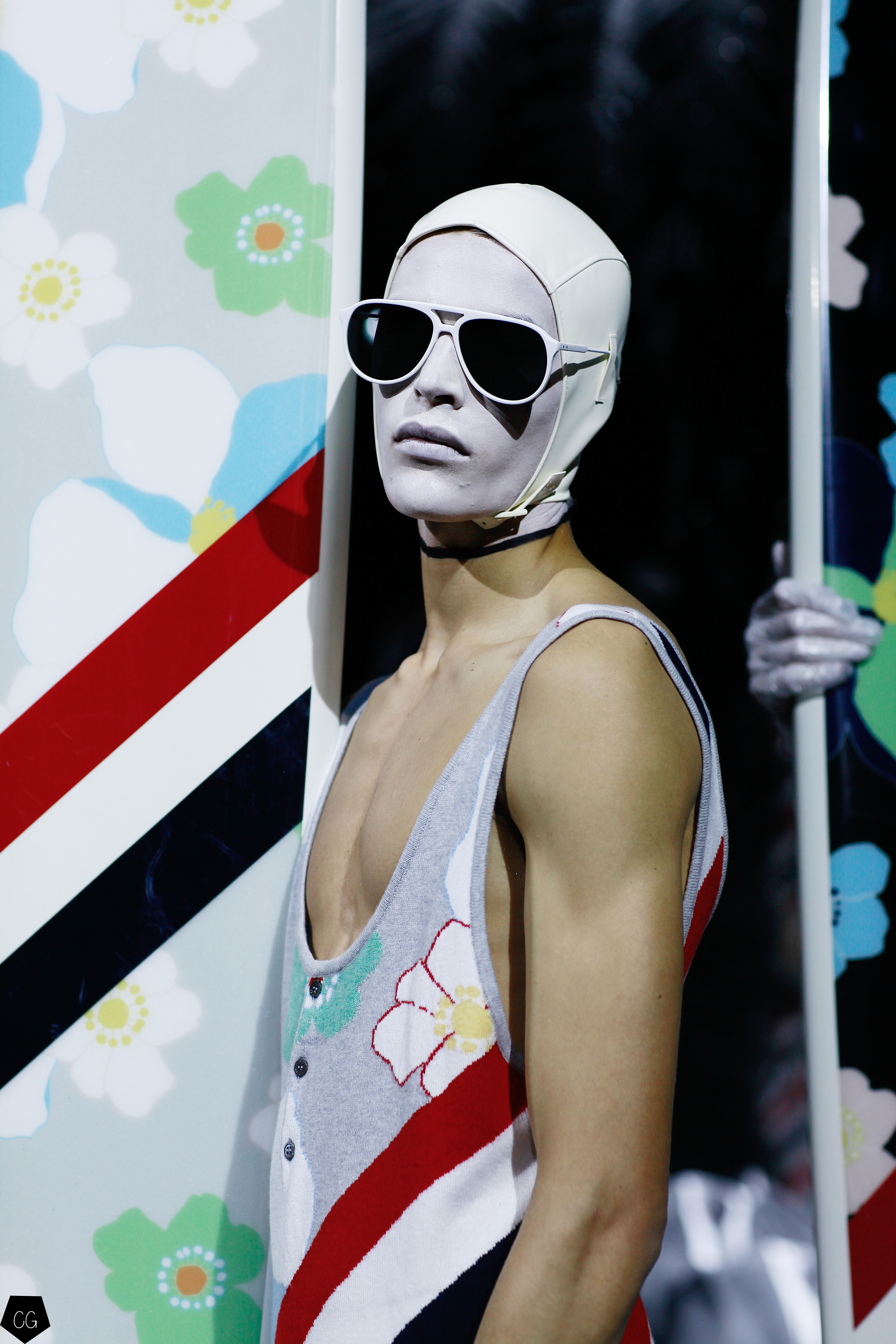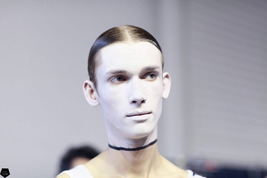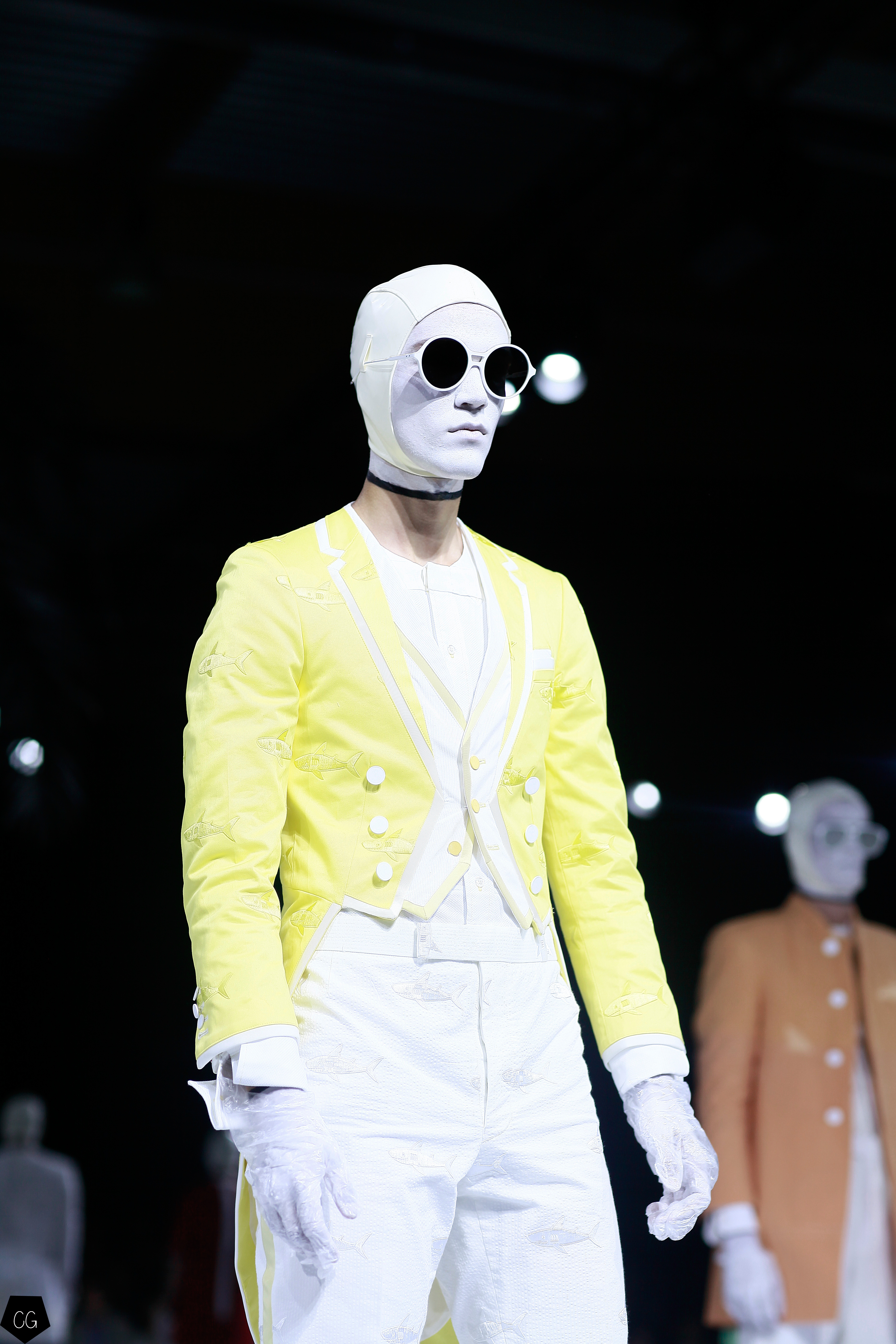 L’imagination sans faille de Thom Browne a rythmé le show ! C’est une incroyable performance artistique que le designer a voulu faire partager pour présenter sa dernière collection pour homme. Tout commence dans une atmosphère sombre et stricte, avec des silhouettes en uniformes à très larges épaules. La sable noir au sol, des requins virevoltent autour de l’île et les cagoules blanches avec les lunettes de soleil nous font penser à un autre monde, une autre planète, un voyage dans l’univers du créateur qui nous épate encore une fois. Un univers aquatique et marin, puisque de nombreuses tenues sont composées de matières se rapprochant des tenues de plongées, dont les détails ponctuent chaque looks.