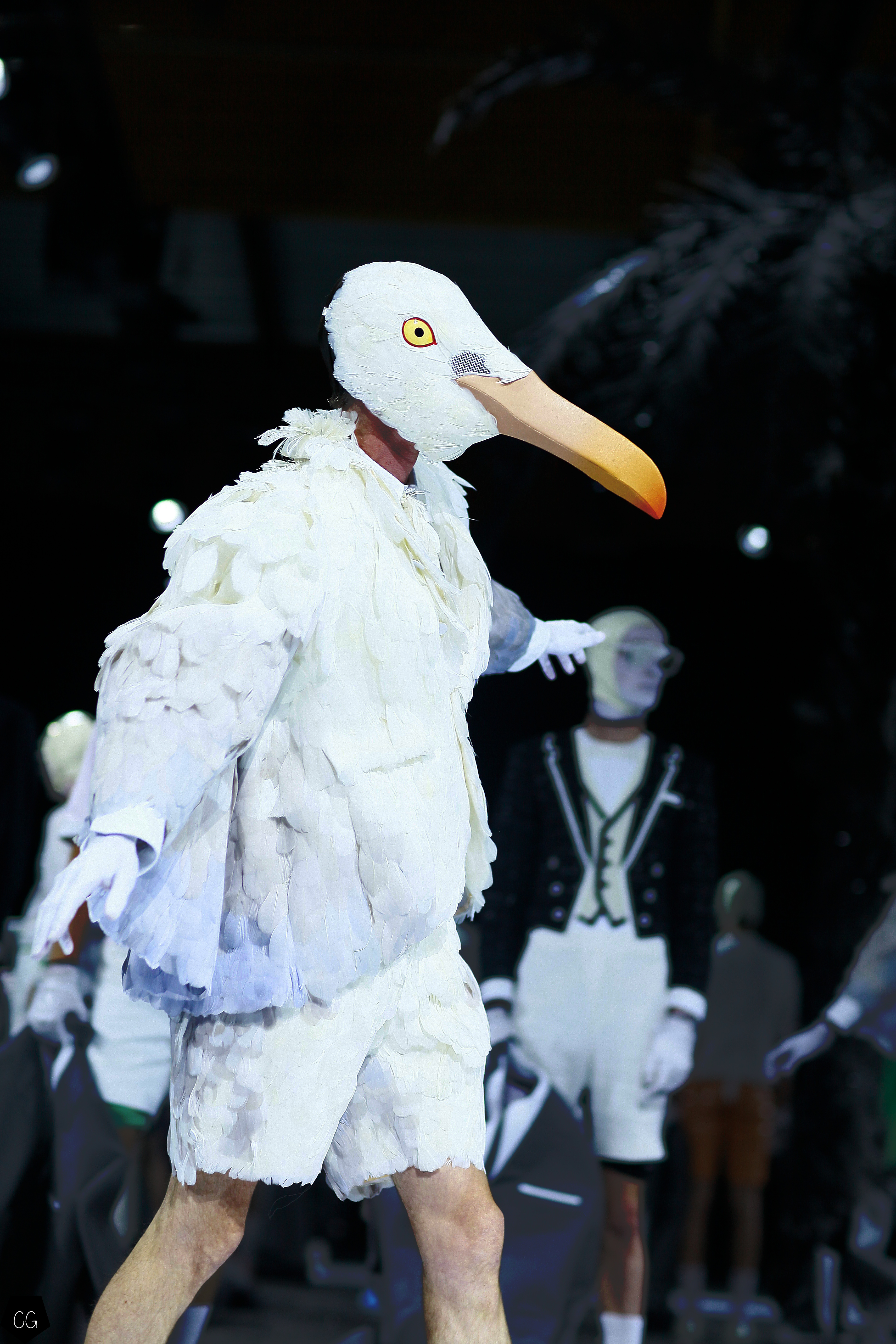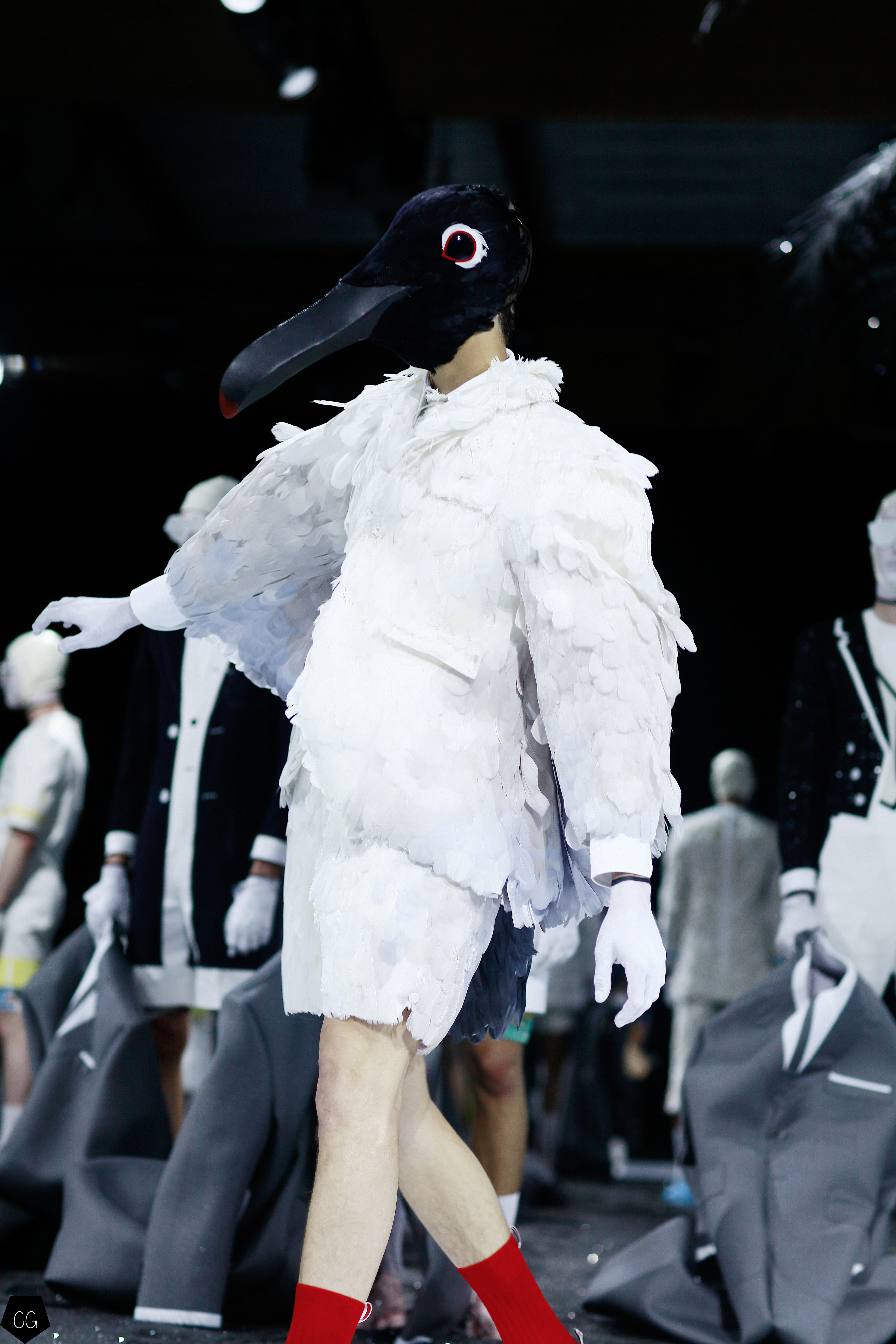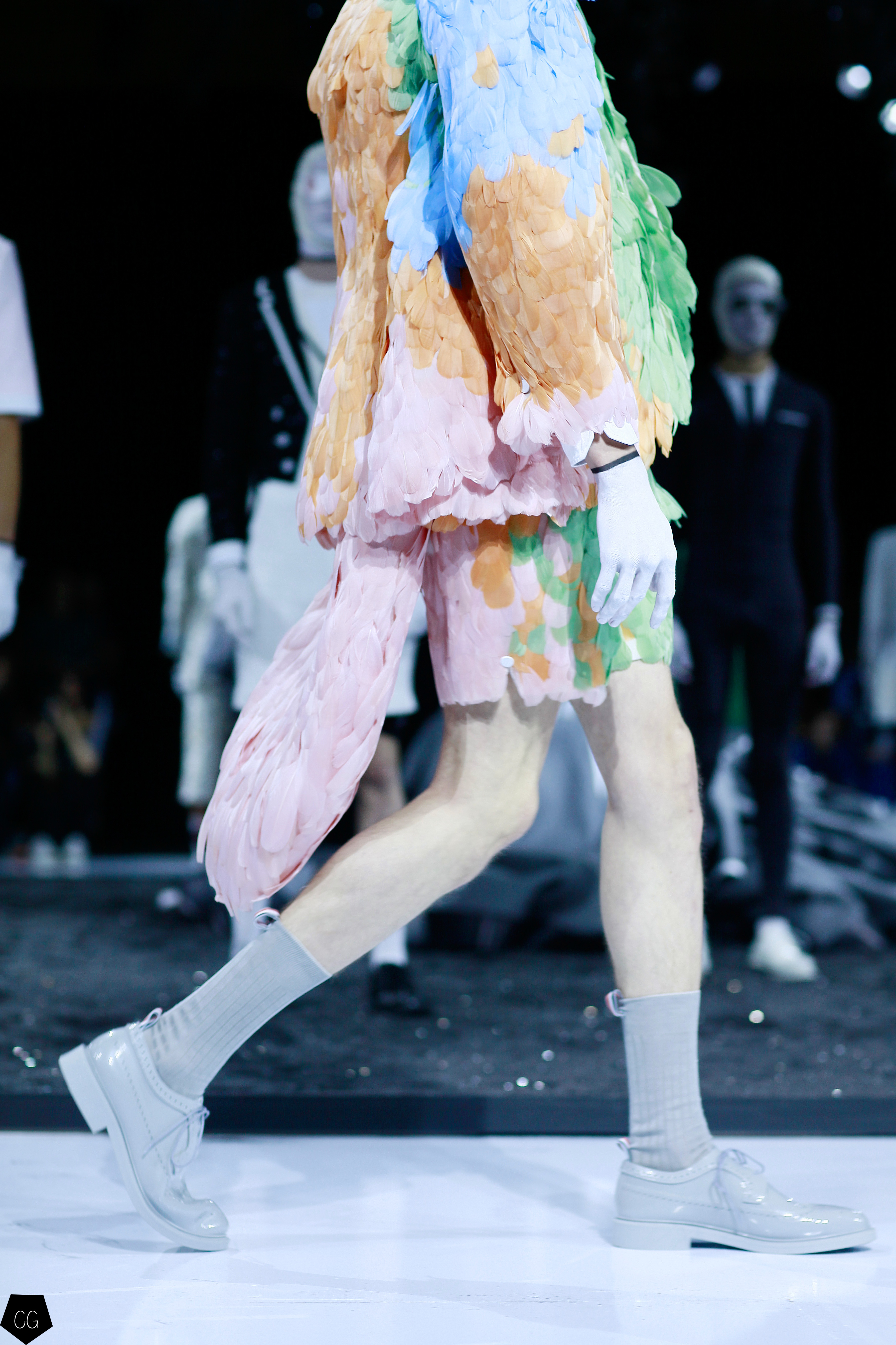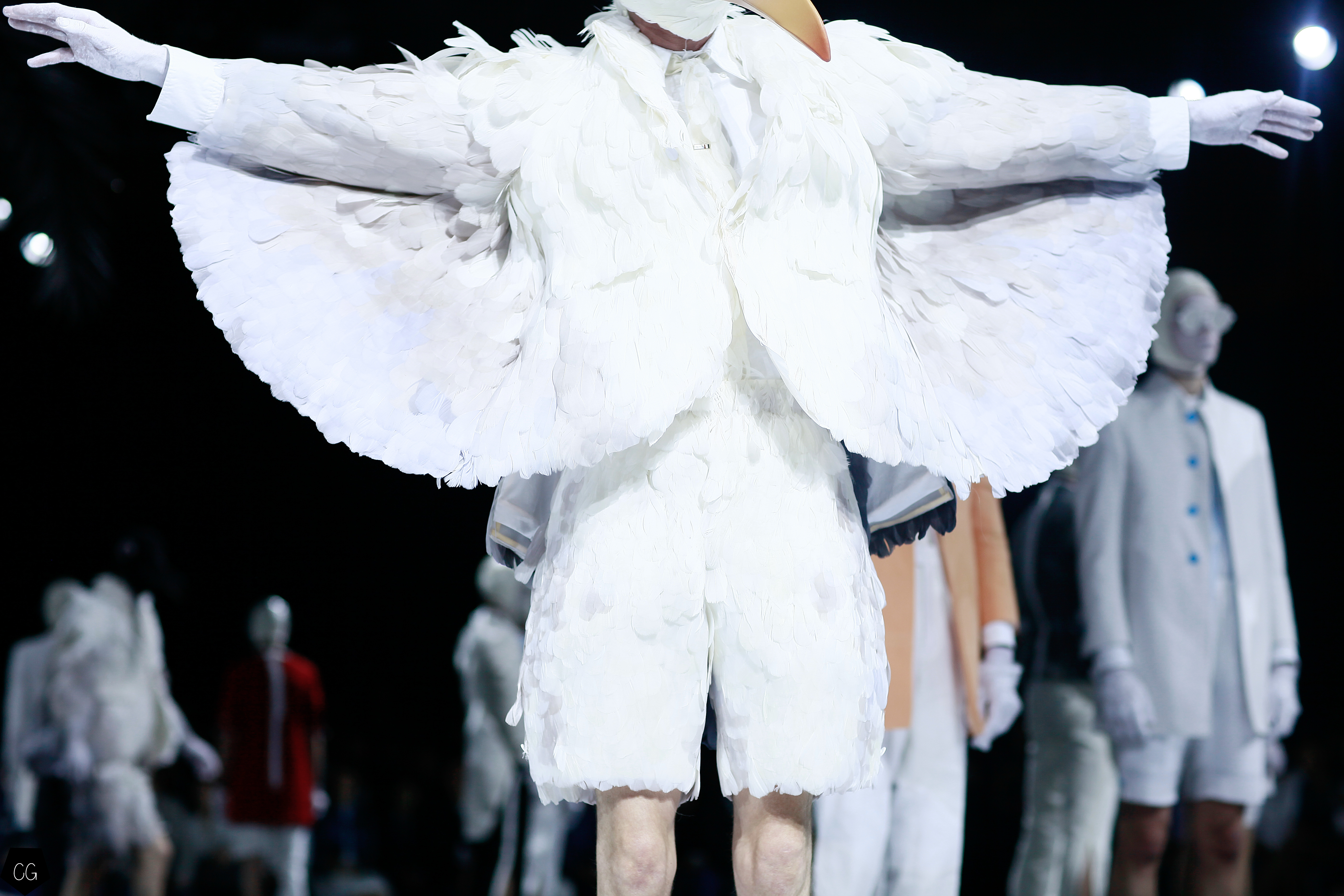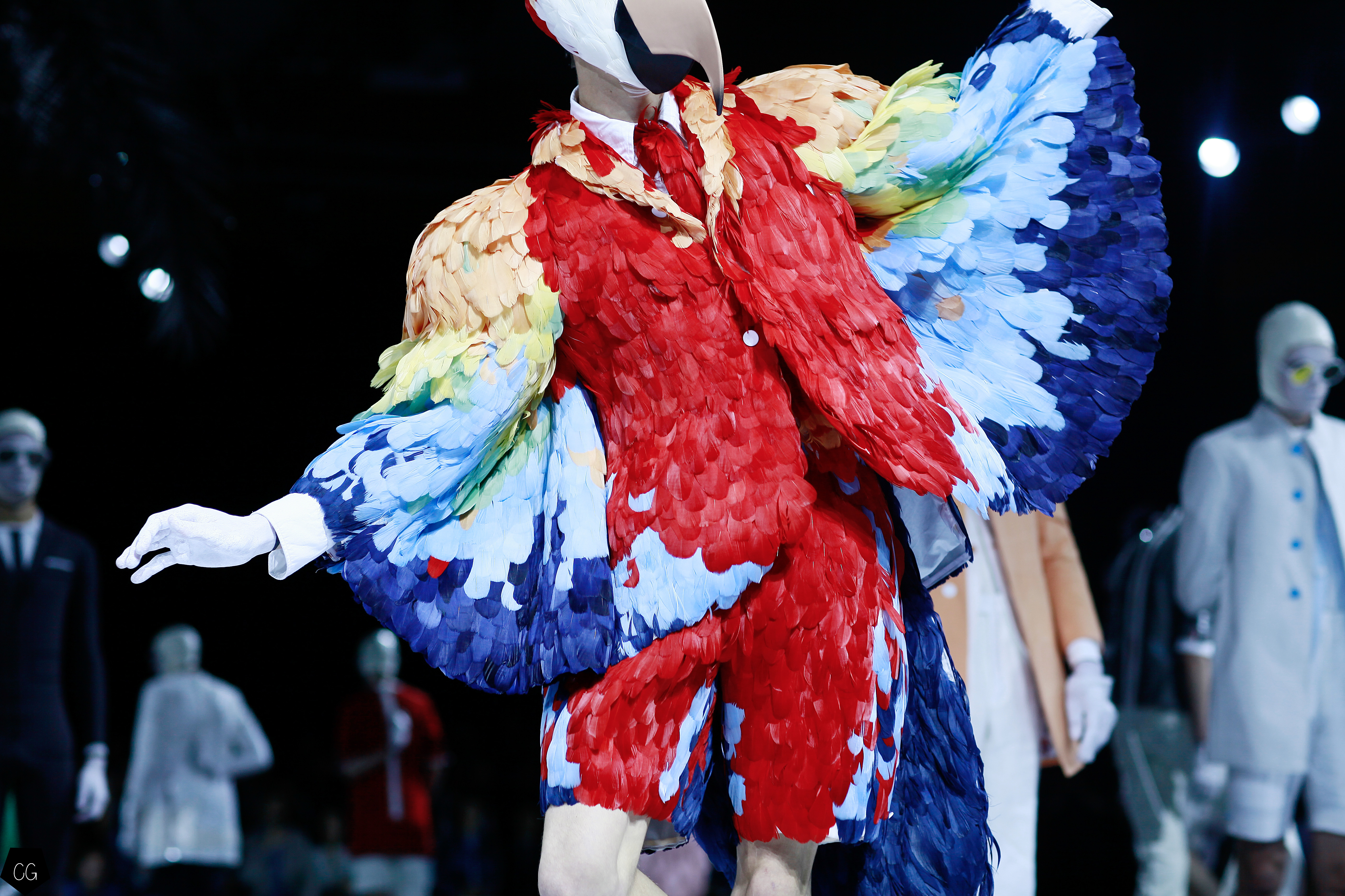 Le costume trois pièces devient la pièce emblématique du défilé. Il est réalisé dans des matières originales et complètement avant-gardistes, l’homme n’est plus cantonné au classique mais à l’innovation du costume trois pièces qui devient alors un vêtement avec lequel on peut jouer. Parfois même composé entièrement de plumes, le costume ici définit une histoire de mutation, de changement et d’évolution, comme l’exprime le défilé depuis le début, notamment lorsque les mannequins aux allures strictes se changent en gentlemans originaux, et à la fin en surfeur fière de leur patrie.