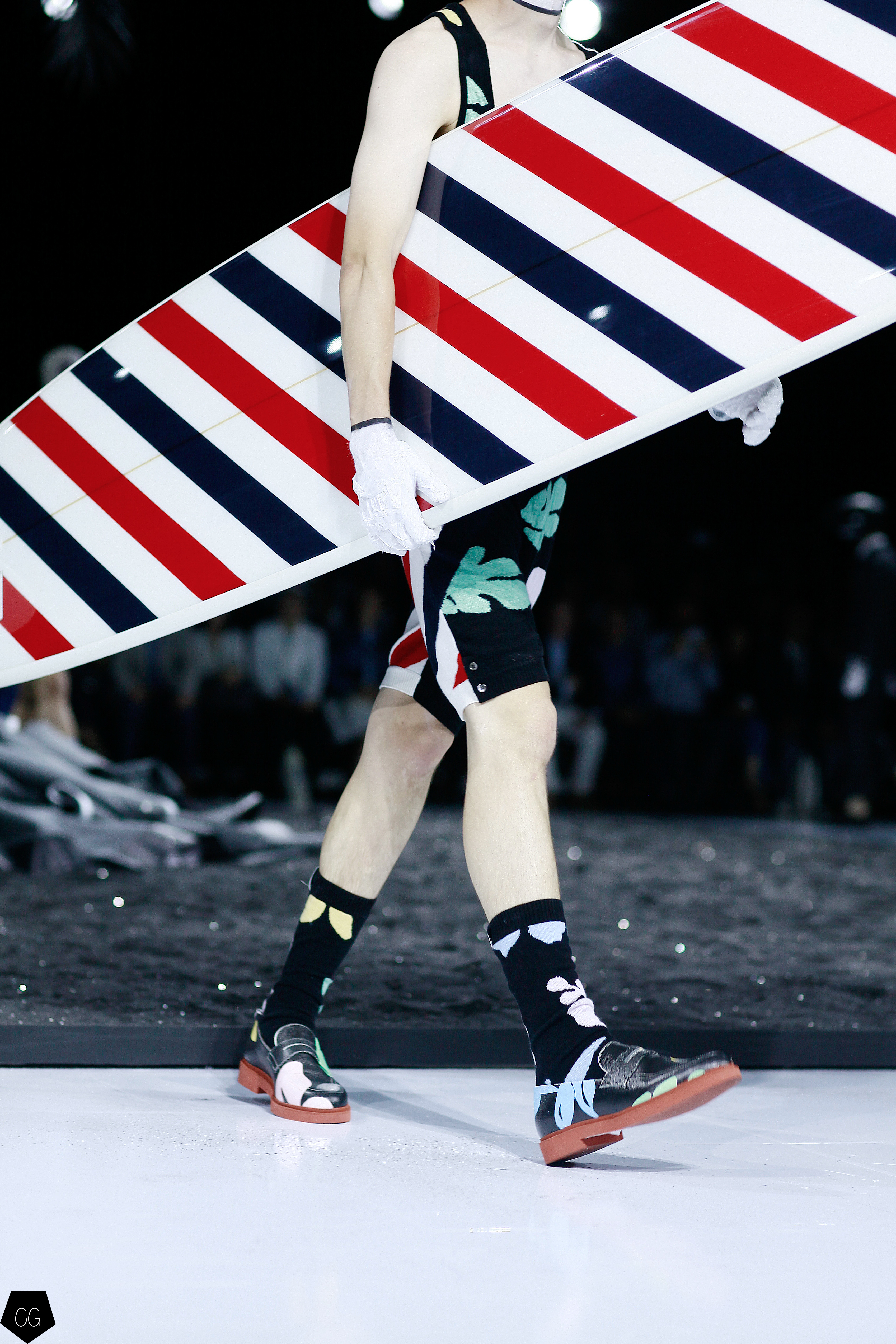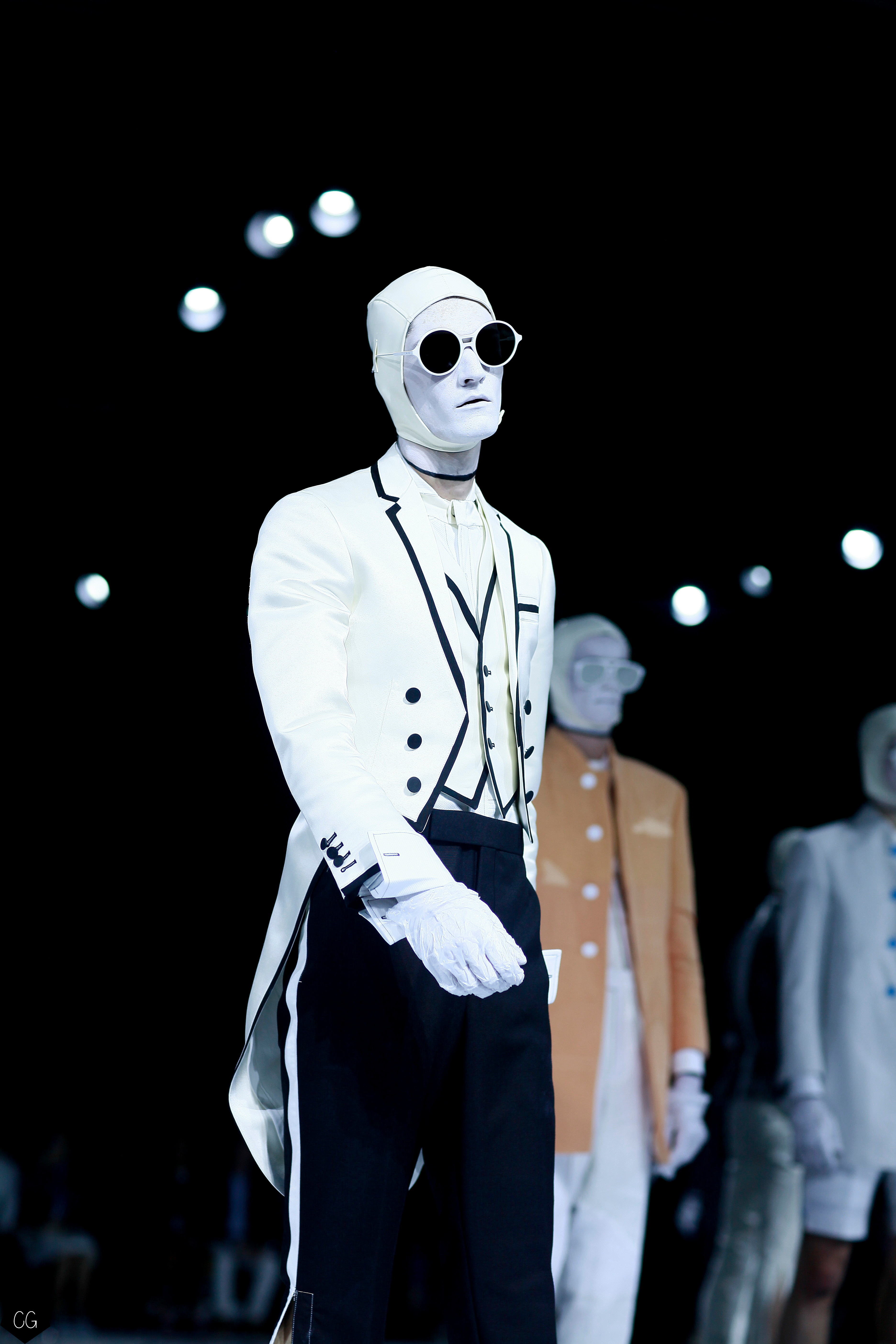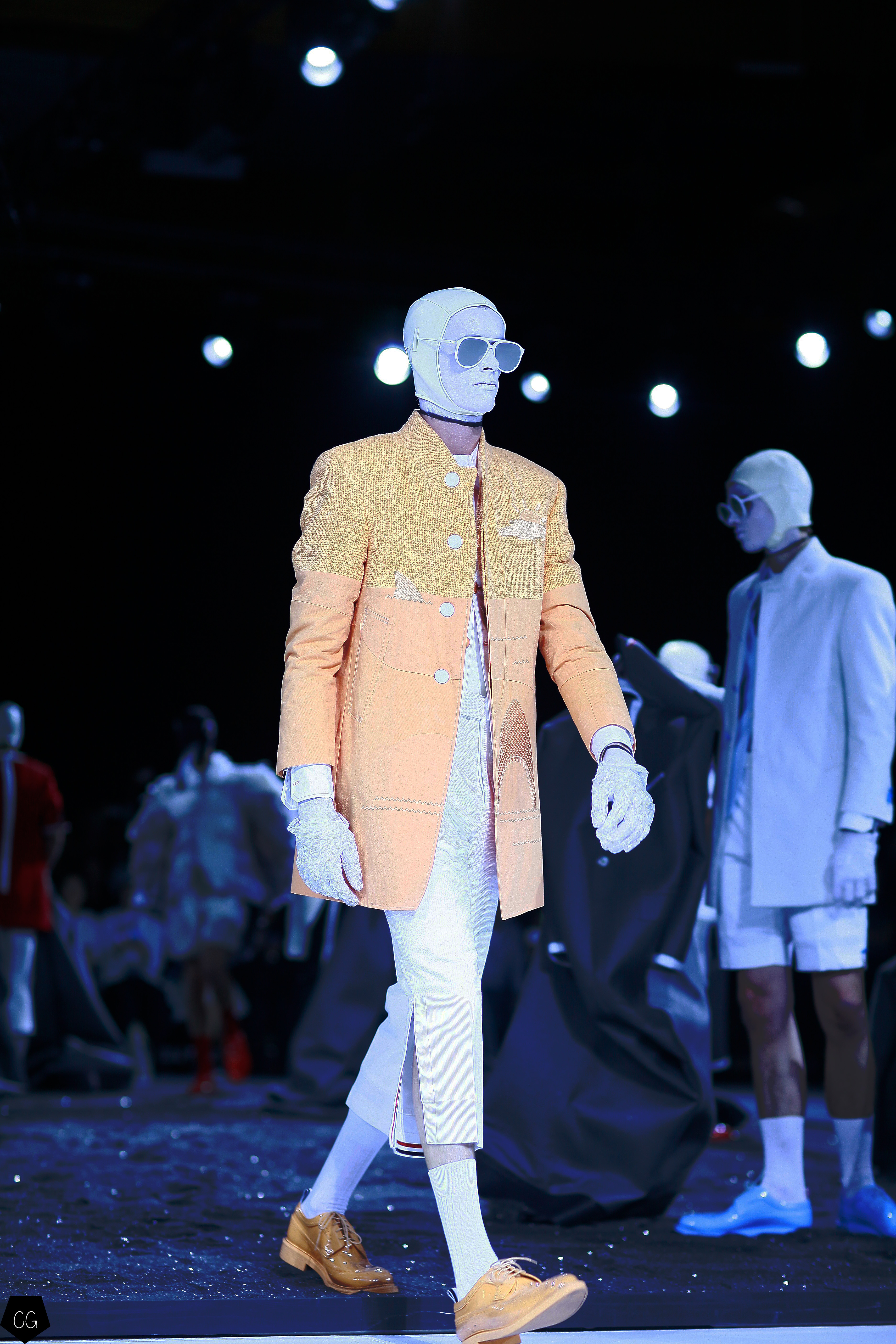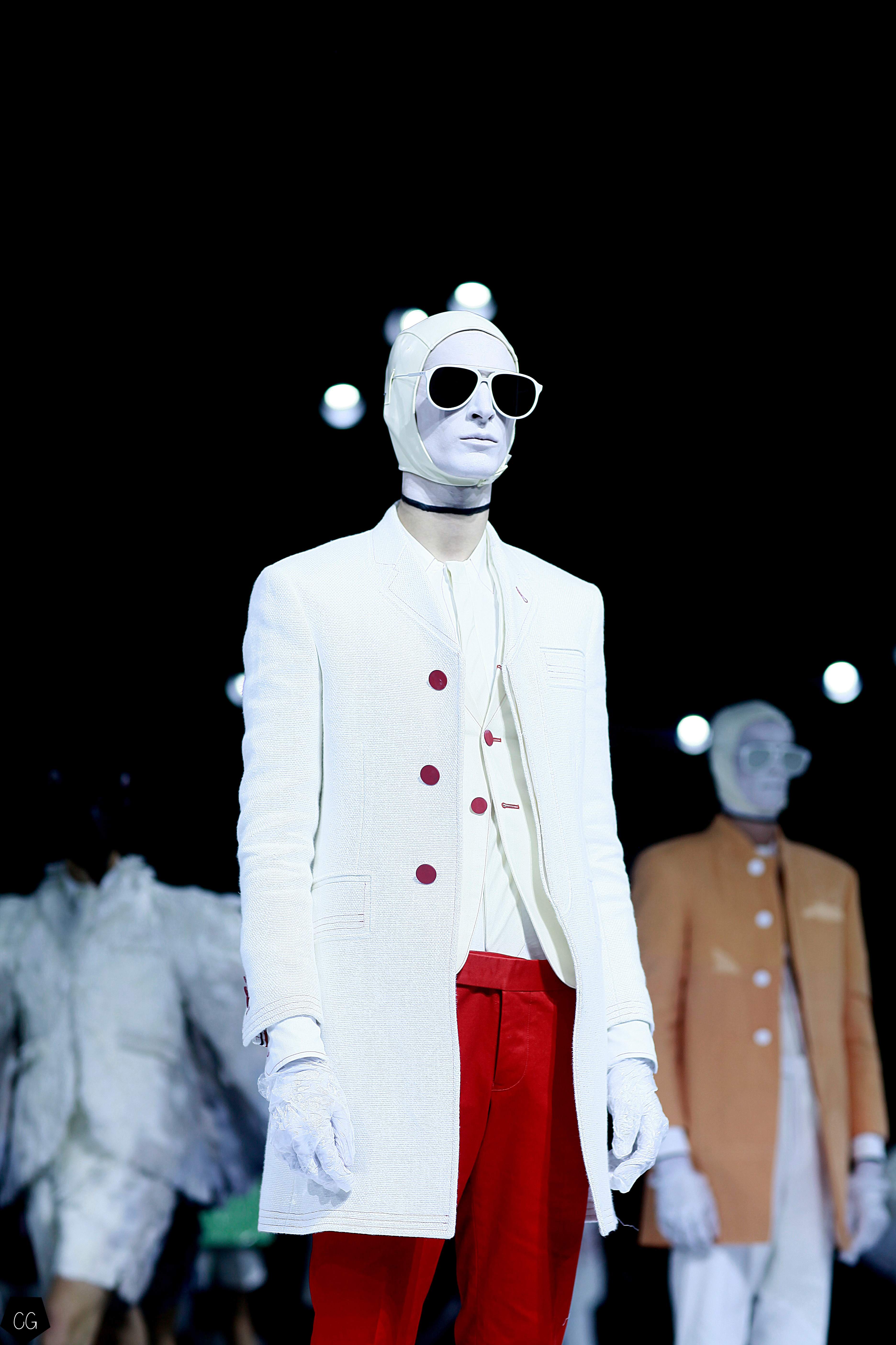 Le costume trois pièces devient la pièce emblématique du défilé. Il est réalisé dans des matières originales et complètement avant-gardistes, l’homme n’est plus cantonné au classique mais à l’innovation du costume trois pièces qui devient alors un vêtement avec lequel on peut jouer. Parfois même composé entièrement de plumes, le costume ici définit une histoire de mutation, de changement et d’évolution, comme l’exprime le défilé depuis le début, notamment lorsque les mannequins aux allures strictes se changent en gentlemans originaux, et à la fin en surfeur fière de leur patrie.