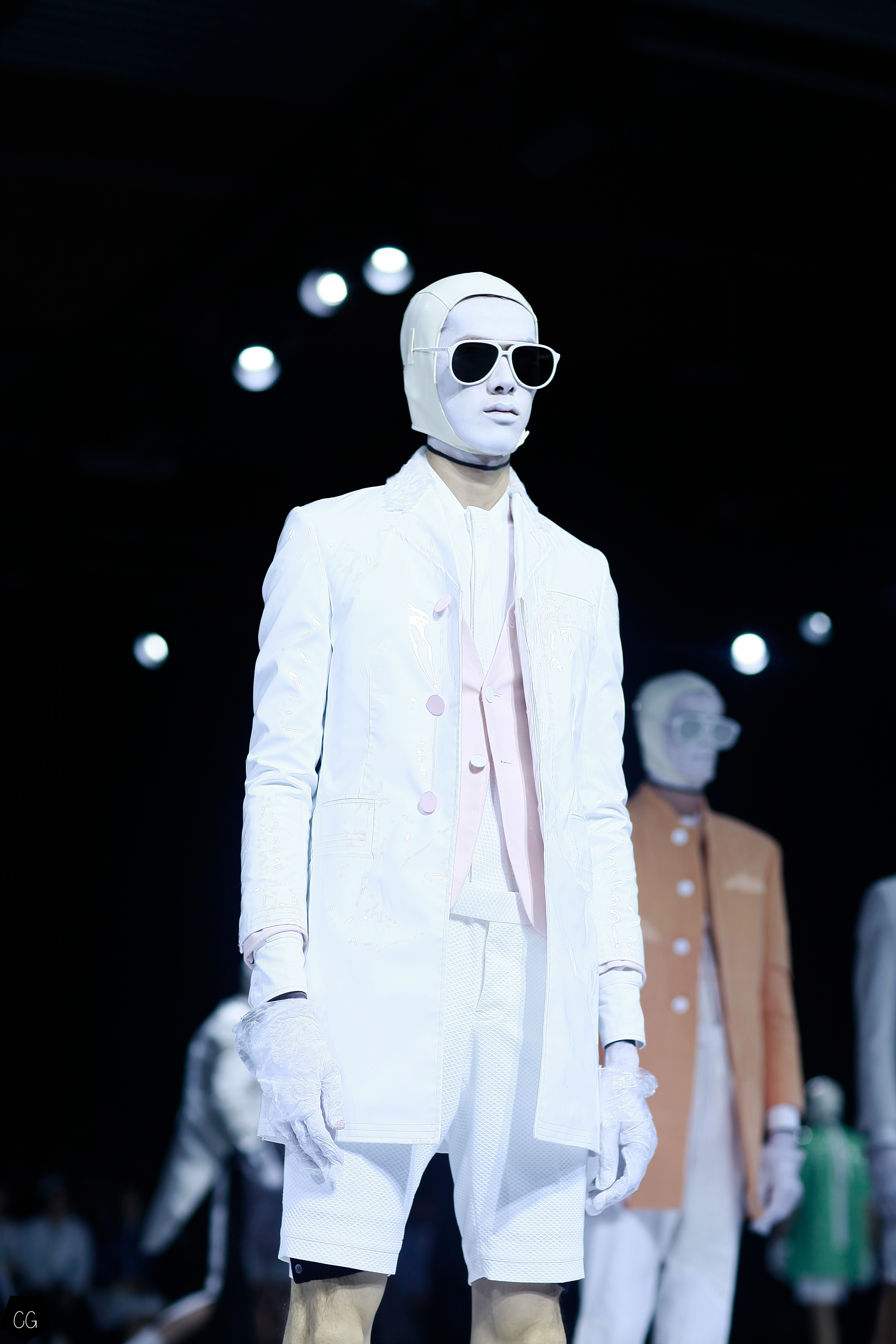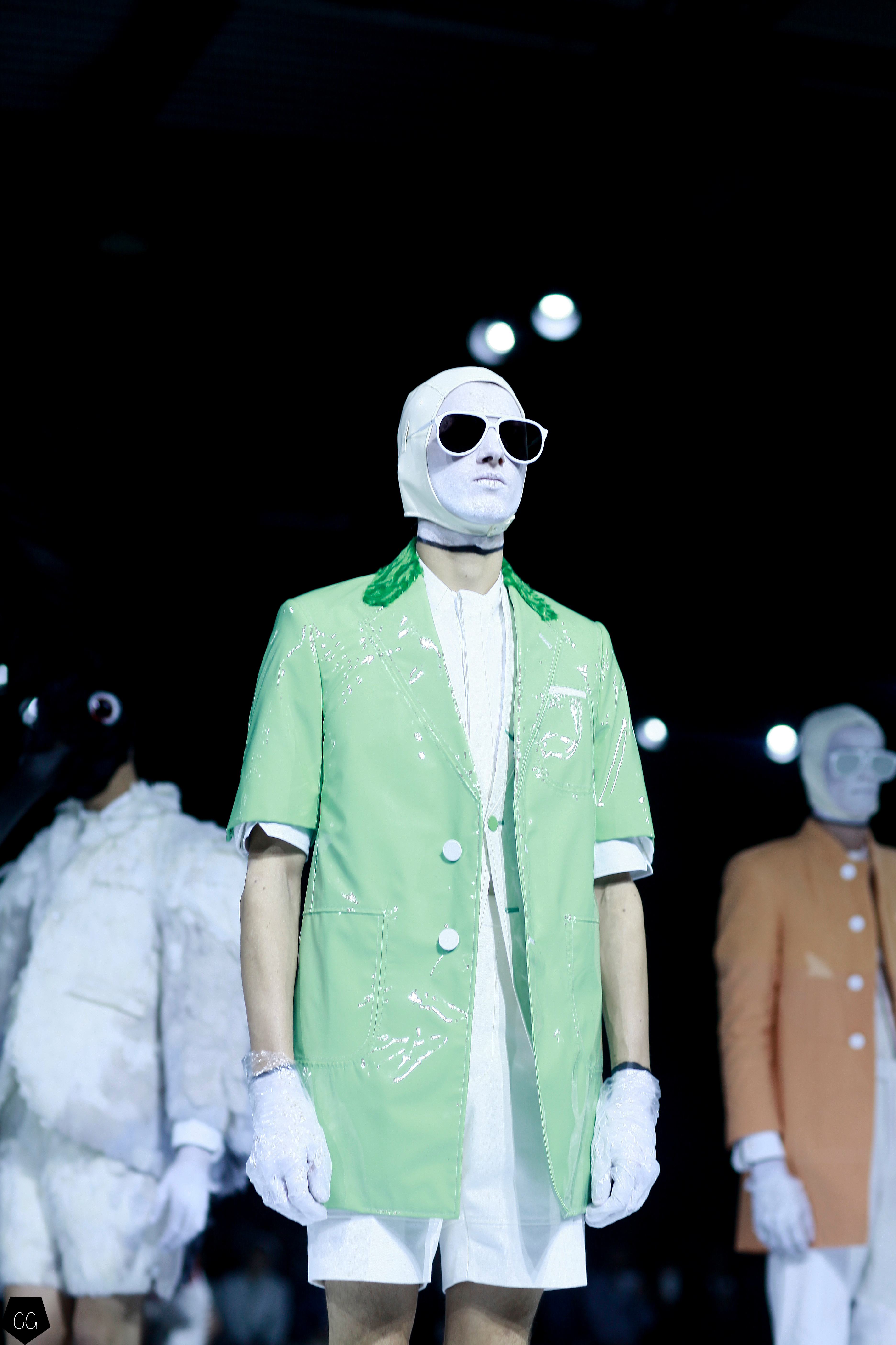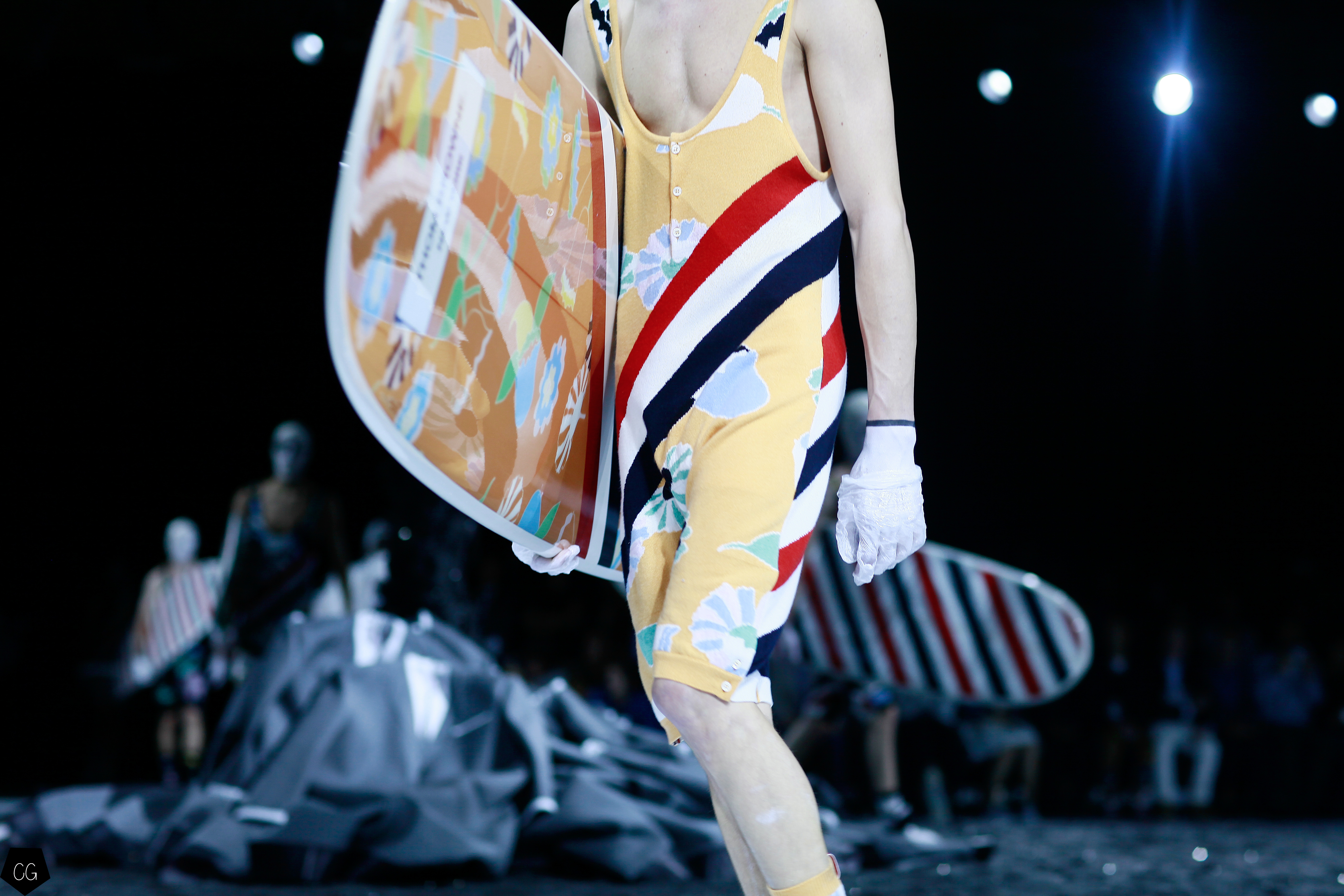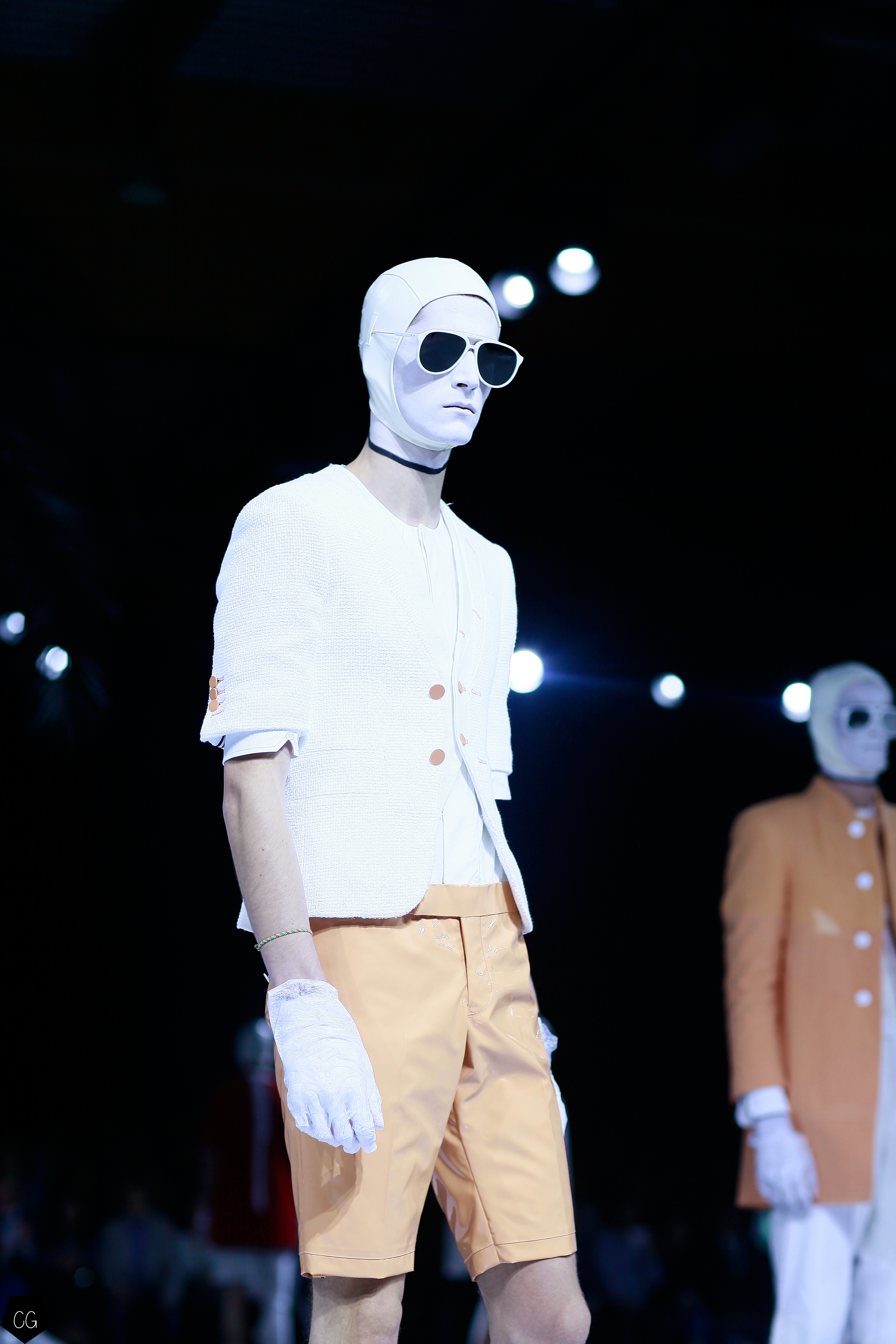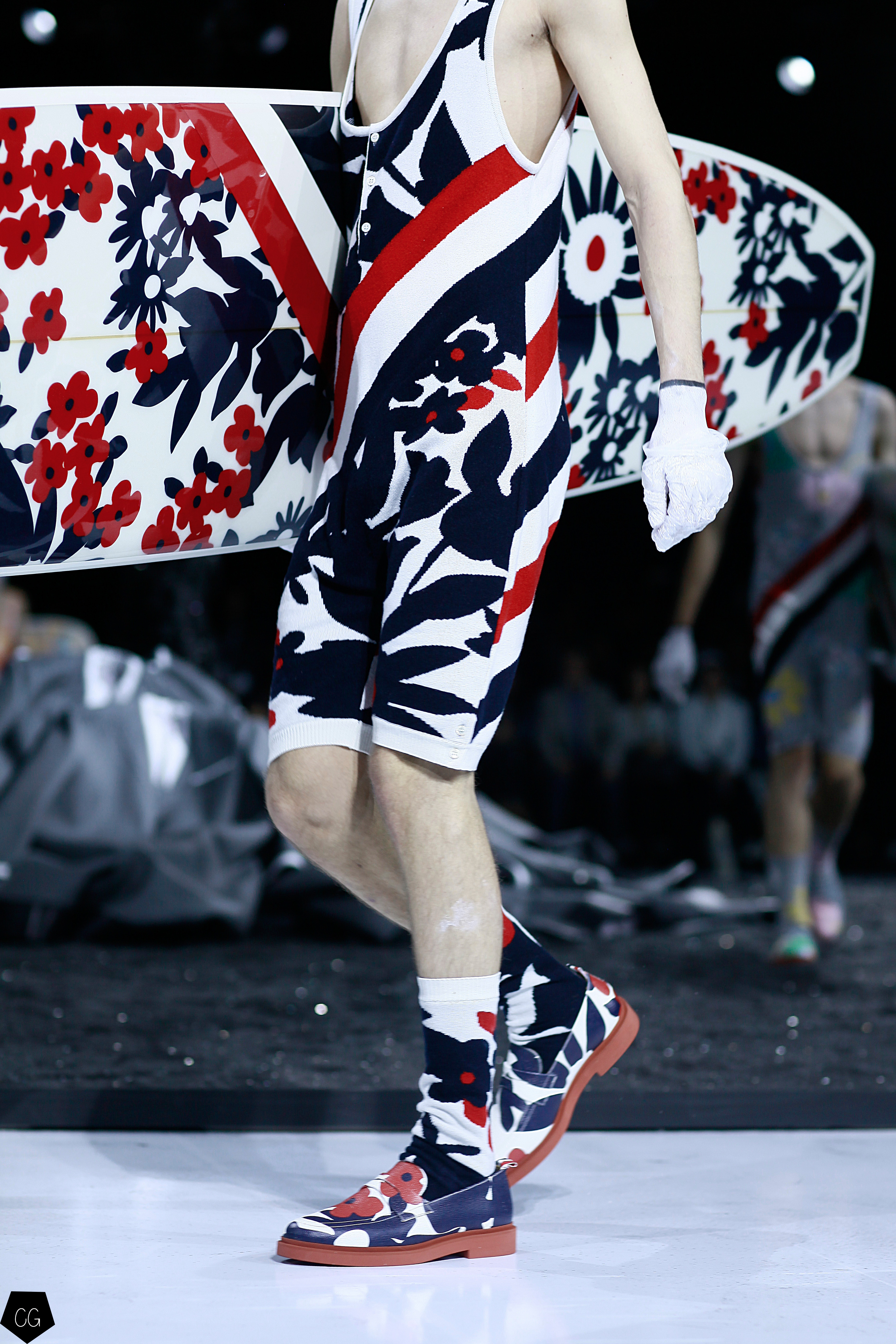 Le costume trois pièces devient la pièce emblématique du défilé. Il est réalisé dans des matières originales et complètement avant-gardistes, l’homme n’est plus cantonné au classique mais à l’innovation du costume trois pièces qui devient alors un vêtement avec lequel on peut jouer. Parfois même composé entièrement de plumes, le costume ici définit une histoire de mutation, de changement et d’évolution, comme l’exprime le défilé depuis le début, notamment lorsque les mannequins aux allures strictes se changent en gentlemans originaux, et à la fin en surfeur fière de leur patrie.