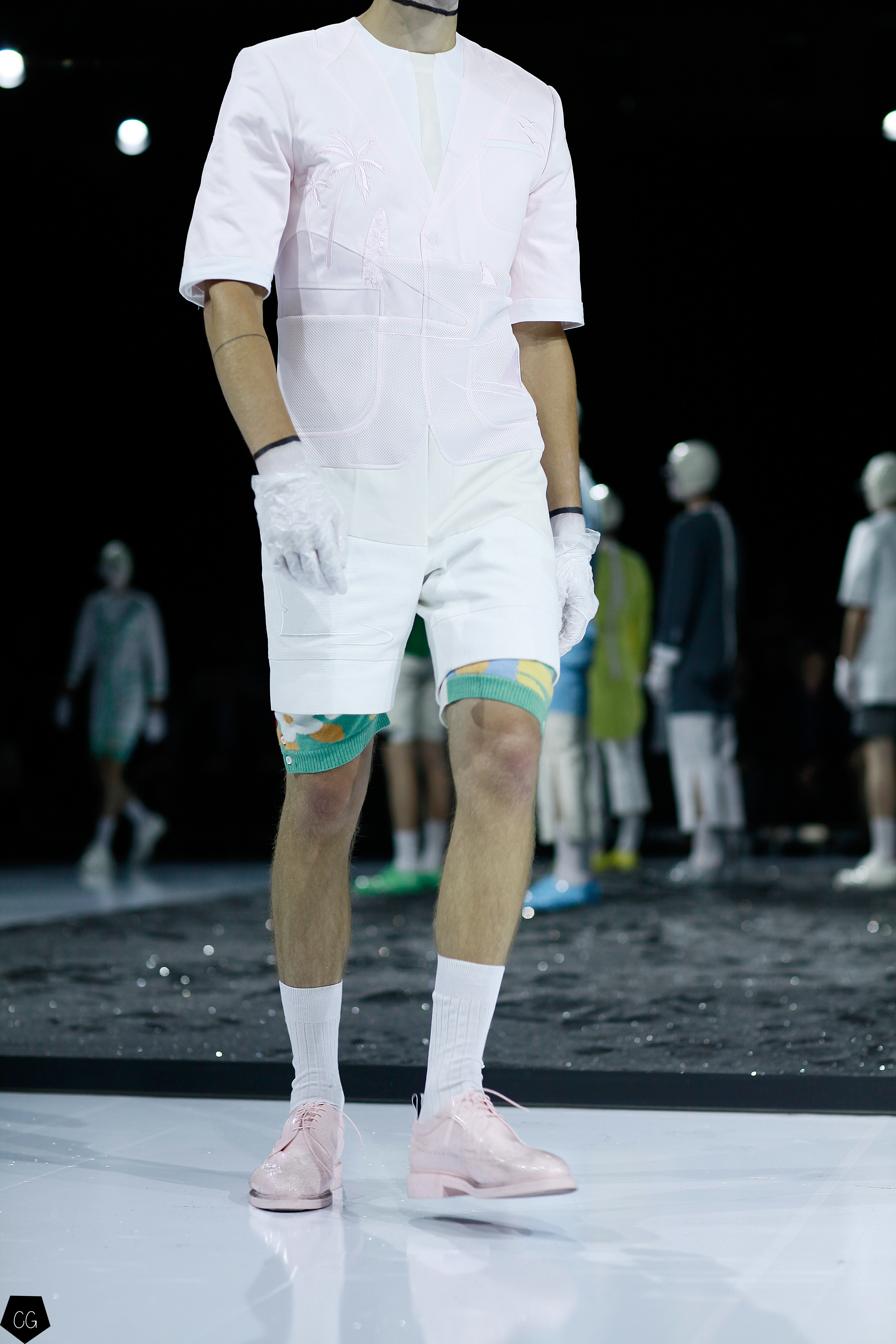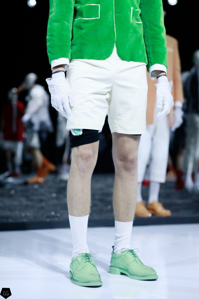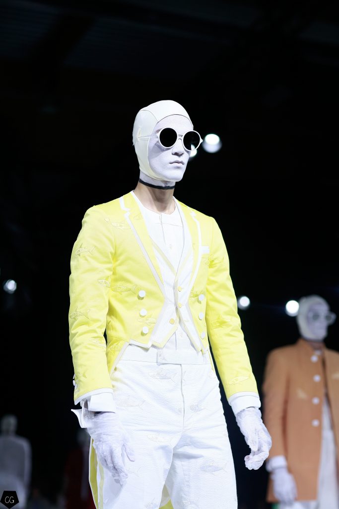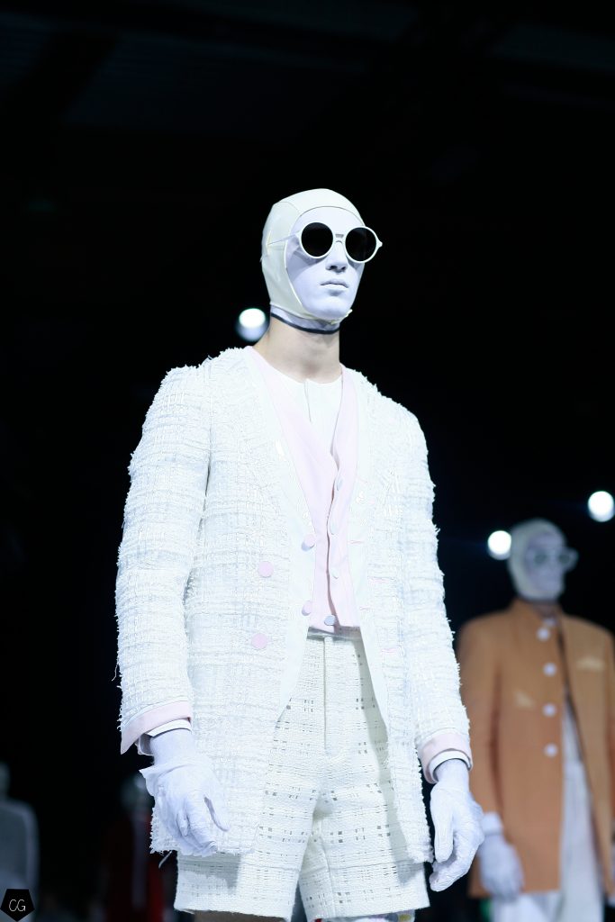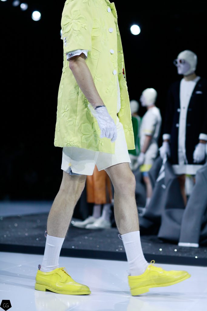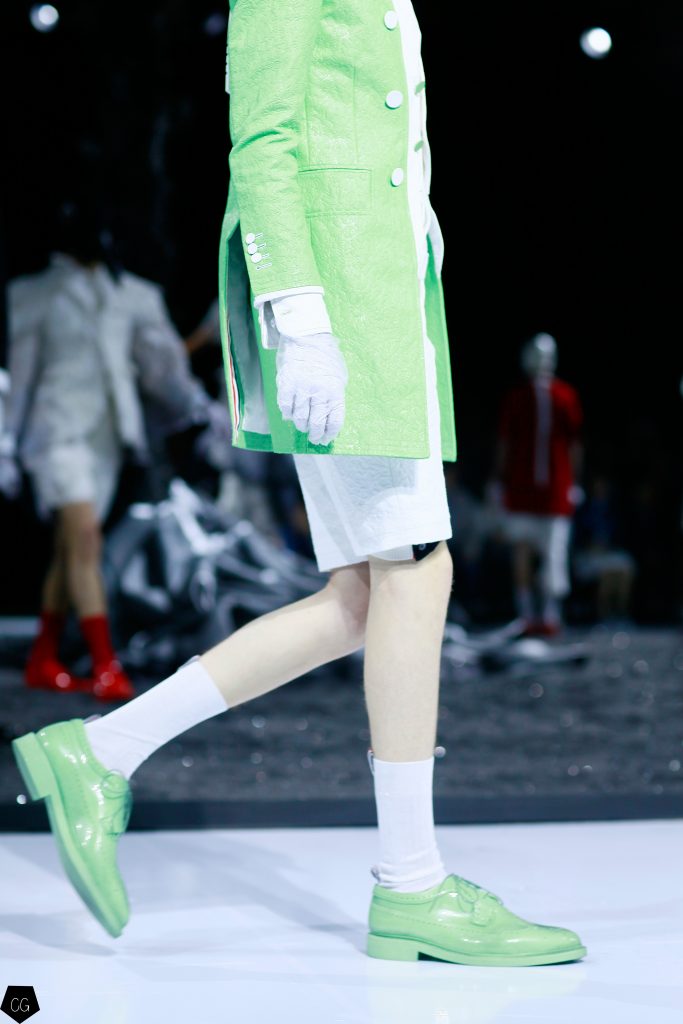 Puis les mannequins retirent leurs costumes et nous dévoilent des tenues d’un blanc éclatant et de délicieuses couleurs pastels. Dans un esprit costume masculin du XVIII ème siècle, les silhouettes se révèlent et ce sont des personnages chics et moderne en tenue estivale , des pièces de l’histoire de la mode, revisitées avec élégance et originalité, que Thom Browne apprécie tant. Les matières sont contemporaines ainsi que les couleurs. On retrouve des matières luisantes comme le vinyle et toute la gamme de tons pastels, sur certaines pièces uniquement.