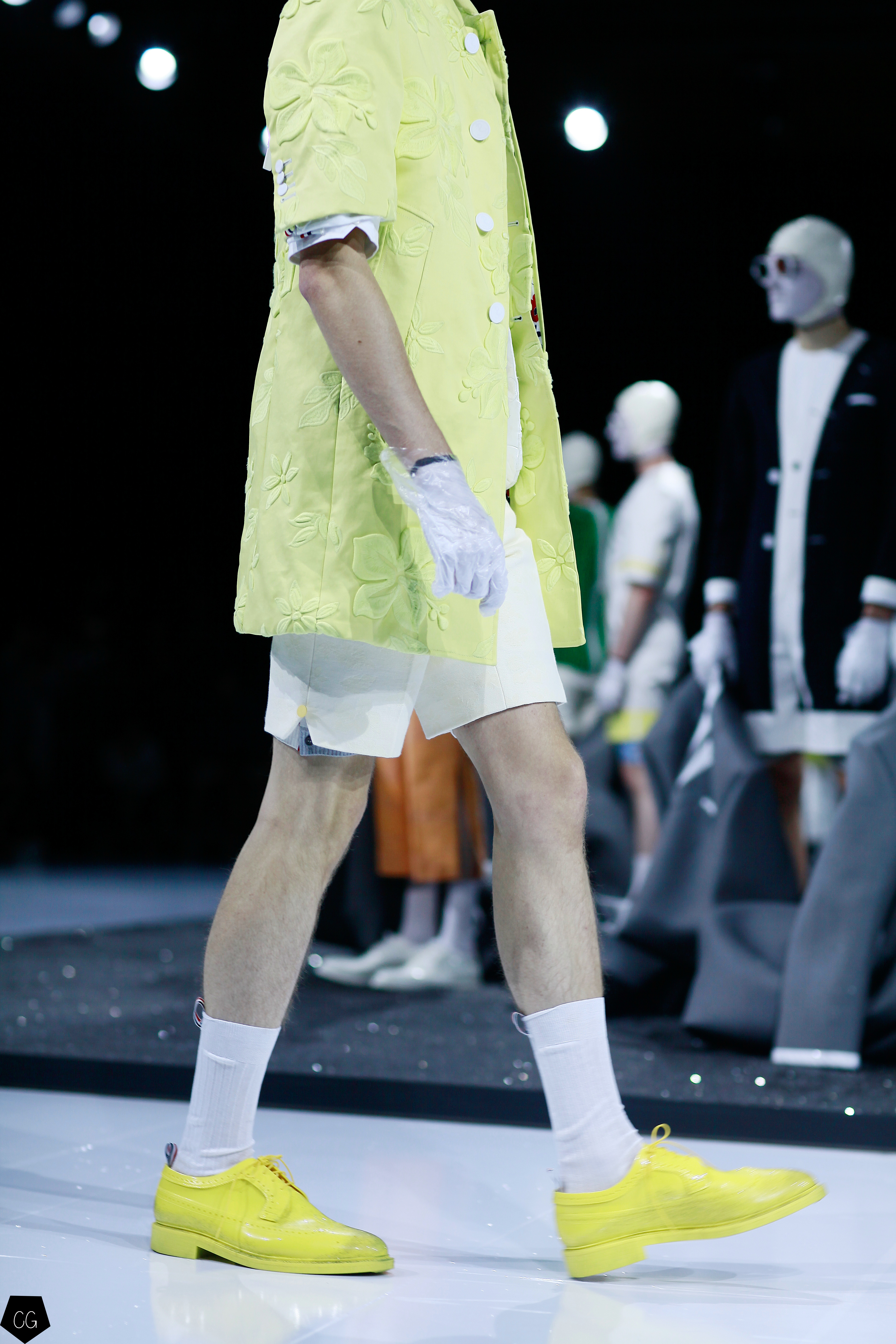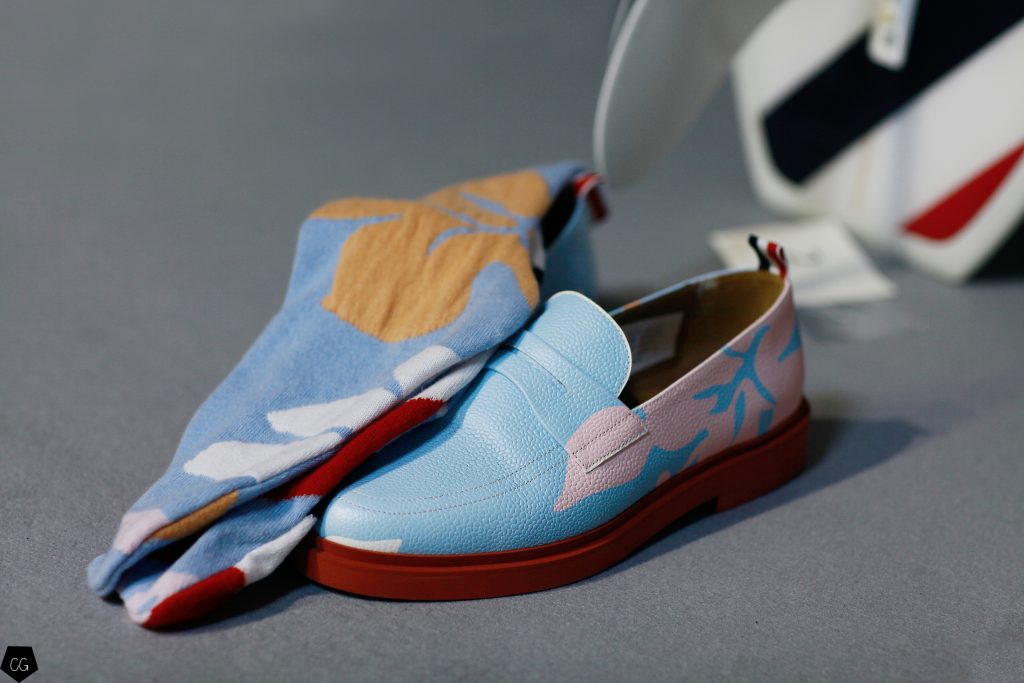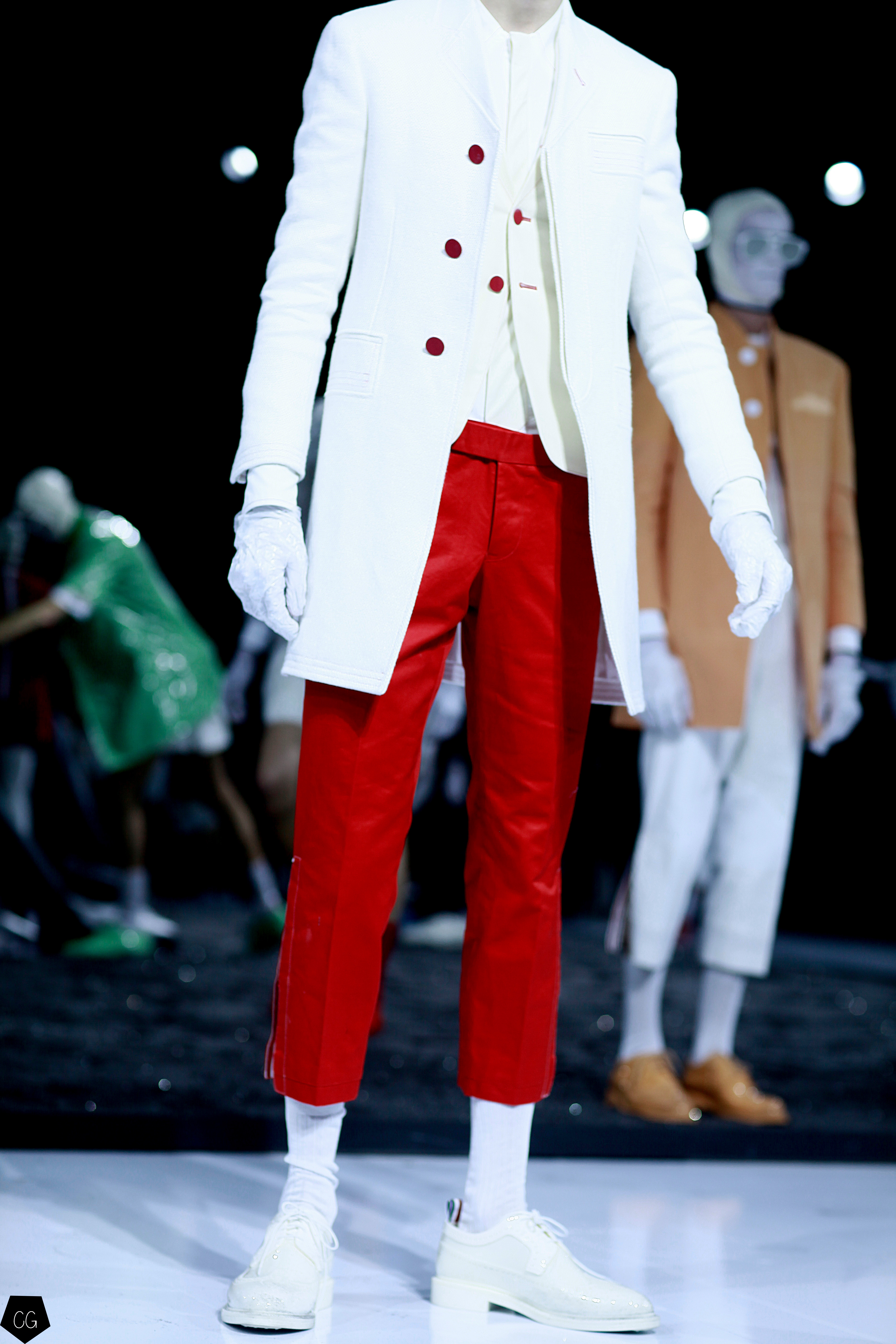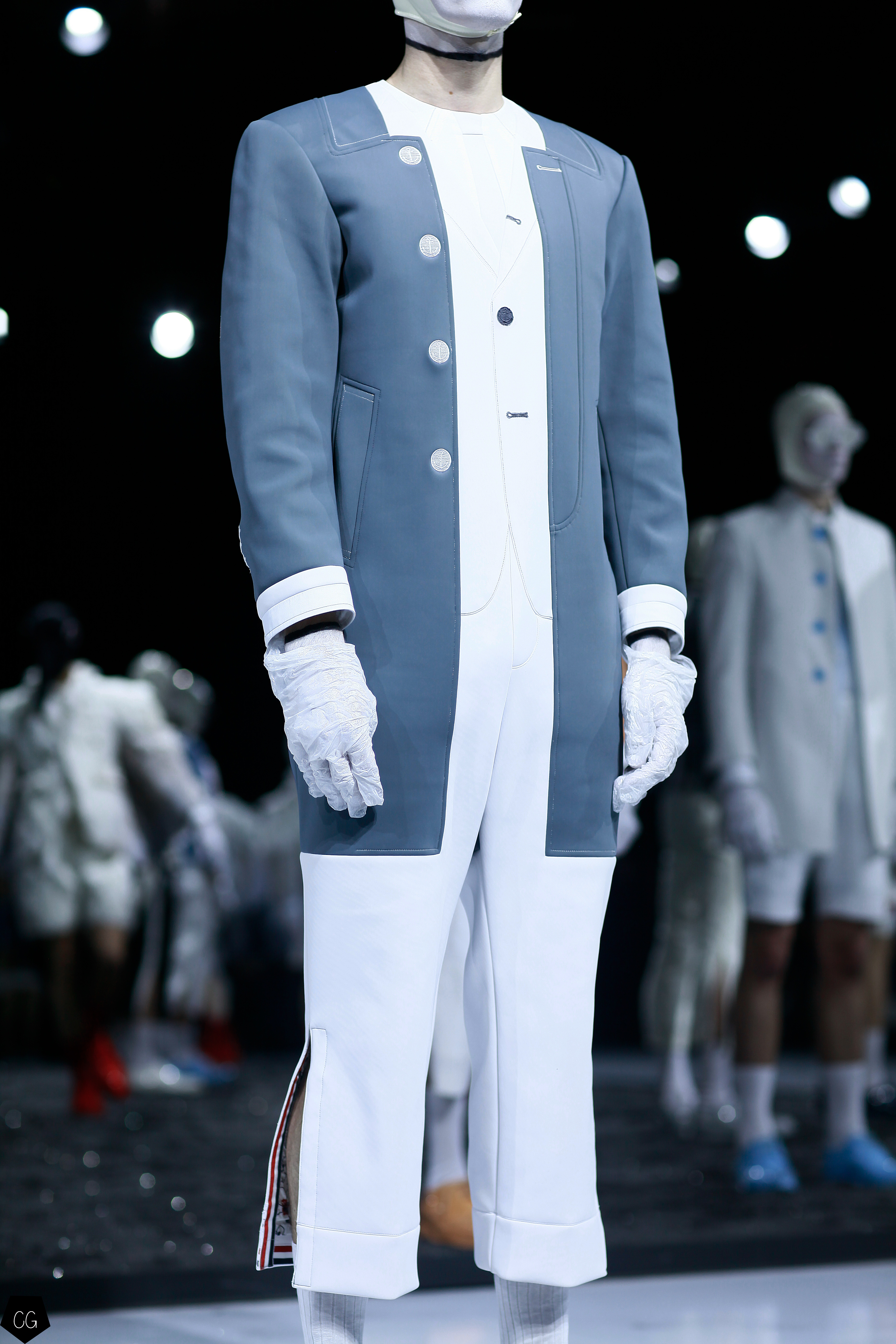 Puis les mannequins retirent leurs costumes et nous dévoilent des tenues d’un blanc éclatant et de délicieuses couleurs pastels. Dans un esprit costume masculin du XVIII ème siècle, les silhouettes se révèlent et ce sont des personnages chics et moderne en tenue estivale , des pièces de l’histoire de la mode, revisitées avec élégance et originalité, que Thom Browne apprécie tant. Les matières sont contemporaines ainsi que les couleurs. On retrouve des matières luisantes comme le vinyle et toute la gamme de tons pastels, sur certaines pièces uniquement.