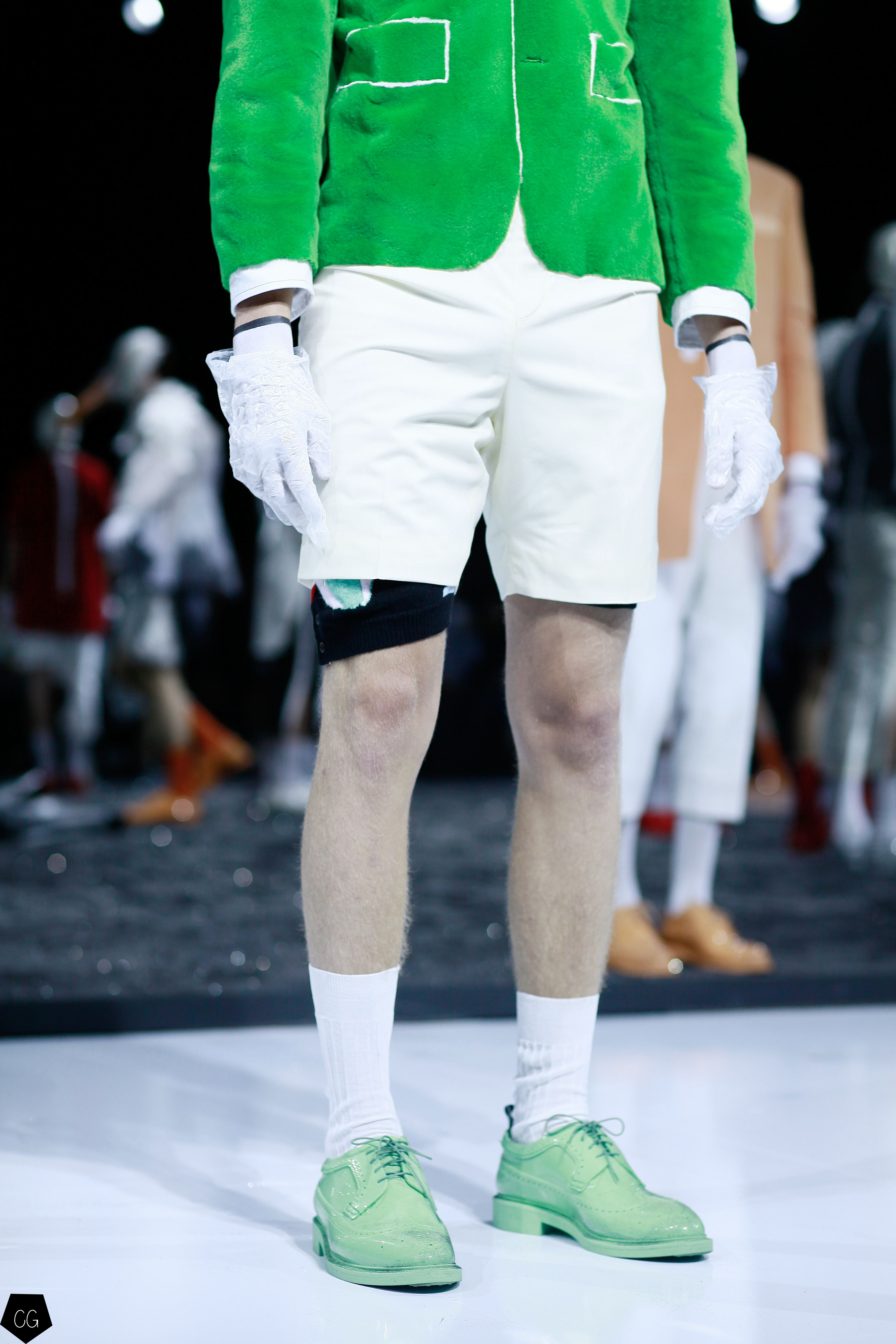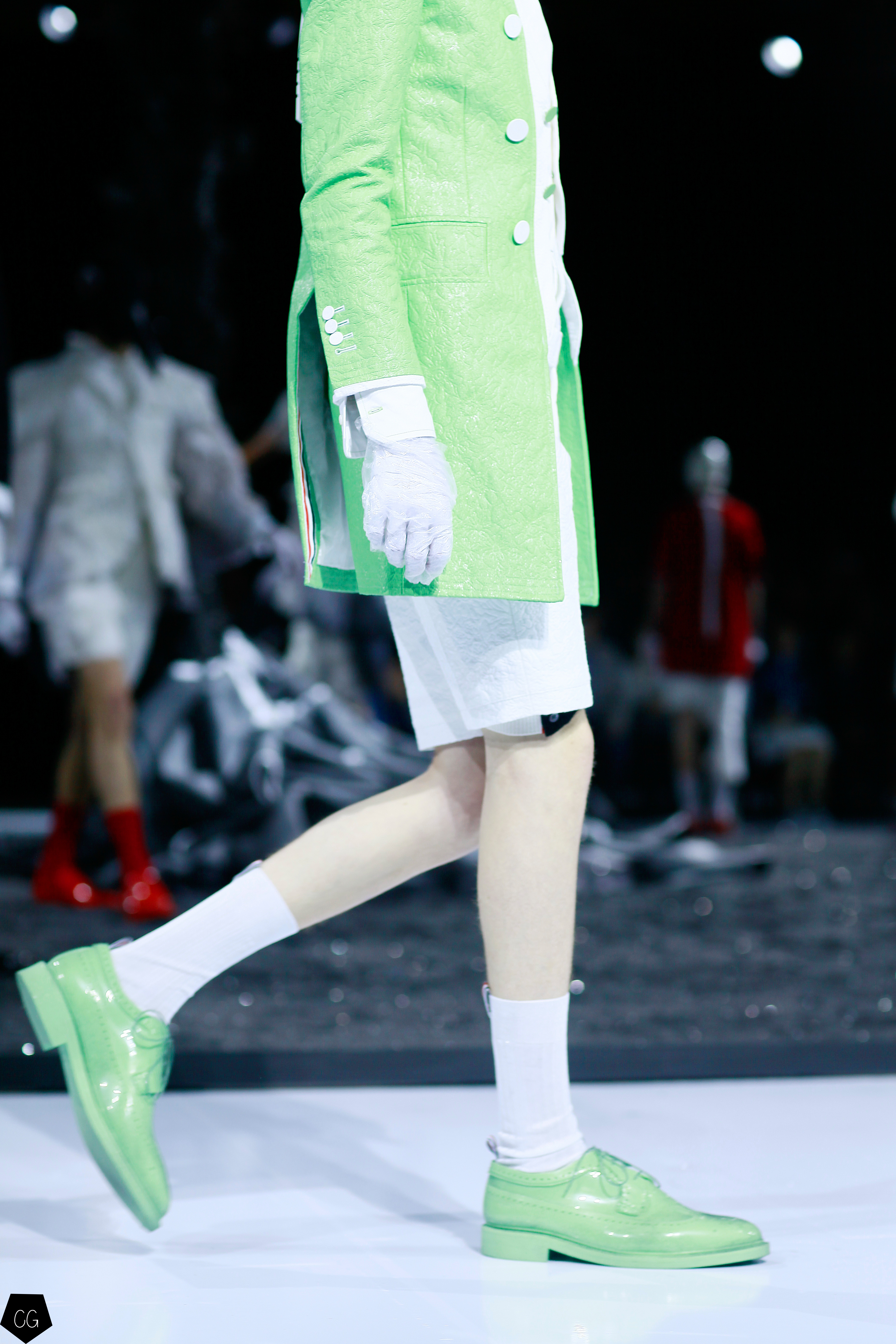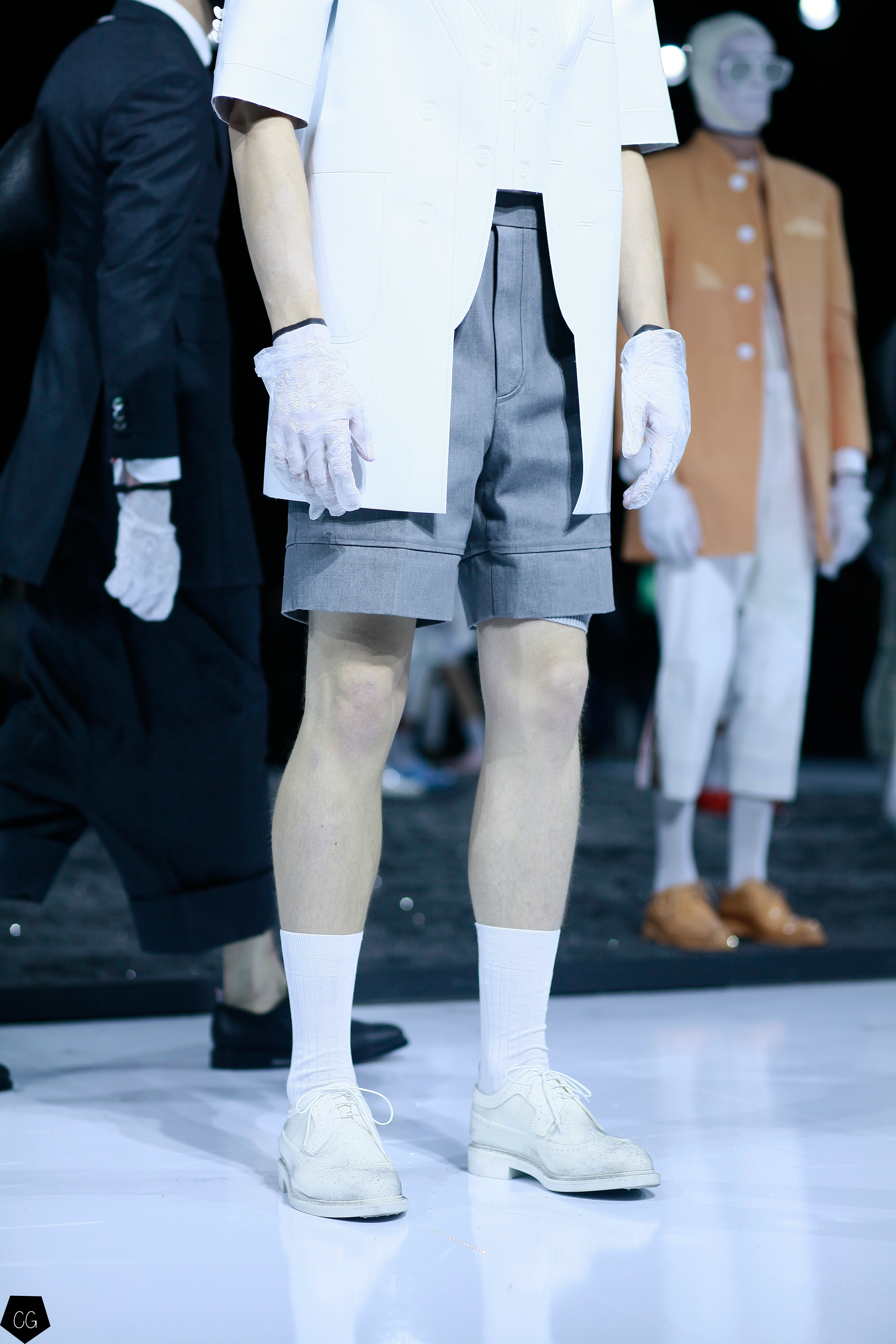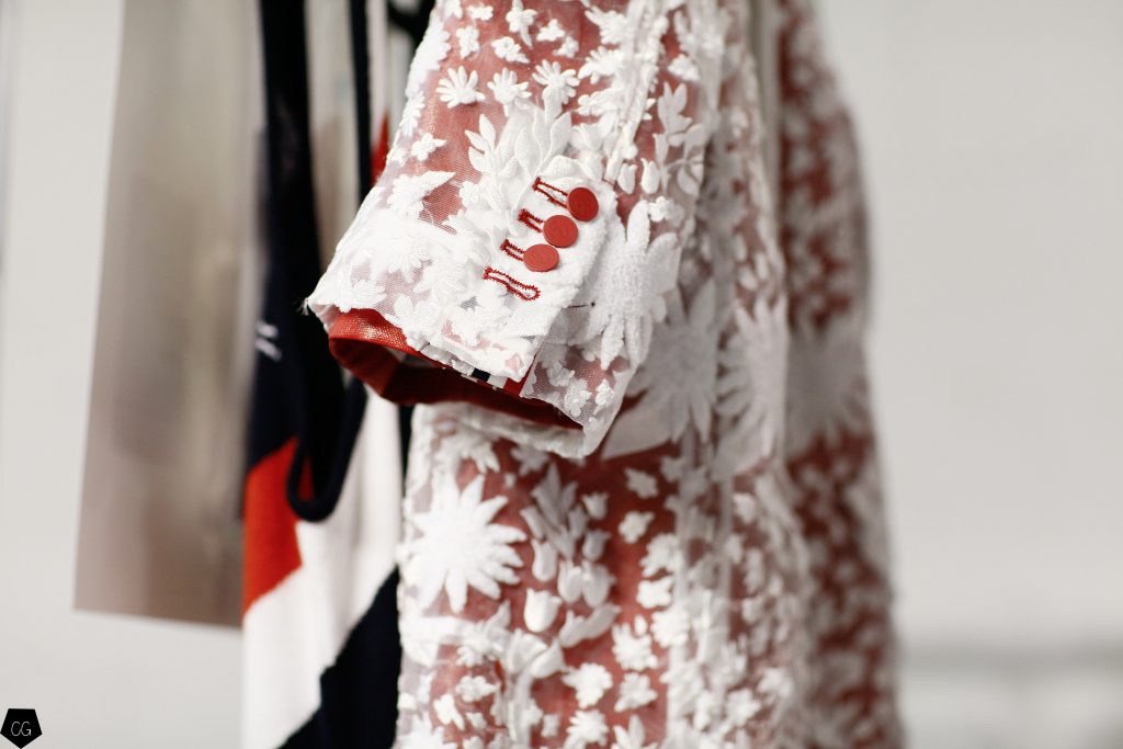 Puis les mannequins retirent leurs costumes et nous dévoilent des tenues d’un blanc éclatant et de délicieuses couleurs pastels. Dans un esprit costume masculin du XVIII ème siècle, les silhouettes se révèlent et ce sont des personnages chics et moderne en tenue estivale , des pièces de l’histoire de la mode, revisitées avec élégance et originalité, que Thom Browne apprécie tant. Les matières sont contemporaines ainsi que les couleurs. On retrouve des matières luisantes comme le vinyle et toute la gamme de tons pastels, sur certaines pièces uniquement.
