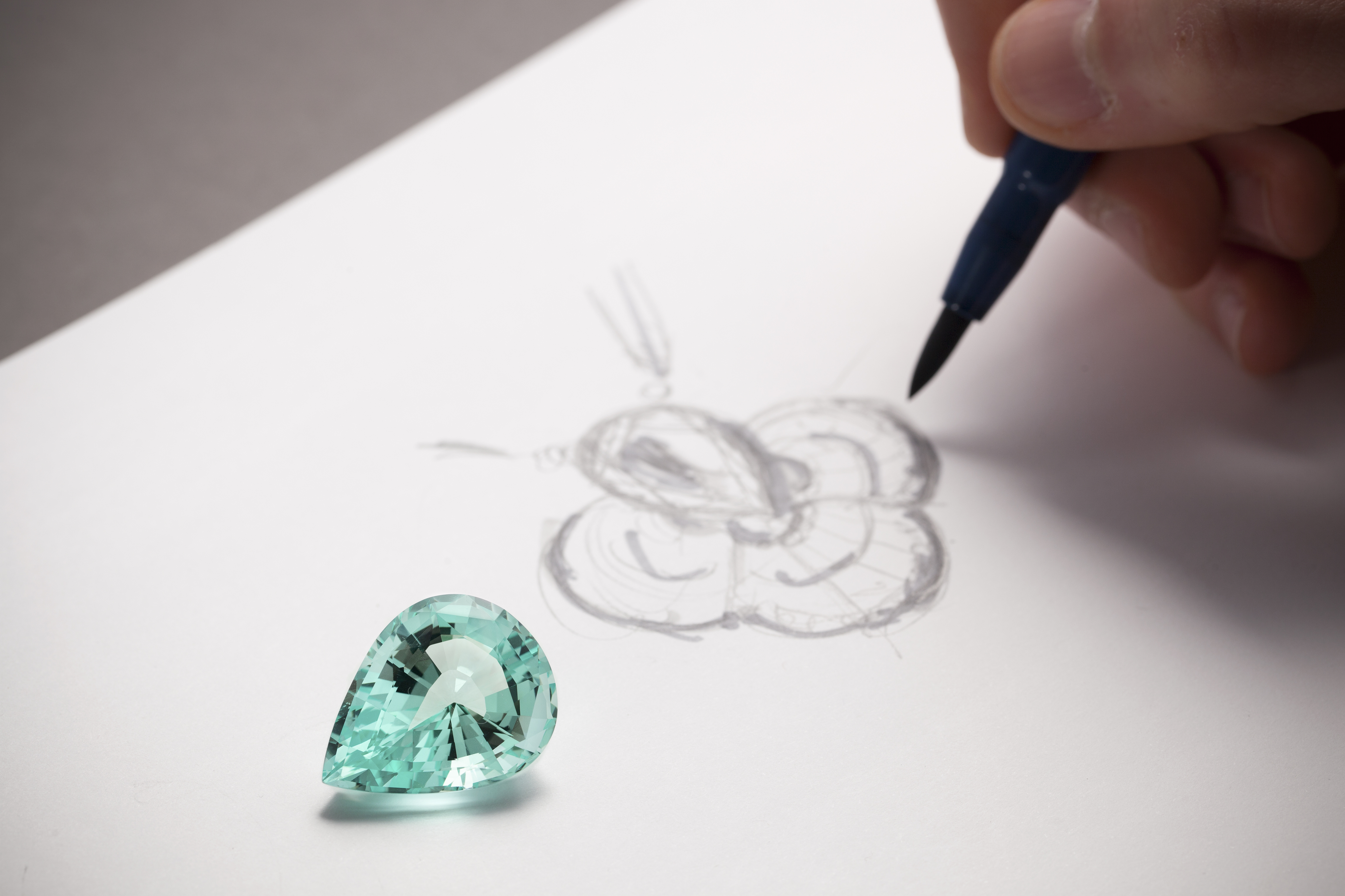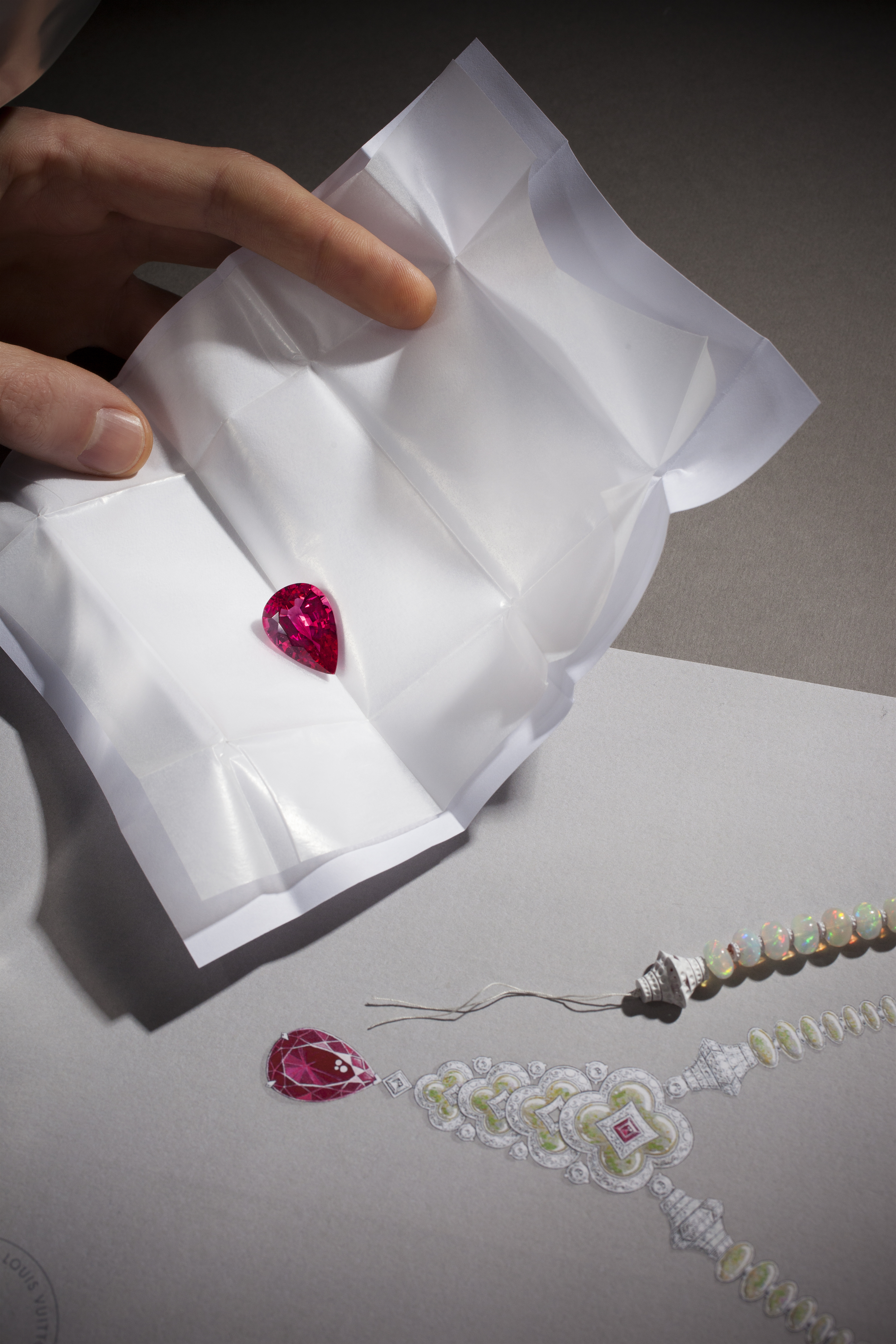 Au fil des dessins, la fleur Louis Vuitton se prête à toutes les expérimentations. Travaillée en perspective ou scindée en deux parties dont l’une se propage comme une onde de choc. Miniaturisée, dans des agencements de motifs géométriques en émail et des camaïeux de tourmalines bleues et vertes. Sur un médaillon, l’un de ses pétales s’hybride avec un béryl bleu-vert de 43,05 carats évoquant les mers du Sud. Les trois autres sont façonnés en diamants baguette et en calcédoines parfaitement calibrés.