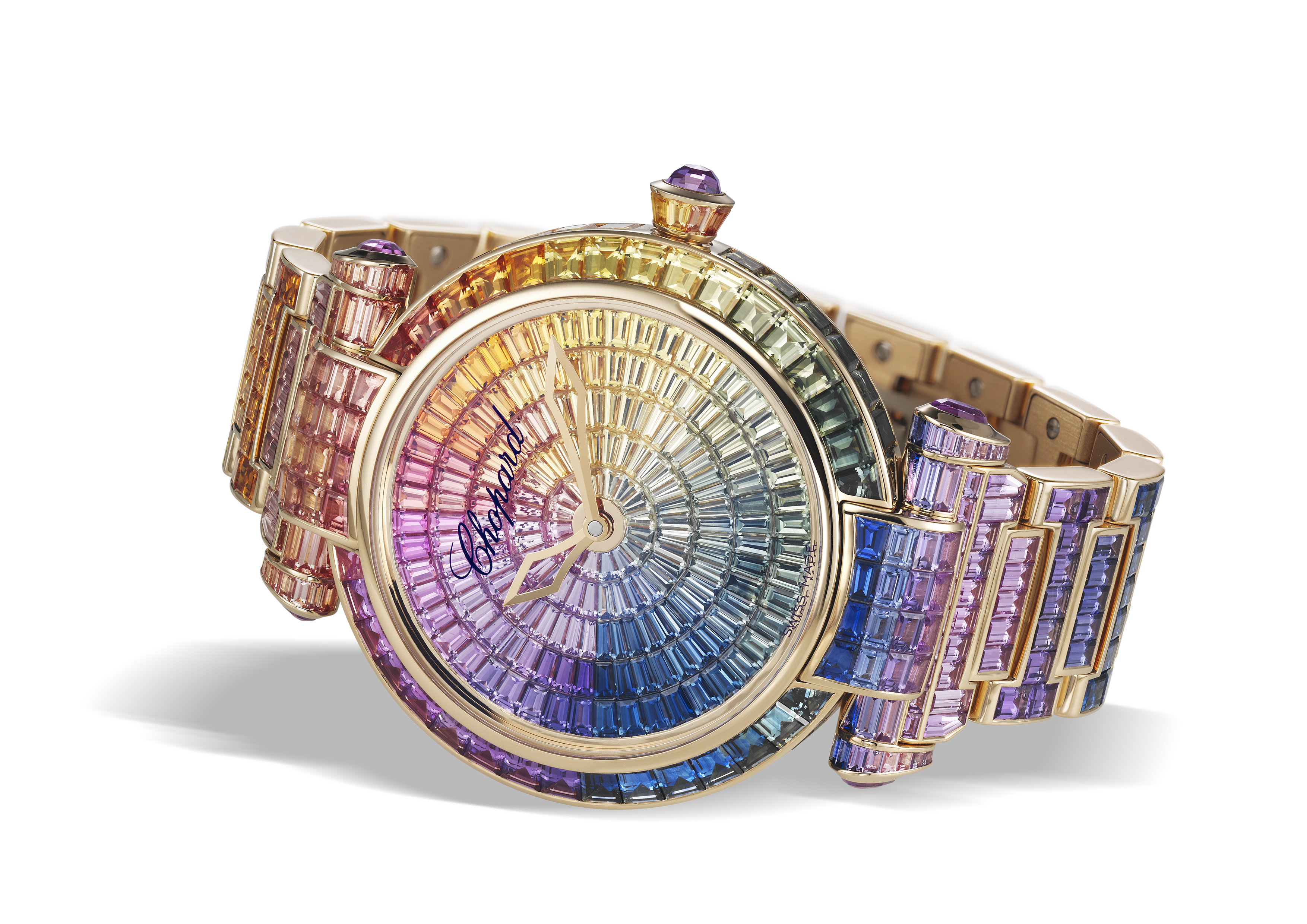 Sur cet ouvrage d’exception se sont penchées successivement toutes les petites mains, patientes, expertes et inventives des ateliers de joaillerie et d’horlogerie de la manufacture genevoise. Ils ont donné vie à une montre en or rose 18ct entièrement sertie de saphirs taille baguette, et dont le dégradé de couleurs recouvre le cadran, le boîtier et le bracelet. La couronne et les couvre-anses sont ornés d’améthystes. La sélection, la taille, le tri et le sertissage des pierres ont requis un savoir-faire exceptionnel et un travail titanesque mené par les artisans d’art de Chopard : 1012 heures de travail au total uniquement pour ces opérations. Comme dans les plus beaux contes, la montre semble parée d’une robe haute-couture aux couleurs de l’arc-en-ciel, une étoffe joaillière d’une exquise délicatesse. Et sous cet habit de lumière bat en secret le cœur d’un mouvement automatique…