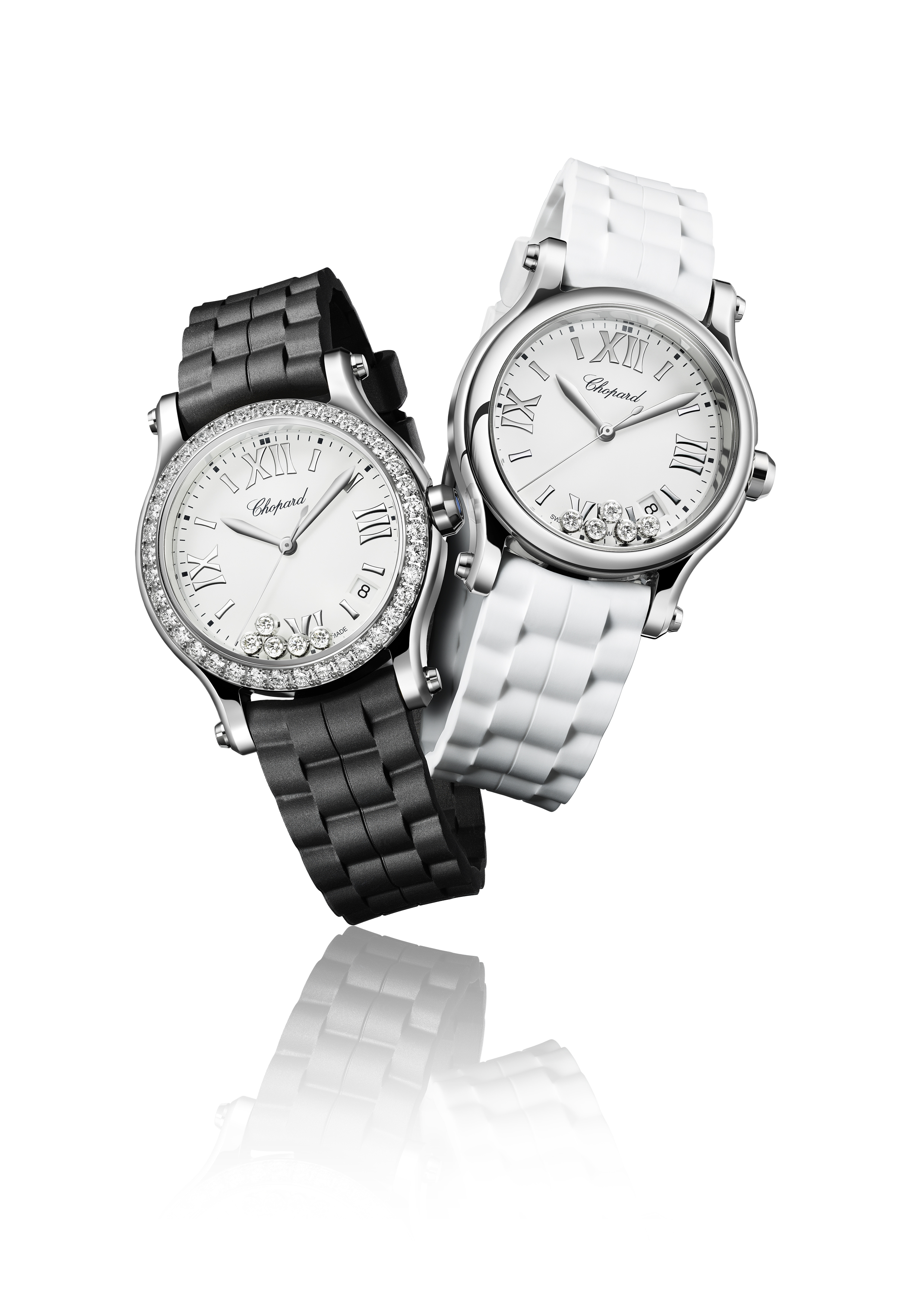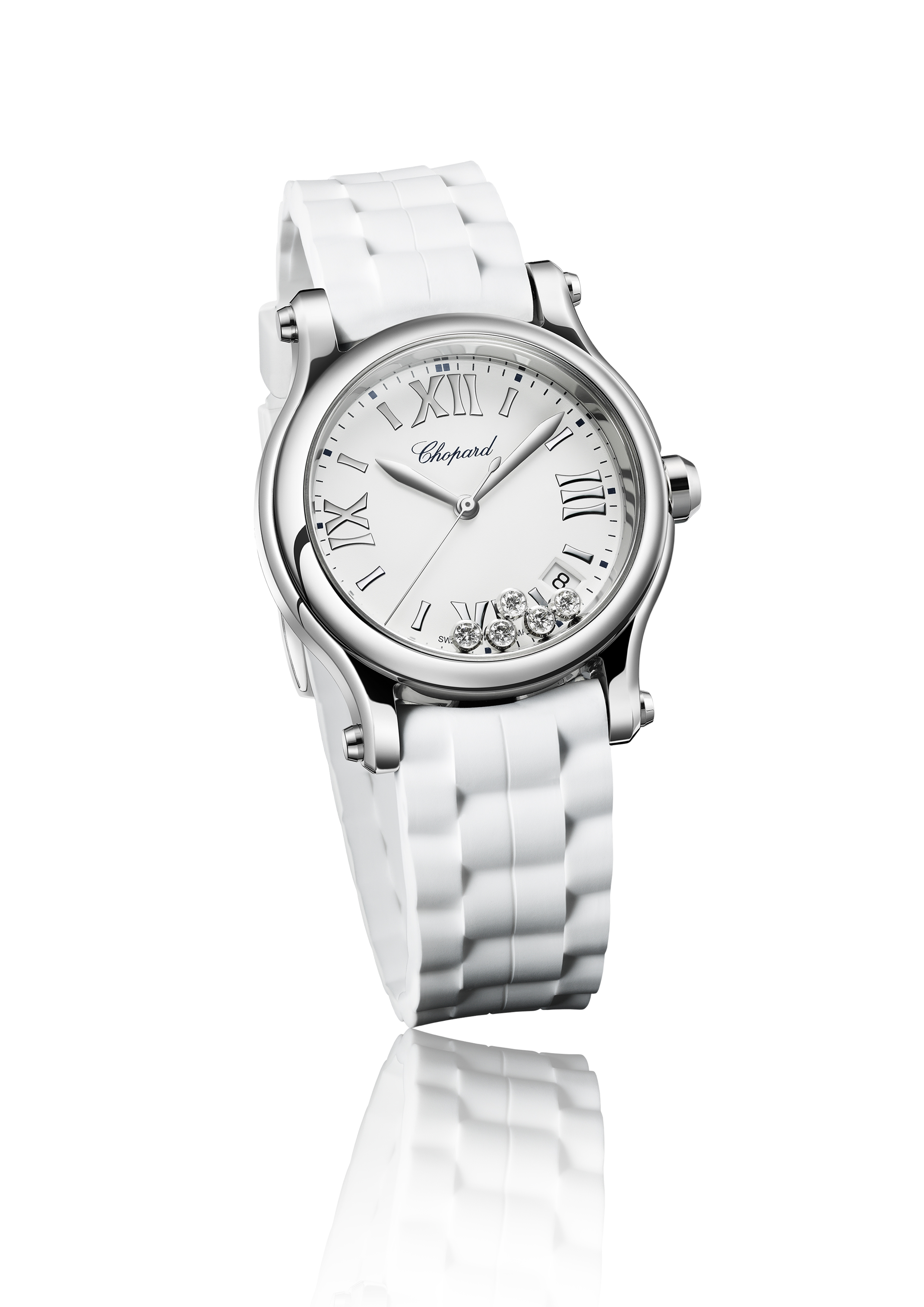 L’essence même de la Happy Sport, ce sont bien sûr les célèbres diamants mobiles, qui dansent entre deux verres saphir, libres de tout sertissage. Ils dévoilent ici, en toile de fond, un cadran blanc lisse, aussi classique que contemporain.