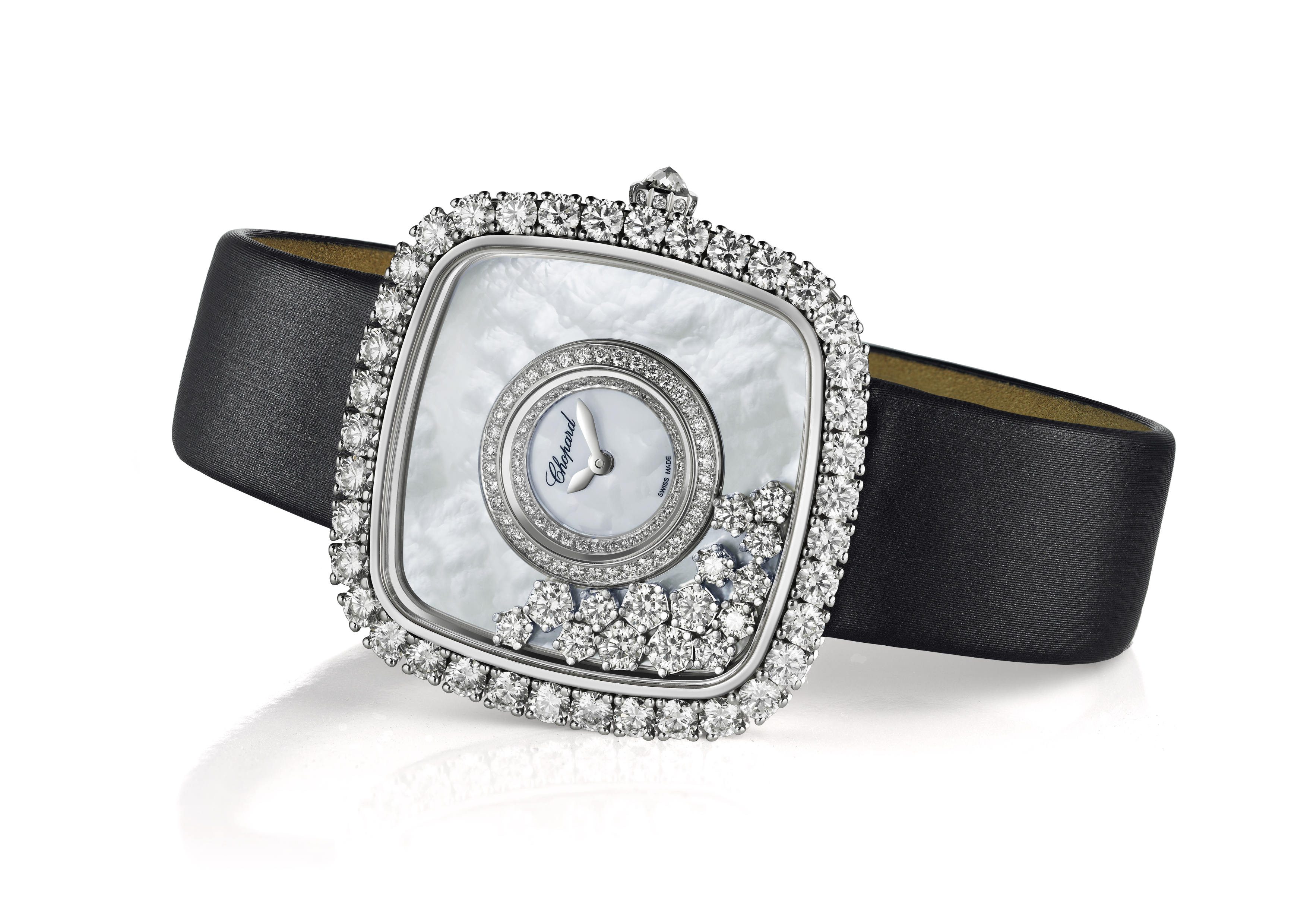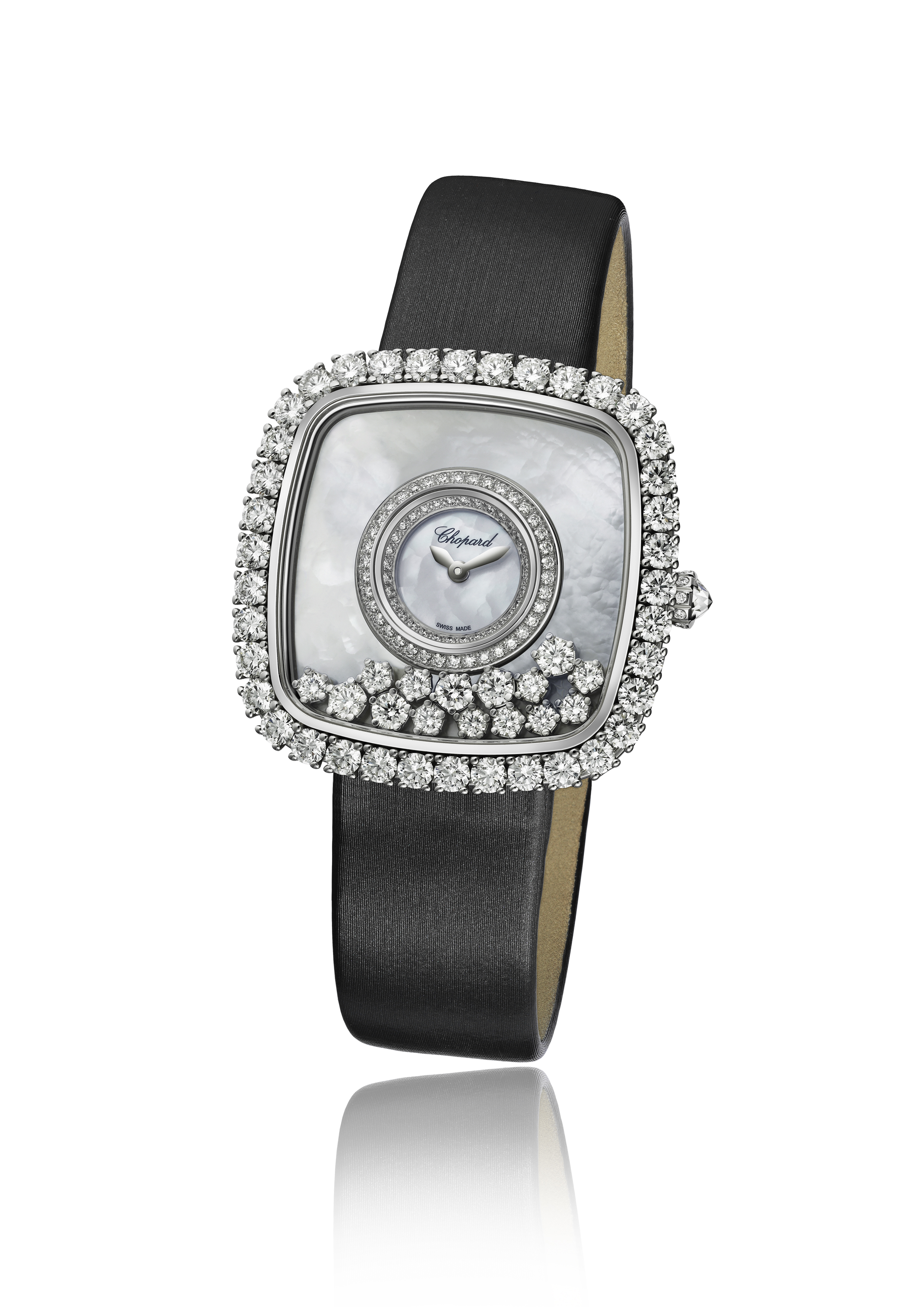 Reprenant la forme coussin initiale mais destinée aux femmes, la montre Happy Diamonds d’aujourd’hui est joaillère et précieuse, vintage et contemporaine. Les diamants sertis sur griffe, qui ornent le tour du cadran, cisèlent ses courbes douces. De nouveaux diamants mobiles dansent librement sur un fond de nacre blanche perlée. Pour la première fois sur une montre Happy Diamonds, ils évoluent en totale liberté autour du cadran. Ils sont plus nombreux, plus grands qu’auparavant et de tailles différentes, accentuant ainsi leur danse tourbillonnante et l’esprit de profusion de diamants. A l’intérieur de cette aire de jeux, un second mini-cadran, lui aussi bordé de diamants, abrite les aiguilles de la montre.