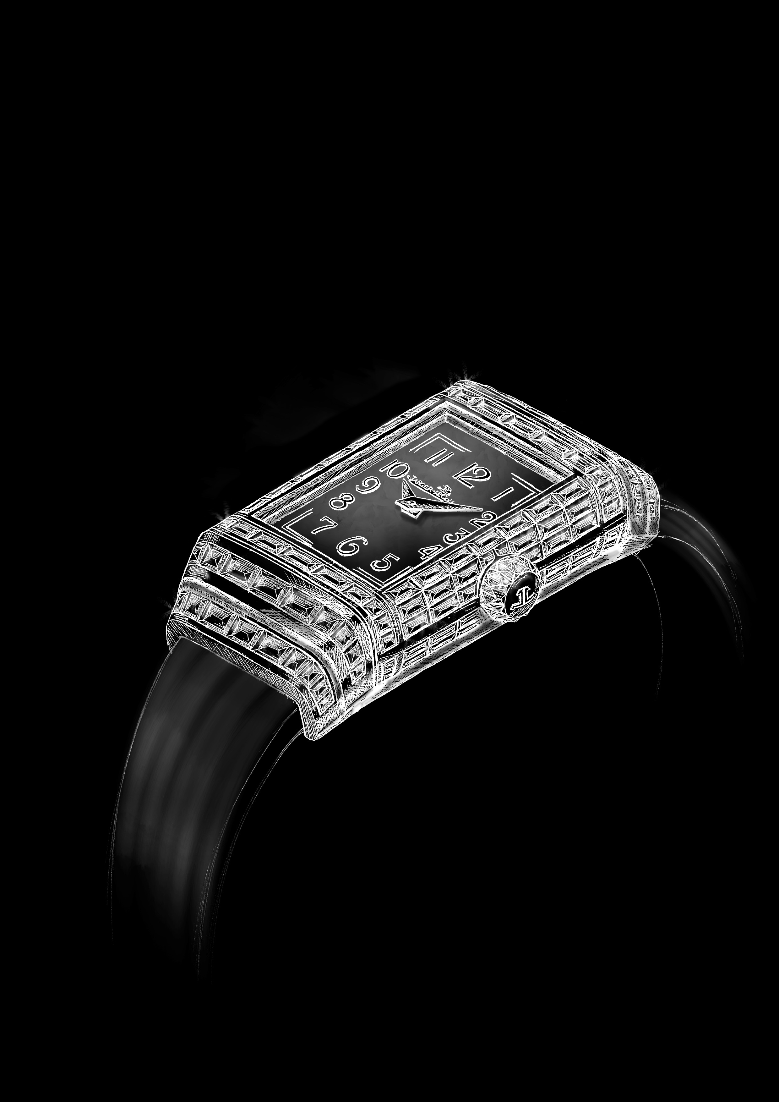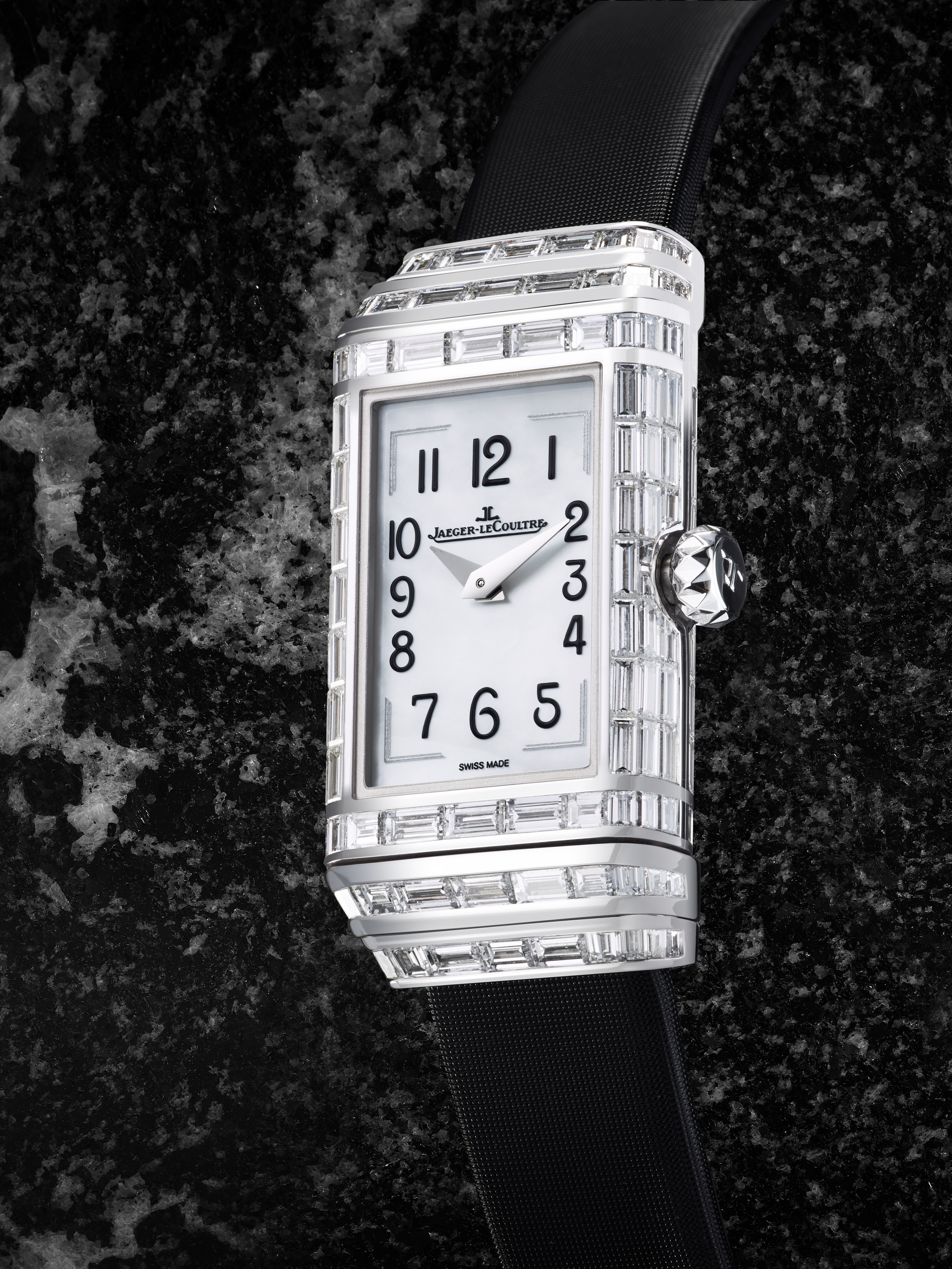 Trésor de féminité dans son sertissage de lumière, la montre Reverso One High Jewelry en or gris s’inspire des premières Reverso pour dames des années 1930 pour offrir aux femmes un véritable bijou au poignet.