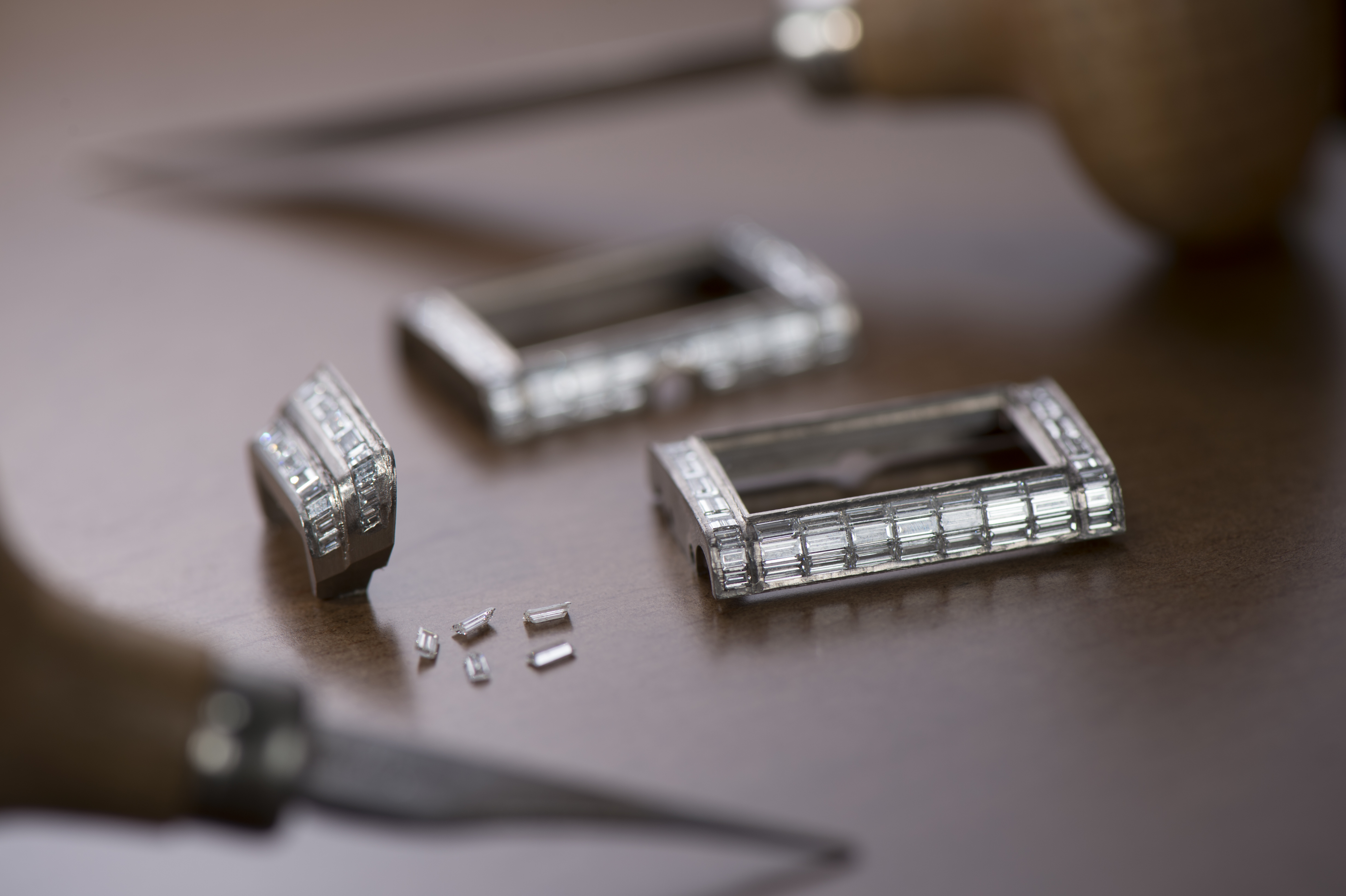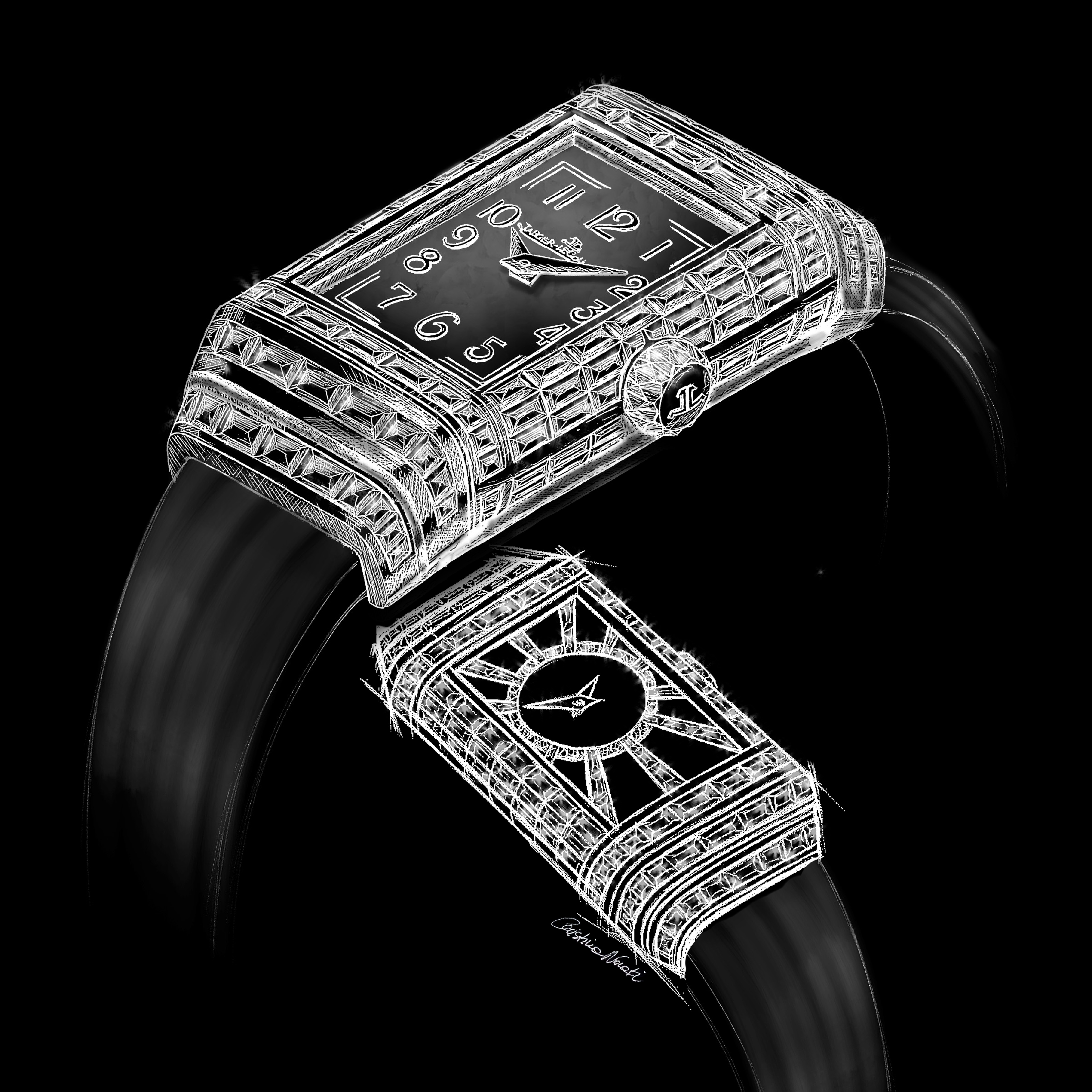 L’artisan joaillier de Jaeger-LeCoultre a utilisé tout son savoir-faire pour sertir les diamants baguette qui ornent cette montre-bijou. Reprenant le motif des godrons emblématiques de la Reverso, trois rangs de diamants encadrent son visage. Le brancard de la montre est travaillé de deux finitions différentes comme des rayons de lumière accompagnant le renversement du boîtier.