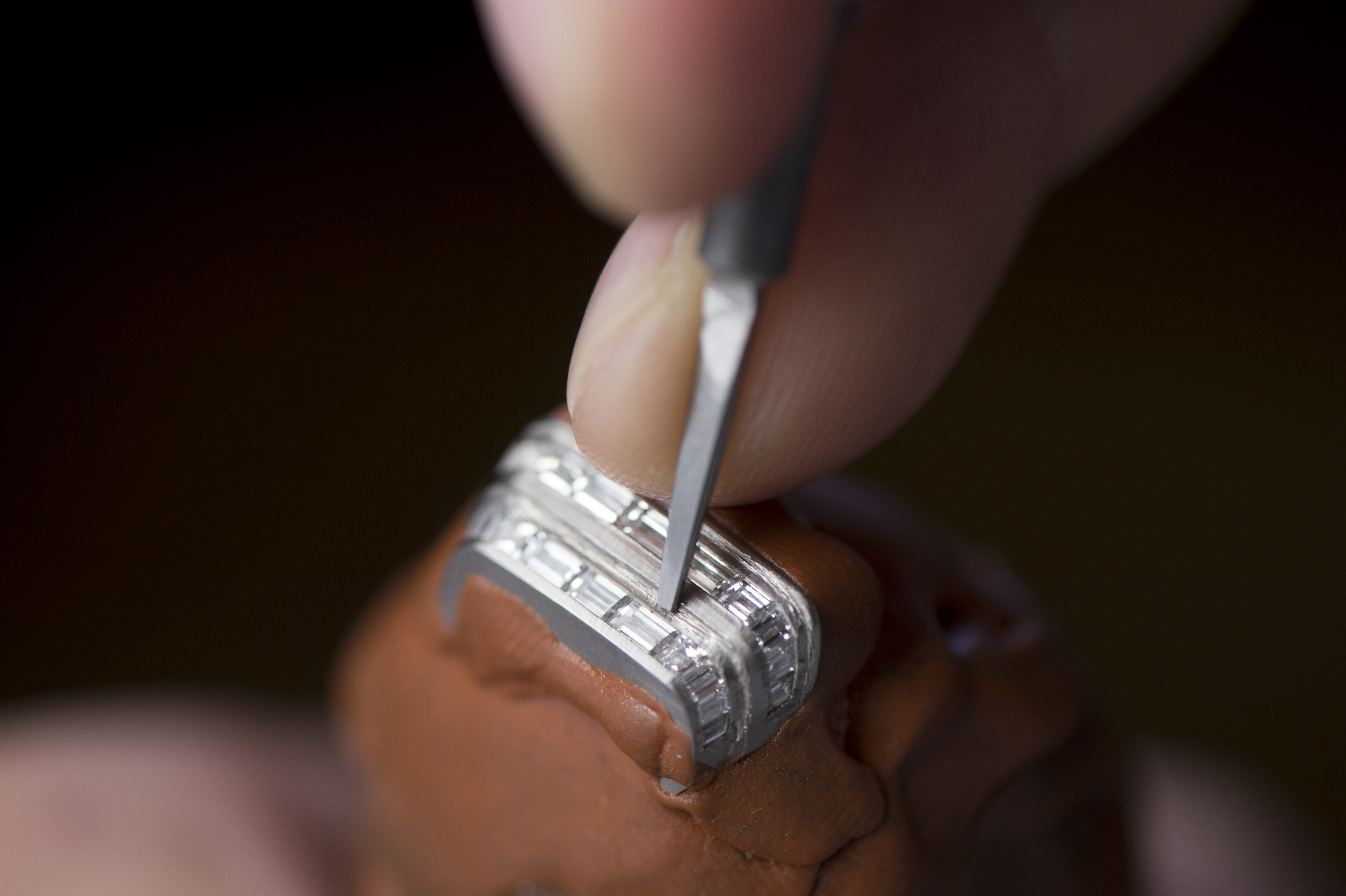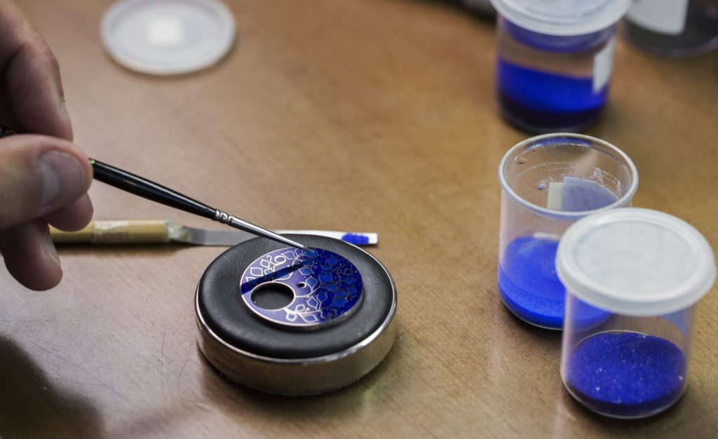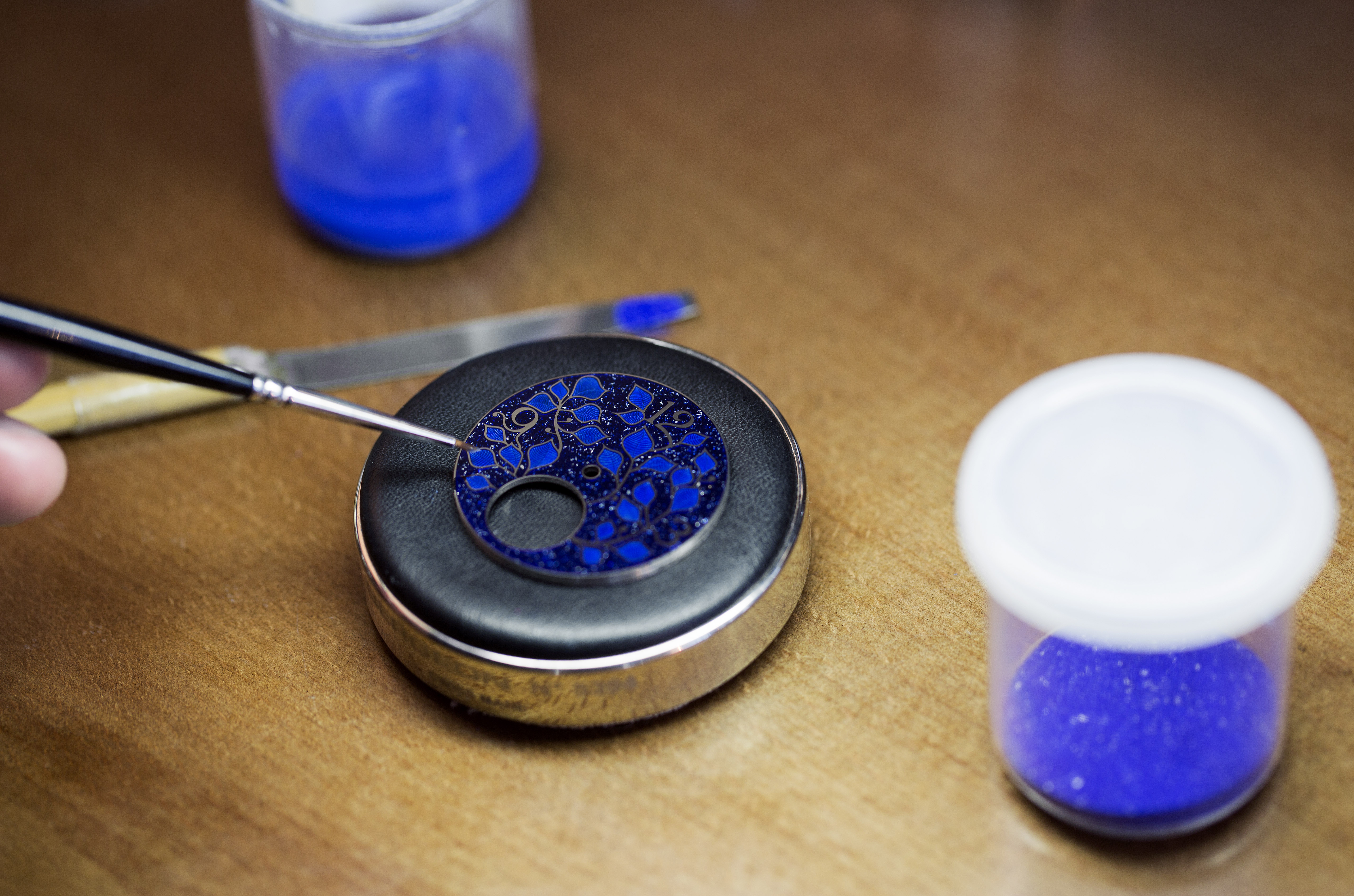 Comme une nuit d’un ciel d’été, le cadran émaillé Grand Feu et paillonné dévoile des milliers d’étoiles. L’artisan émailleur a saupoudré des micro-copeaux d’argent sur l’ensemble de la surface pour créer cette impression céleste. Peintes à la main, les feuilles de lierre semblent envahir le ciel, tel le symbole d’un amour éternel.
