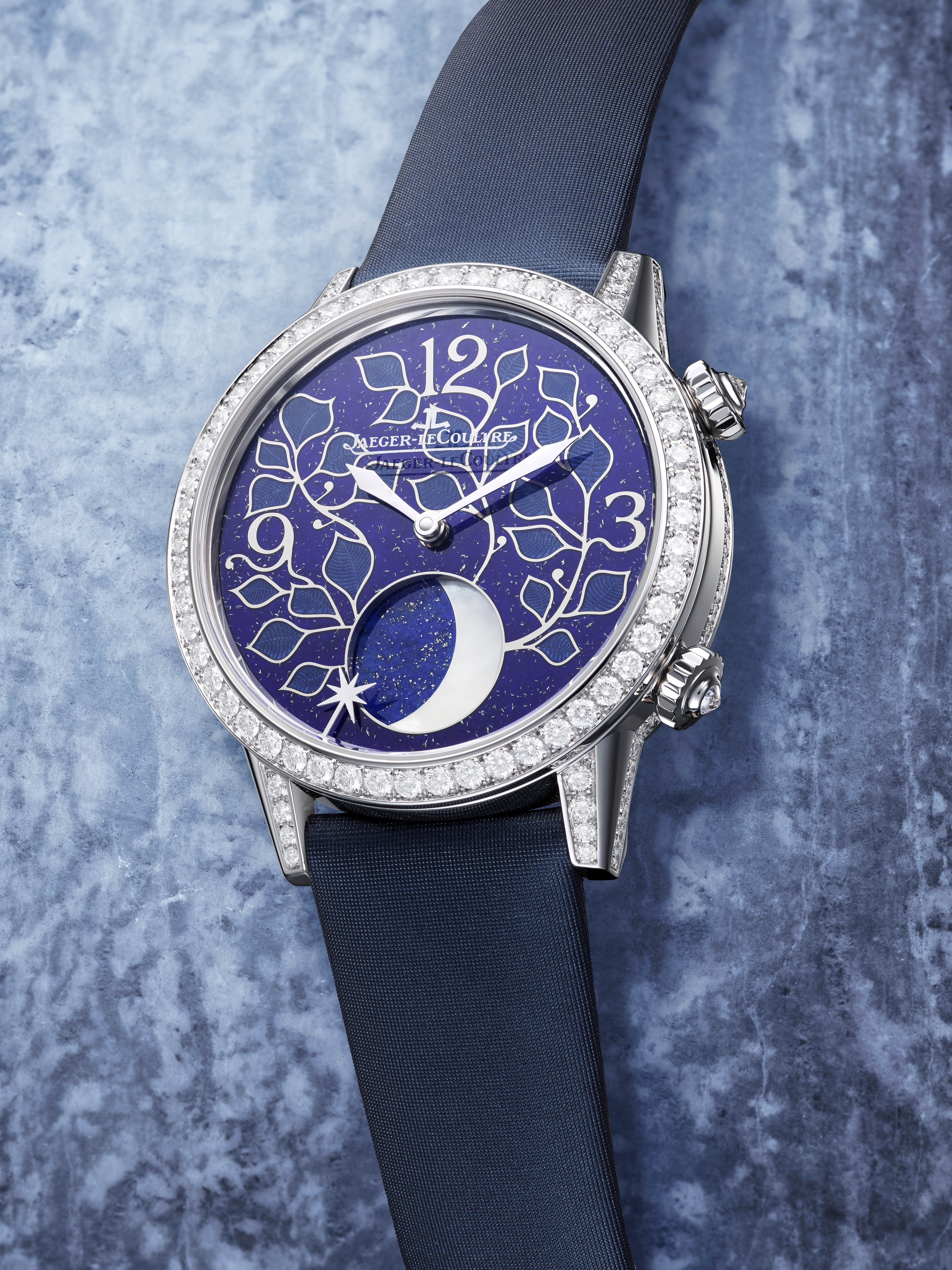 Quand la beauté végétale se marie à la profondeur céleste… La montre Rendez-Vous Moon en or gris mêle le savoir-faire joaillier et horloger des artisans de Jaeger-LeCoultre pour offrir aux femmes un bijou comme descendu du ciel.