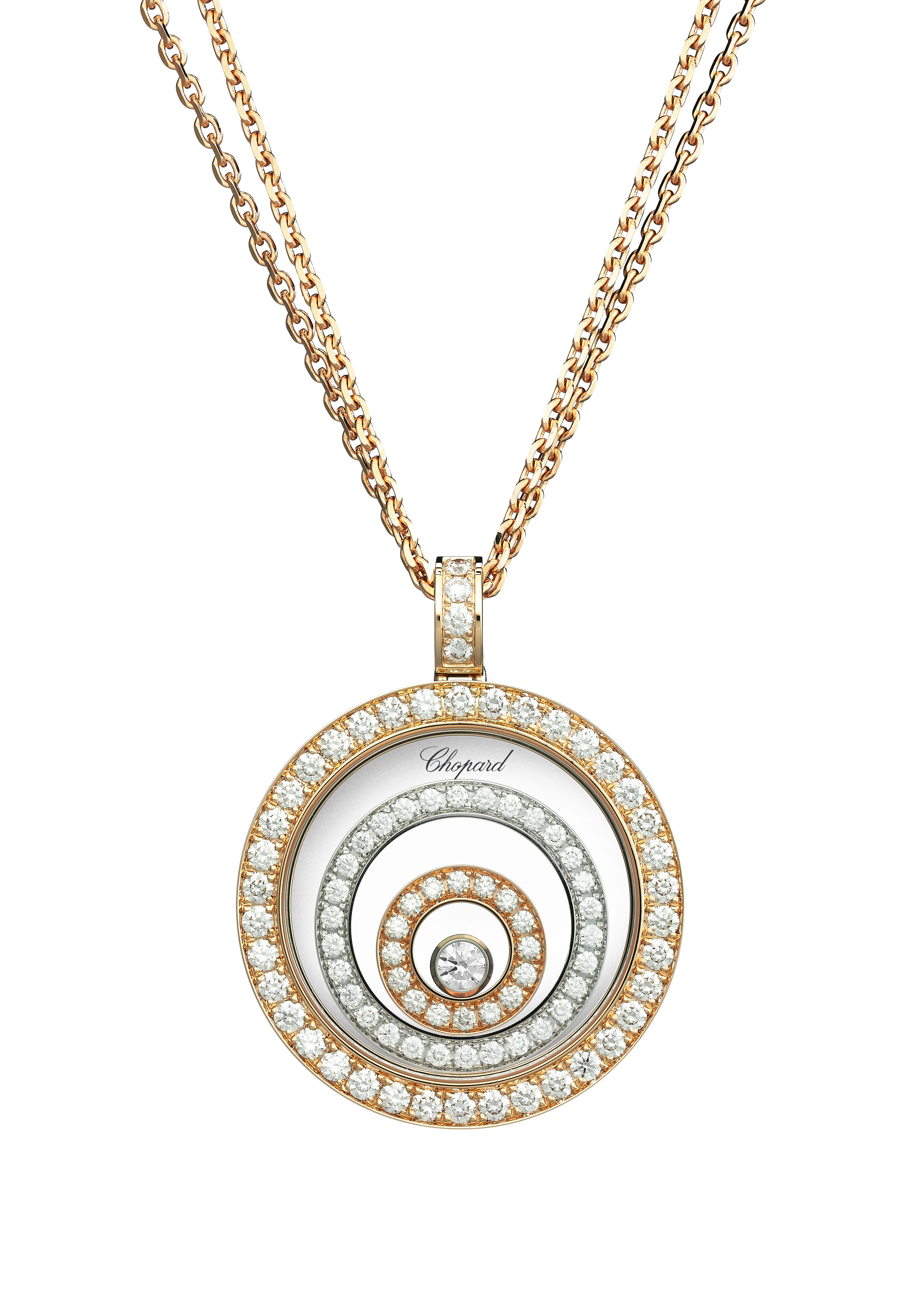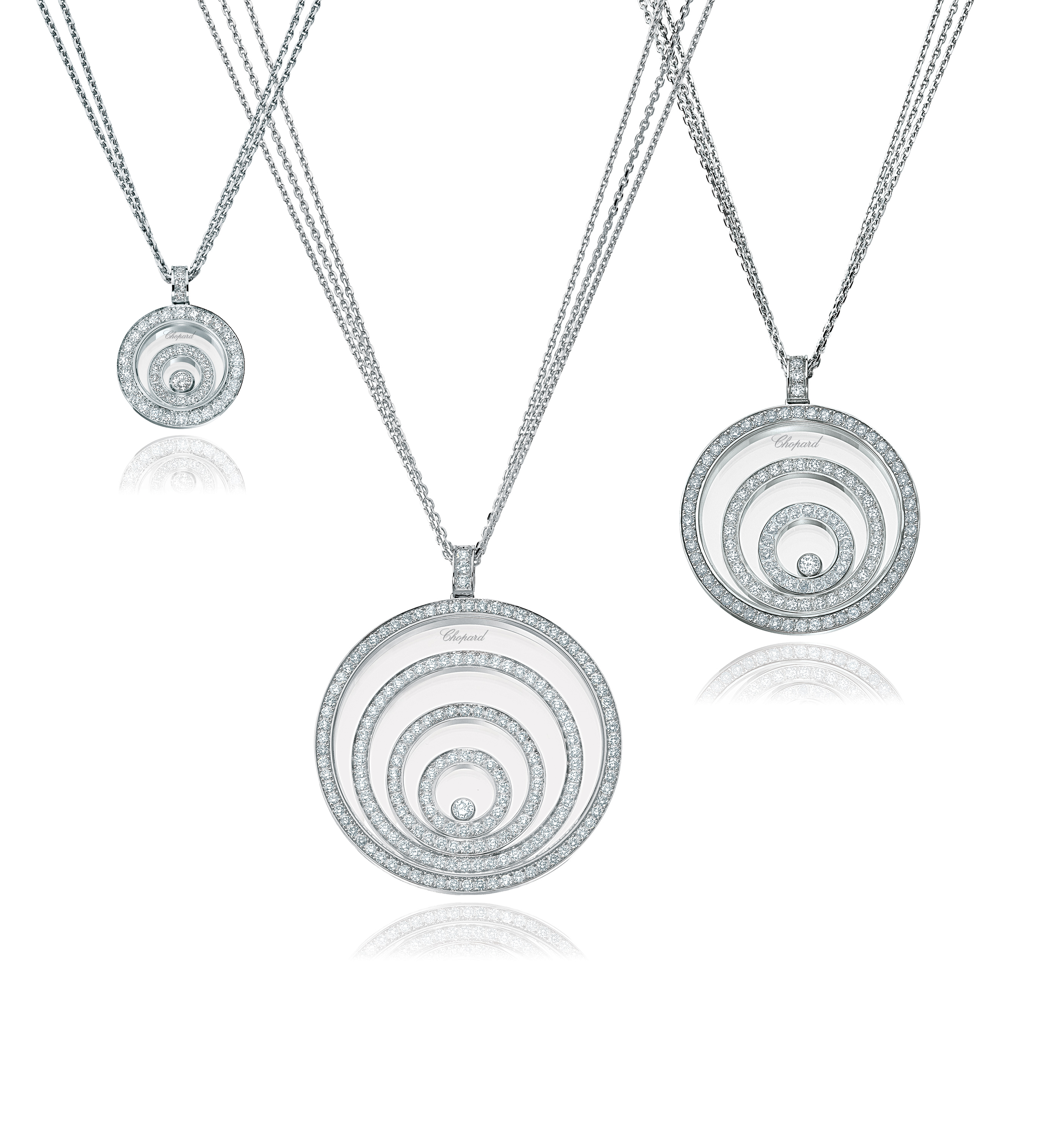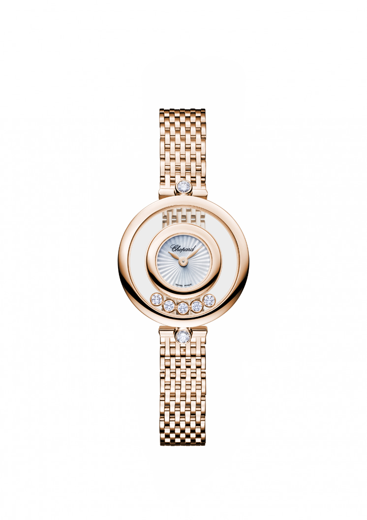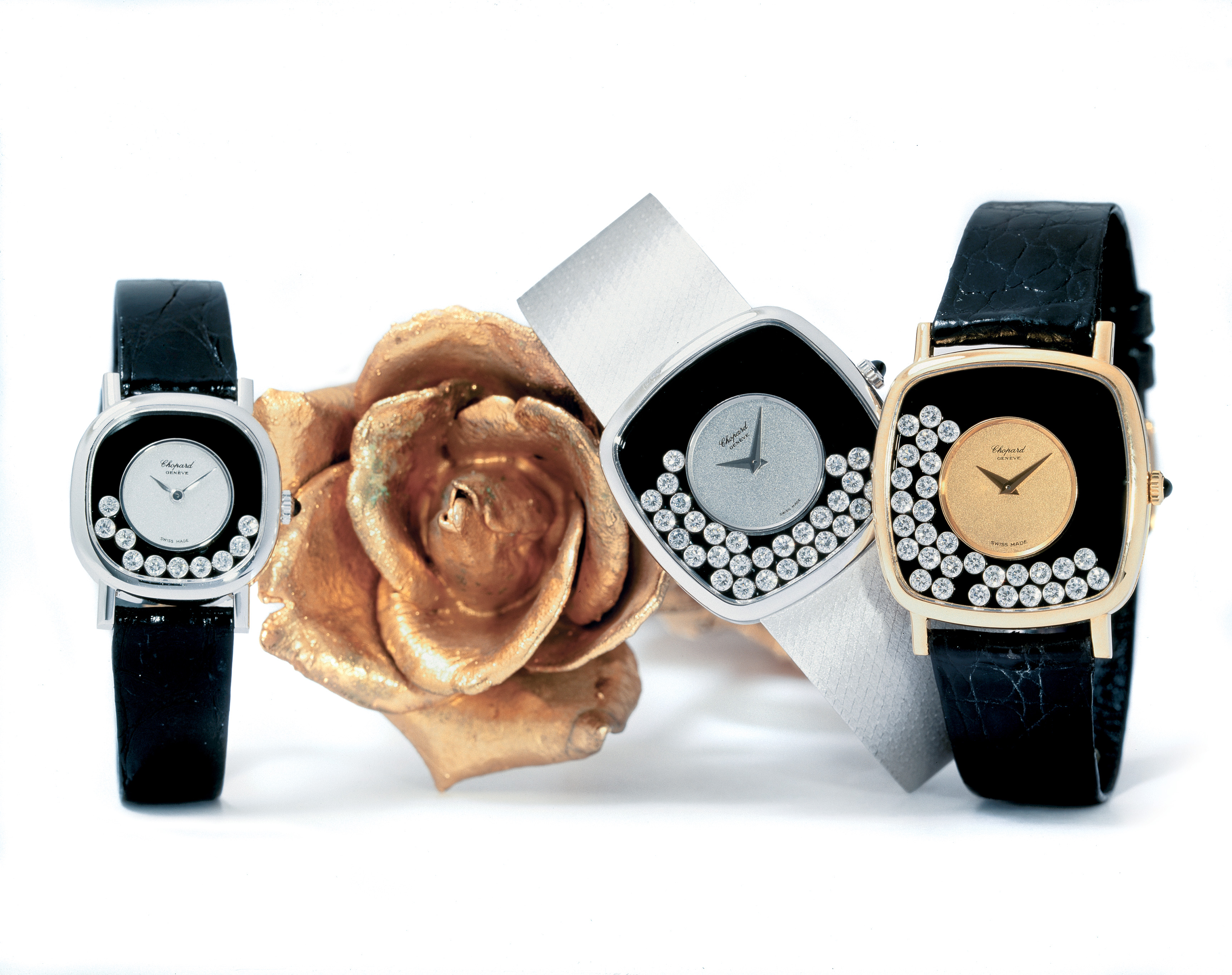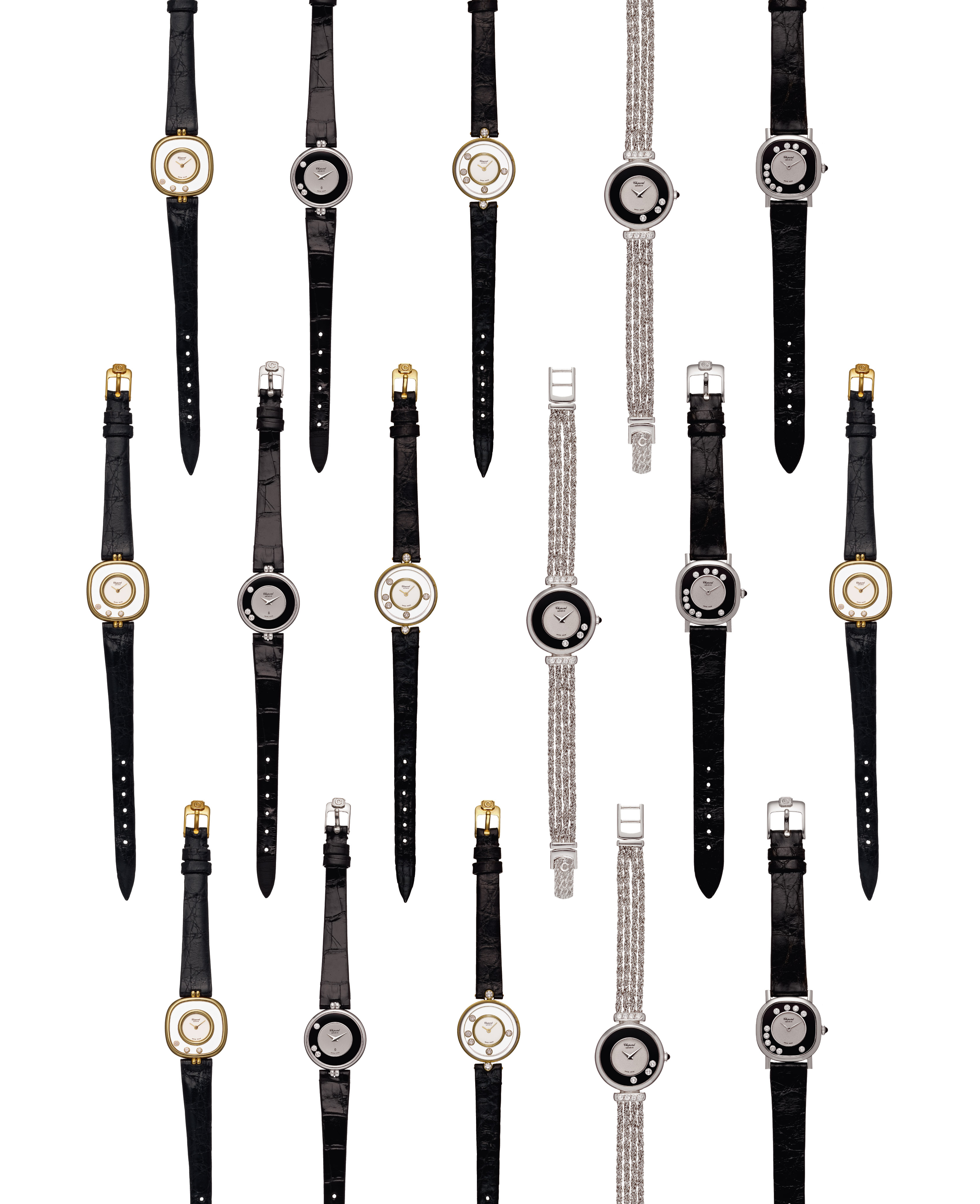 Les Happy Diamonds sont nés de la rencontre de l’eau et de la lumière. En 1976, Ronald Kurowski, alors designer chez Chopard, est fasciné par le jeu des rayons du soleil sur une cascade lors d’une promenade en Forêt-Noire. Au travers de ses dessins, il cherche à reproduire la magie de ces milliers de gouttelettes d’eau réfléchissant la lumière du jour et scintillant de toutes les nuances de l’arc-en-ciel. Son idée de génie : laisser les diamants évoluer en liberté entre deux glaces saphir et leur rendre ainsi toute leur éclatante beauté. Chaque pierre est donc logée dans une capsule d’or dont le fond est taillé en biseau, afin que les diamants soient parfaitement libres de leur trajectoire tout en tournoyant sur eux-mêmes. « Ces diamants sont plus heureux en liberté » s’exclame Karin Scheufele lorsqu’elle voit le premier modèle de montre Happy Diamonds terminé, nommant ainsi la collection. Pour couronner le succès de cette innovation, la montre remporte, en 1976, le prestigieux prix de la Rose d’Or de Baden Baden.