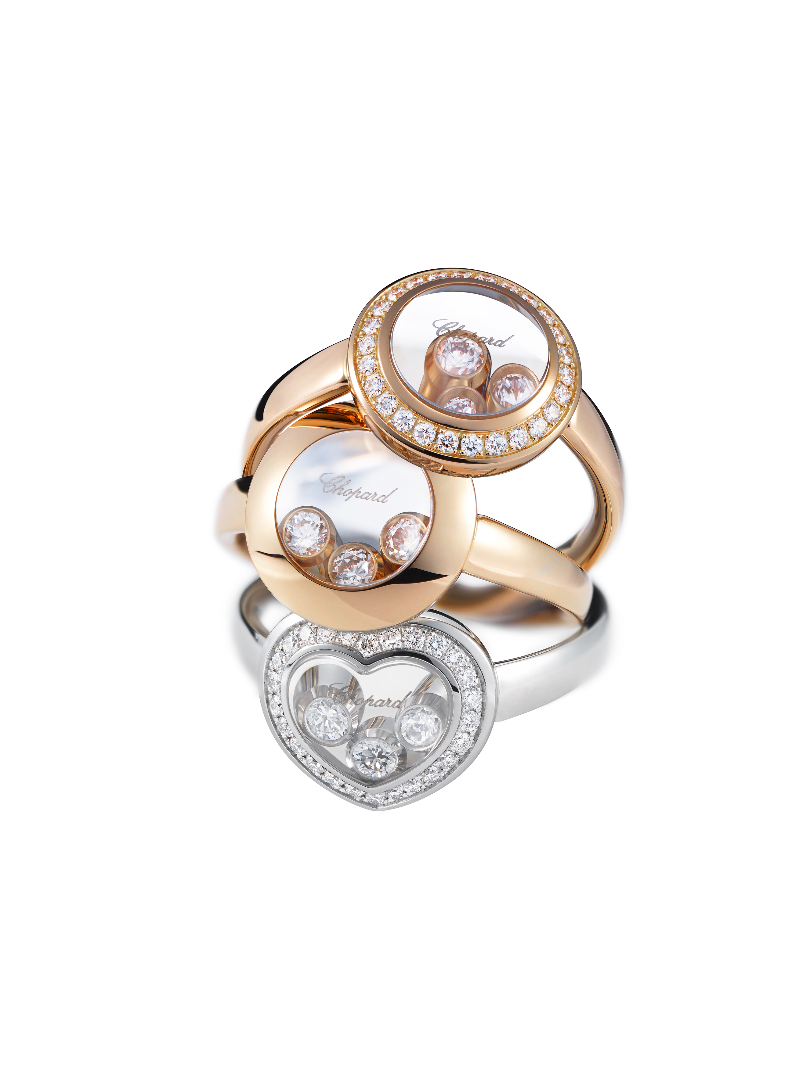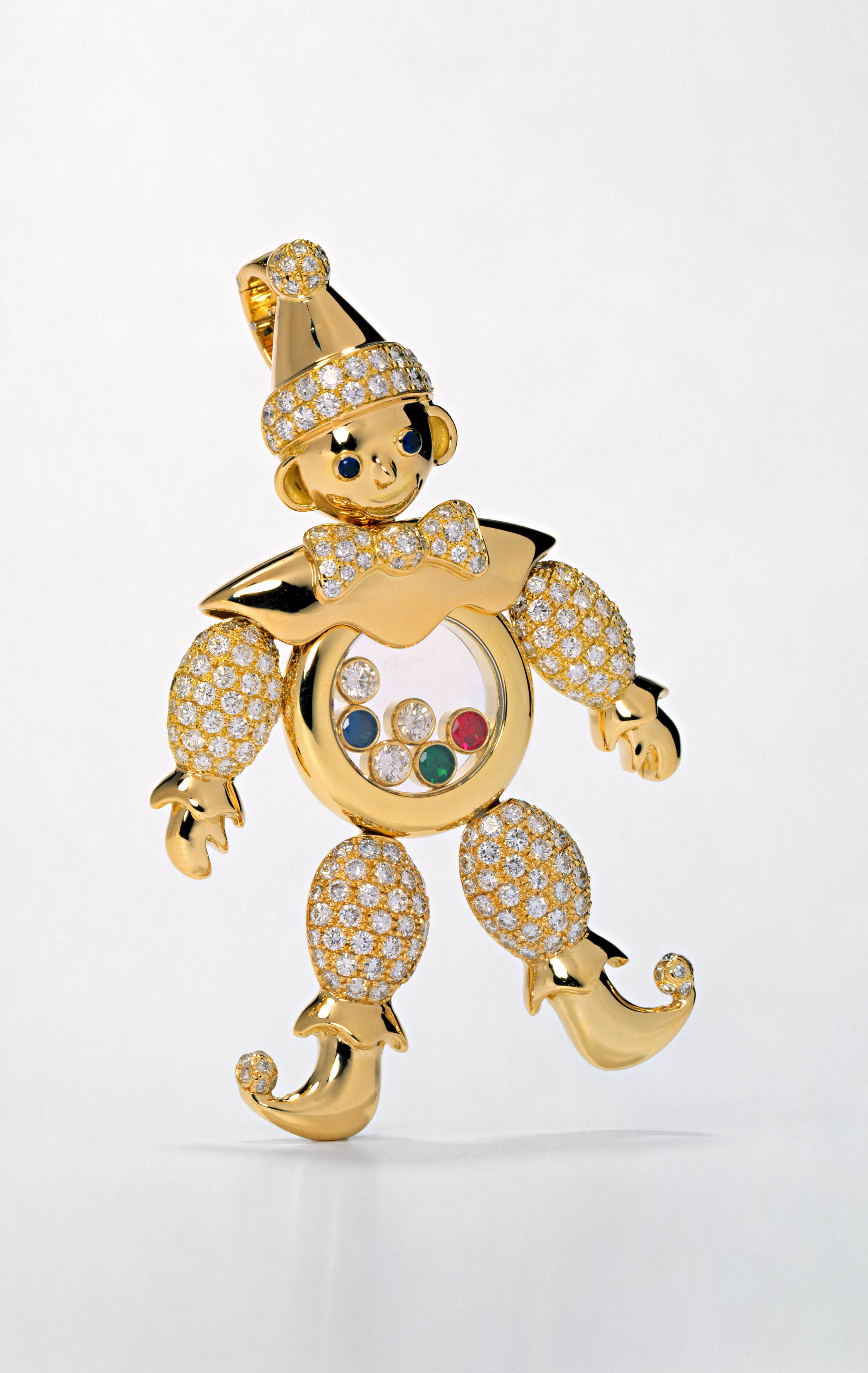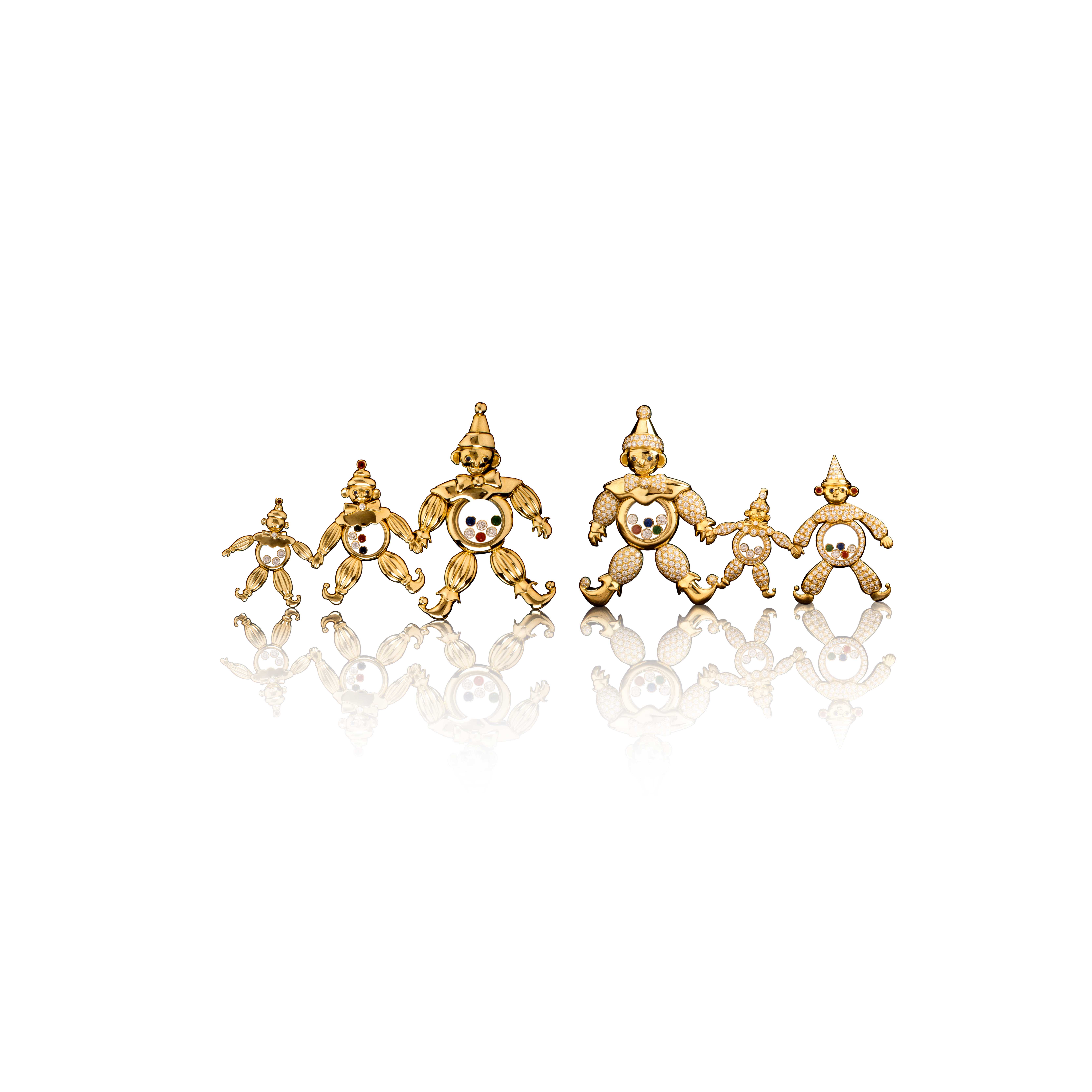 Si les Happy Diamonds font d’abord les beaux jours de l’horlogerie – la toute première pièce réalisée est une montre pour homme – ils offrent très vite un formidable essor à la joaillerie. Tout est né d’un trait d’audace, magnifique, de Caroline Scheufele. Passionnée de cirque, elle laisse vagabonder son imagination et dessine un clown précieux au ventre garni de diamants et de pierres de couleurs mobiles. Le succès de ce bijou, d’abord réalisé en pièce unique pour son utilisation personnelle, lance la ligne de bijoux Happy Diamonds et initie également la joaillerie chez Chopard en 1985. Après le clown suivent d’autres pièces comme l’éléphant, la coccinelle, le teddy bear et bien sûr le cœur, si cher à la Maison.
