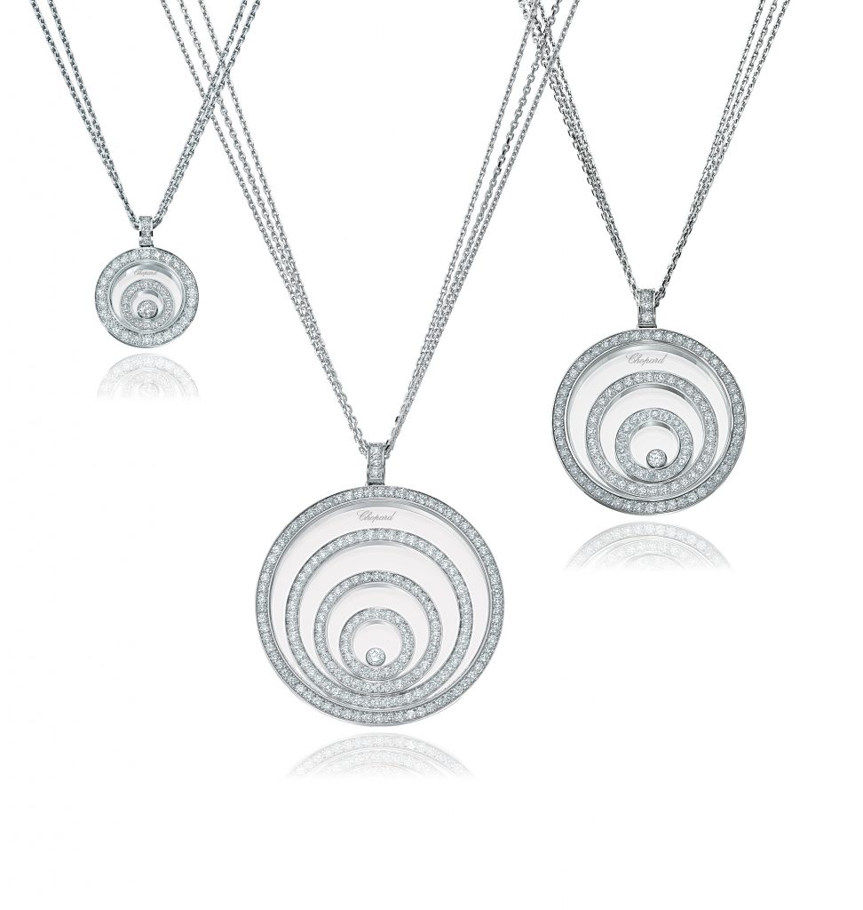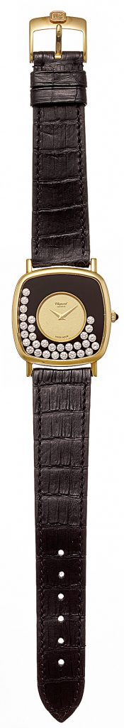 Les Happy Diamonds sont nés de la rencontre de l’eau et de la lumière. En 1976, Ronald Kurowski, alors designer chez Chopard, est fasciné par le jeu des rayons du soleil sur une cascade lors d’une promenade en Forêt-Noire. Au travers de ses dessins, il cherche à reproduire la magie de ces milliers de gouttelettes d’eau réfléchissant la lumière du jour et scintillant de toutes les nuances de l’arc-en-ciel. Son idée de génie : laisser les diamants évoluer en liberté entre deux glaces saphir et leur rendre ainsi toute leur éclatante beauté. Chaque pierre est donc logée dans une capsule d’or dont le fond est taillé en biseau, afin que les diamants soient parfaitement libres de leur trajectoire tout en tournoyant sur eux-mêmes. « Ces diamants sont plus heureux en liberté » s’exclame Karin Scheufele lorsqu’elle voit le premier modèle de montre Happy Diamonds terminé, nommant ainsi la collection. Pour couronner le succès de cette innovation, la montre remporte, en 1976, le prestigieux prix de la Rose d’Or de Baden Baden.