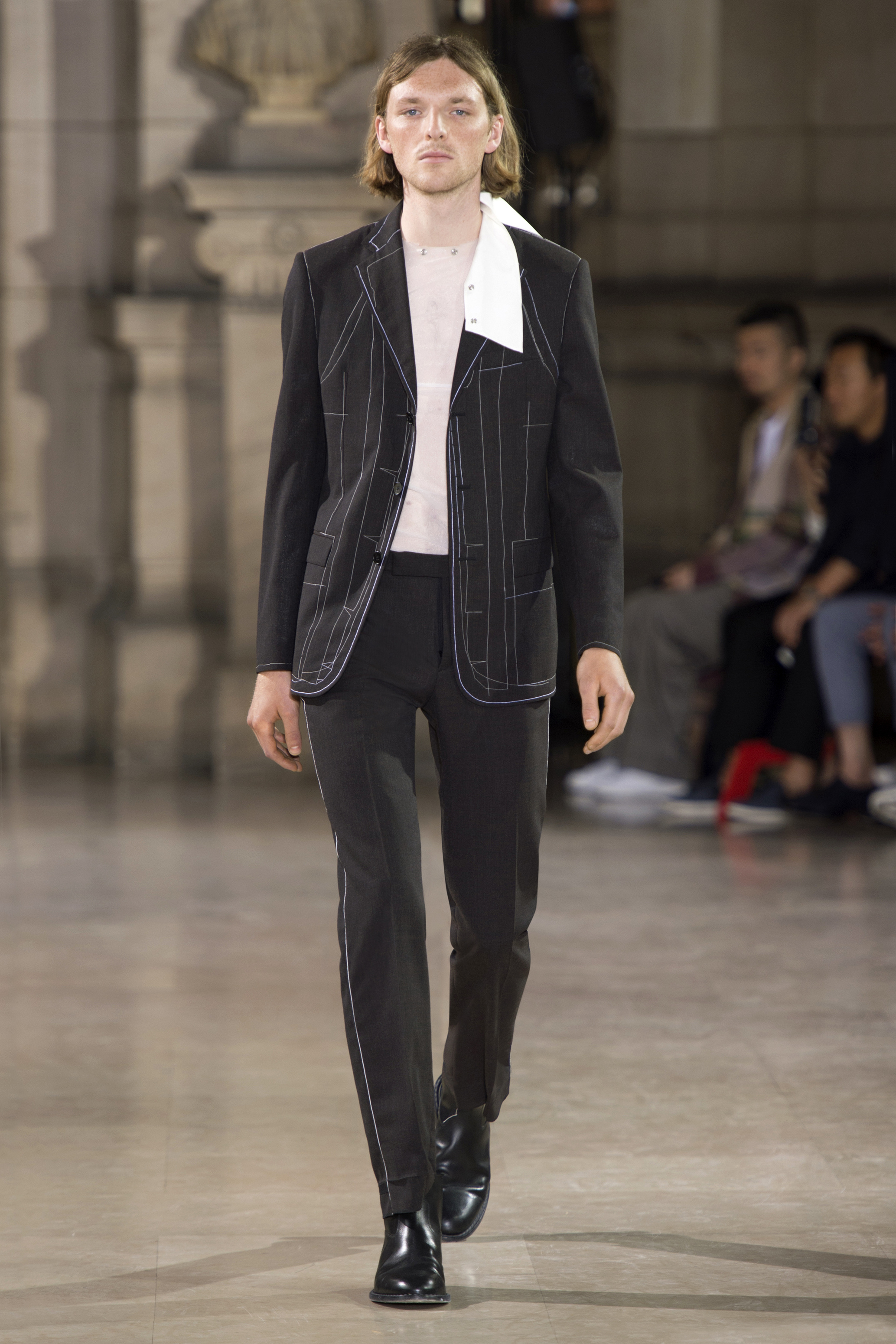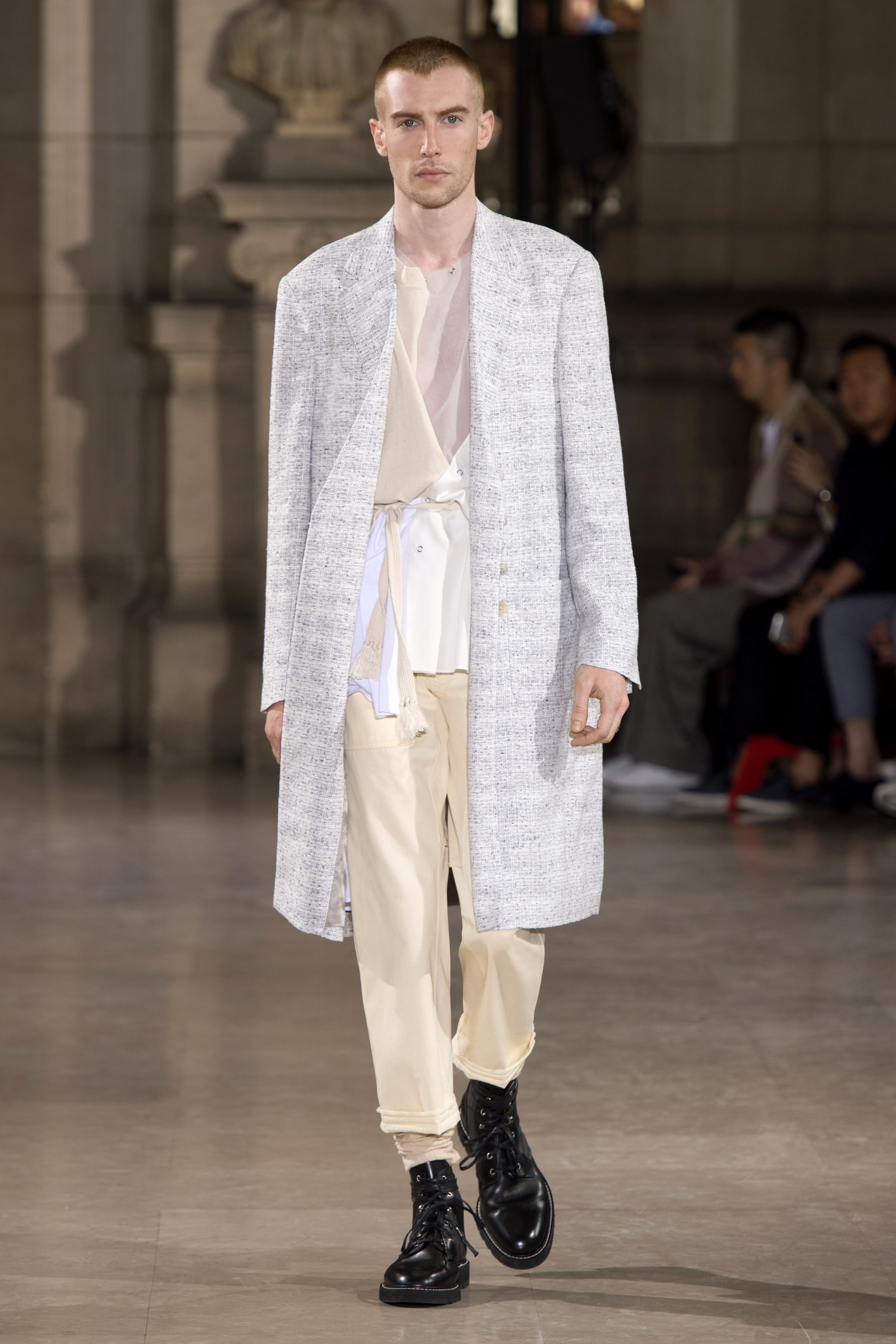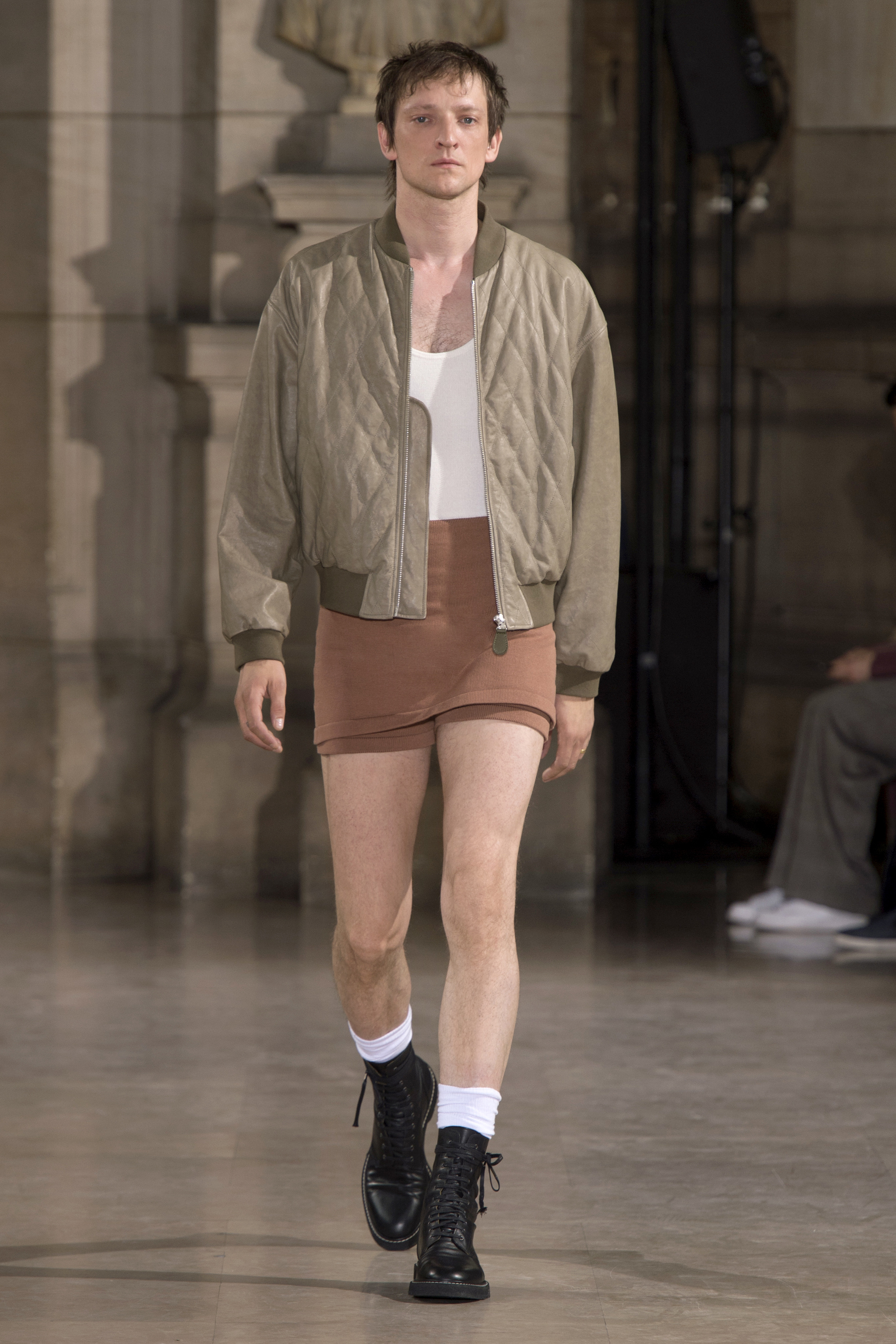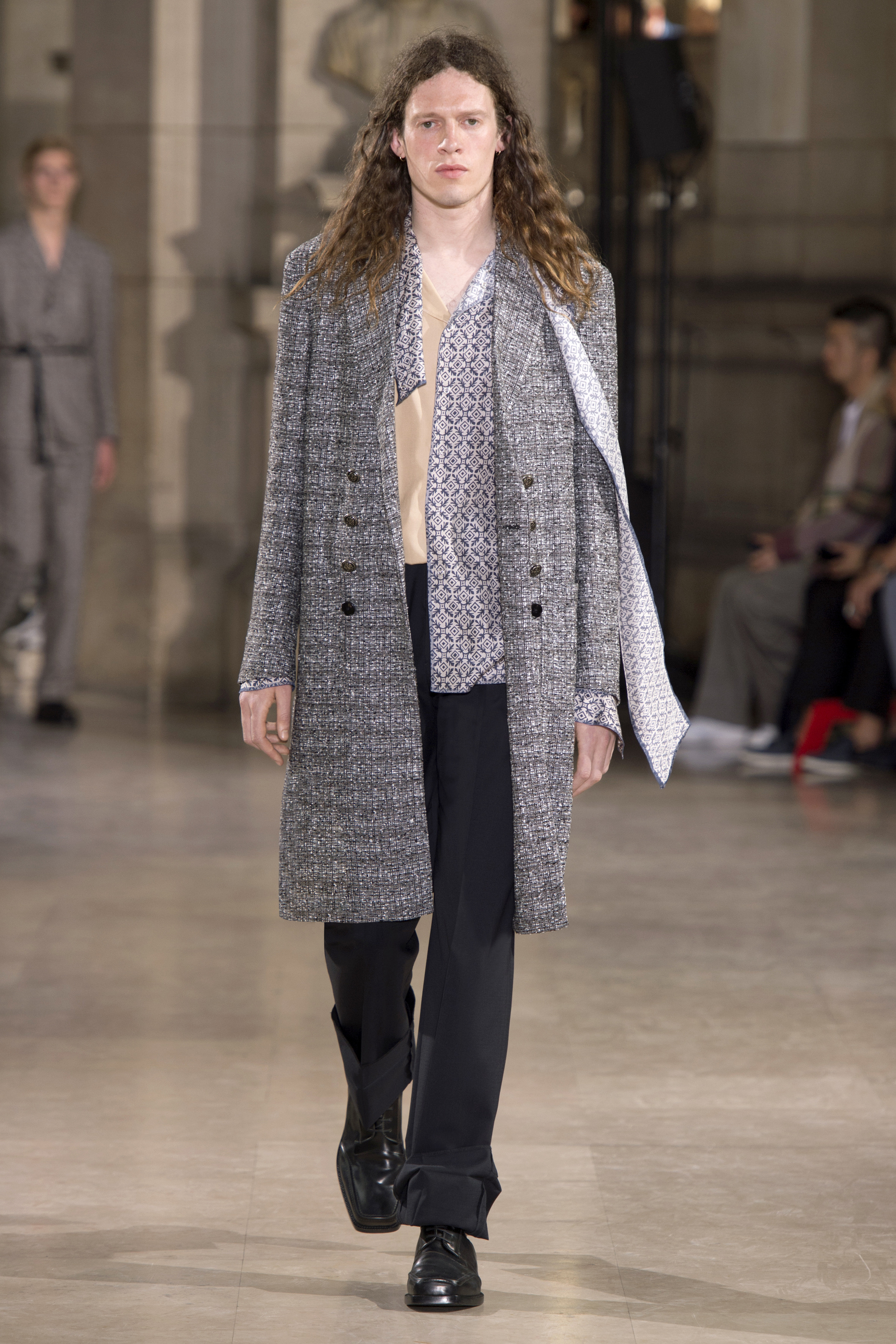 Dans un monde post-moderne, la fragilité masculine ne doit pas se cacher derrière des portes closes. La Maison Margiela s’interroge sur les codes qui définissent le rôle de l’homme dans la société d’aujourd’hui – son uniforme, son armure, les fondements de sa garde-robe vestimentaire.