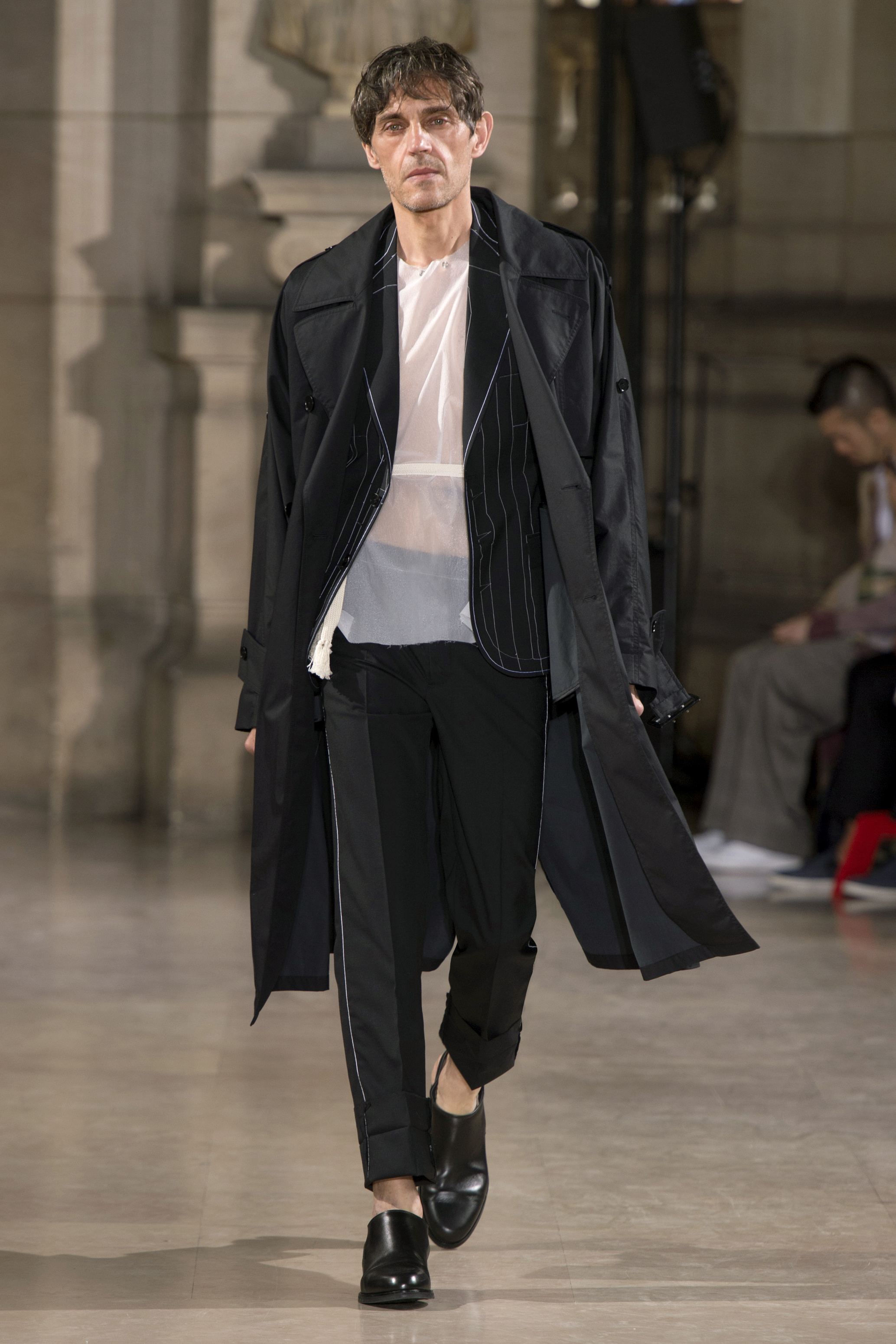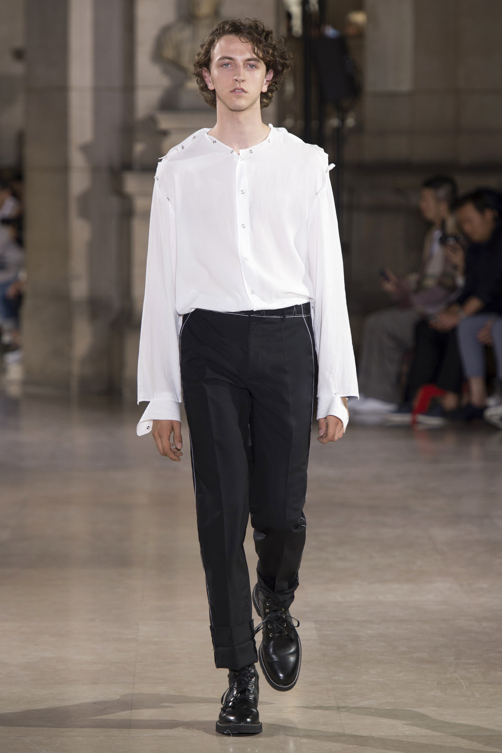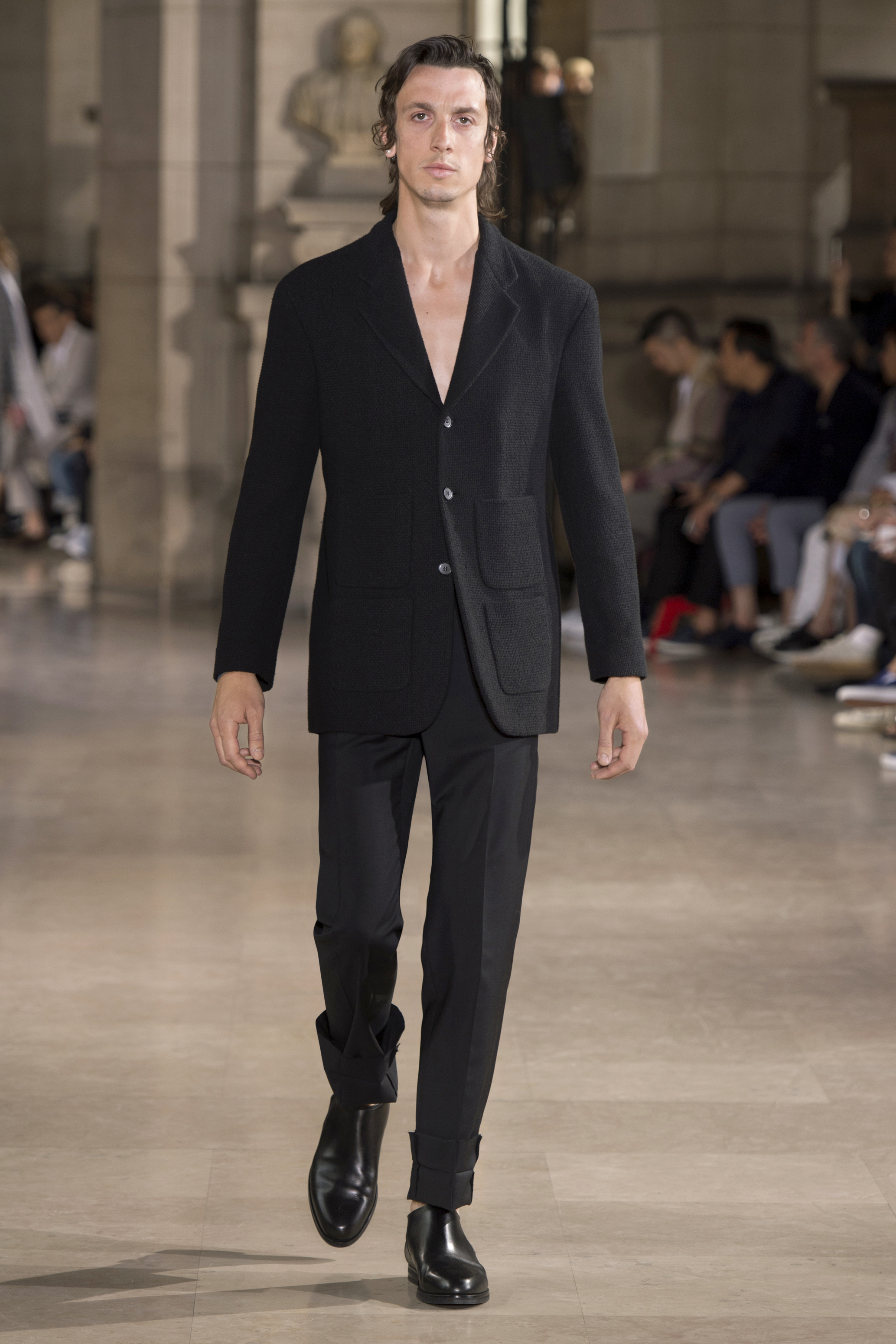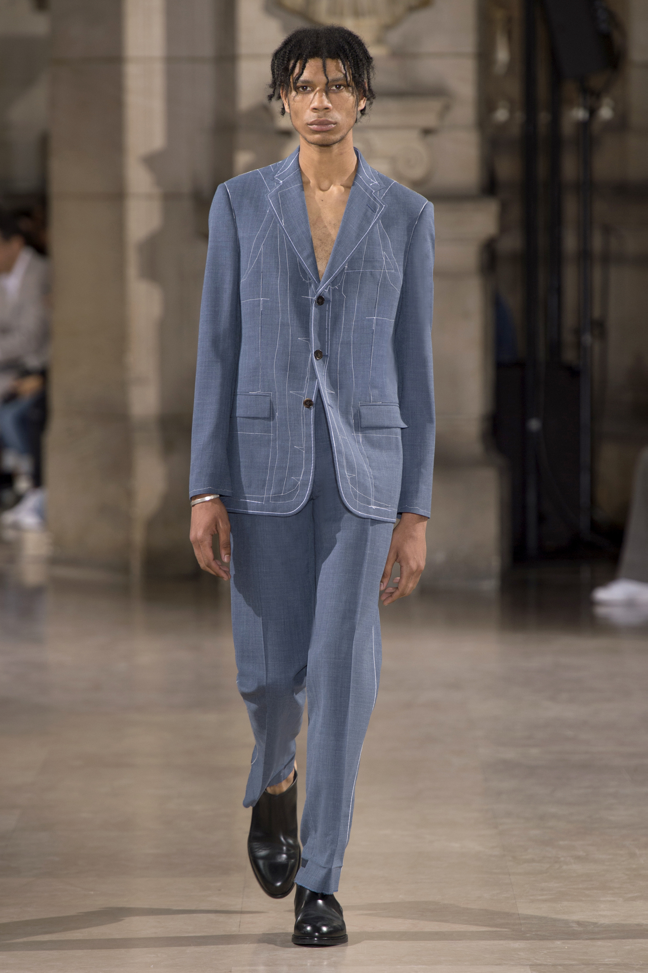 Dans un monde post-moderne, la fragilité masculine ne doit pas se cacher derrière des portes closes. La Maison Margiela s’interroge sur les codes qui définissent le rôle de l’homme dans la société d’aujourd’hui – son uniforme, son armure, les fondements de sa garde-robe vestimentaire.