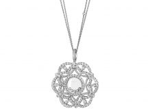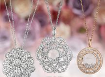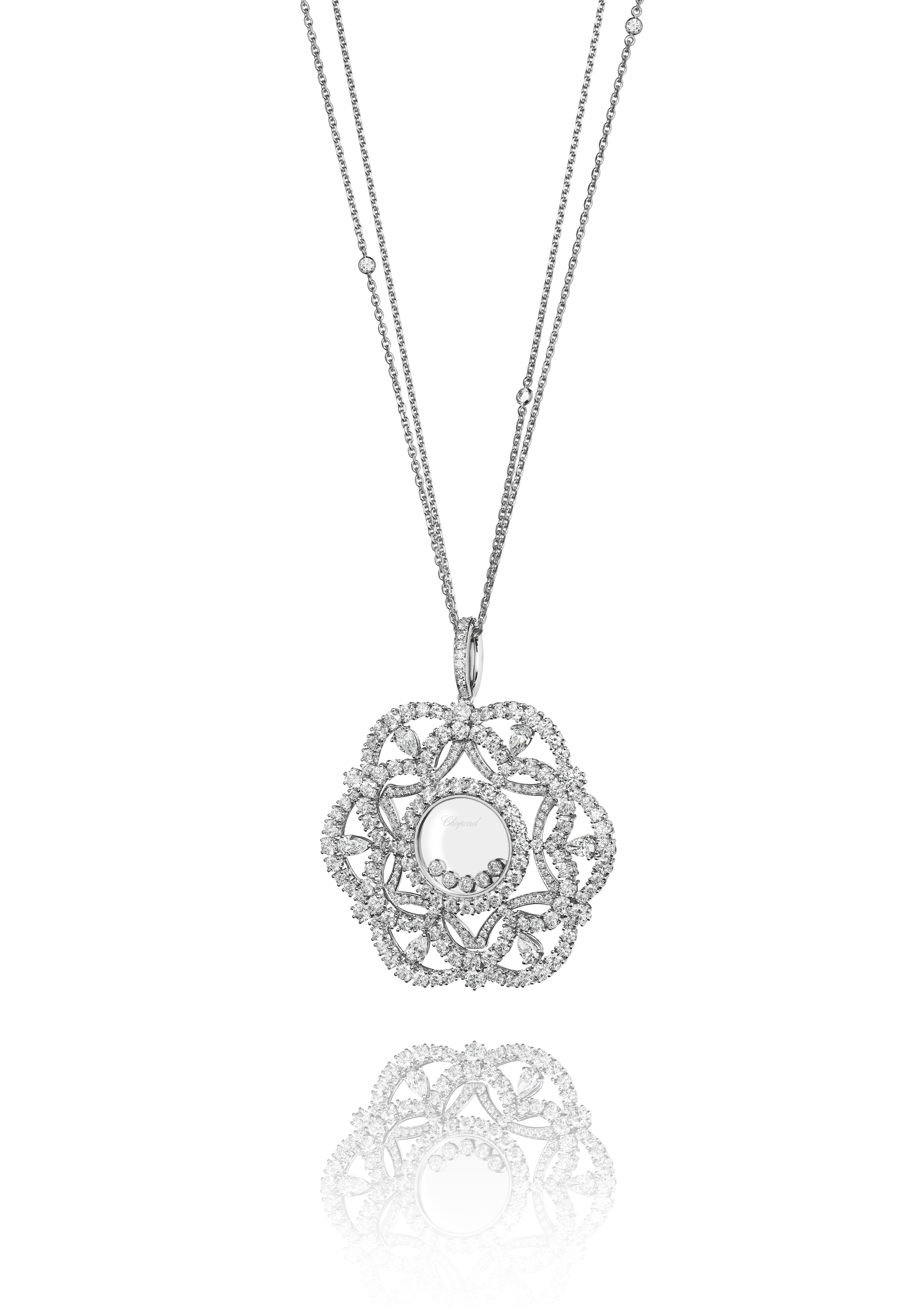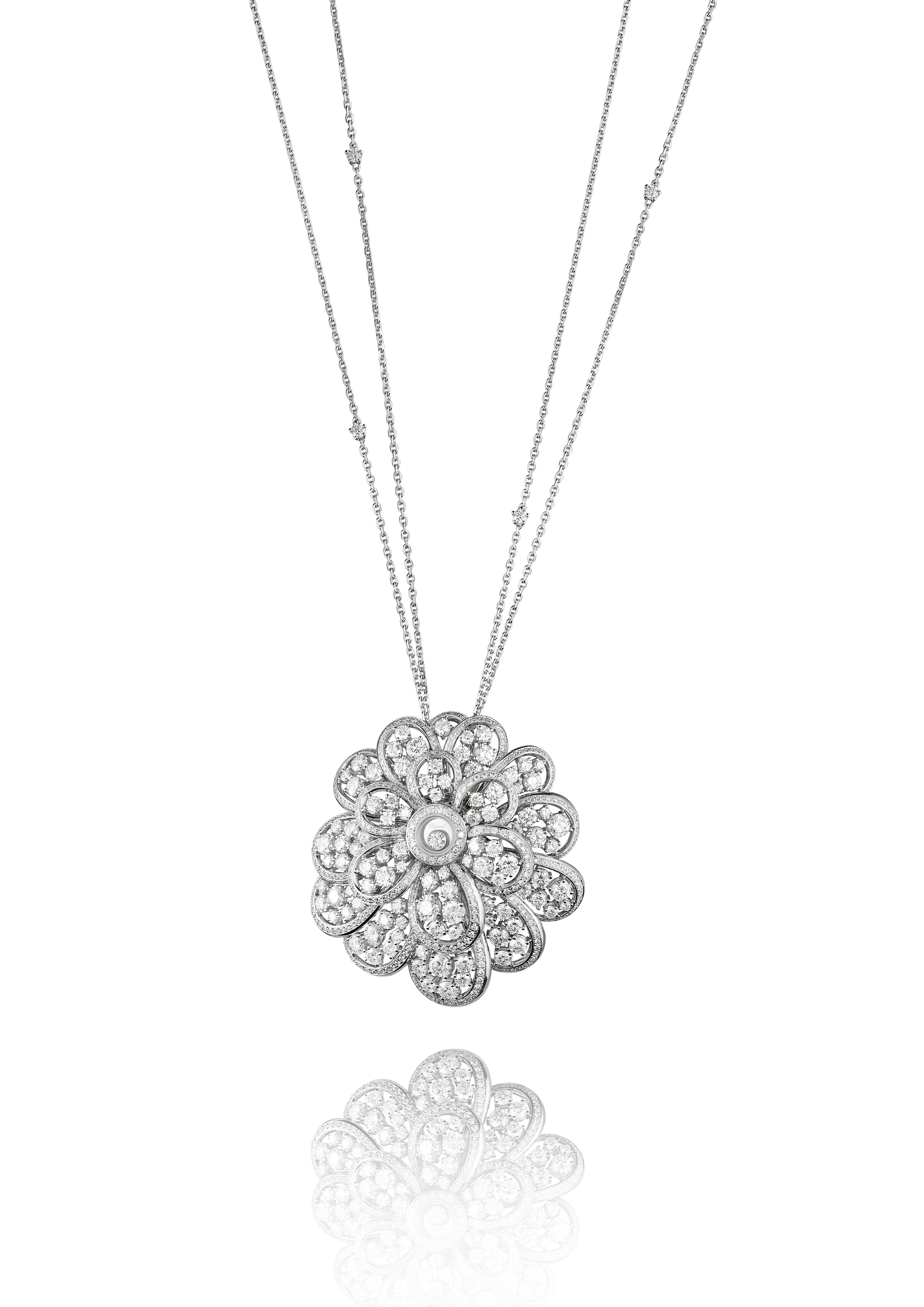 Tel un astre en or rose dardant d’éblouissants rayons sur tout ce qui l’entoure, ce précieux médaillon composé de diamants navettes abrite en son sein des brillants mobiles montés sur griffes. Un détail original que l’on retrouve sur les diamants jalonnant la fine chaine qui le retient. Telle une rosace aux pétales multiples et scintillants, cet autre pendentif en or gris vient illuminer une soyeuse laine cachemire. Quant à cette dentelle de diamants tout en courbes et arabesques, elle s’épanouit au bout d’une chaine à double rang tandis que cinq brillants captifs font joyeusement palpiter son cœur.