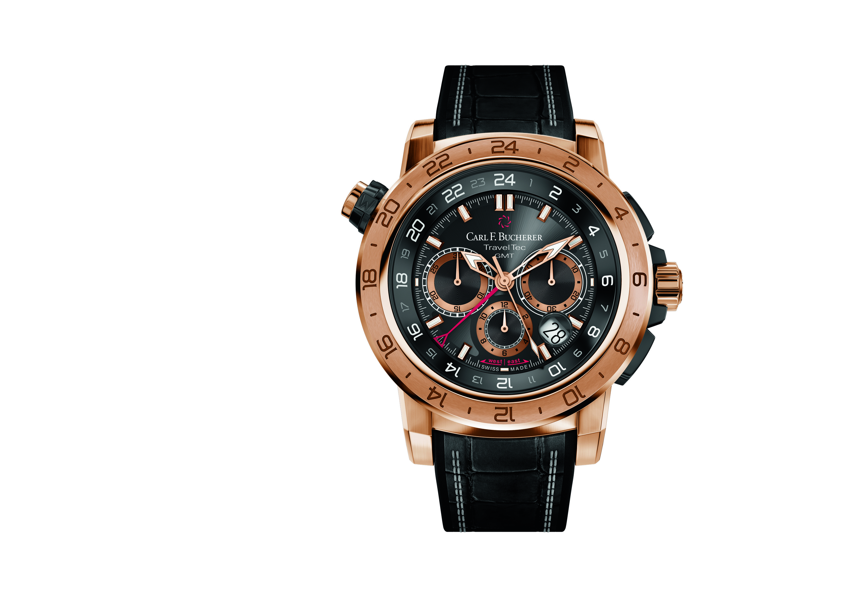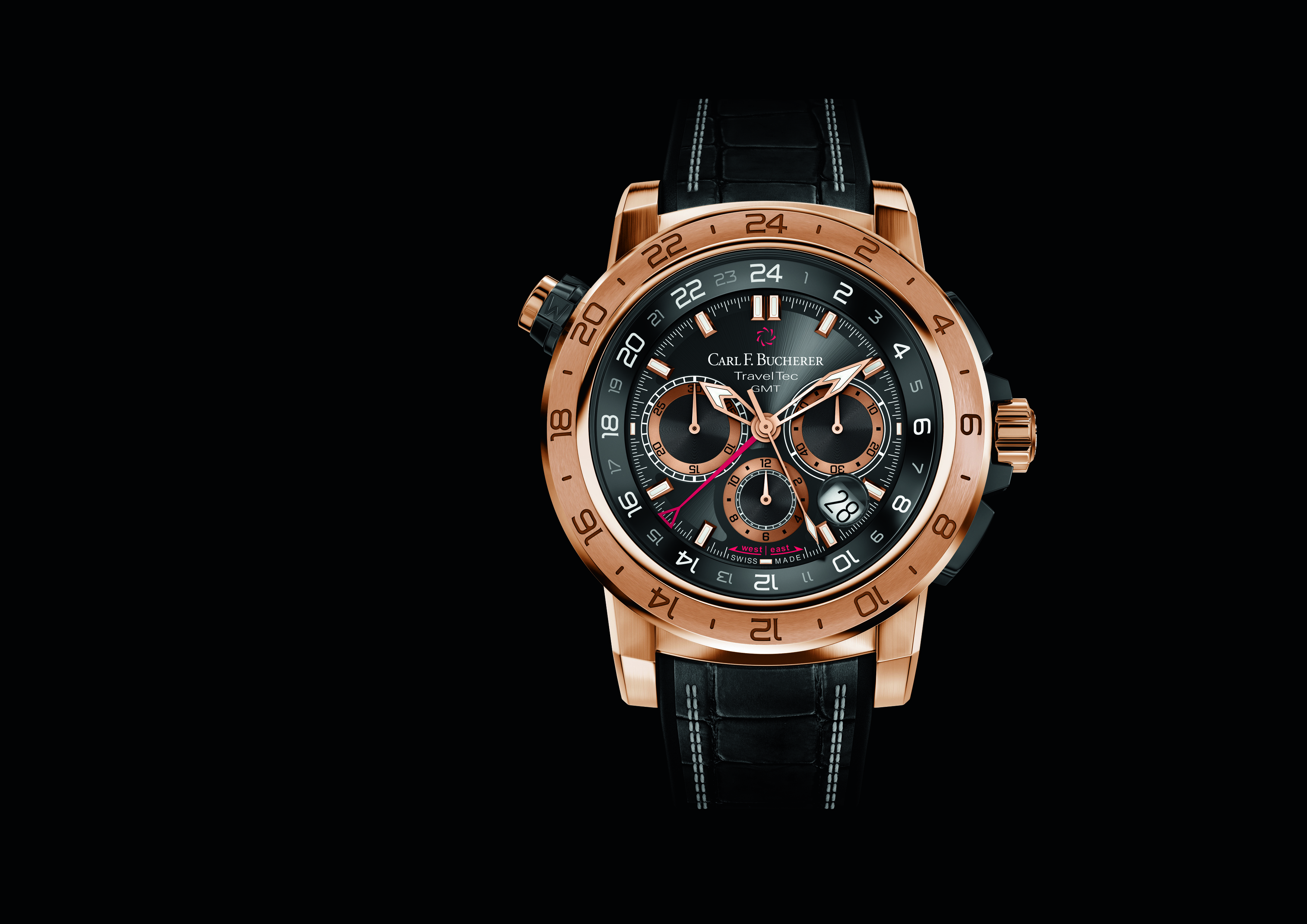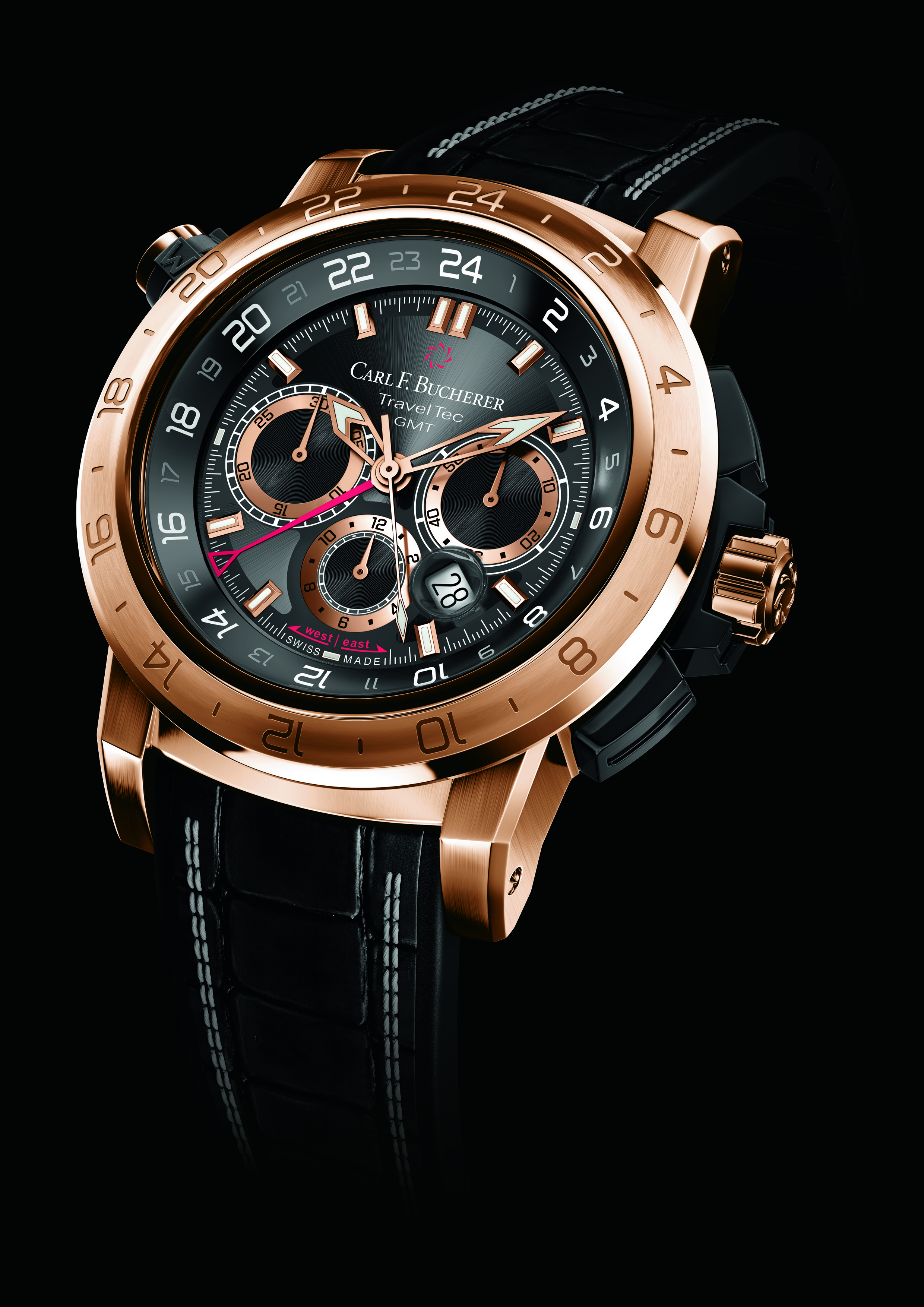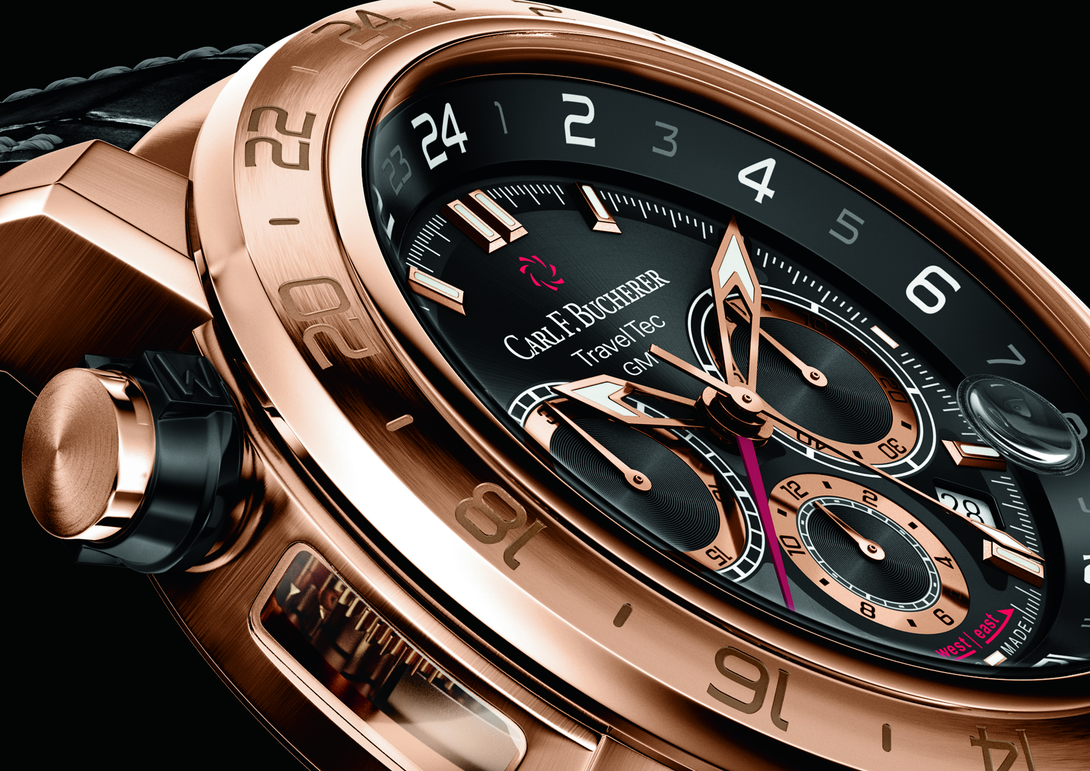 À lui seul, le boîtier de 47,4 mm de diamètre, en or rose massif, laisse une forte impression. Son allure captivante et ses fonctionnalités d’une grande utilité au quotidien (étanchéité jusqu’à 100 m, soit 10 atm) font de la Patravi TravelTec II un incontournable pour les hommes plein d’assurance, qui se laisseront naturellement séduire par ses caractéristiques techniques : la combinaison unique d’un chronographe et des indications simultanées de trois fuseaux horaires. C’est la signature de la collection TravelTec, rendue possible par un mécanisme breveté intégré au boîtier, uniquement disponible sur les modèles Carl F. Bucherer, et visible à travers une fenêtre sur le flanc de la montre. Le poussoir à 10 heures permet de régler la lunette tournante placée sous le verre saphir et ornée d’une échelle de 24 heures. Selon la direction empruntée par l’utilisateur, vers l’ouest ou vers l’est, cette lunette de 24 heures peut être décalée heure par heure dans le sens horaire ou antihoraire.
