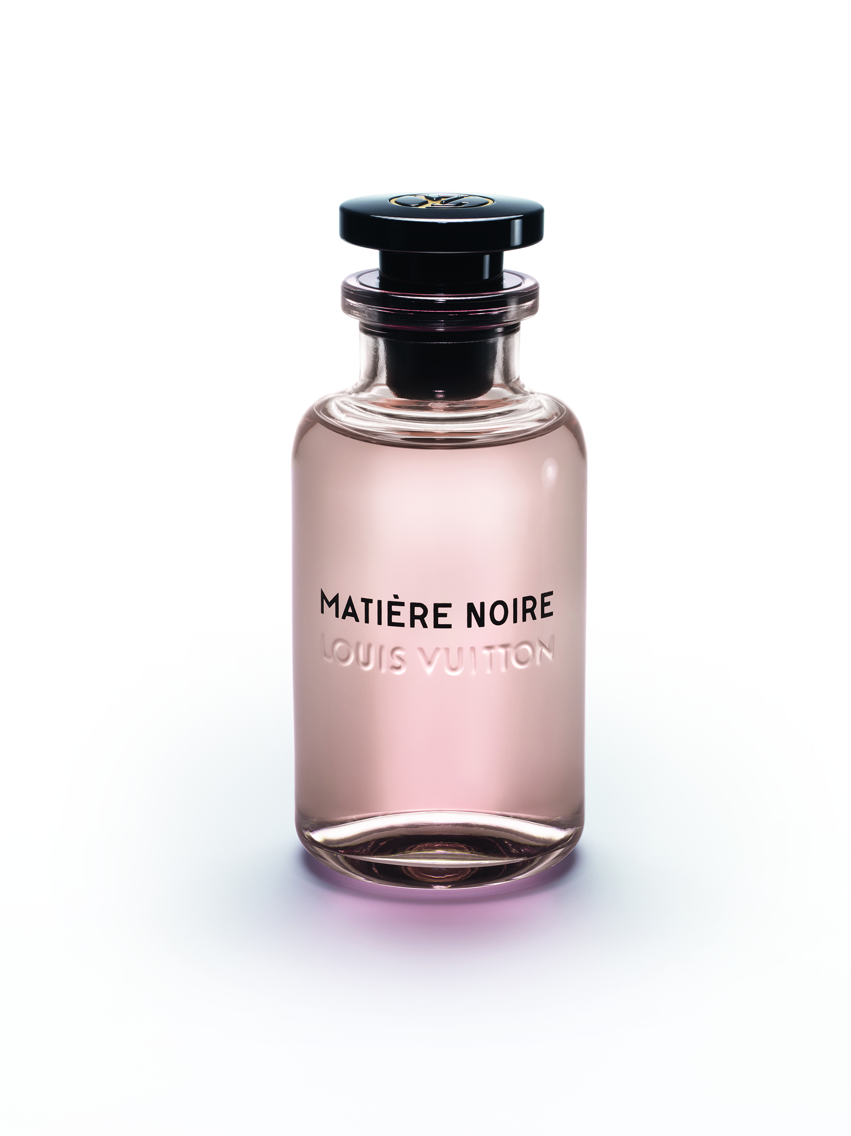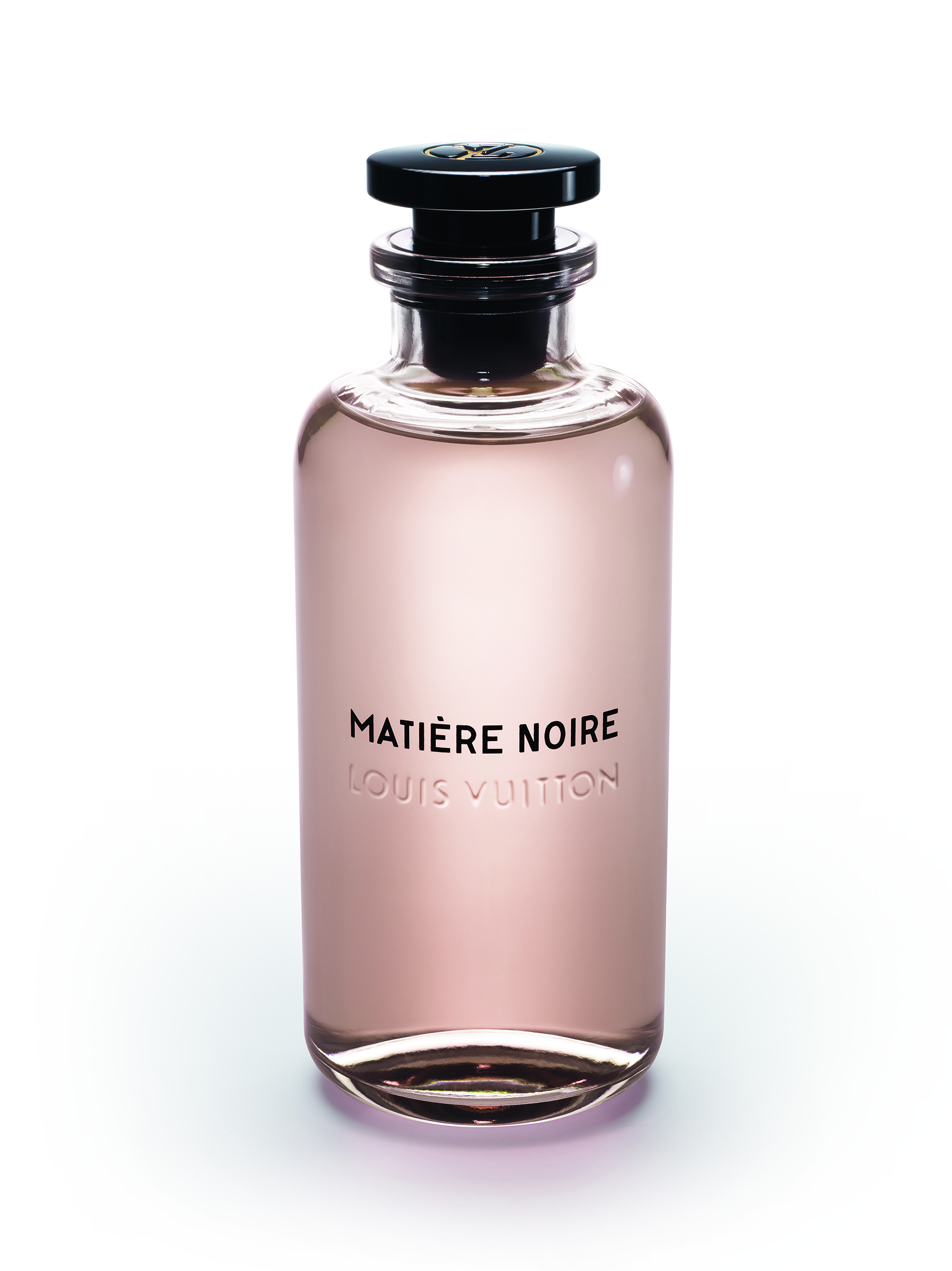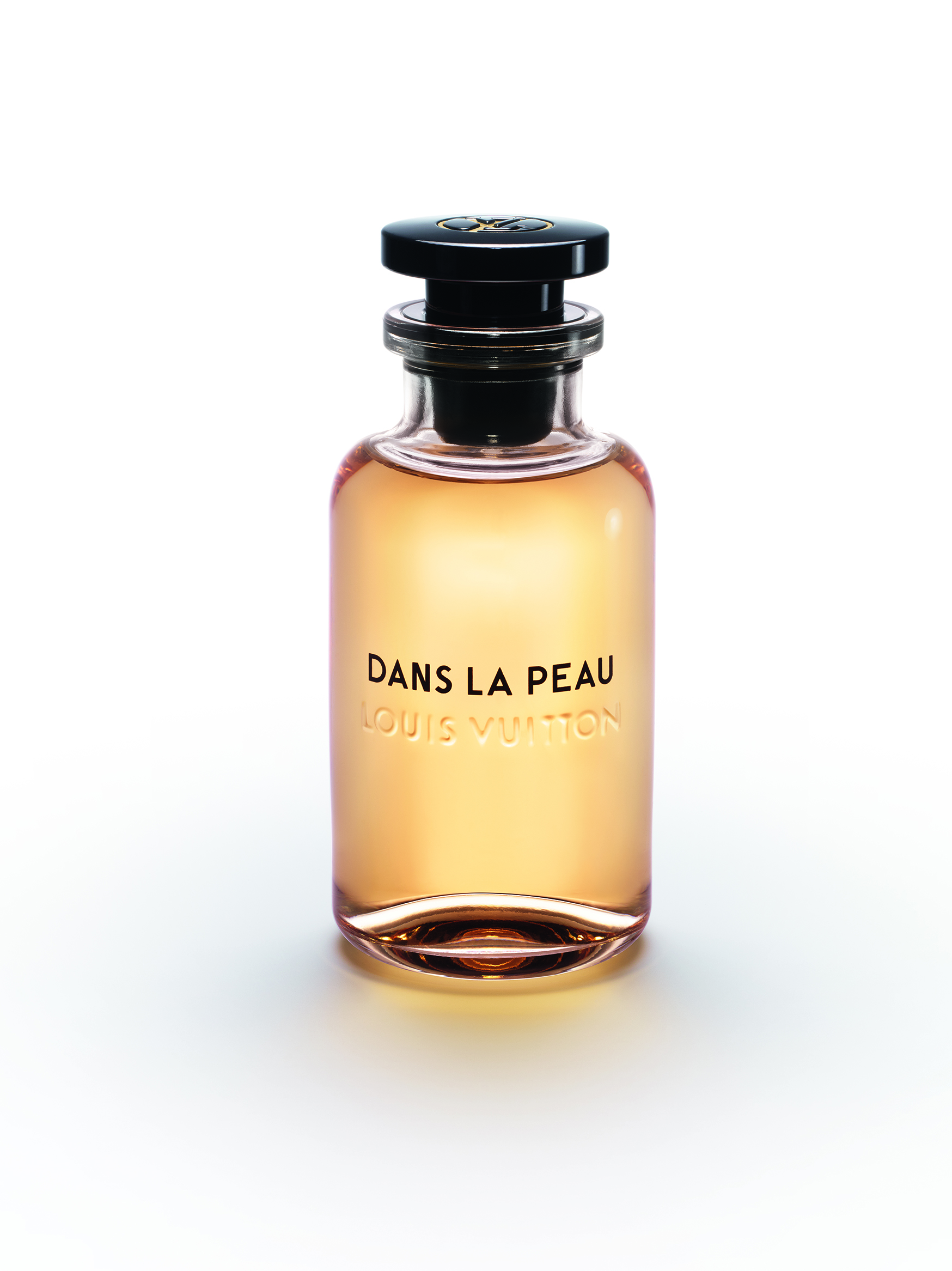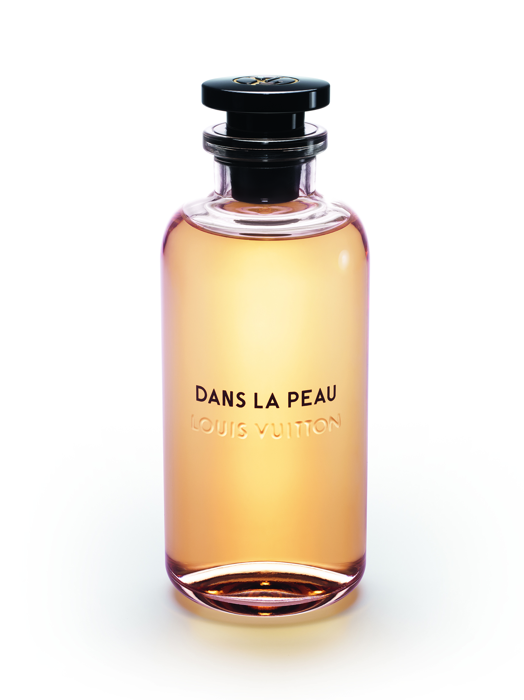 À la tête de ce flacon aérien, un bouchon noir perceptible en transparence rappelle les pièces Emery du siècle dernier. Pourtant, lorsqu’on tire sur le capot frappé d’un poinçon en laiton avec le LV cerclé, un vaporisateur apparaît.