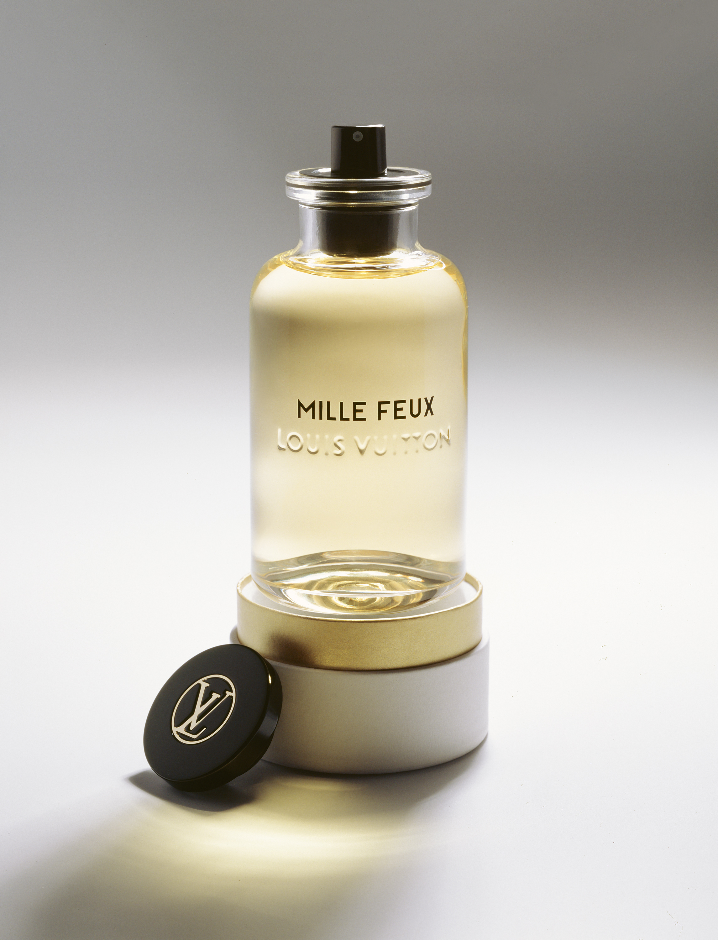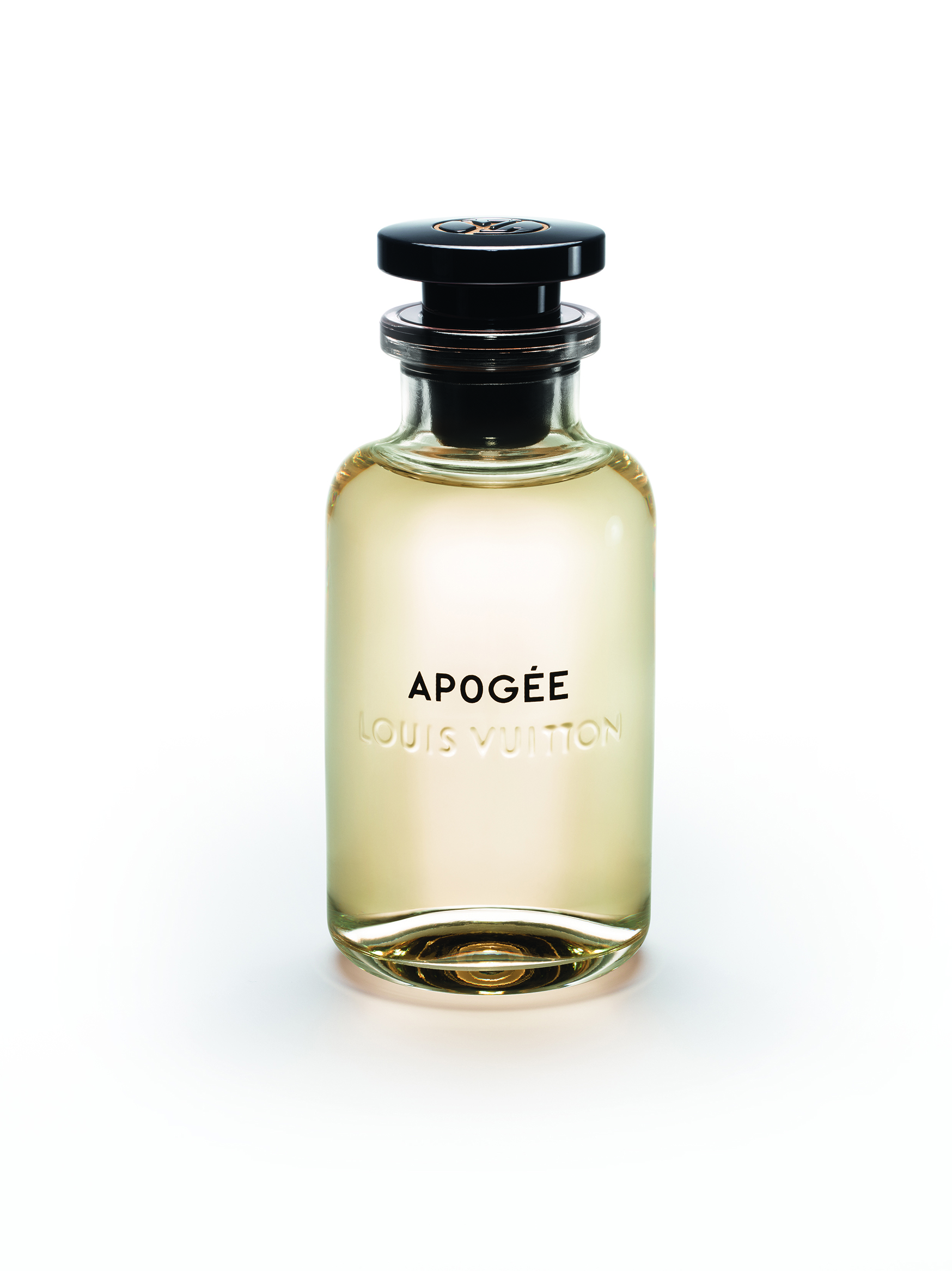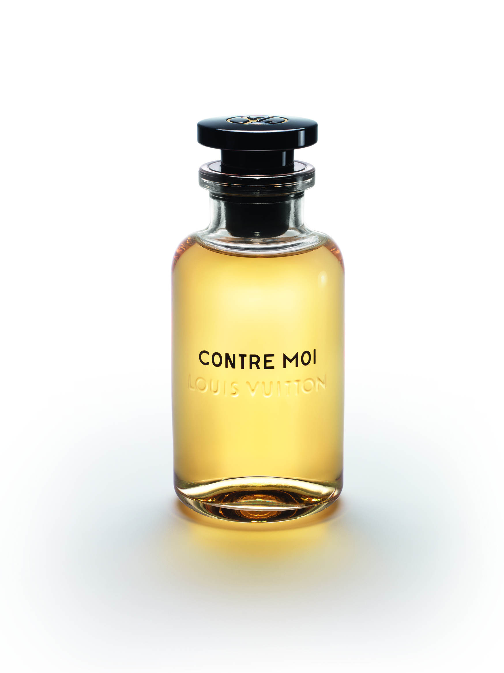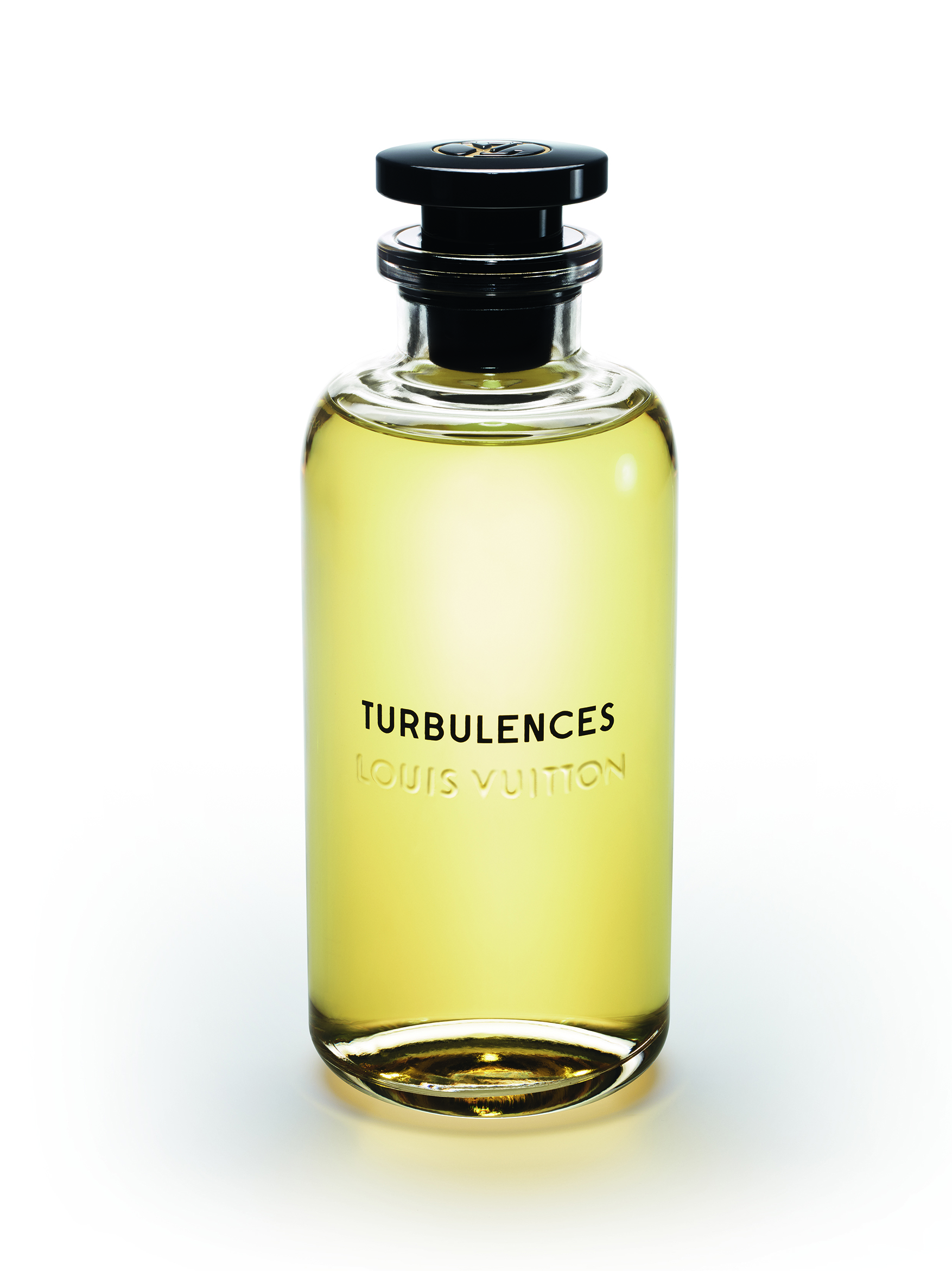 À la tête de ce flacon aérien, un bouchon noir perceptible en transparence rappelle les pièces Emery du siècle dernier. Pourtant, lorsqu’on tire sur le capot frappé d’un poinçon en laiton avec le LV cerclé, un vaporisateur apparaît.