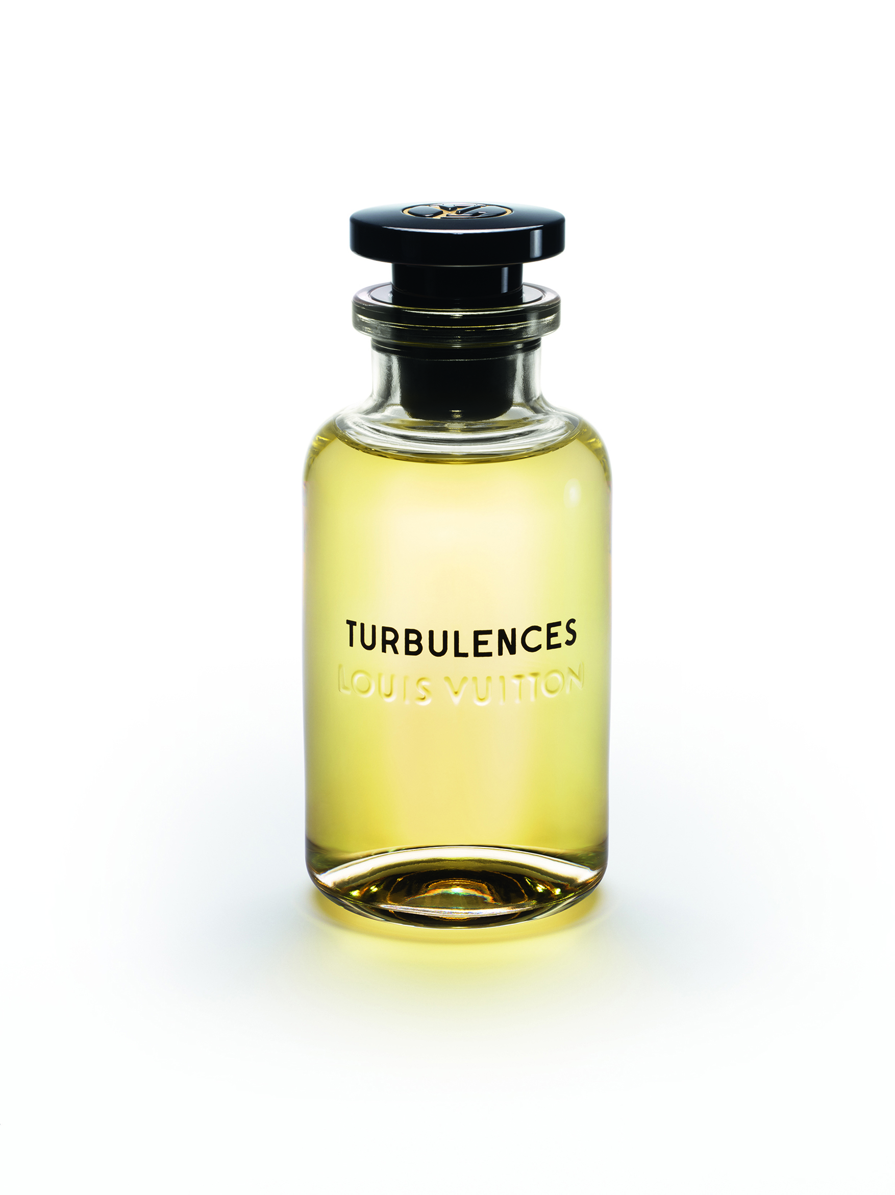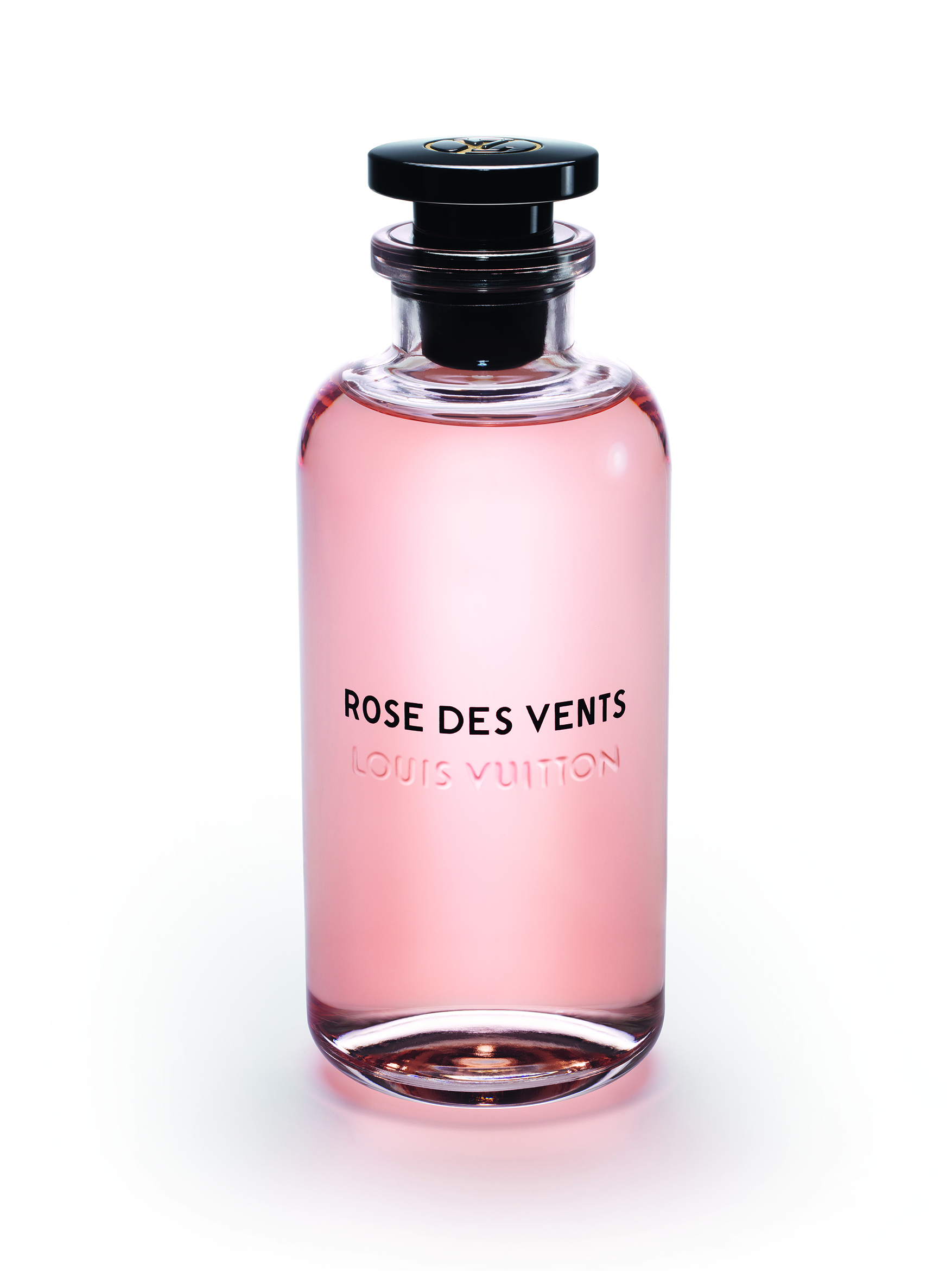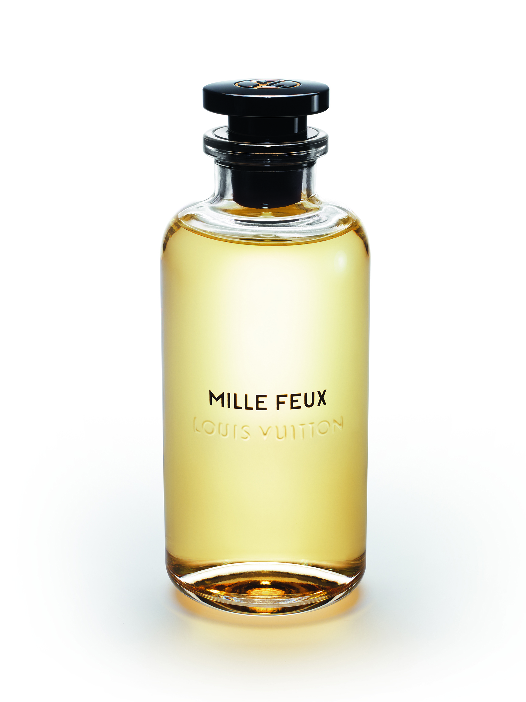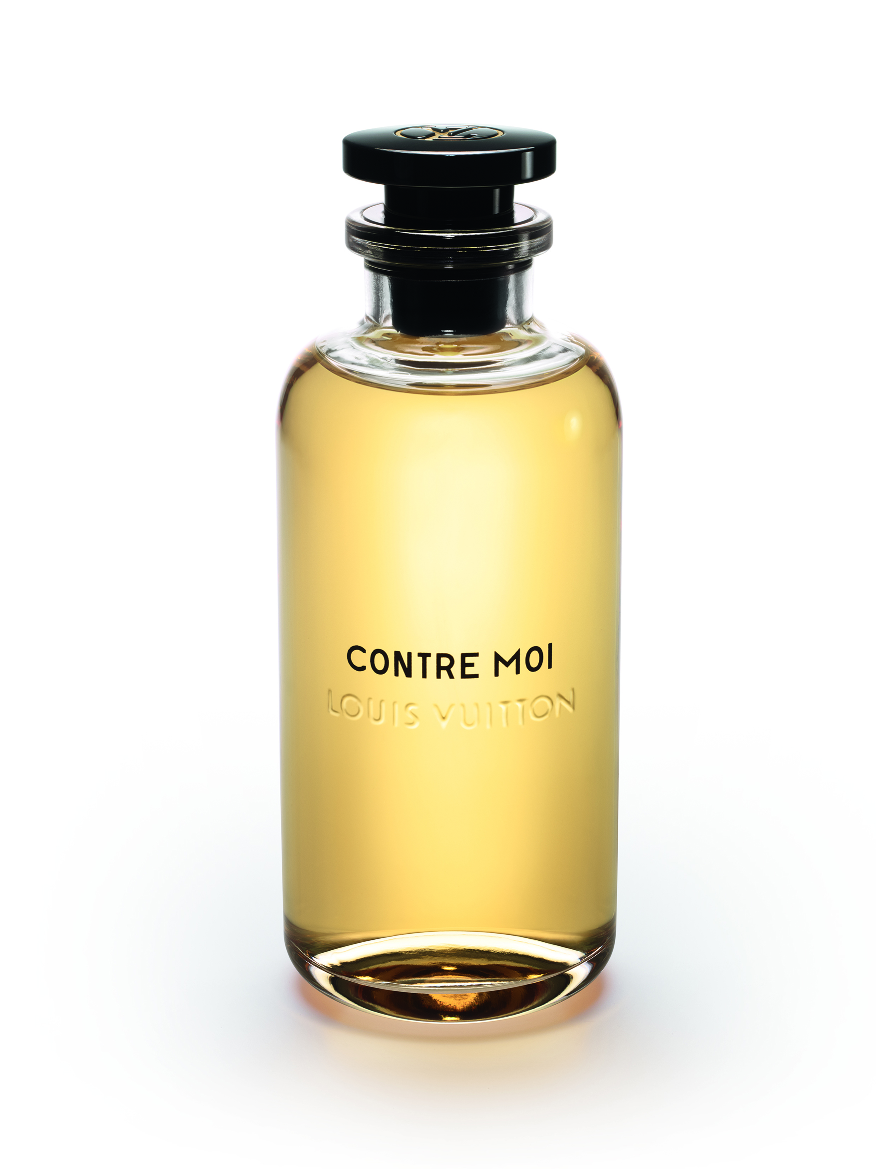 À la tête de ce flacon aérien, un bouchon noir perceptible en transparence rappelle les pièces Emery du siècle dernier. Pourtant, lorsqu’on tire sur le capot frappé d’un poinçon en laiton avec le LV cerclé, un vaporisateur apparaît.