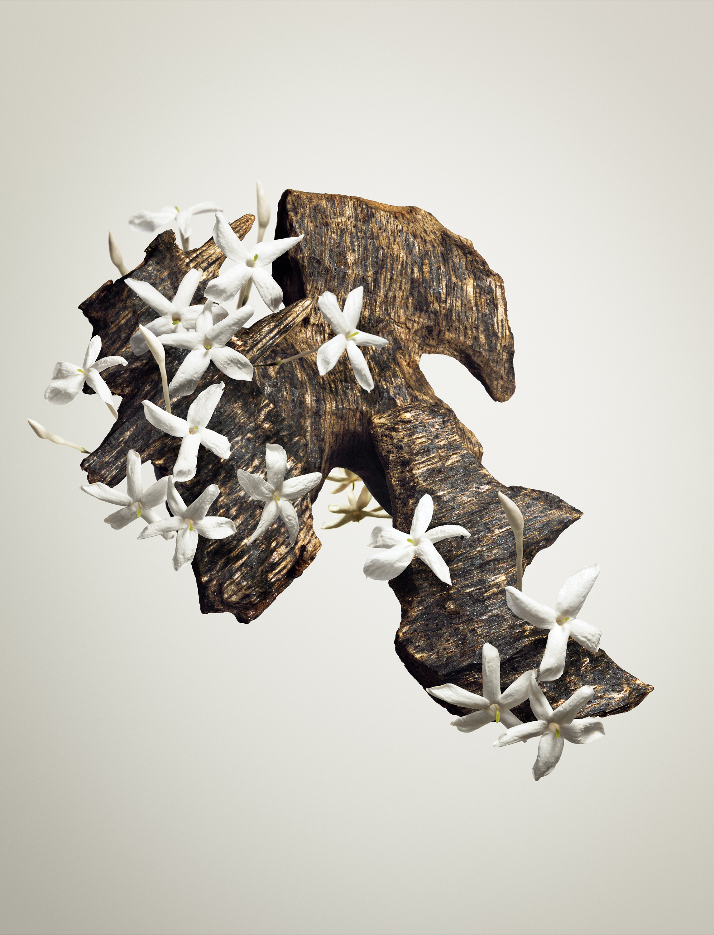 Pour intensifier la noirceur du bois animal, il l’associe au cassis et contraste l’obscurité avec la blancheur du narcisse, et du jasmin sambac. La composition gagne alors en apesanteur. Une sensation de flottement au milieu de l’espace.