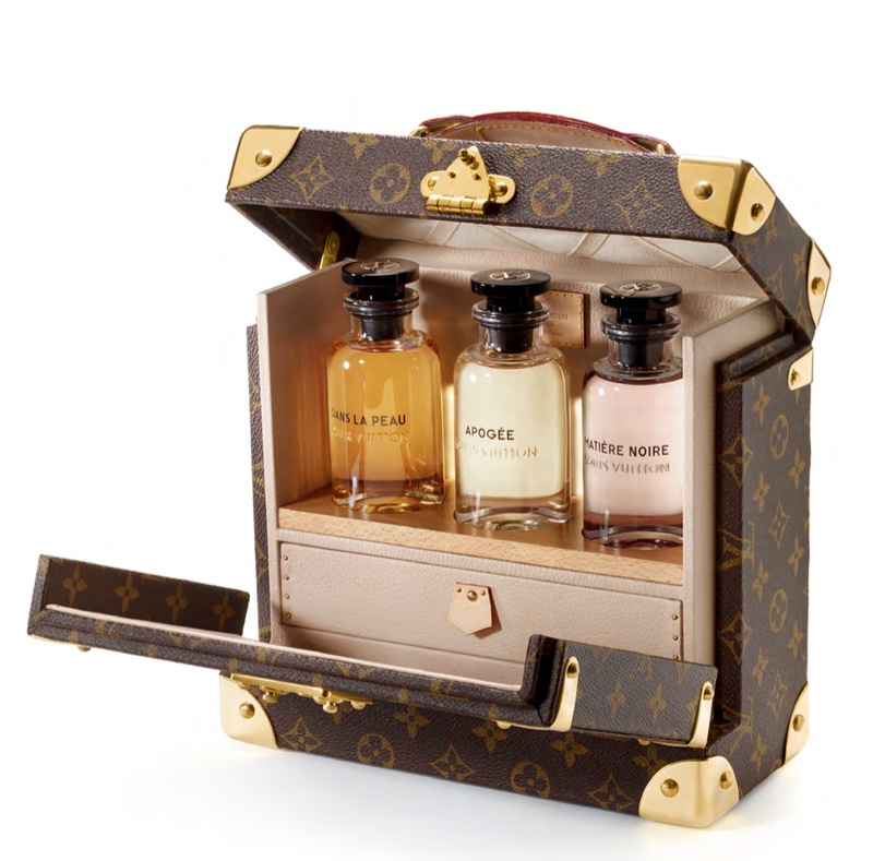 Élaboré par les ateliers Louis Vuitton, cette malle en Monogram permet de transporter Imaginé pour les collectionneurs qui souhaitent profiter de chacune des sept créations, trois flacons de la collection en toute sécurité. À la manière des malles de beauté cet écrin renferme sept miniatures irrésistibles de 10ml. réalisées pour les élégantes qui voyageaient dans les années 1920.