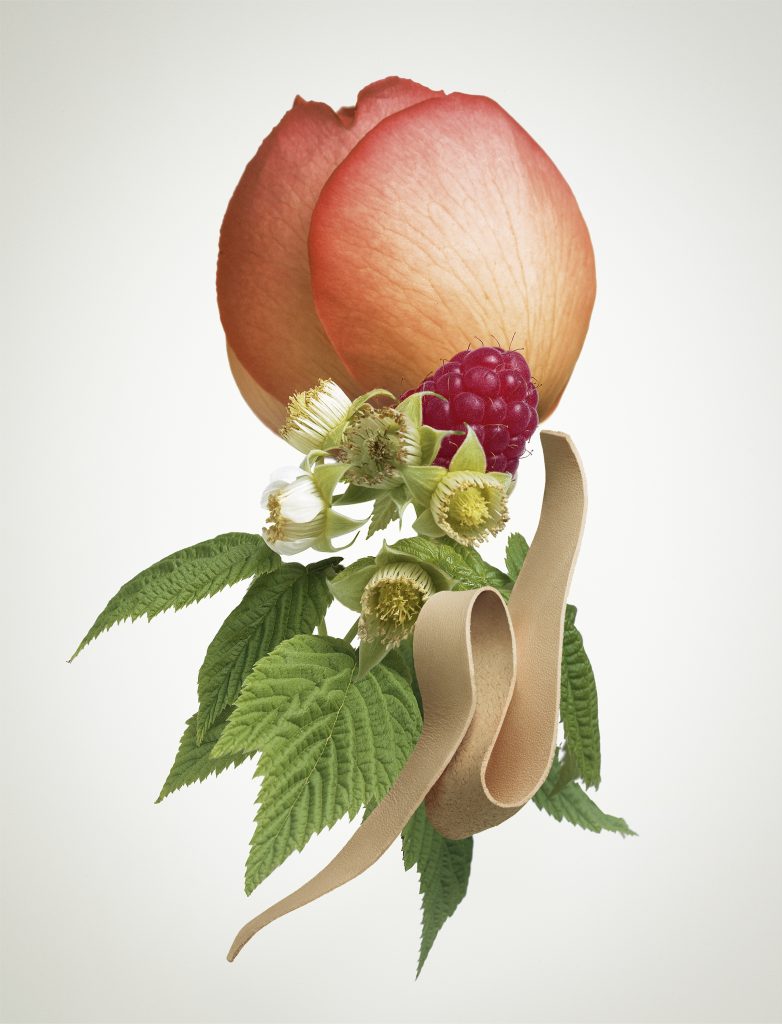 Parallèlement, l’accord de framboise à peine sucrée joue aussi sa partition. Encore jamais associés auparavant, la framboise et le cuir entrent en fusion comme deux amants enchainés l’un à l’autre.