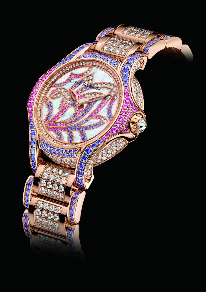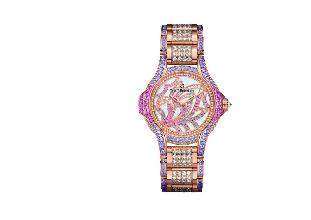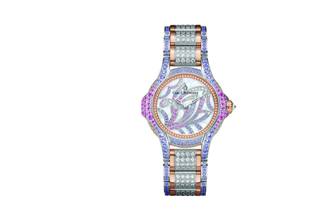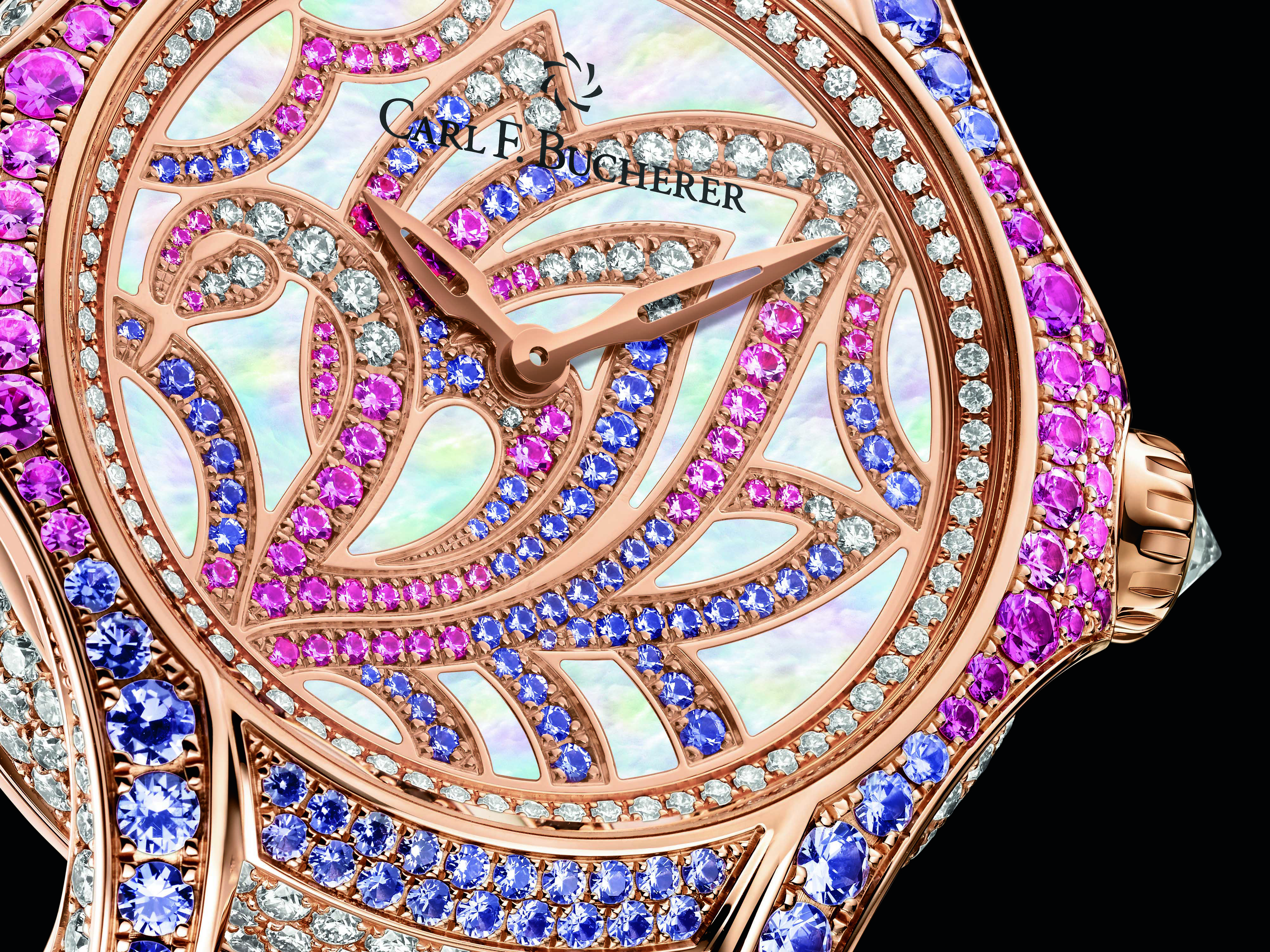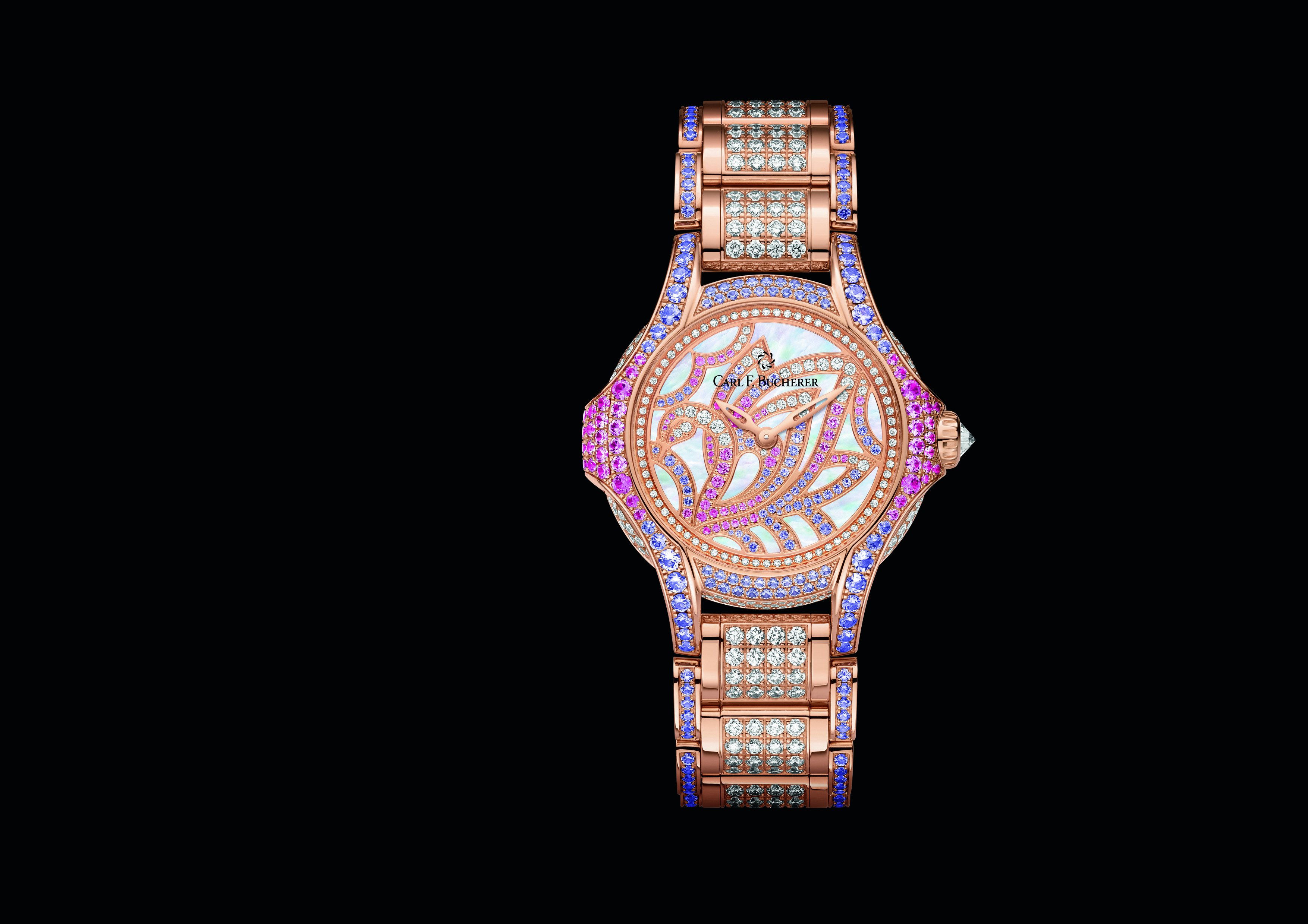 Dans de nombreuses cultures, le cygne est considéré comme un symbole de pureté, de grâce, d’amour et de beauté, un symbole que partage également la ville de Lucerne située au bord du Lac des Quatre-Cantons. Ceci se reflète sur le cadran en nacre de la dernière création de Carl F. Bucherer. Des diamants purs de qualité Top Wesselton et des saphirs des plus fins, dans diverses teintes de bleus, composent l’image d’un cygne glissant avec grâce sur les flots. Les délicates aiguilles des heures et des minutes, ainsi que l’auréole et la couronne emblématiques de la collection Pathos, montrent la passion pour le détail de Carl F. Bucherer dans la conception de ce garde-temps. Les nombreuses facettes du boîtier galbé s’expriment avec élégance à travers un sertissage délicat adapté à la forme.