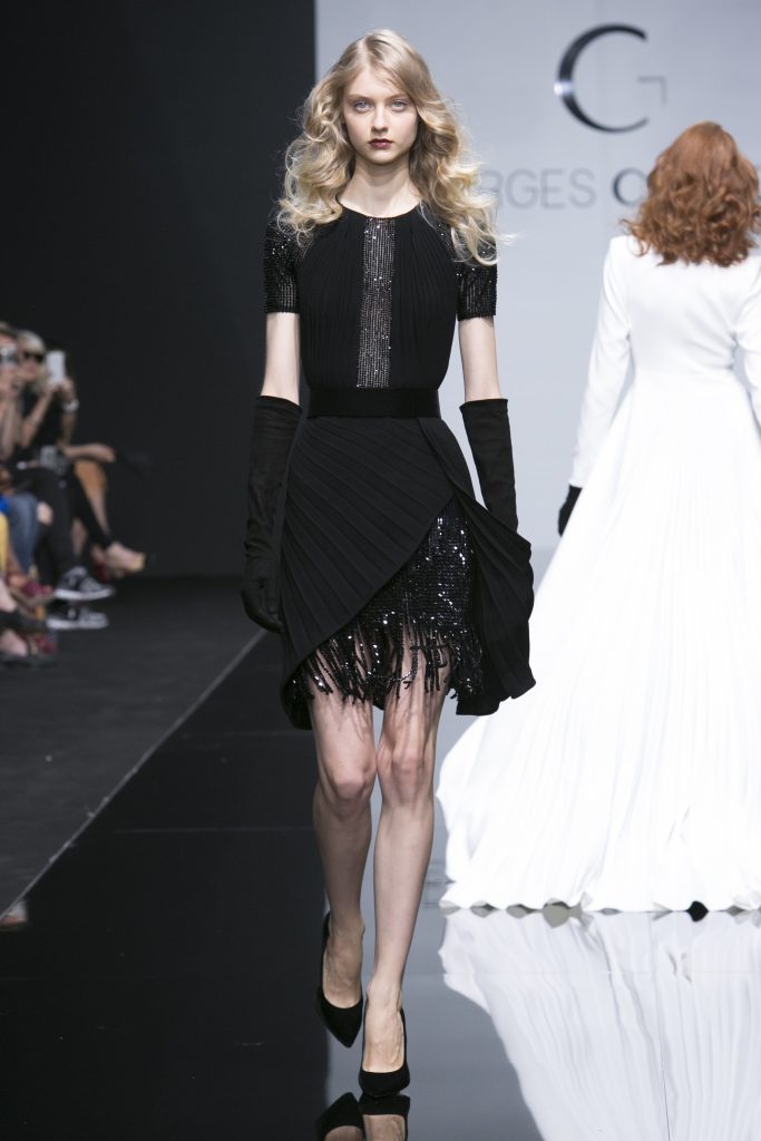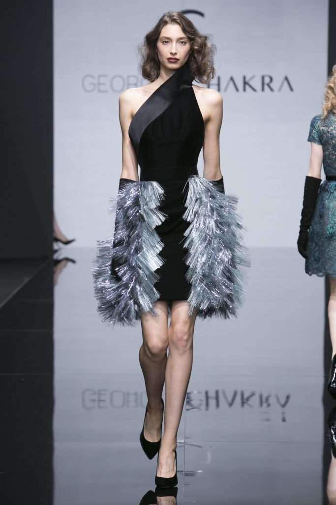 Tailles soulignées de velours noir, sensualité strictement épaulée, découpes graphiques, franges et plissés pour un jeu d’ombres de chair et de lumière… Fourreaux et traînes ténébreuses aux airs de piédestal sur lesquels viennent se poser des capes et des manteaux, valeurs ajoutées d’aura et de mouvements.