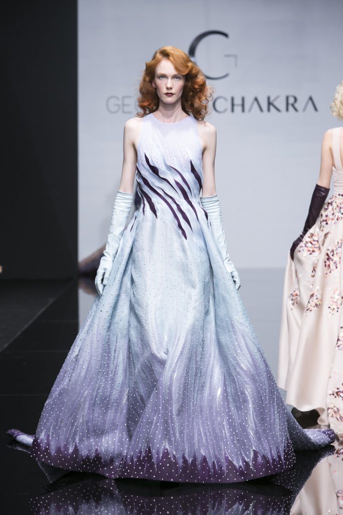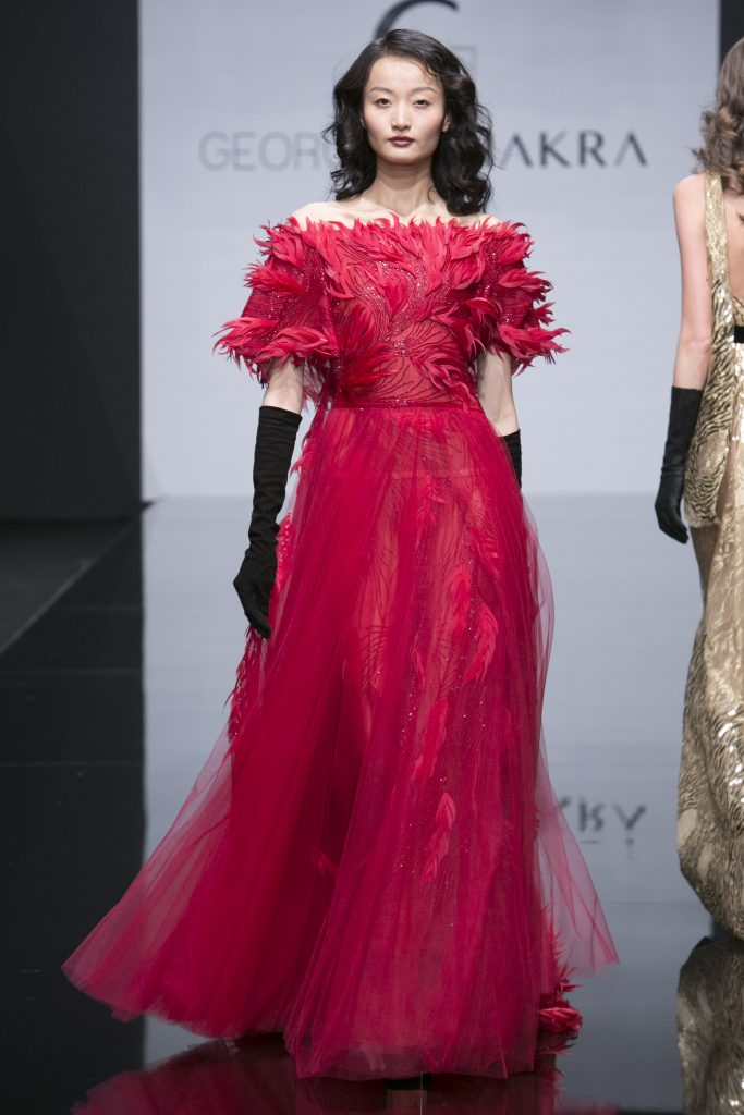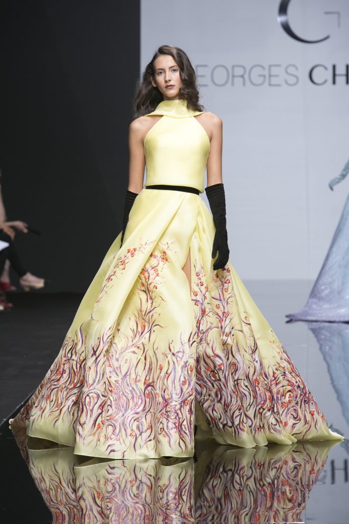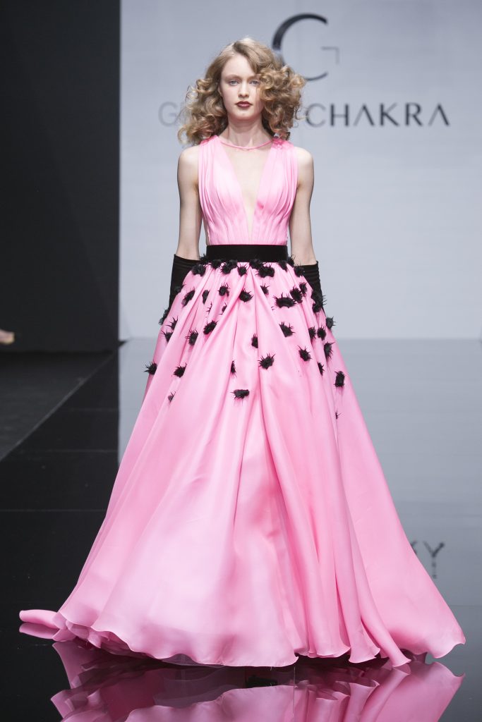 Tout feu, tout femme, les motifs flammes embrasent les silhouettes, volutes voluptueuses adoptant des prodiges de tournures: incandescence de plumes, paillettes, cristal, perles, tulle, organza… Etincelantes peintures faites à la main… mais aussi sortilèges de fleurs, pétales, rubans…