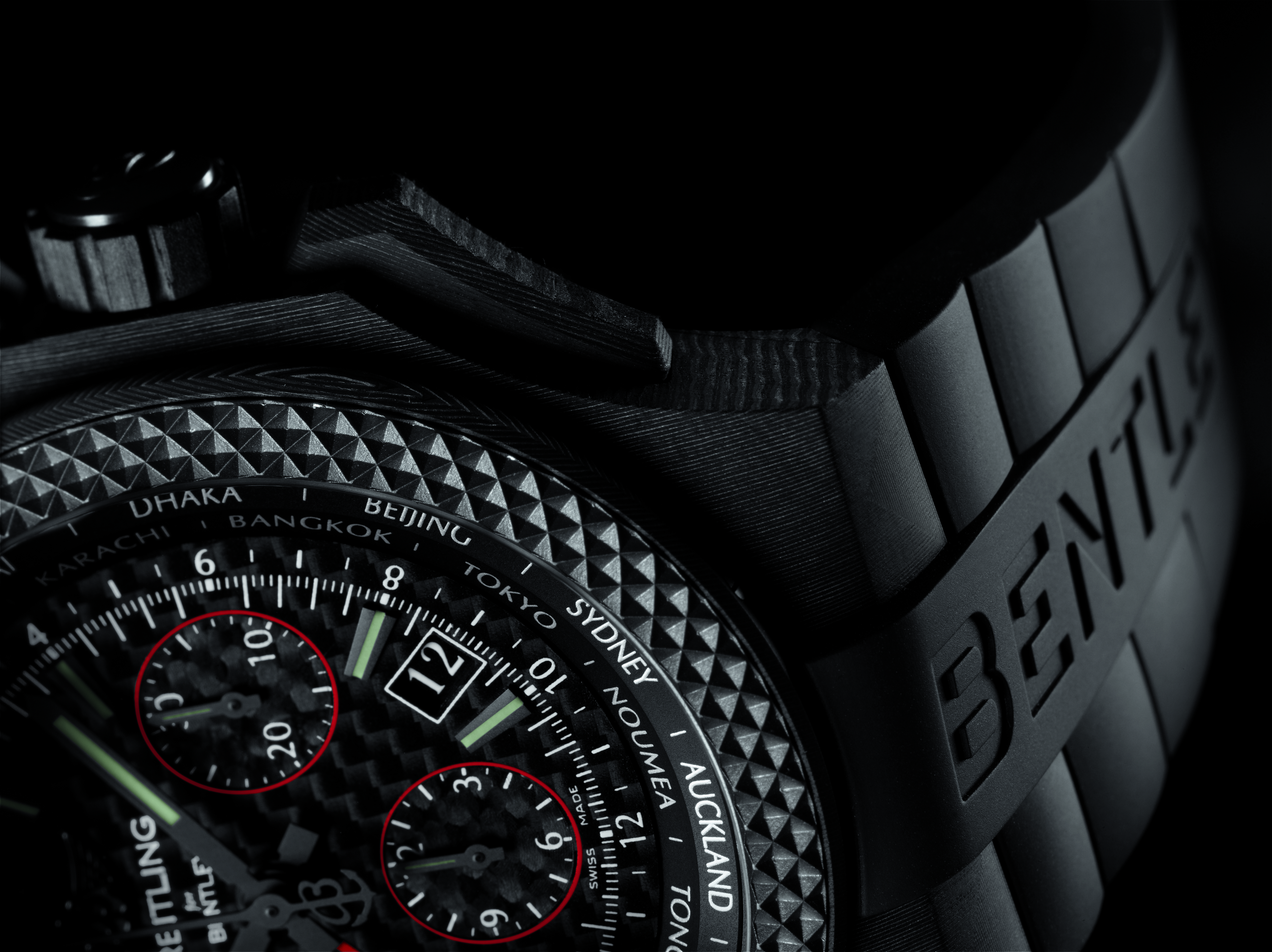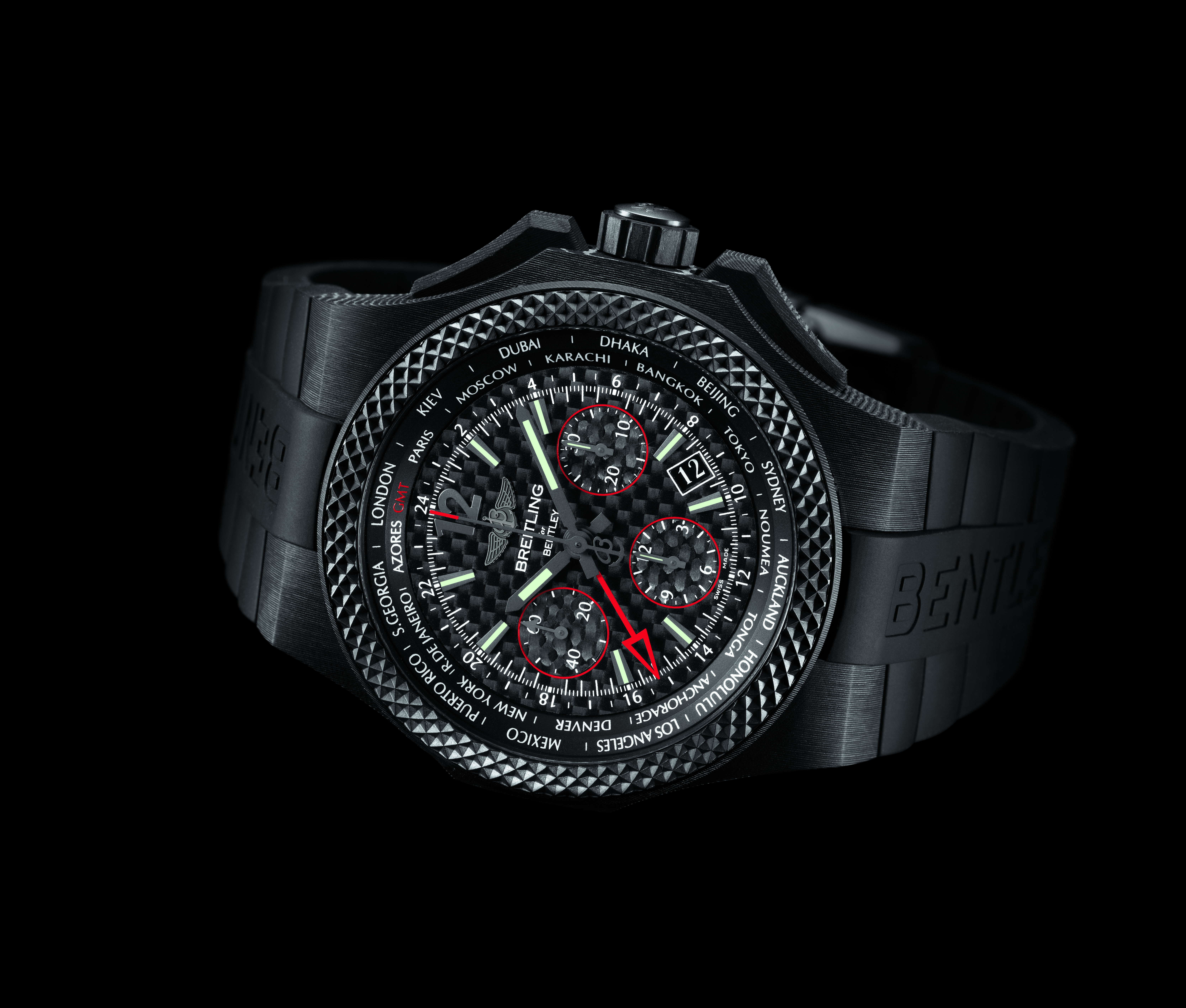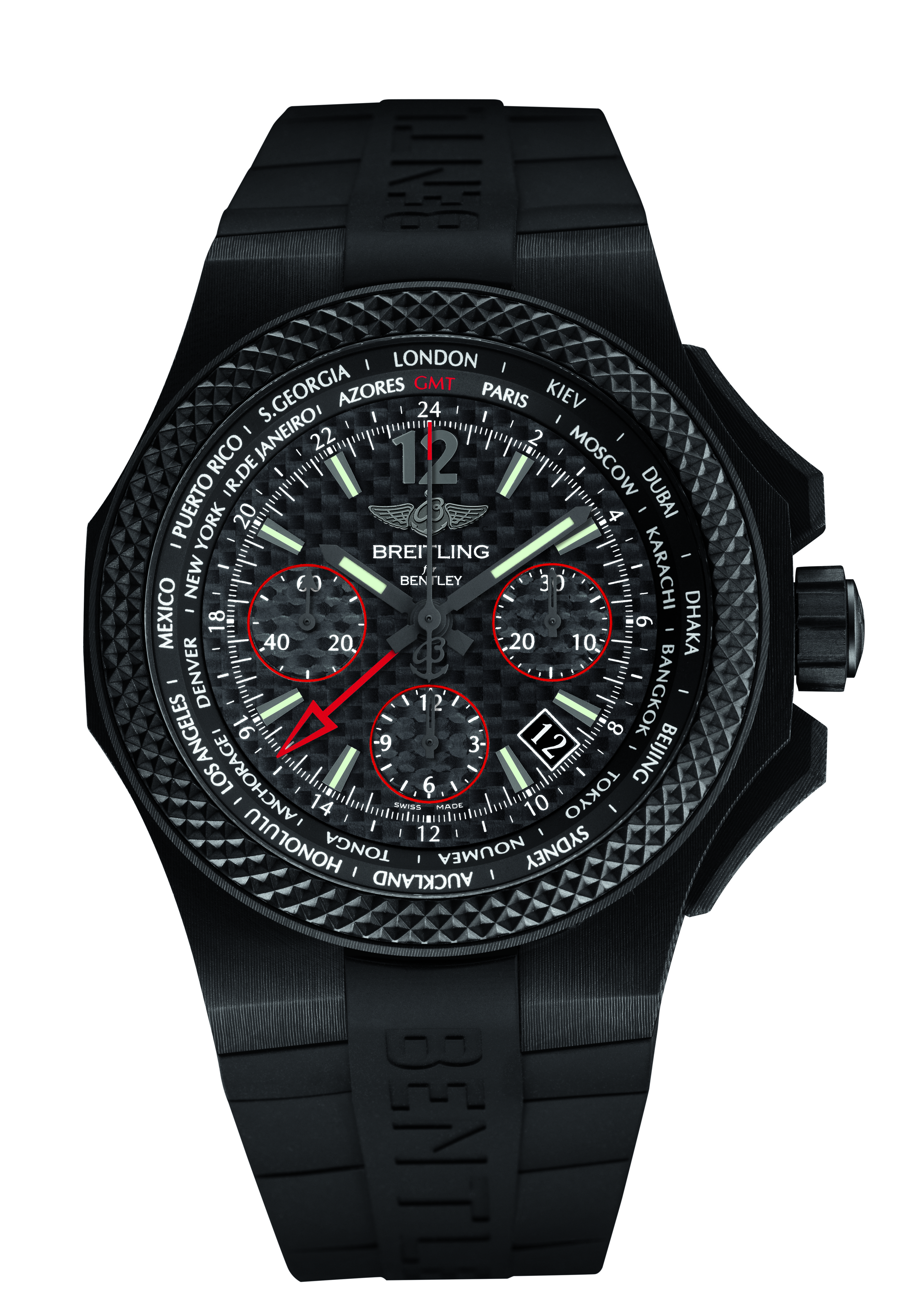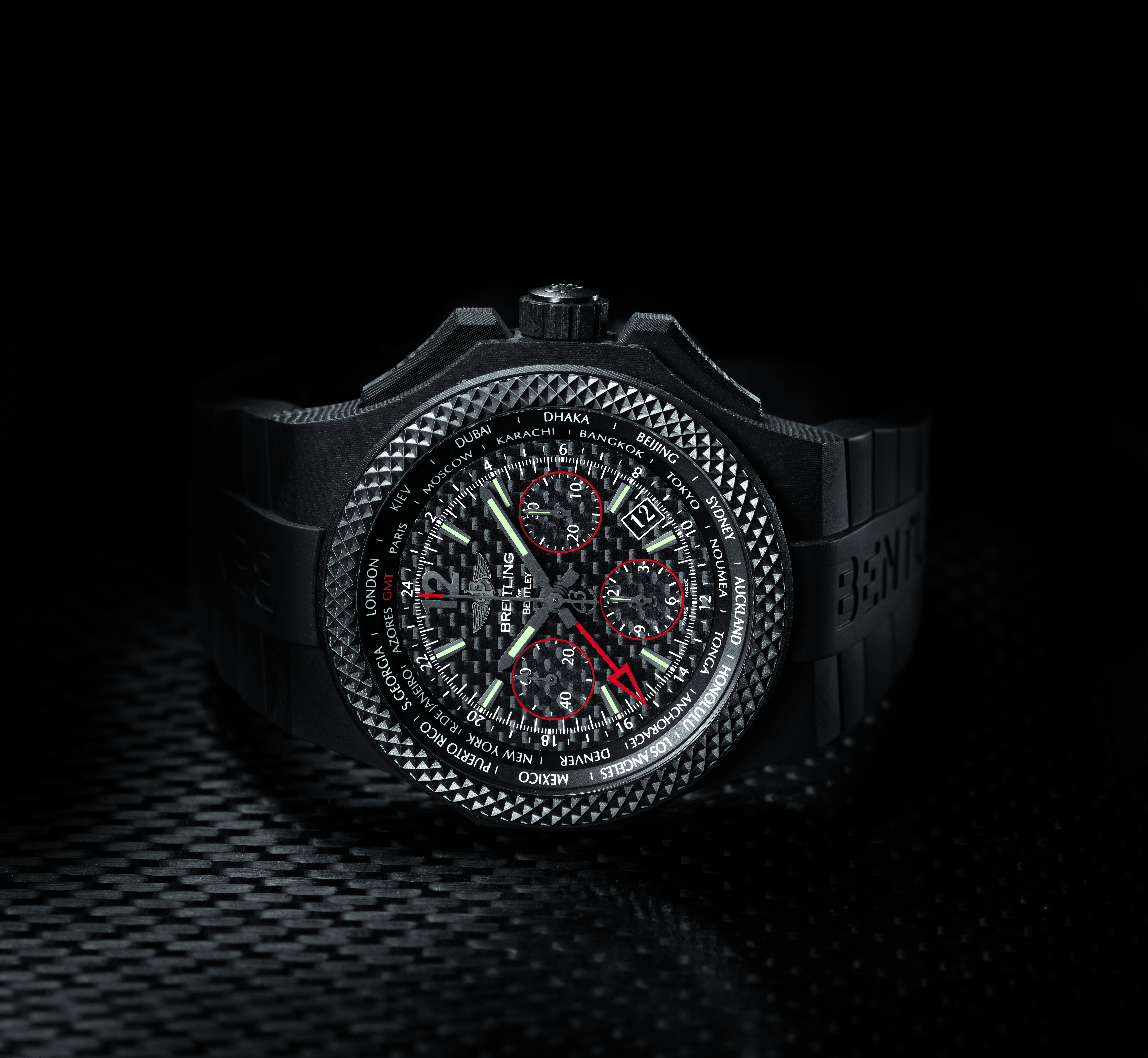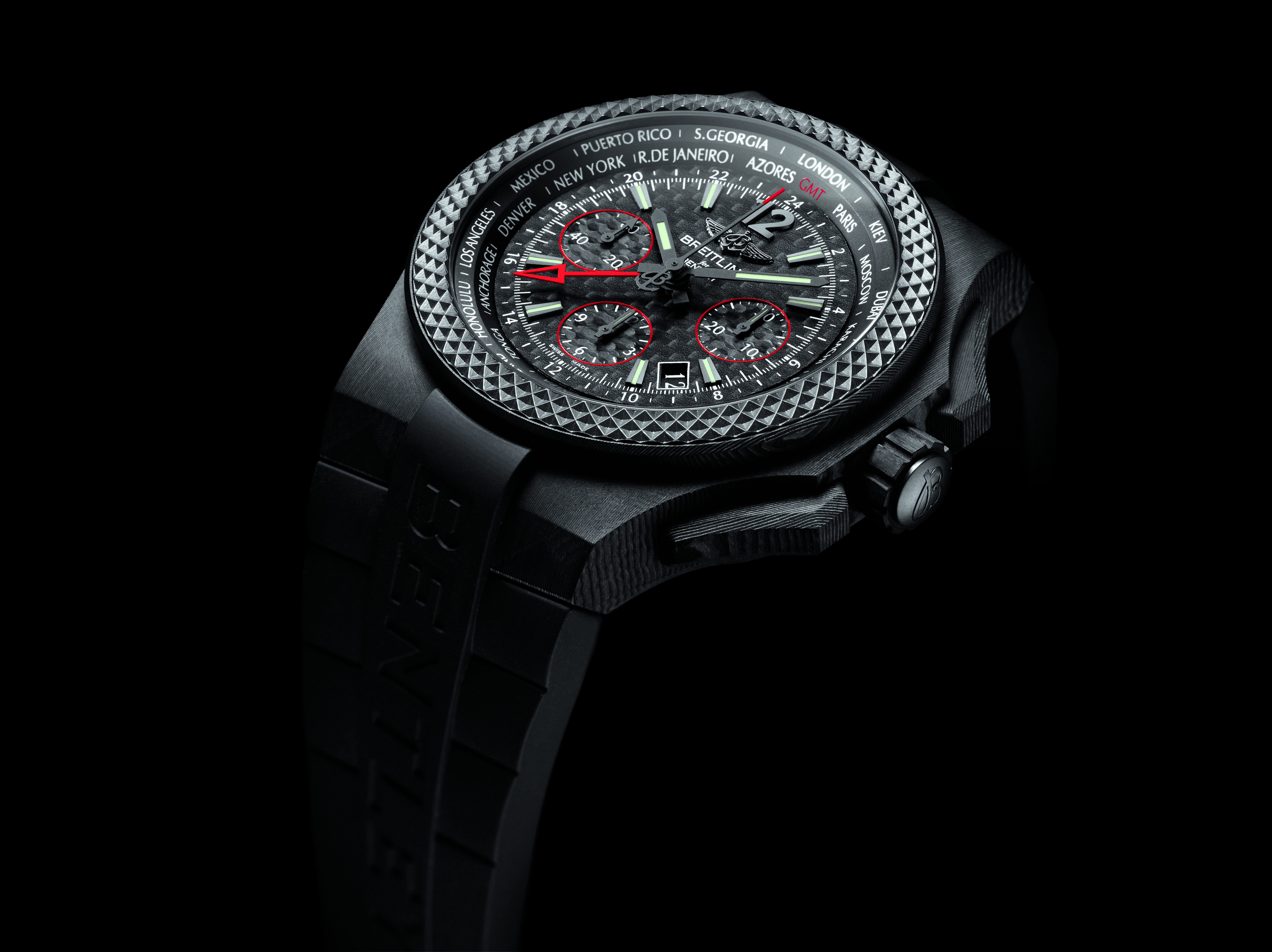 Déjà déclinée en titane, la Bentley GMT B04 S frappe par son design original et audacieux, avec cornes asymétriques, poussoirs intégrés épousant la découpe du boîtier et bracelet exclusif en caoutchouc noir. Breitling la propose aujourd’hui dans une série limitée se distinguant par son habit résolument sportif. La marque a choisi pour cela une technologie de pointe déjà utilisée dans les châssis de Formule 1, ainsi qu’en aéronautique et sur les bateaux de course – mais totalement novatrice pour une montre. Le matériau high-tech du boîtier se compose de minuscules fils de carbone (30 microns de diamètre) tissés en plusieurs centaines de couches, avec orientation variant de 45° entre deux couches successives, puis liés par une résine chauffée sous pression. Résultat: une rigidité hors pair, alliée à une très haute résistance aux chocs et à un aspect noir mat de grand caractère. Modèle de lisibilité, le cadran est également façonné en carbone, avec tressage apparent. Un look de compétition, rehaussé par des compteurs cerclés de rouge rappelant les tableaux de bord des automobiles.
